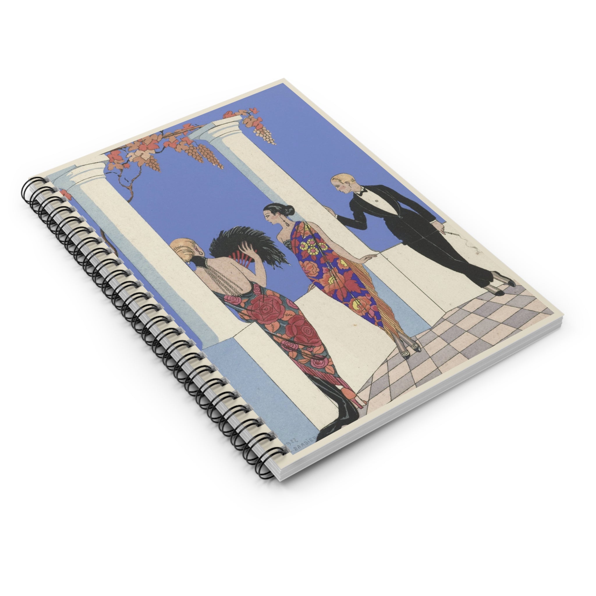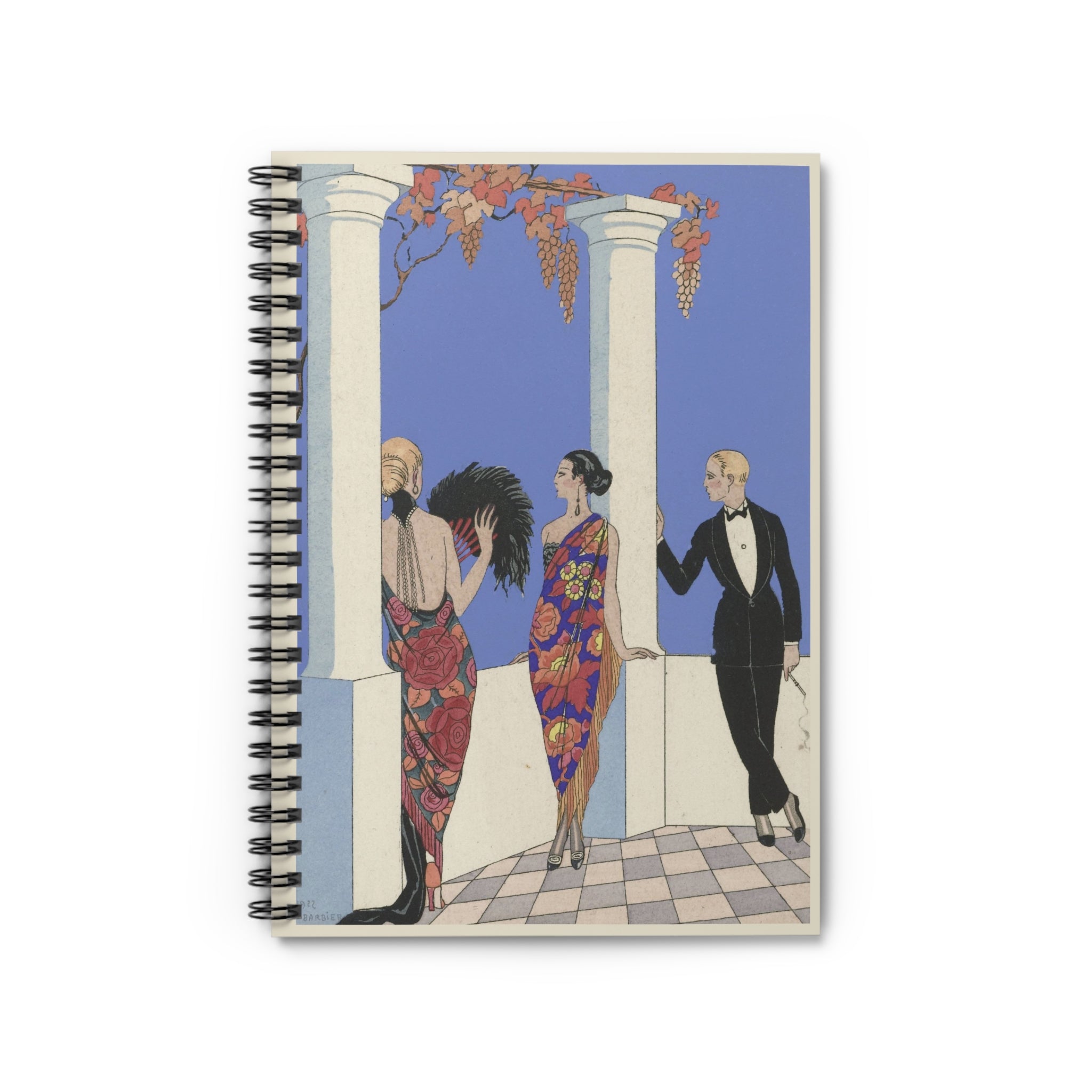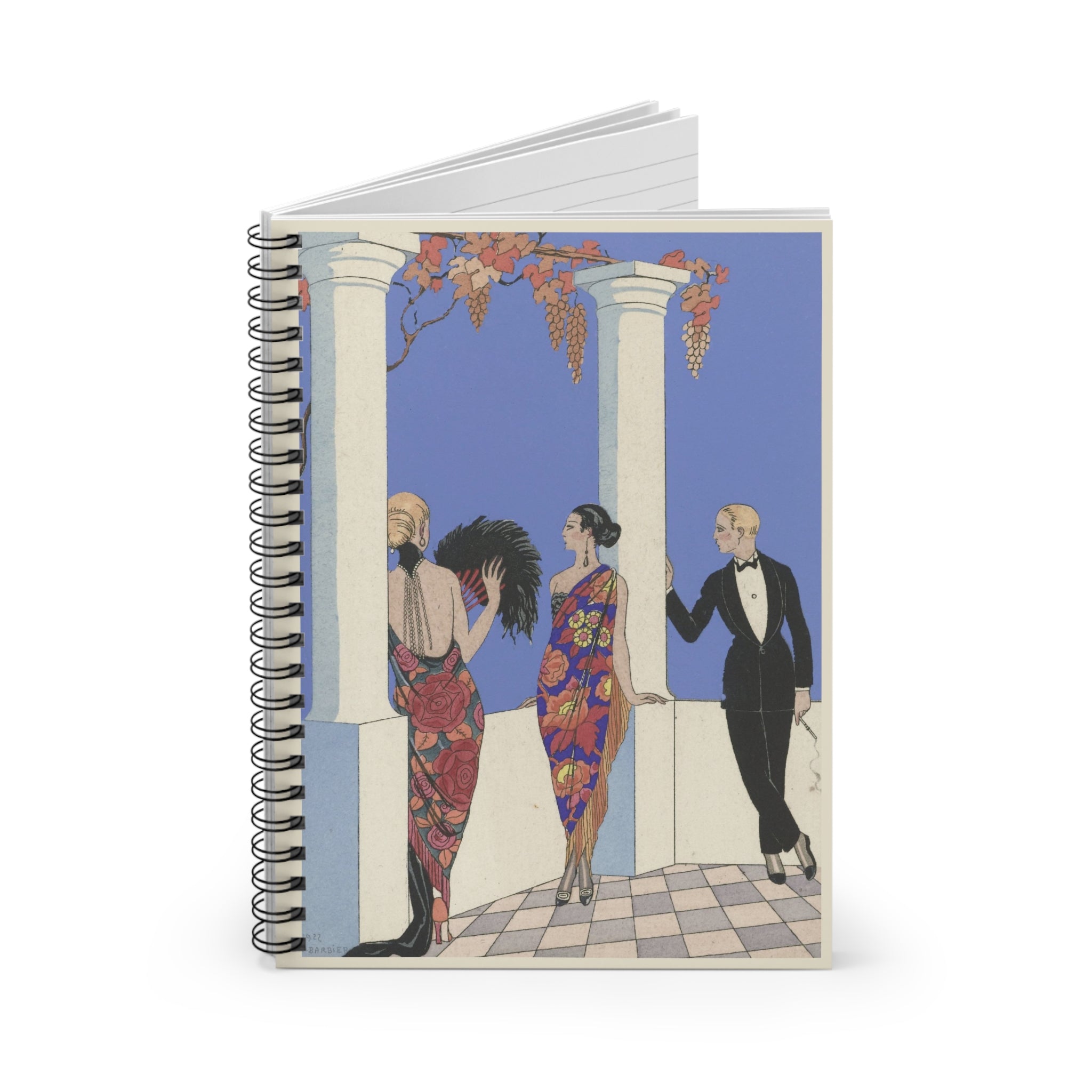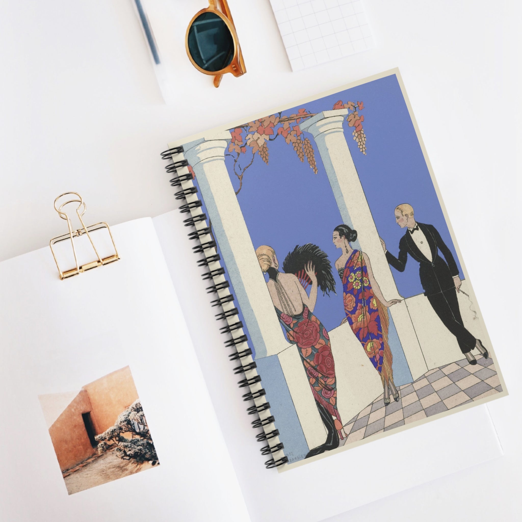 Whether you're jotting down shopping lists, school notes, or poetic musings, this 118-page spiral notebook offers both functionality and timeless style. The cover features Le goût des châles, a 1922 illustration by the renowned French artist George Barbier (1882–1932). Part of his celebrated Falbalas et Fanfreluches series, the artwork showcases two women in elegant evening gowns alongside a gentleman in formal wear, framed by classical architecture and a clear blue sky. A large feather fan and graceful updos highlight the sophistication and fashion of early 20th-century France.