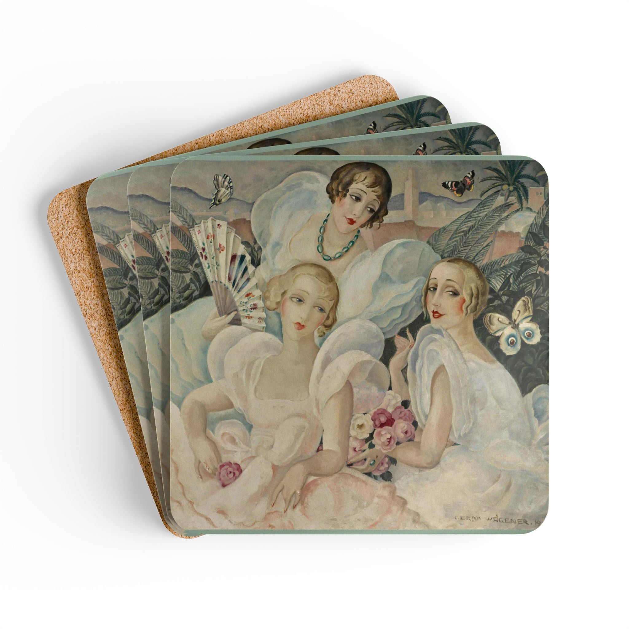 Les Femmes Fatales by Gerda Wegener Corkwood Coaster Set brings striking Art Deco sophistication to any space, blending vintage glamour with practical everyday use.