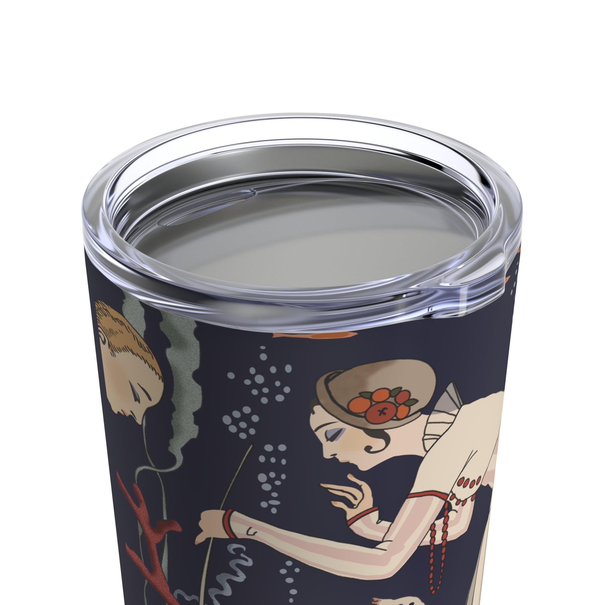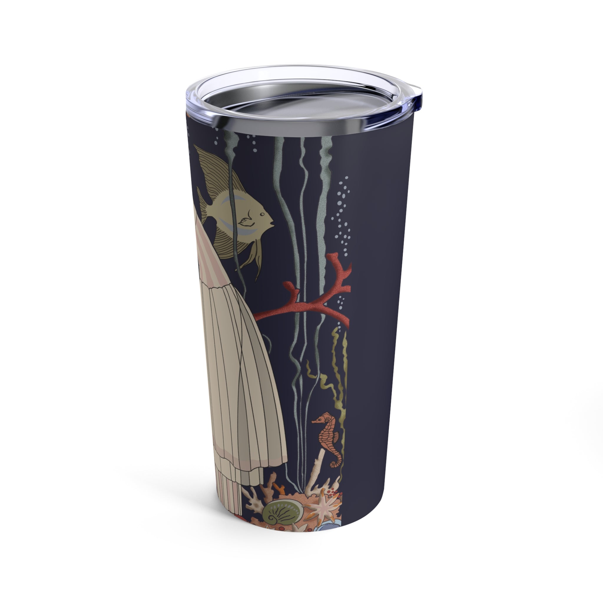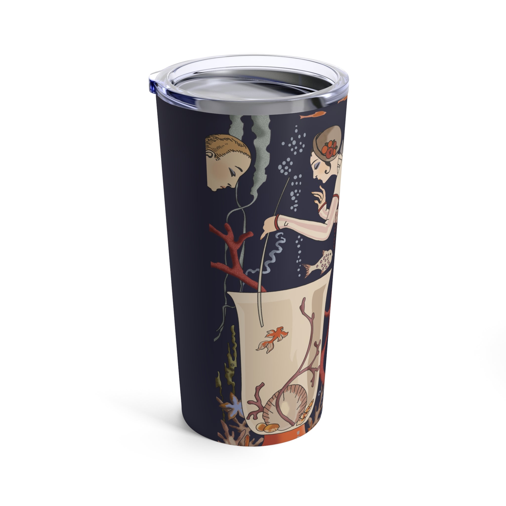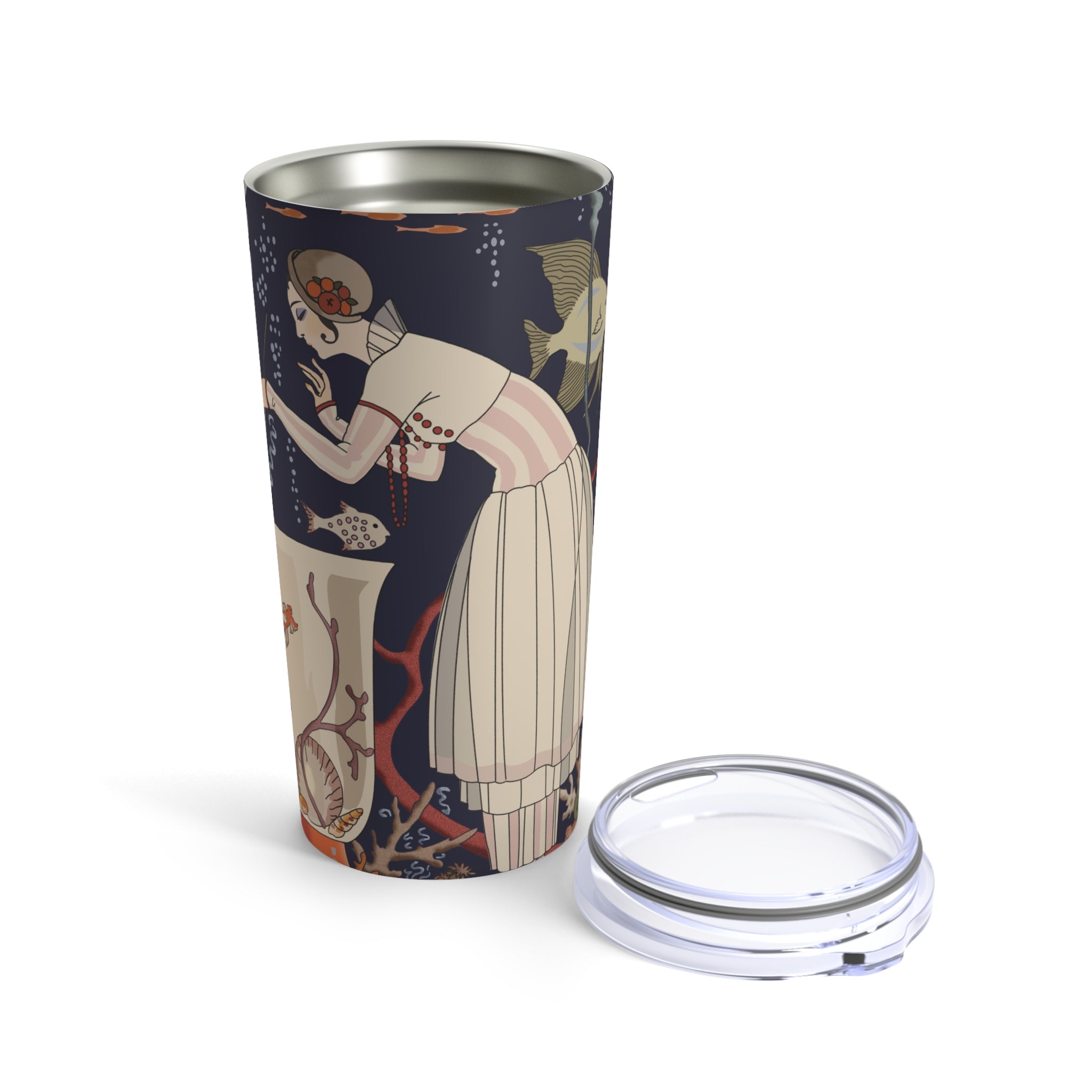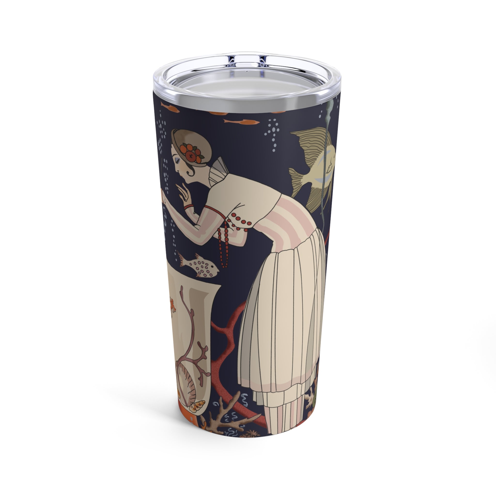 Artwork designed and digitally remastered by Sarasvati Designs. In this captivating art deco artwork "L'Etourdissant Petit Poisson" by George Barbier, a woman and a man are immersed in a mesmerizing scene of a woman feeding a goldfish in a glass bowl, surrounded by a magnificent aquarium teeming with sea life.