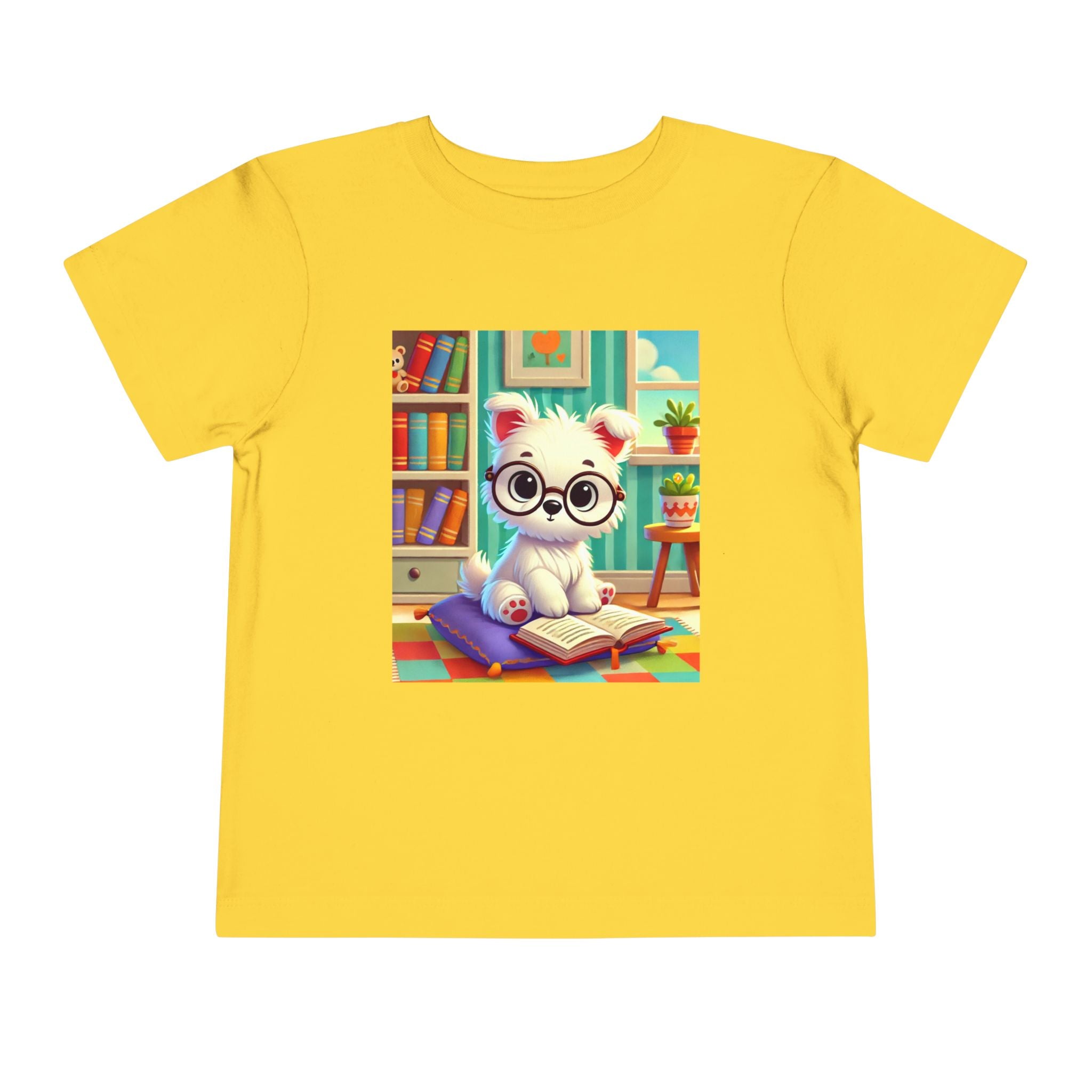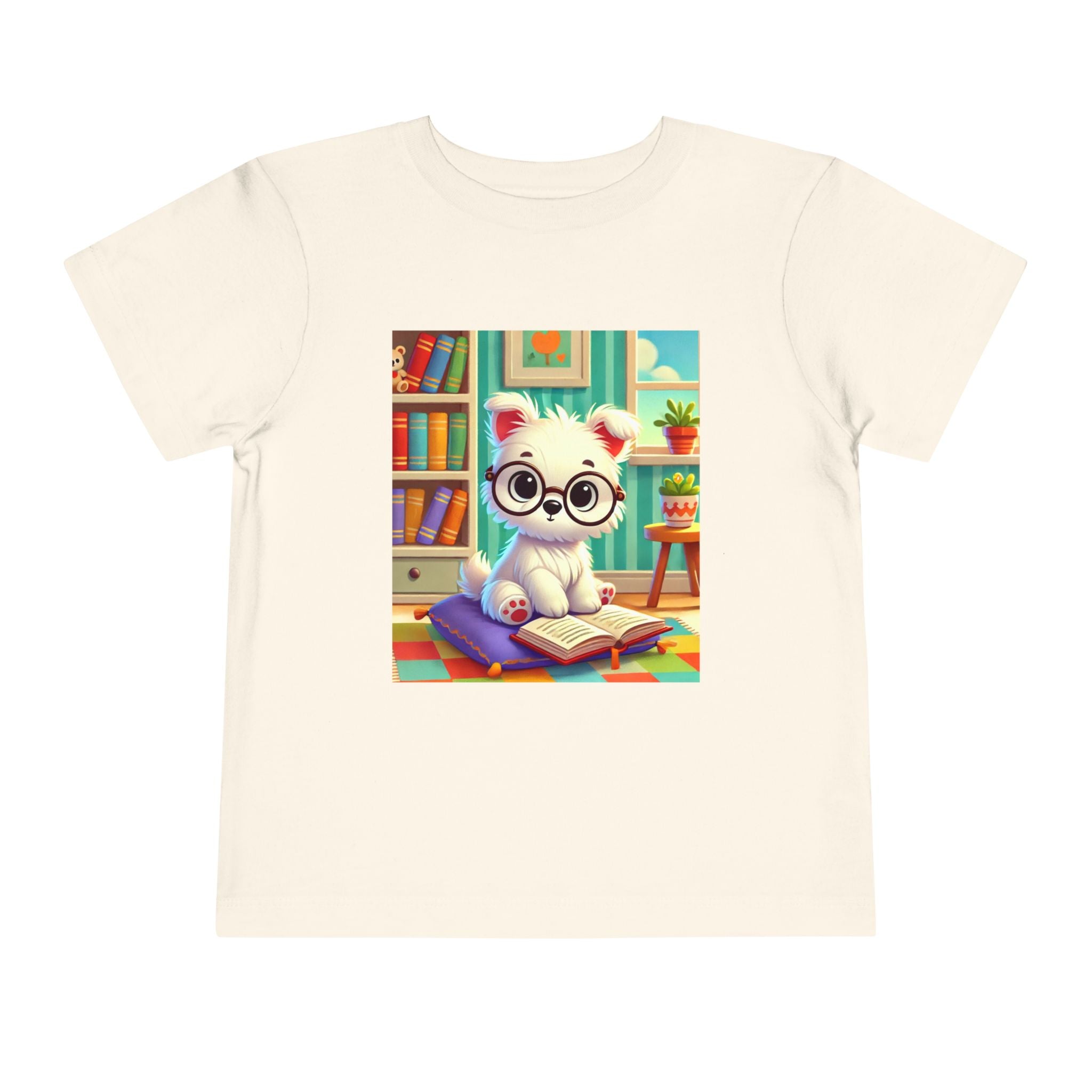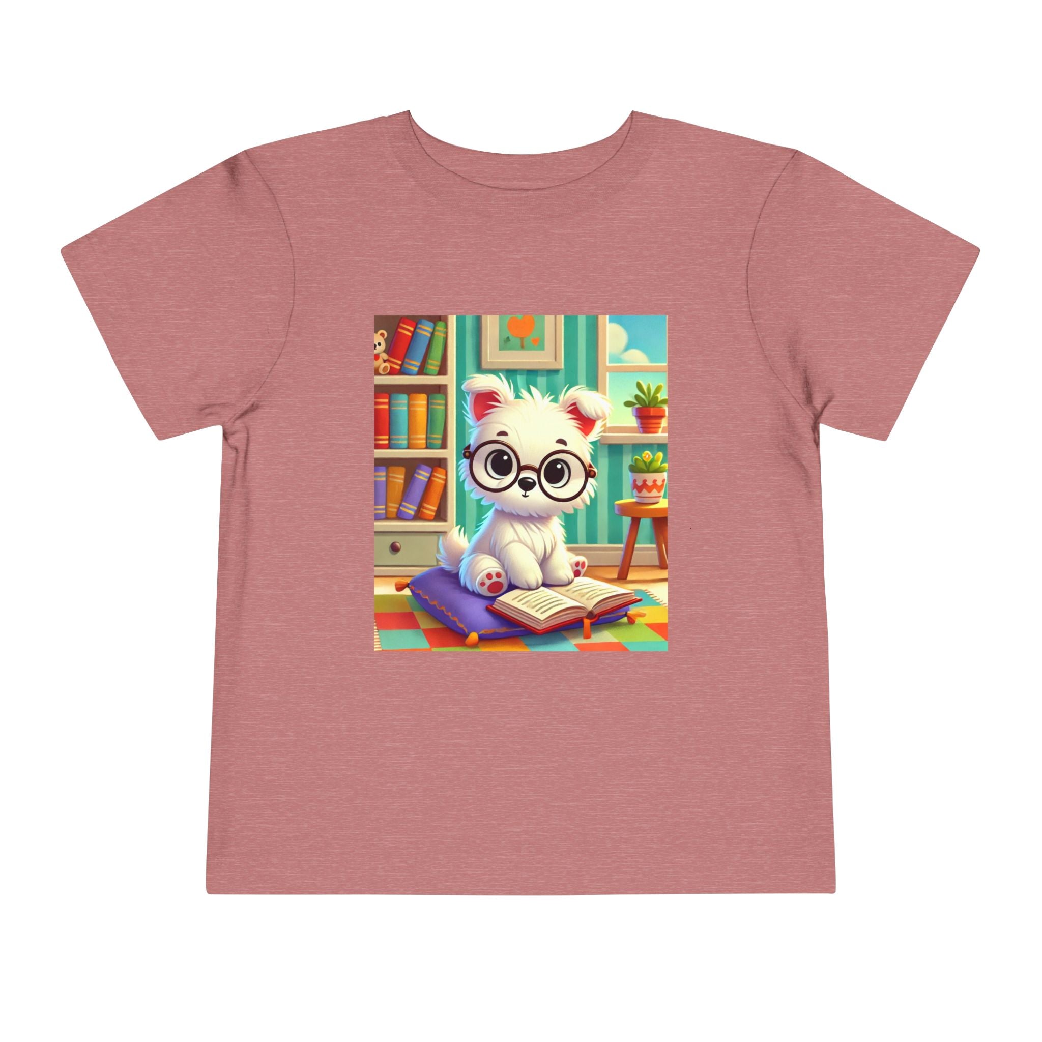 Little Scholar Pup Toddler Short Sleeve Tee turns everyday playtime into storytime, with a cozy illustrated scene that celebrates curiosity and the joy of reading. A fluffy white puppy, sweetly oversized round glasses perched on its nose, sits on a soft cushion with an open book—surrounded by colorful shelves, warm details, and gentle daylight for an inviting, nursery-ready mood.