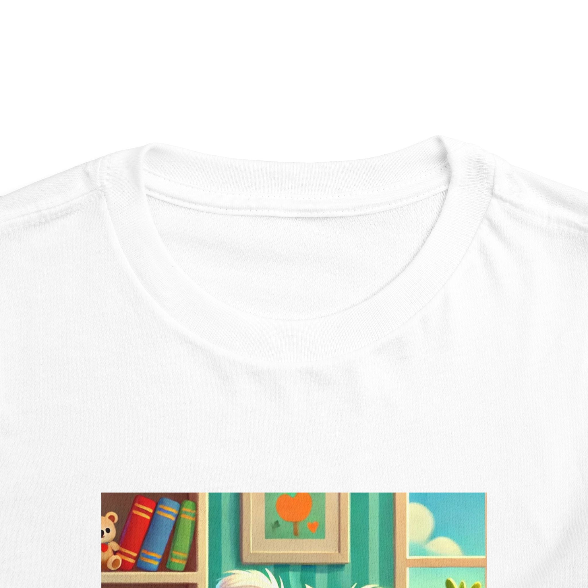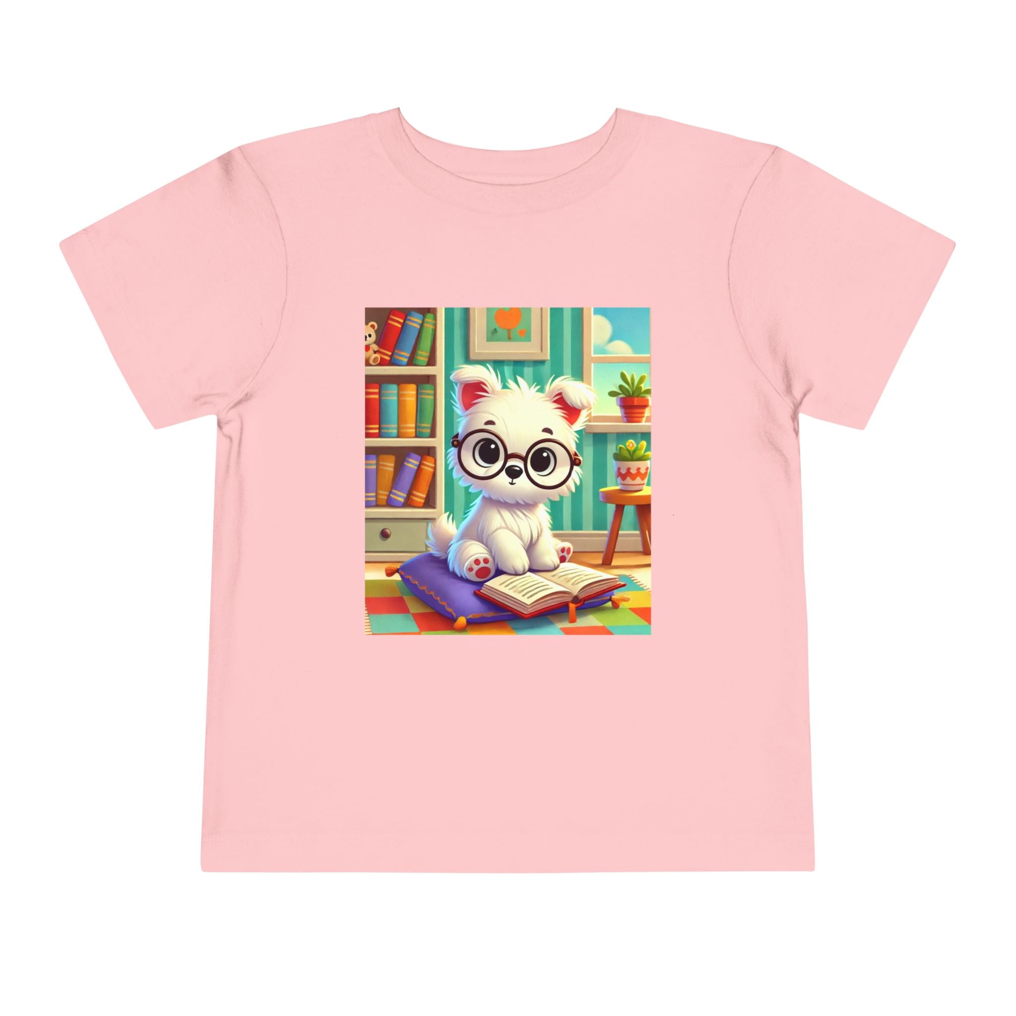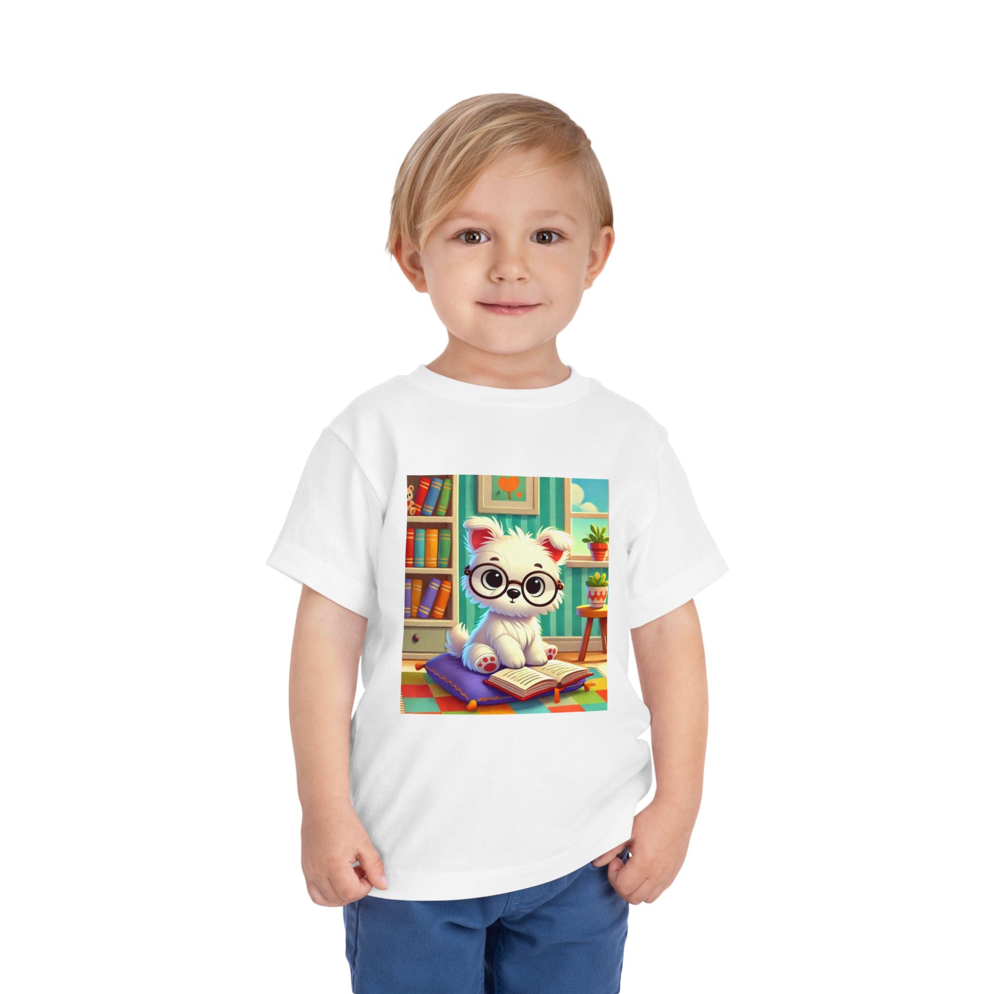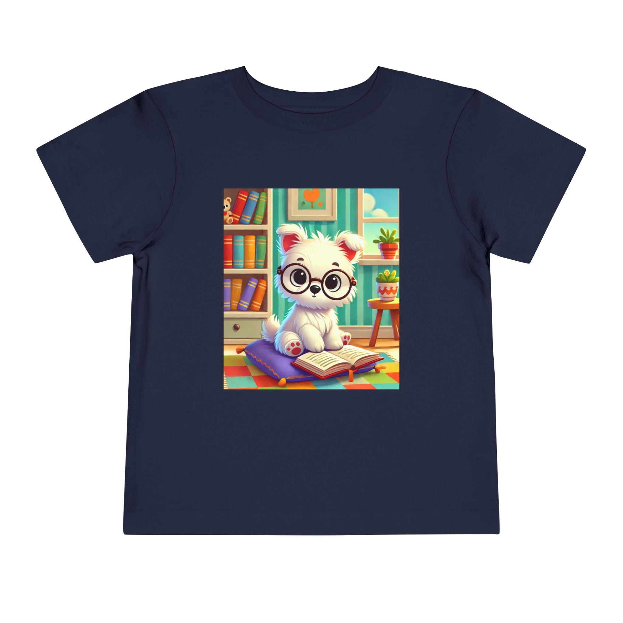 Little Scholar Pup Toddler Short Sleeve Tee turns everyday playtime into storytime, with a cozy illustrated scene that celebrates curiosity and the joy of reading. A fluffy white puppy, sweetly oversized round glasses perched on its nose, sits on a soft cushion with an open book—surrounded by colorful shelves, warm details, and gentle daylight for an inviting, nursery-ready mood.