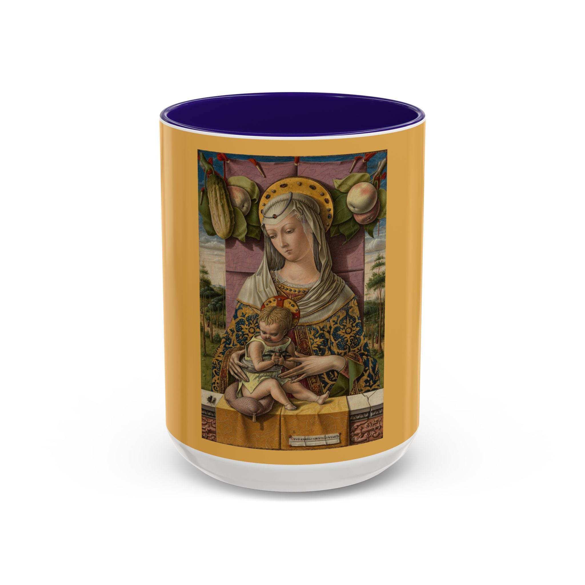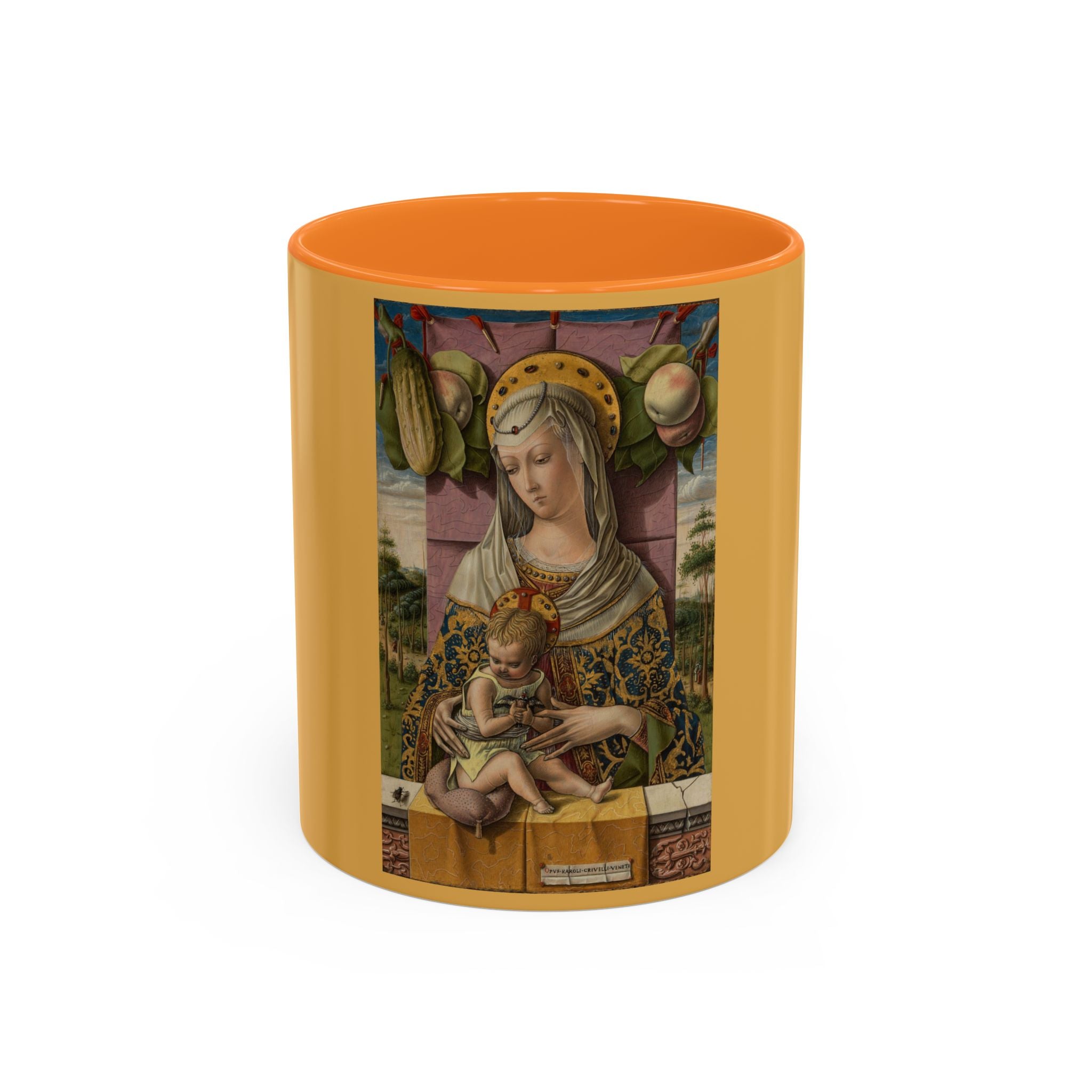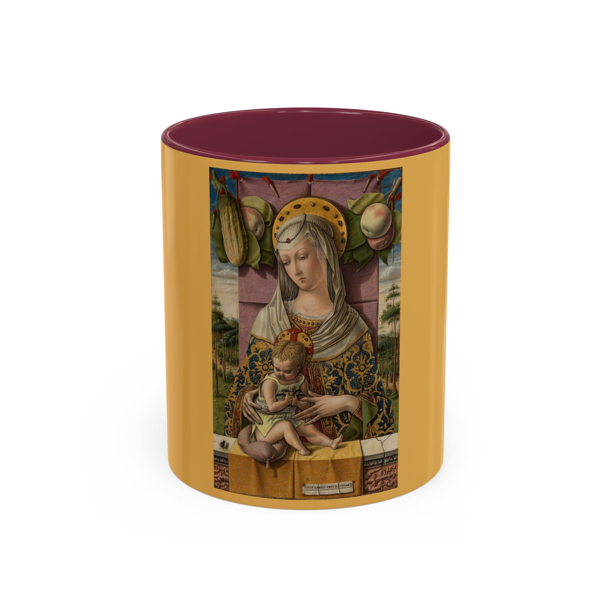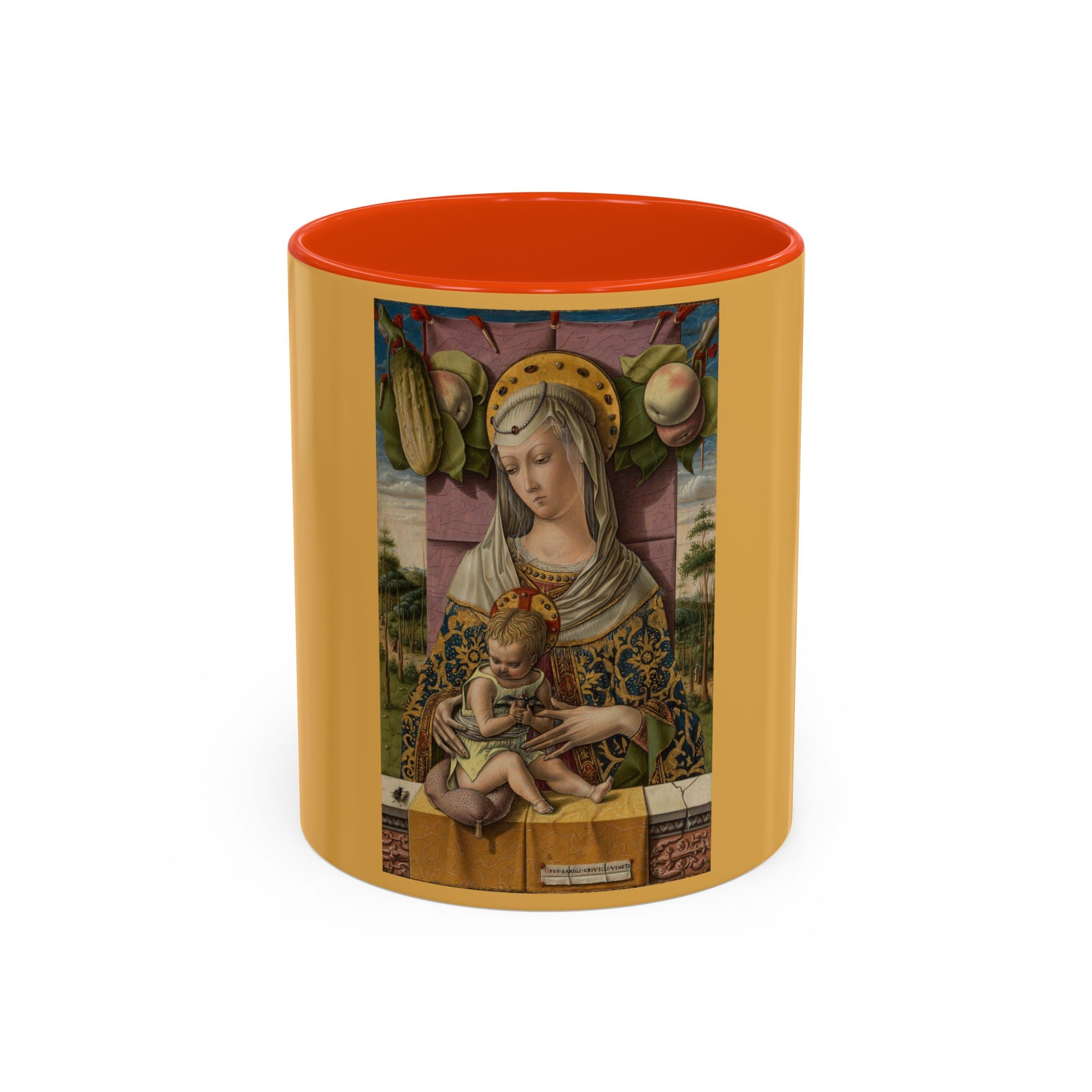 Artwork designed and digitally remastered by Sarasvati Designs. "Madonna and Child," believed to have been created around 1480 by the Italian Renaissance painter Carlo Crivelli, stands as one of the artist's most exquisite works. This perfectly preserved work is one of the artist's most exquisite pictures. Flemish painting may have inspired the remarkable precision of detail in the background, where turbaned figures (infidels) stroll. Trompe-l’oeil details are played against the doll-like prettiness of the Virgin. The apples and fly are symbols of sin and evil and are opposed to the cucumber and the goldfinch, symbols of redemption. Crivelli’s signature is on what looks like a piece of paper attached to the watered-silk cloth with wax.