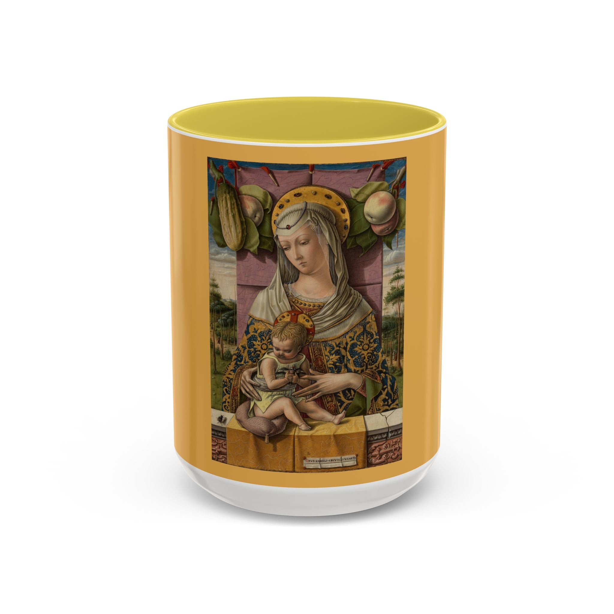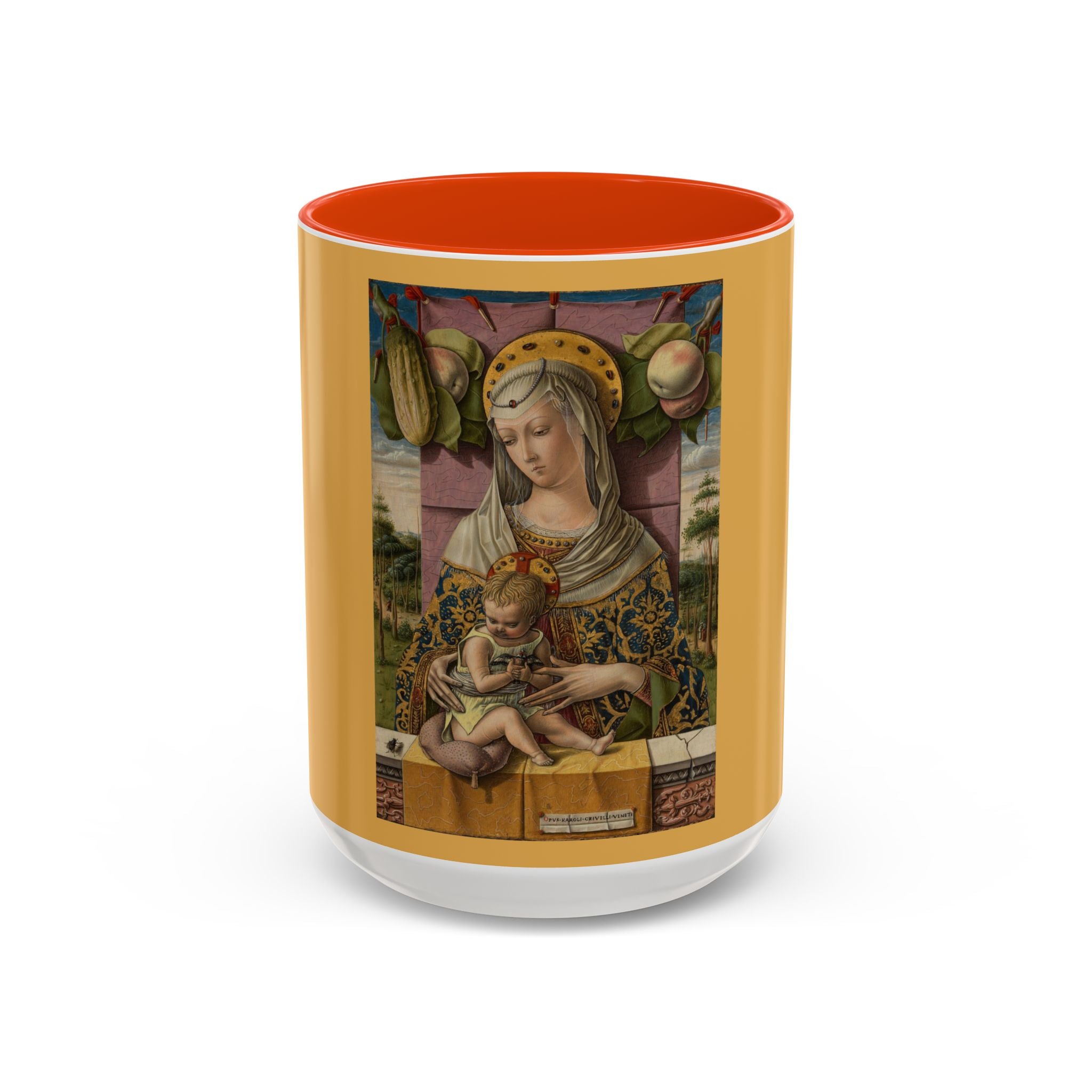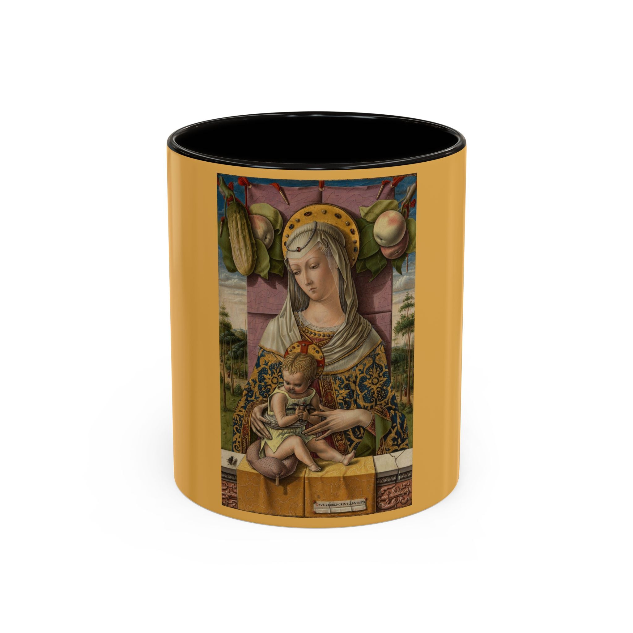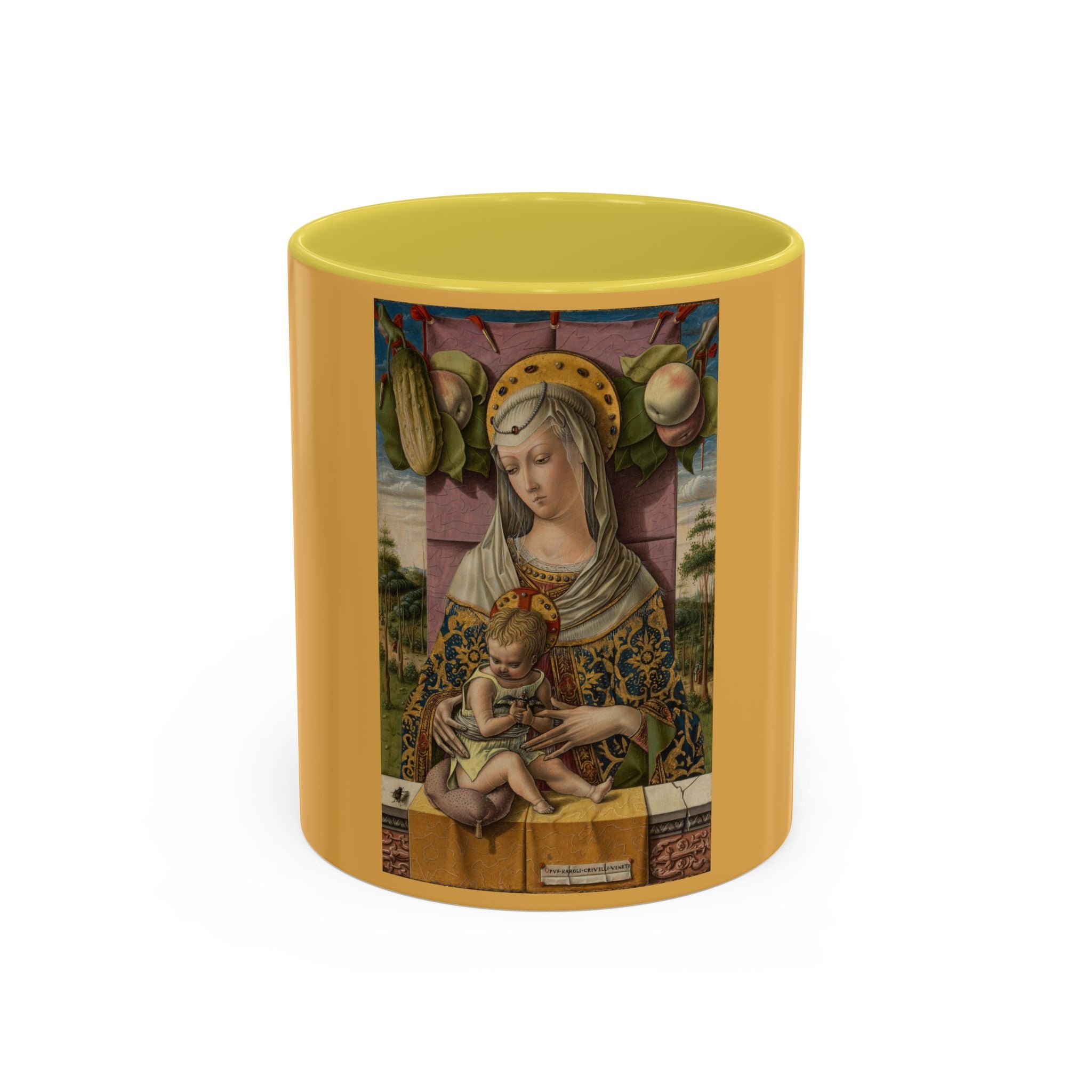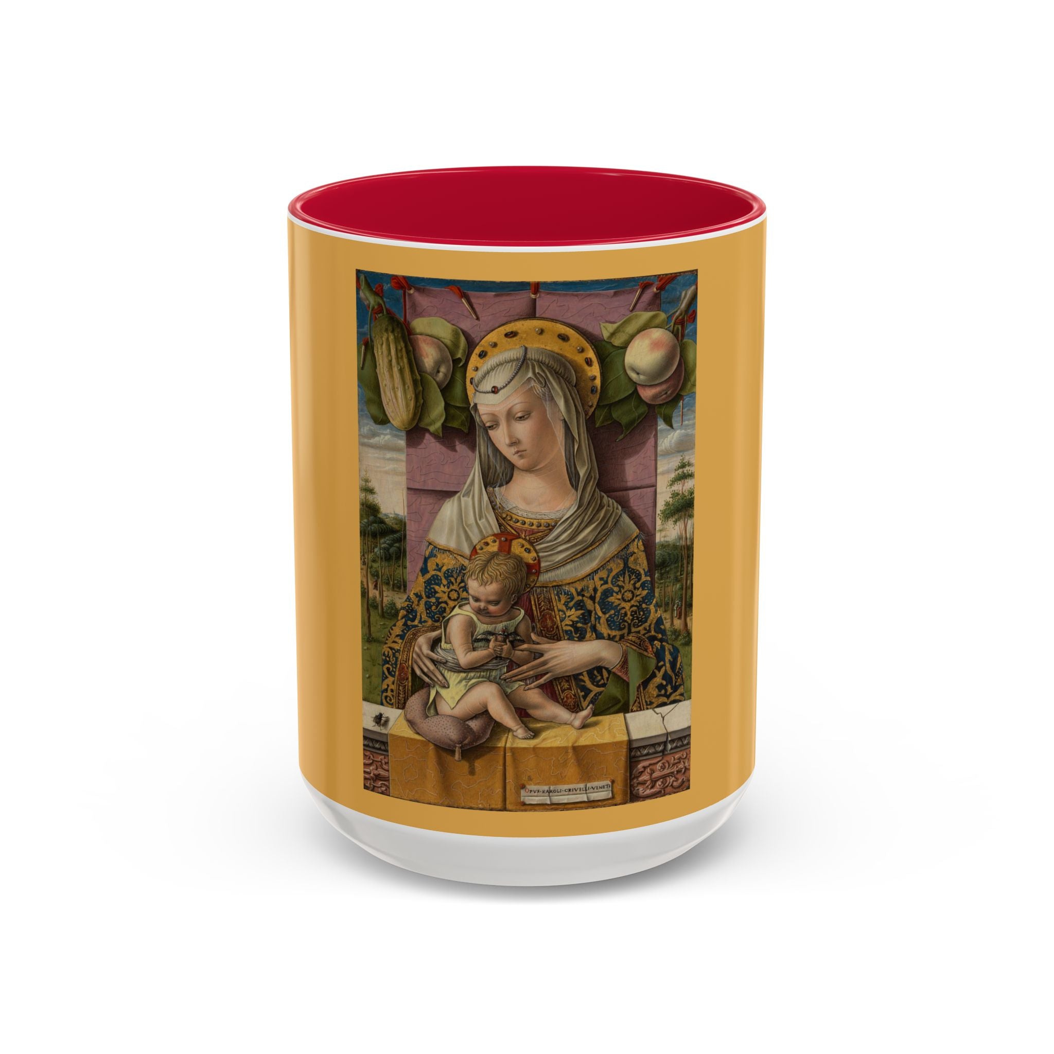 Artwork designed and digitally remastered by Sarasvati Designs. "Madonna and Child," believed to have been created around 1480 by the Italian Renaissance painter Carlo Crivelli, stands as one of the artist's most exquisite works. This perfectly preserved work is one of the artist's most exquisite pictures. Flemish painting may have inspired the remarkable precision of detail in the background, where turbaned figures (infidels) stroll. Trompe-l’oeil details are played against the doll-like prettiness of the Virgin. The apples and fly are symbols of sin and evil and are opposed to the cucumber and the goldfinch, symbols of redemption. Crivelli’s signature is on what looks like a piece of paper attached to the watered-silk cloth with wax.