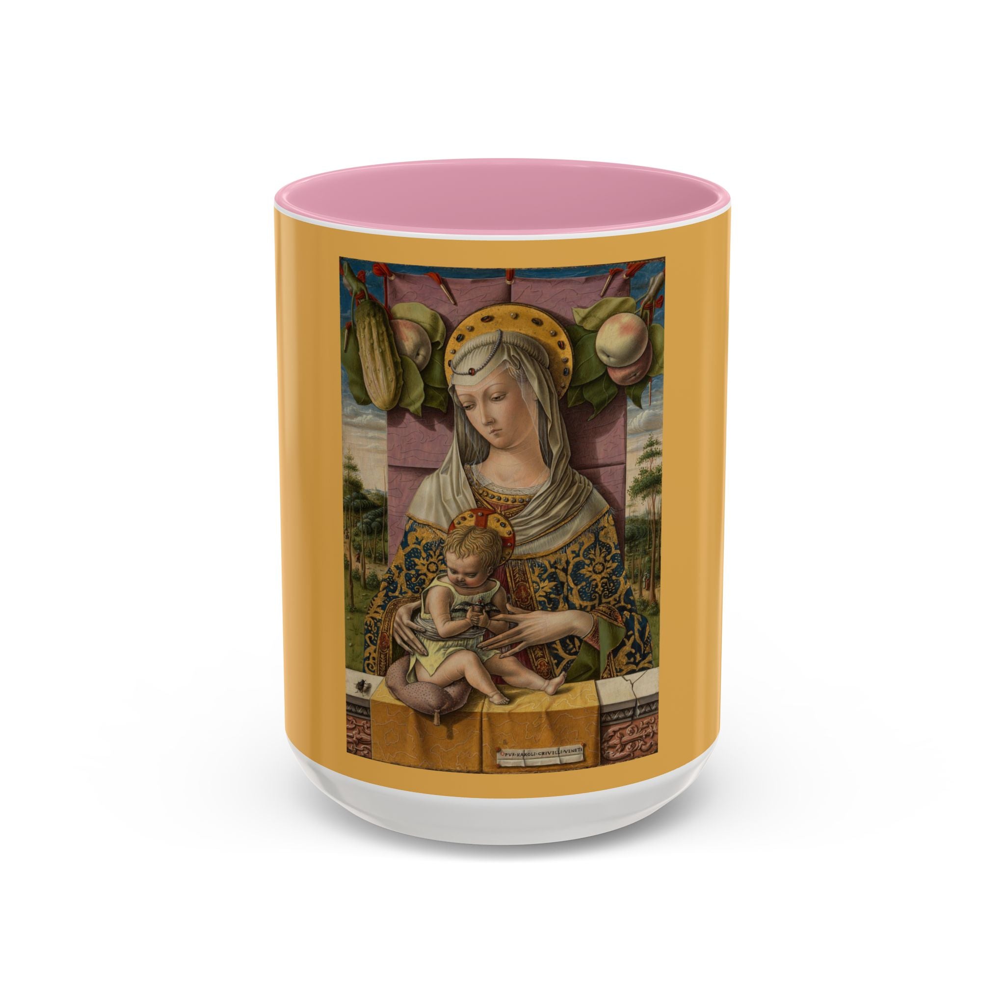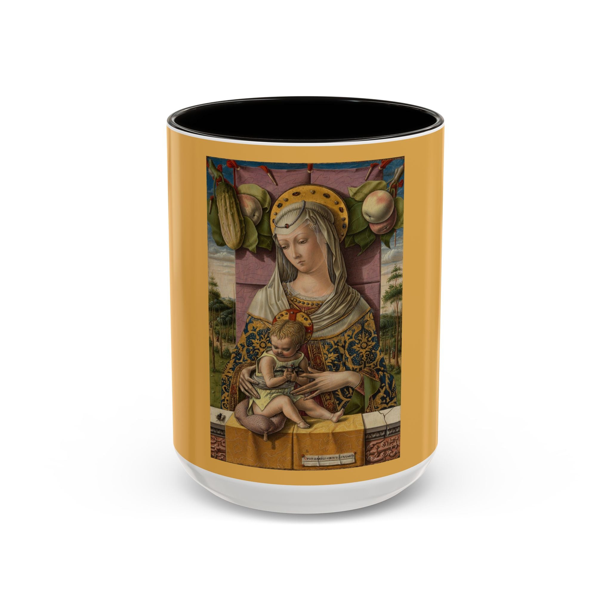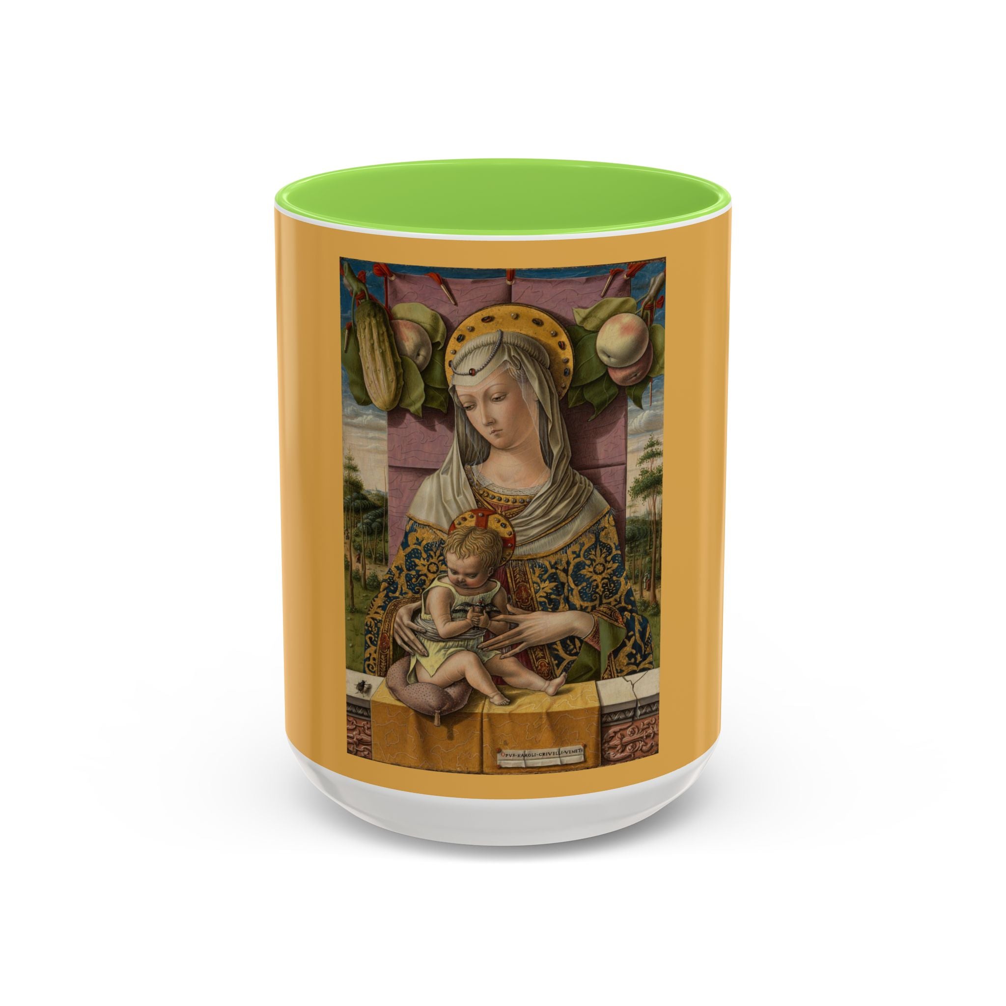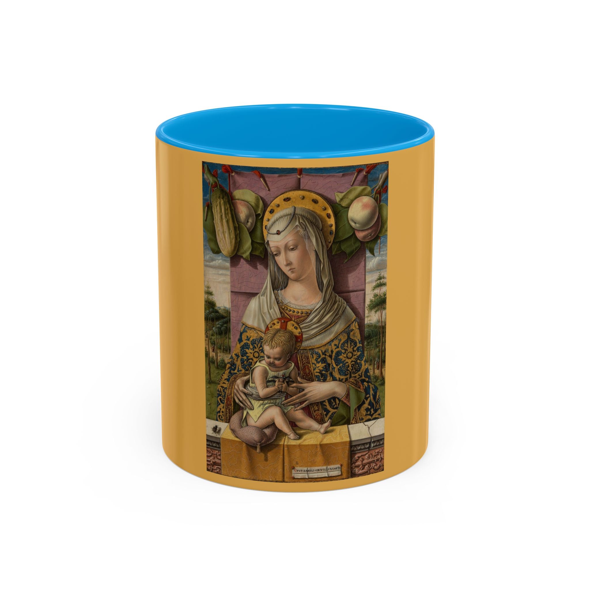 Artwork designed and digitally remastered by Sarasvati Designs. "Madonna and Child," believed to have been created around 1480 by the Italian Renaissance painter Carlo Crivelli, stands as one of the artist's most exquisite works. This perfectly preserved work is one of the artist's most exquisite pictures. Flemish painting may have inspired the remarkable precision of detail in the background, where turbaned figures (infidels) stroll. Trompe-l’oeil details are played against the doll-like prettiness of the Virgin. The apples and fly are symbols of sin and evil and are opposed to the cucumber and the goldfinch, symbols of redemption. Crivelli’s signature is on what looks like a piece of paper attached to the watered-silk cloth with wax.