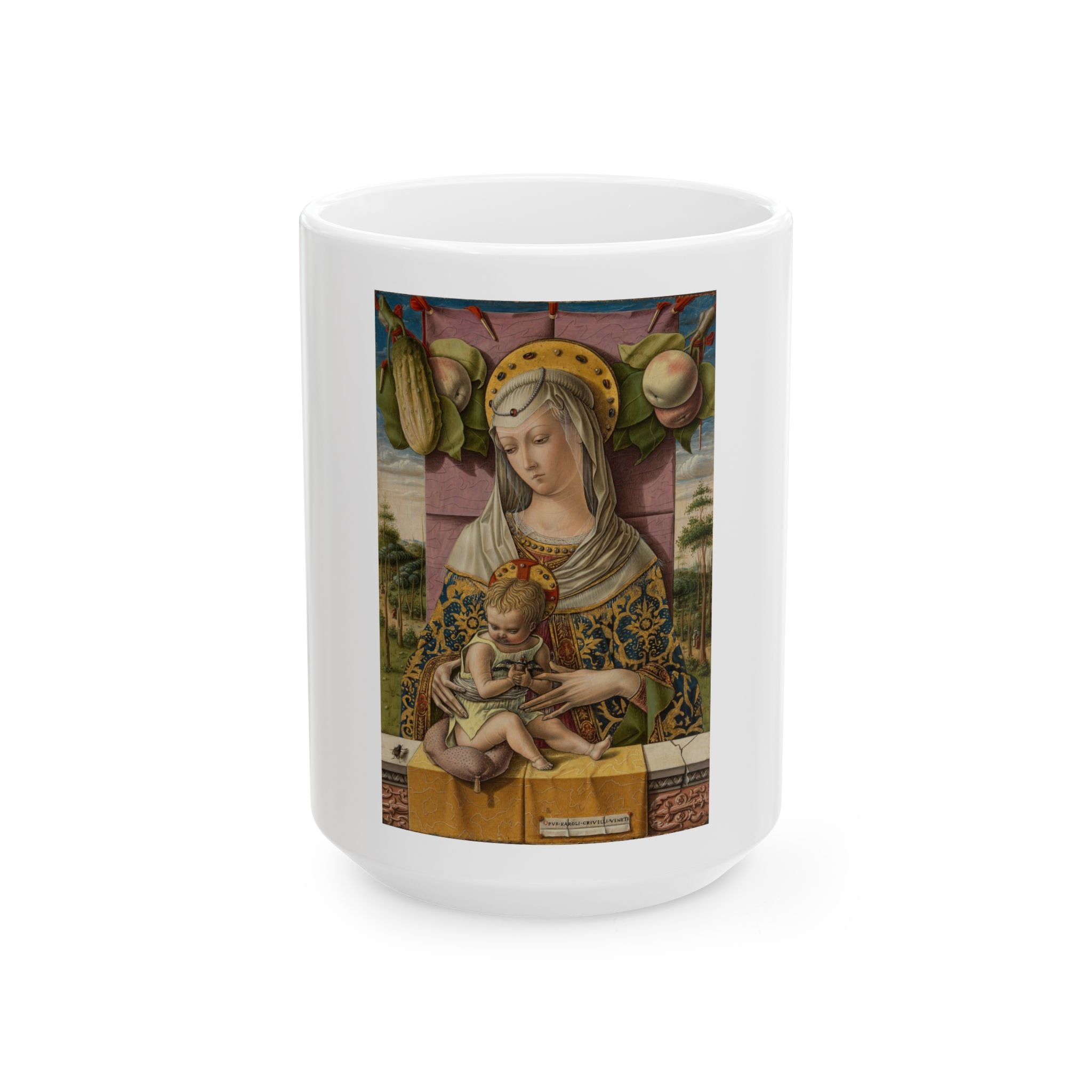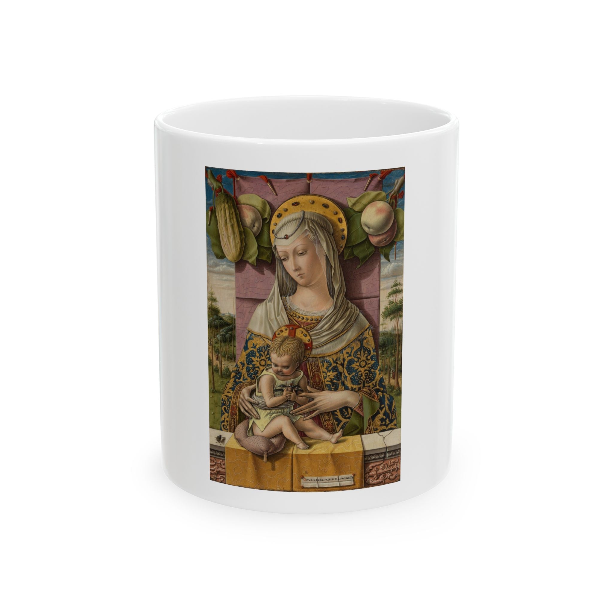 Artwork designed and digitally remastered by Sarasvati Designs. "Madonna and Child," believed to have been created around 1480 by the Italian Renaissance painter Carlo Crivelli, stands as one of the artist's most exquisite works. This perfectly preserved work is one of the artist's most exquisite pictures. Flemish painting may have inspired the remarkable precision of detail in the background, where turbaned figures (infidels) stroll. Trompe-l’oeil details are played against the doll-like prettiness of the Virgin. The apples and fly are symbols of sin and evil and are opposed to the cucumber and the goldfinch, symbols of redemption. Crivelli’s signature is on what looks like a piece of paper attached to the watered-silk cloth with wax.