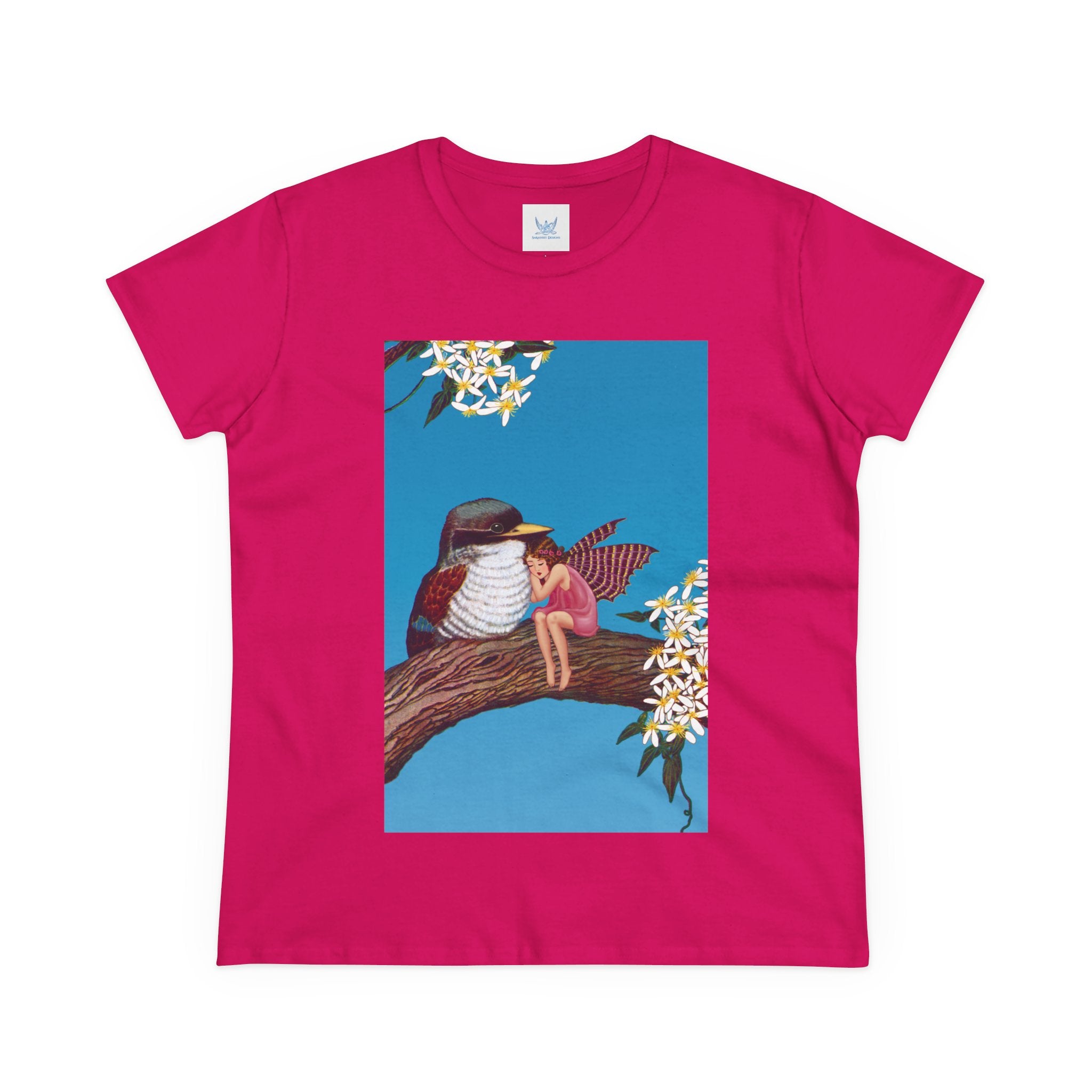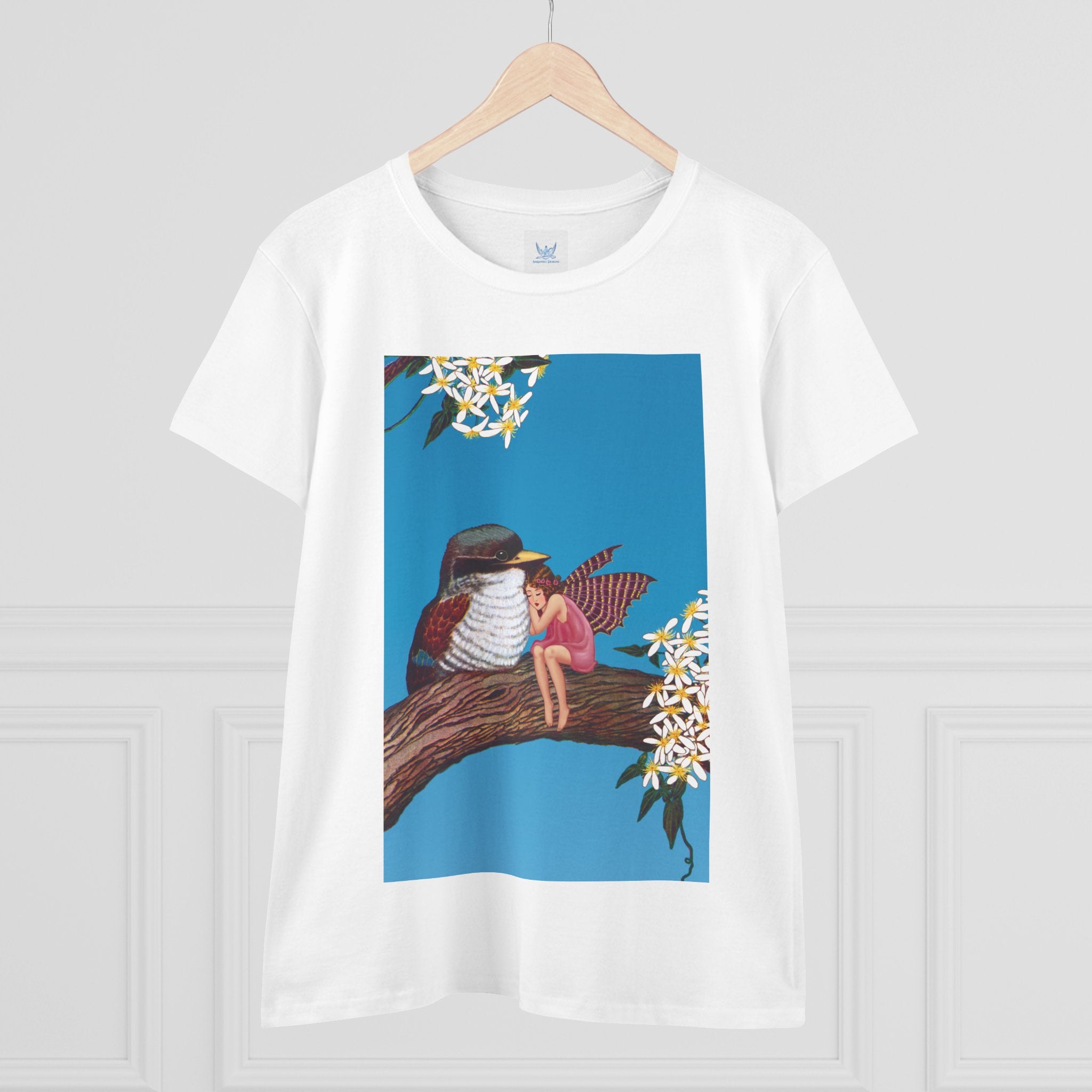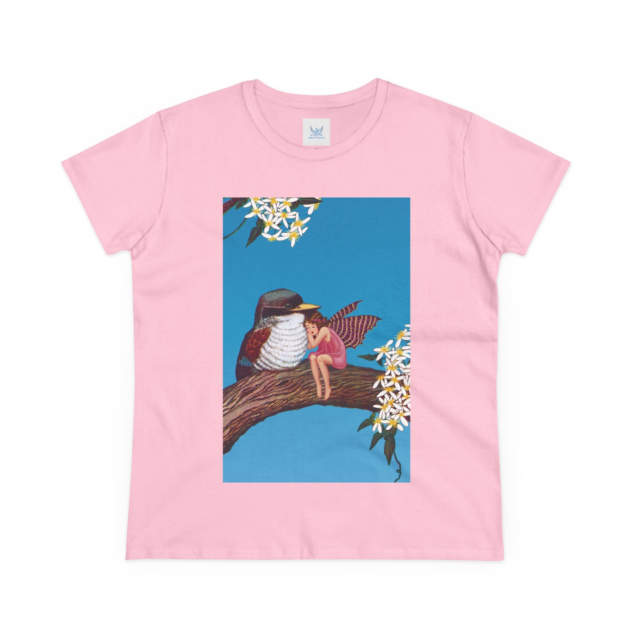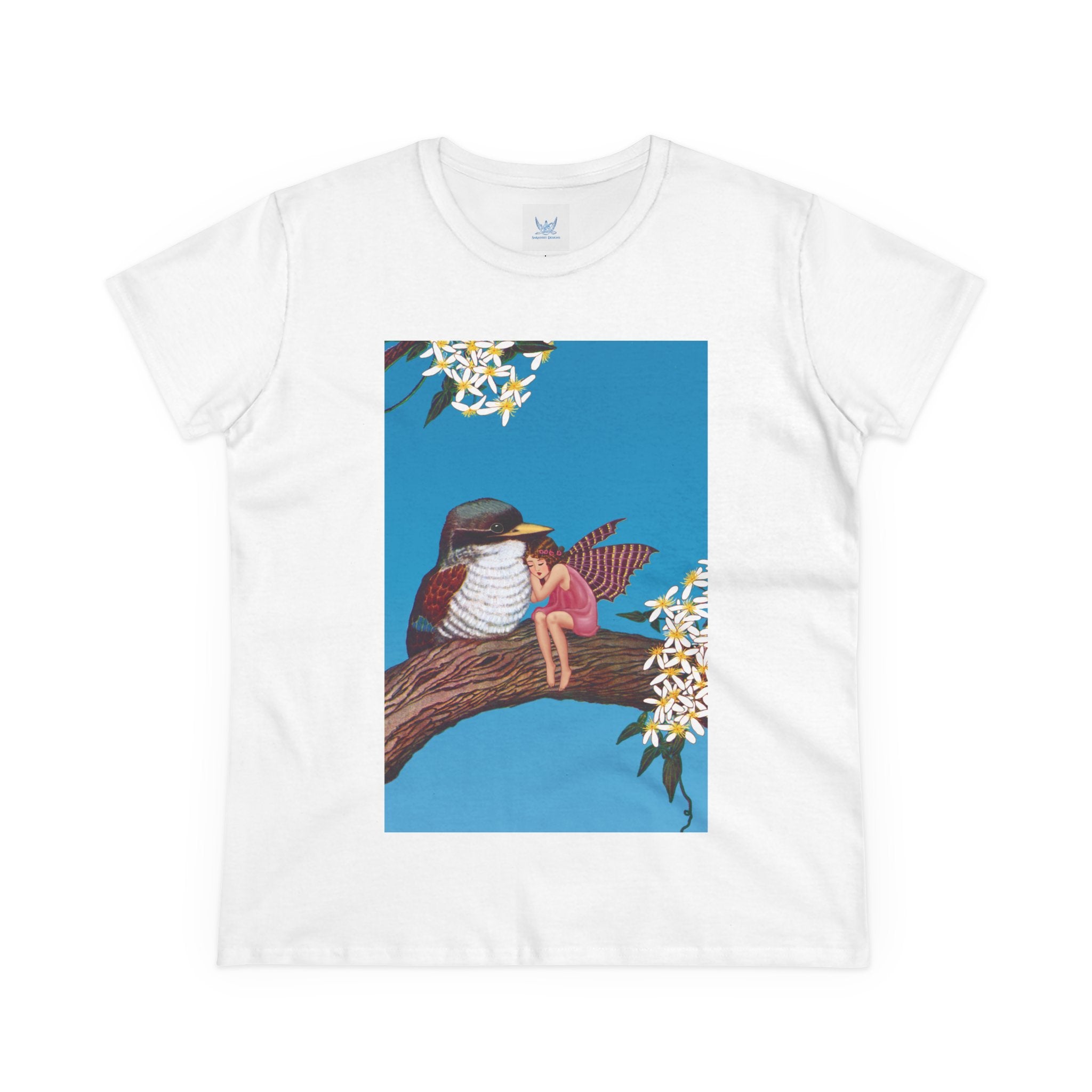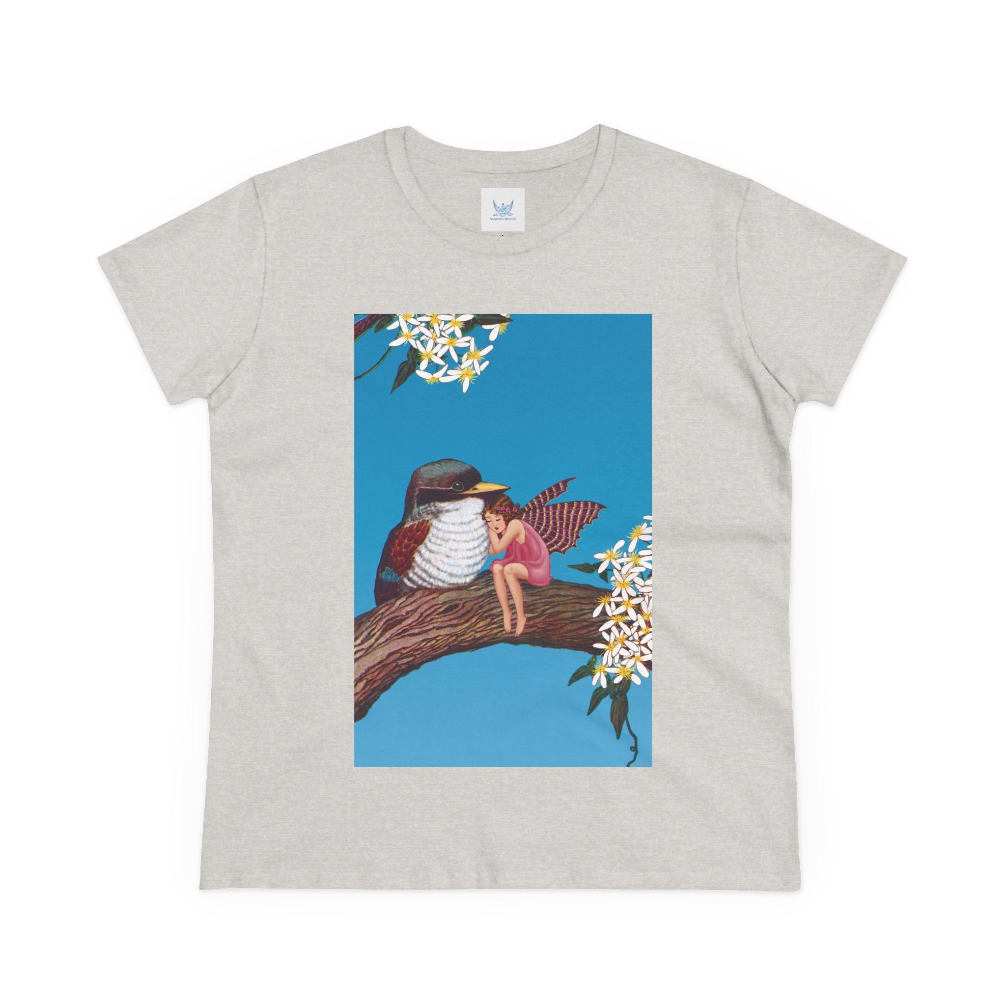 Magnolia Fairy and the Woodland Bird Cotton Tee brings together everyday comfort and enchanting artwork in one charming piece. Made from soft, light 100% cotton, this semi-fitted tee is pre-shrunk to stay true to size and features cap sleeves along with a taped neck and shoulders for lasting durability. As cozy as it is magical, the shirt showcases a serene spring tableau where a rosy-winged fairy sits beside a gentle woodland bird on a magnolia branch. White blossoms frame the scene against a vivid blue sky, creating a peaceful blend of nature and fantasy. This tee offers both quality craftsmanship and a sweet touch of whimsy, making it a perfect wearable piece of art.