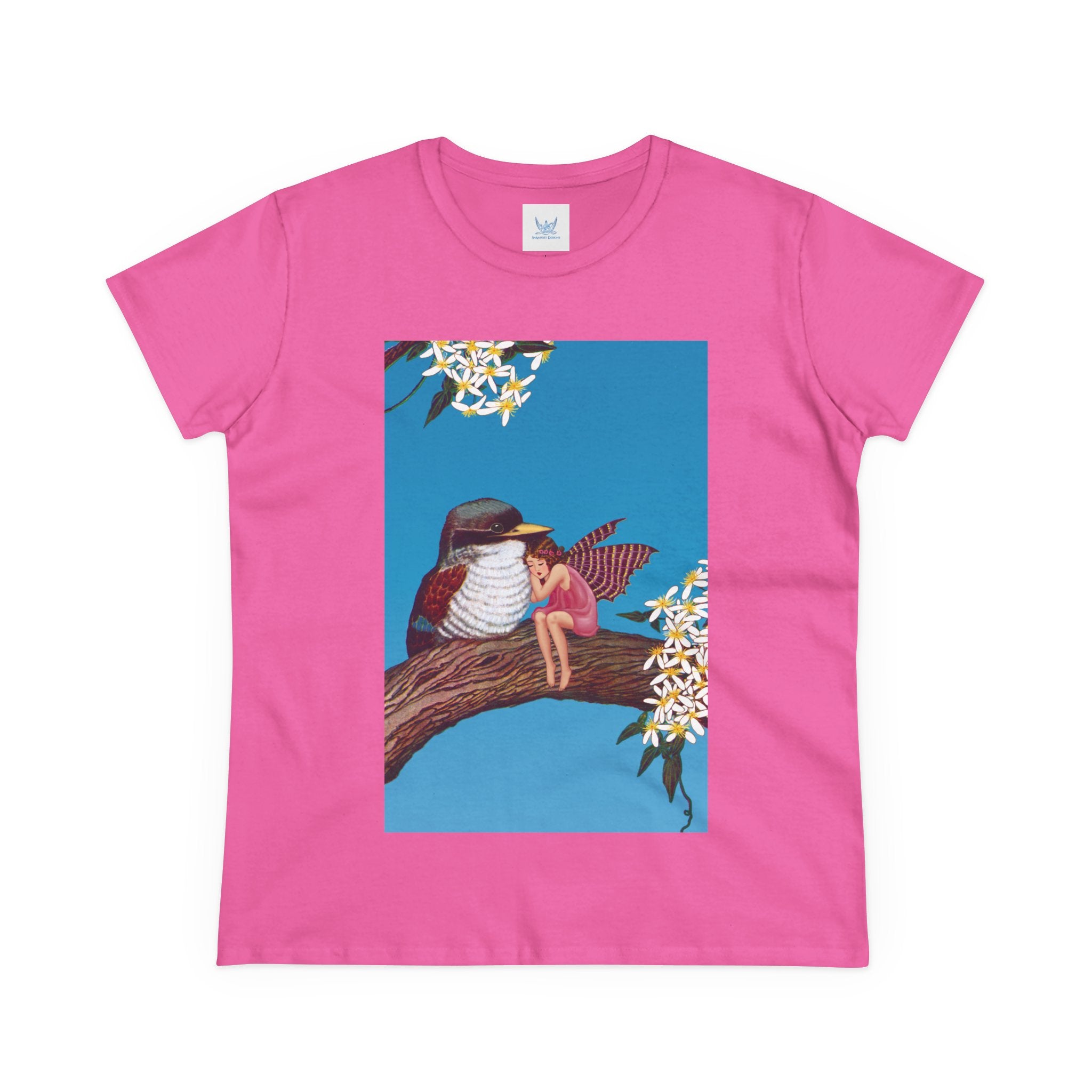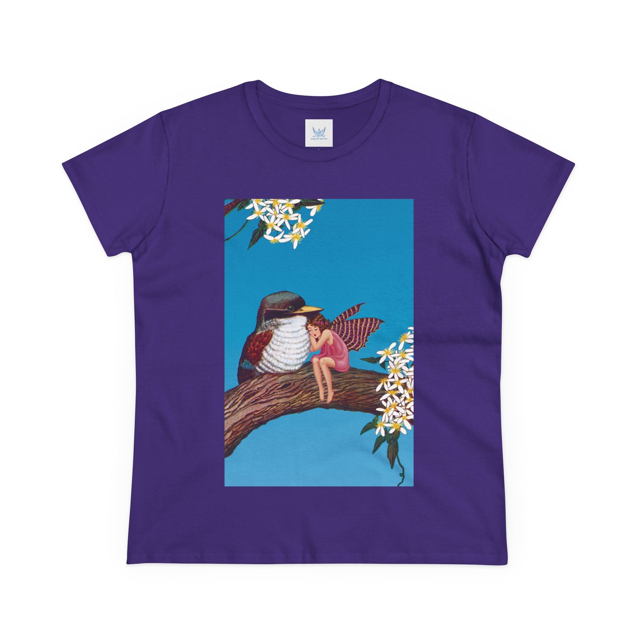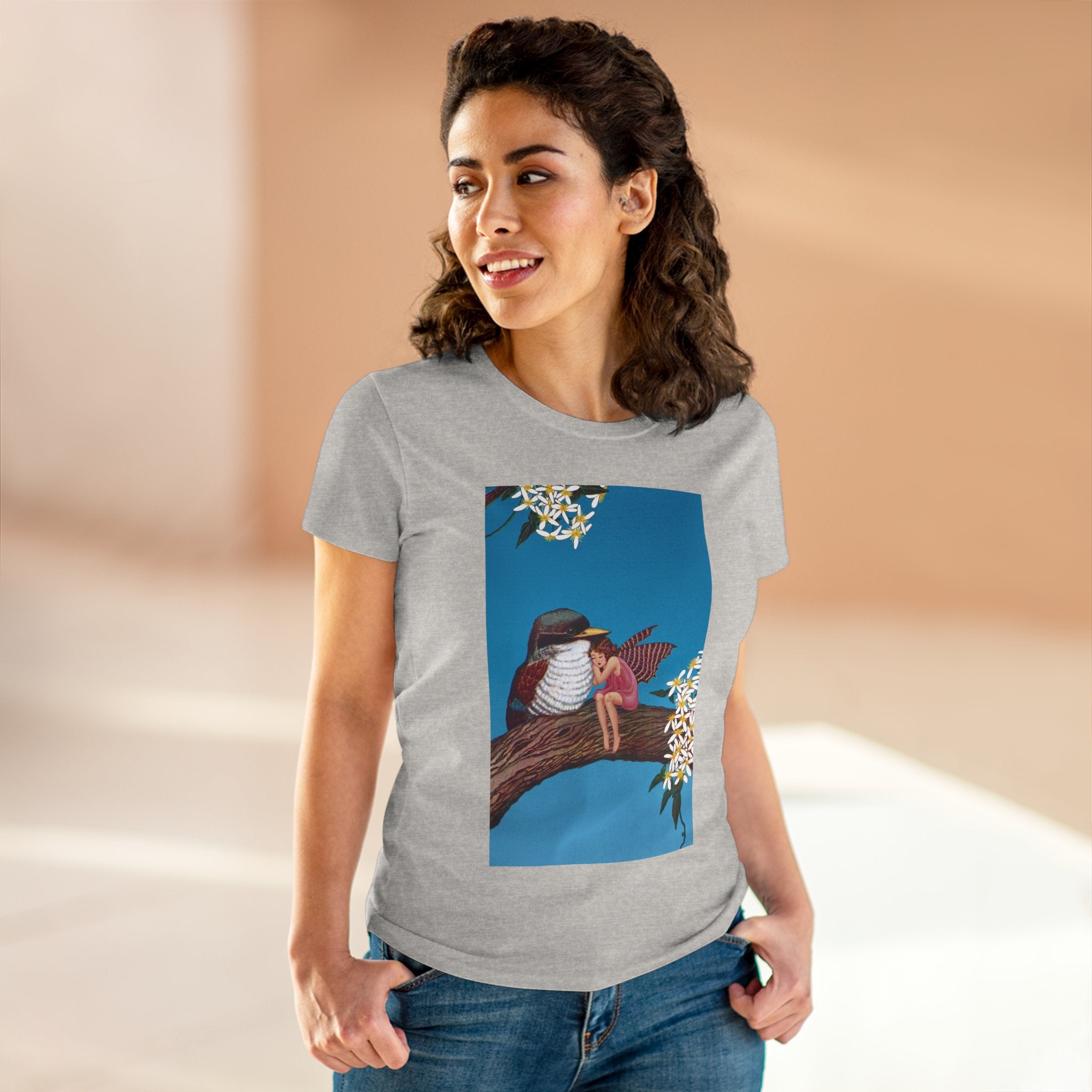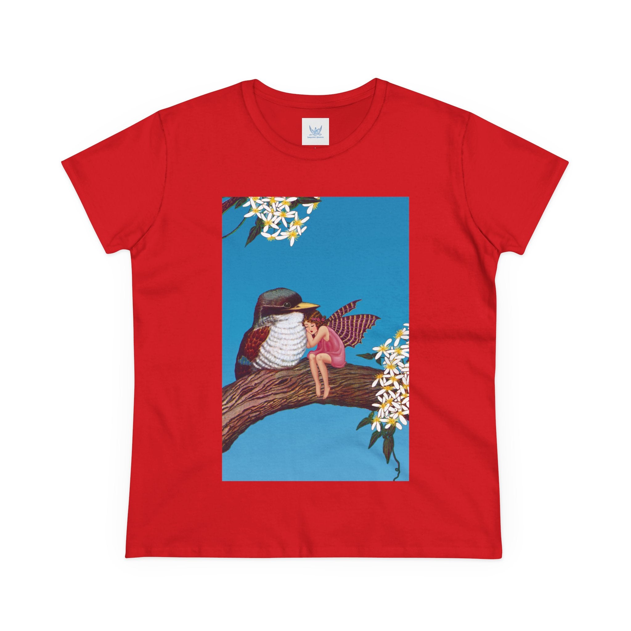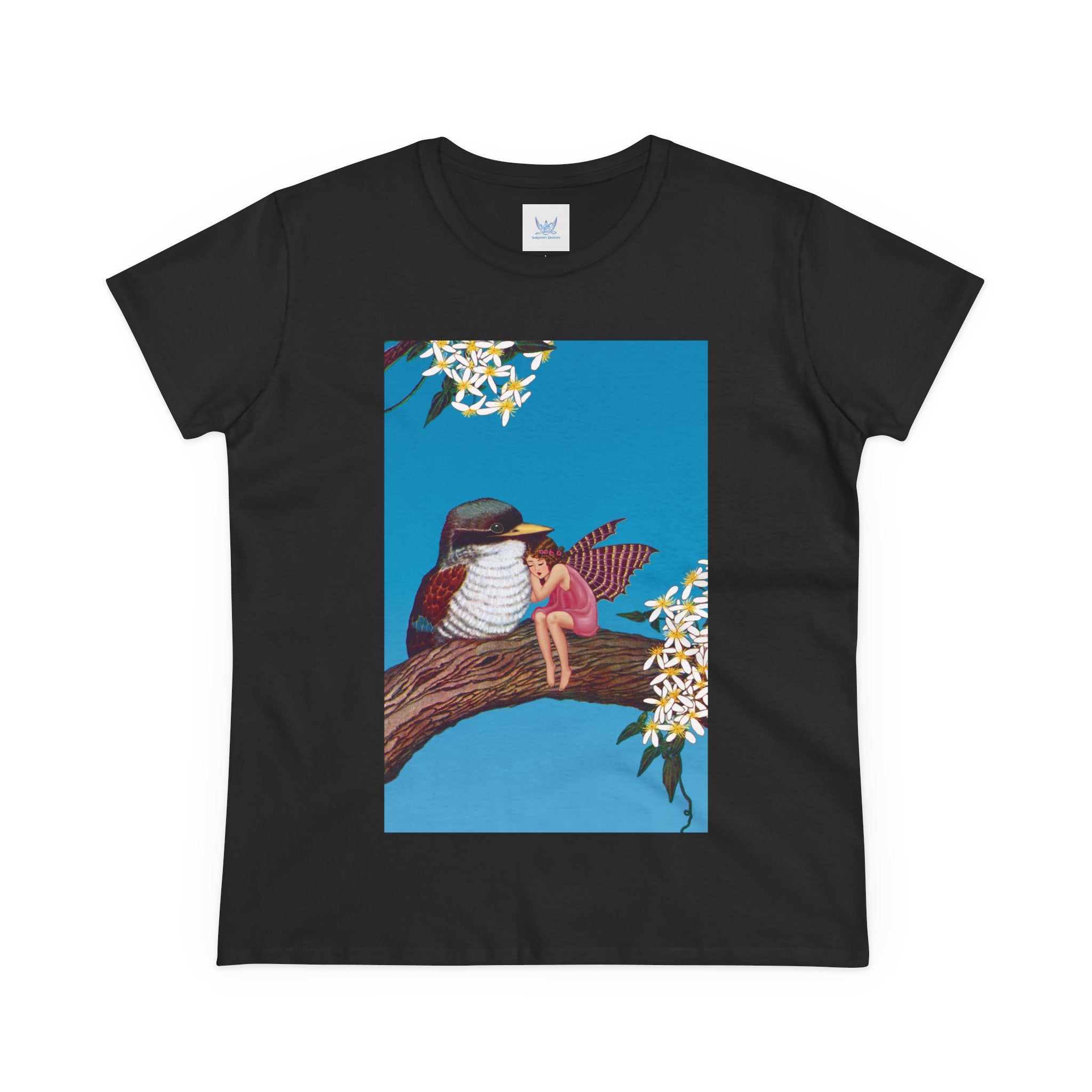 Magnolia Fairy and the Woodland Bird Cotton Tee brings together everyday comfort and enchanting artwork in one charming piece. Made from soft, light 100% cotton, this semi-fitted tee is pre-shrunk to stay true to size and features cap sleeves along with a taped neck and shoulders for lasting durability. As cozy as it is magical, the shirt showcases a serene spring tableau where a rosy-winged fairy sits beside a gentle woodland bird on a magnolia branch. White blossoms frame the scene against a vivid blue sky, creating a peaceful blend of nature and fantasy. This tee offers both quality craftsmanship and a sweet touch of whimsy, making it a perfect wearable piece of art.