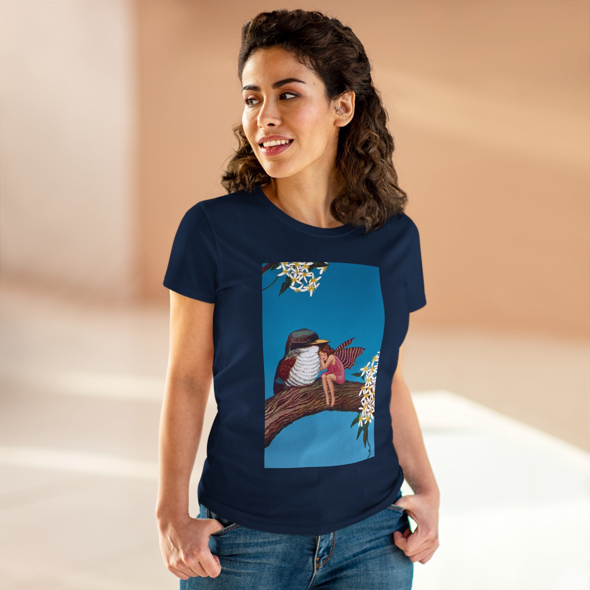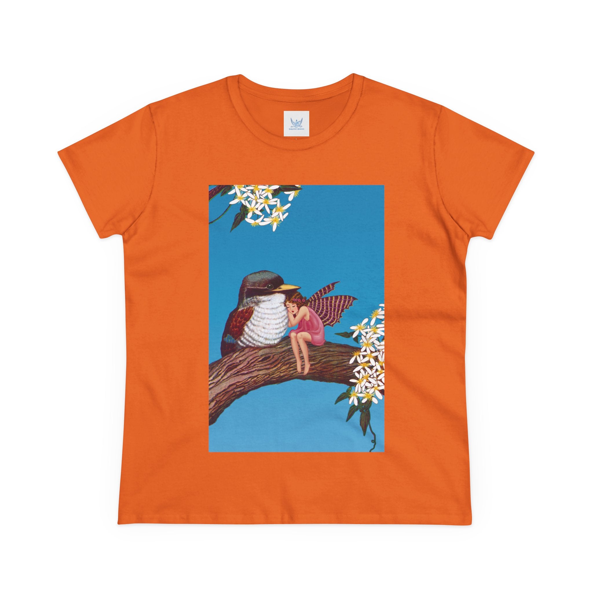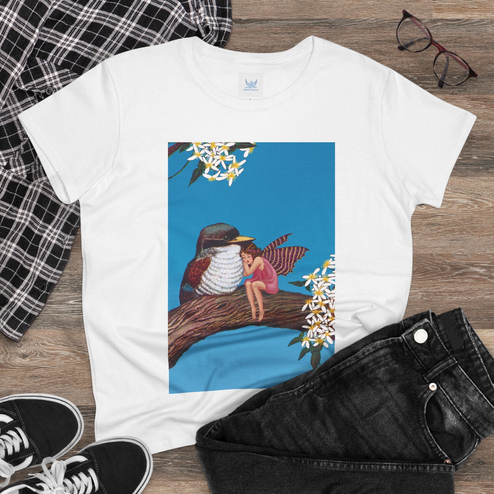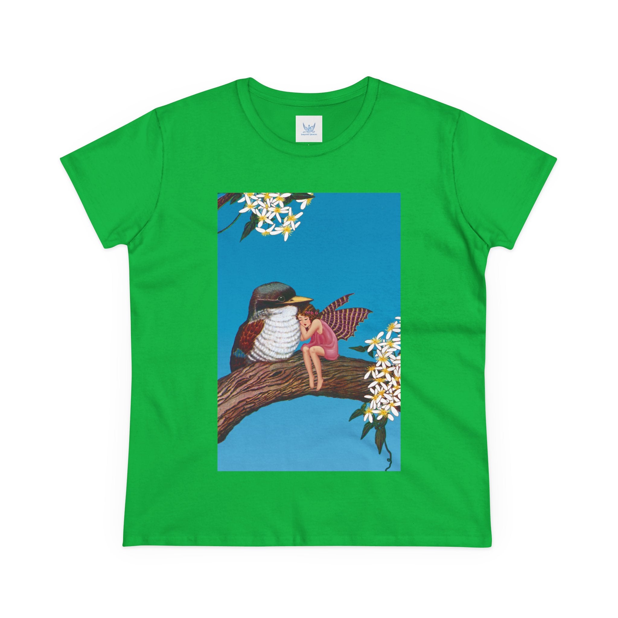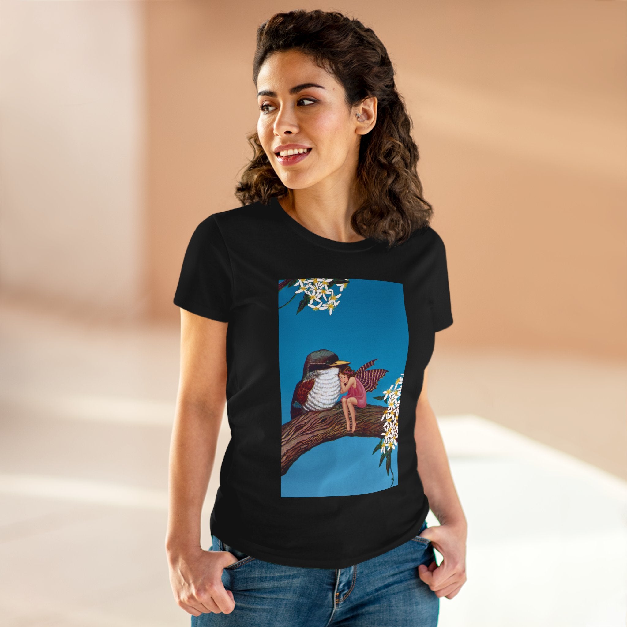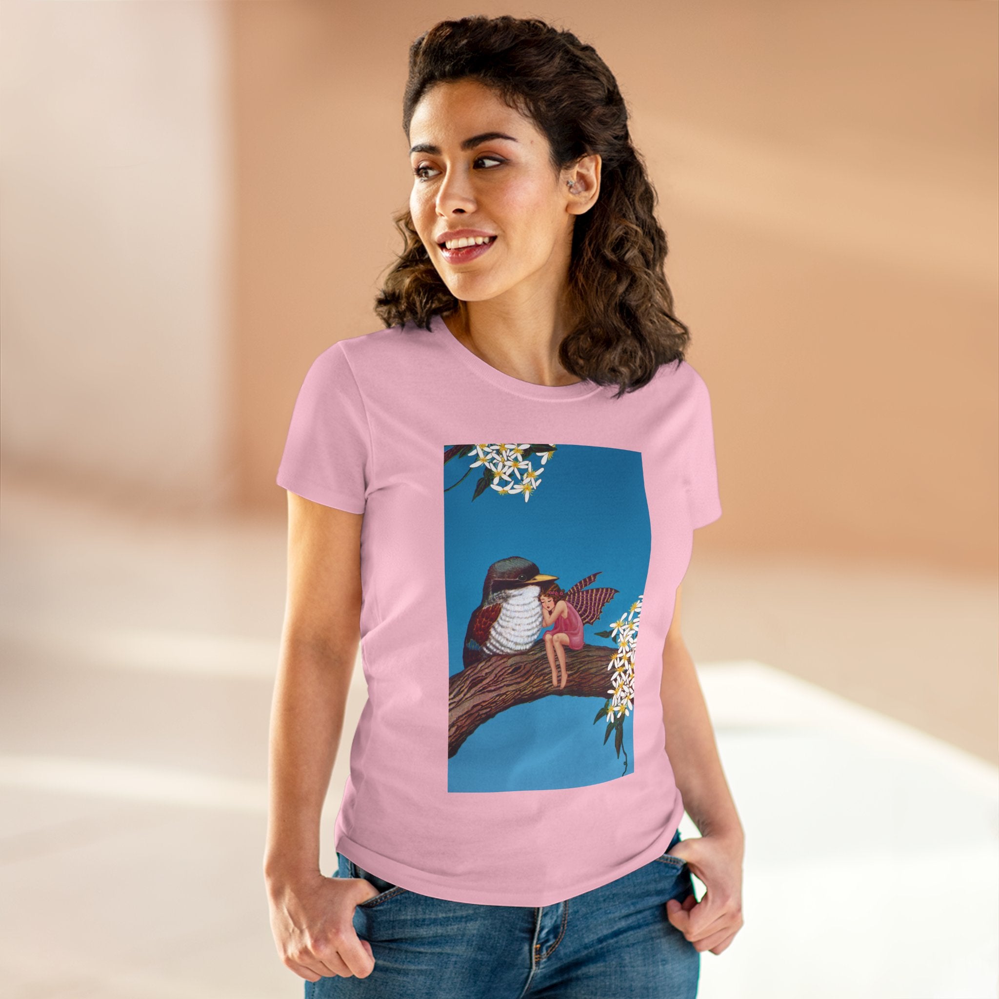 Magnolia Fairy and the Woodland Bird Cotton Tee brings together everyday comfort and enchanting artwork in one charming piece. Made from soft, light 100% cotton, this semi-fitted tee is pre-shrunk to stay true to size and features cap sleeves along with a taped neck and shoulders for lasting durability. As cozy as it is magical, the shirt showcases a serene spring tableau where a rosy-winged fairy sits beside a gentle woodland bird on a magnolia branch. White blossoms frame the scene against a vivid blue sky, creating a peaceful blend of nature and fantasy. This tee offers both quality craftsmanship and a sweet touch of whimsy, making it a perfect wearable piece of art.
