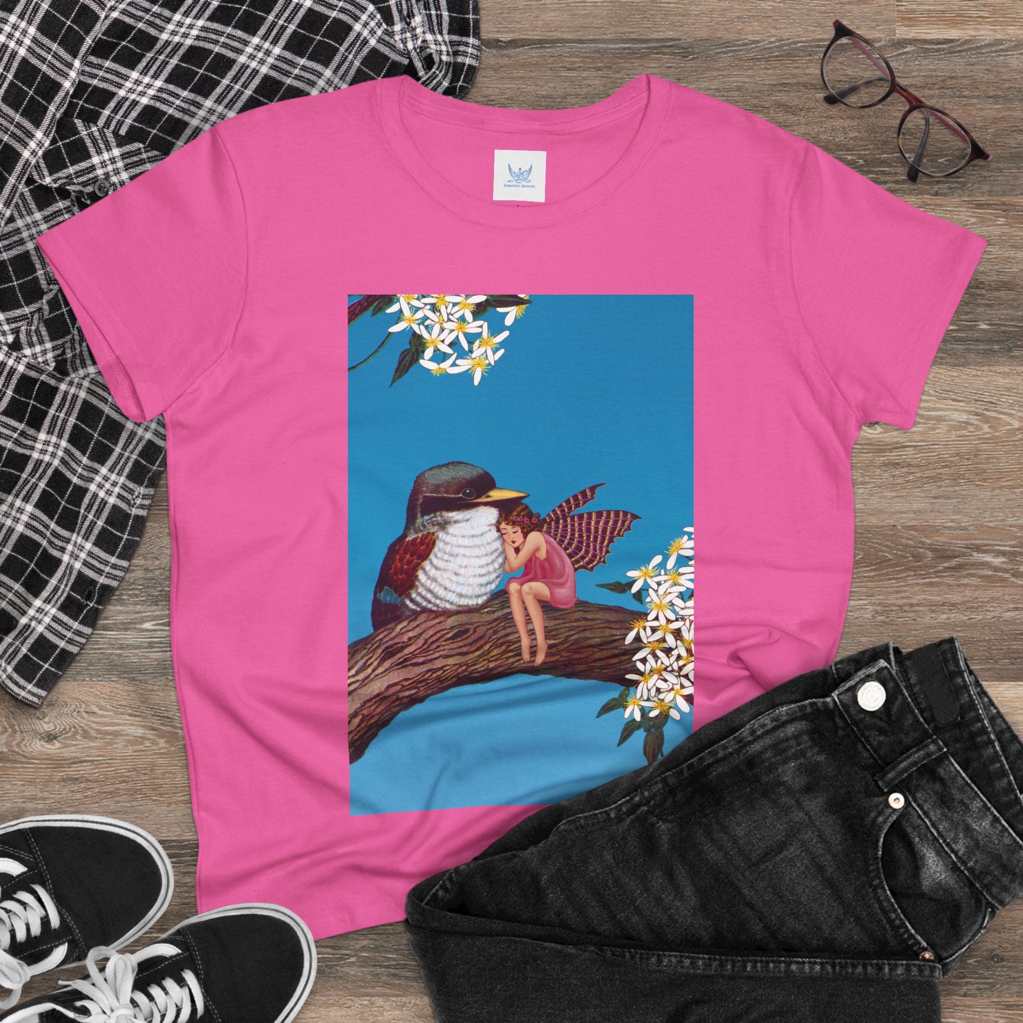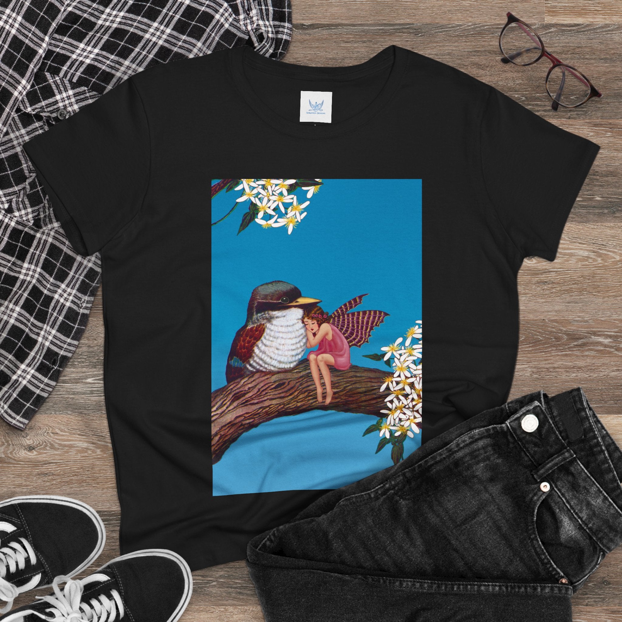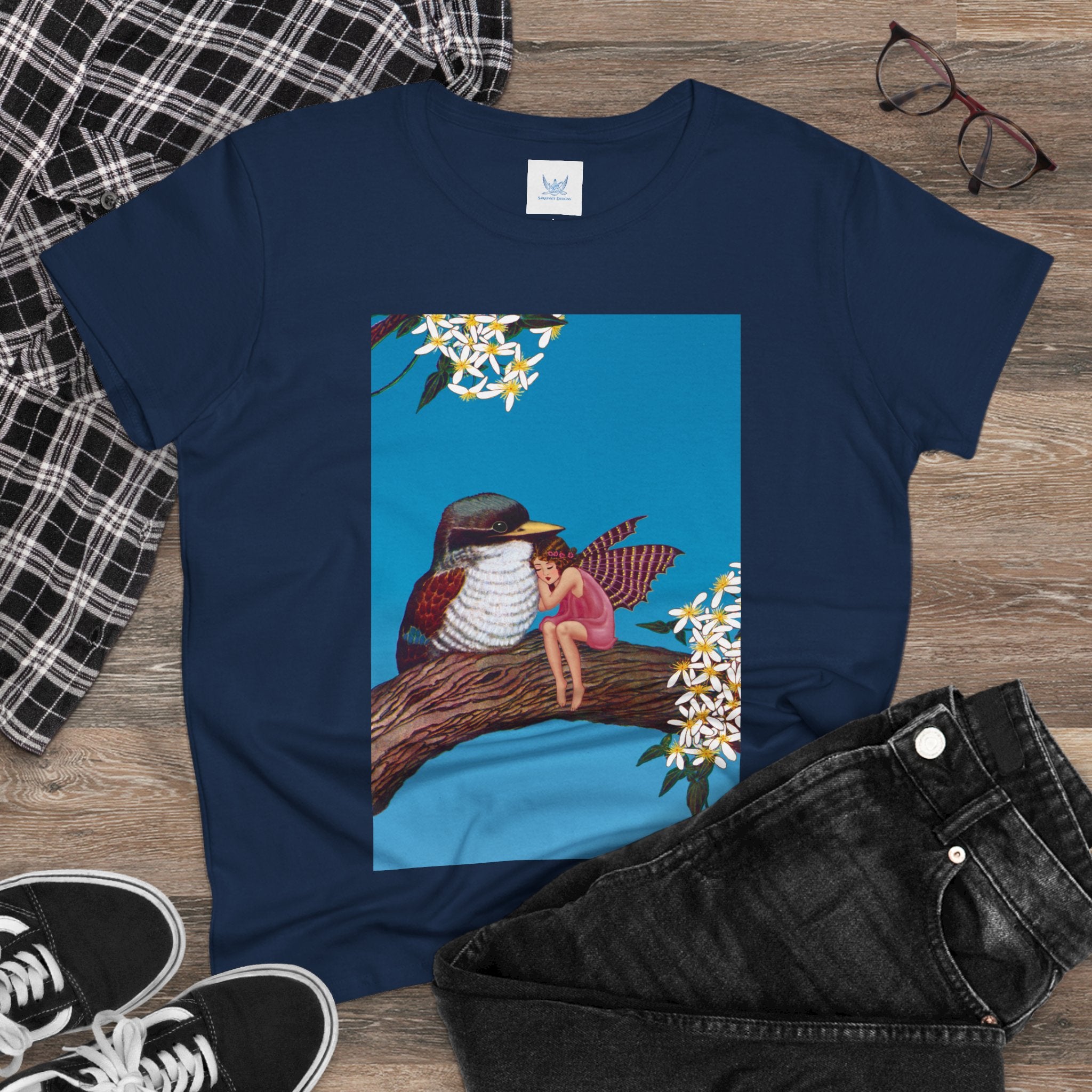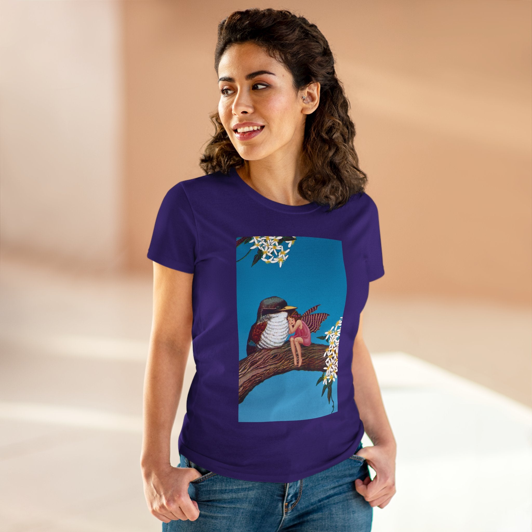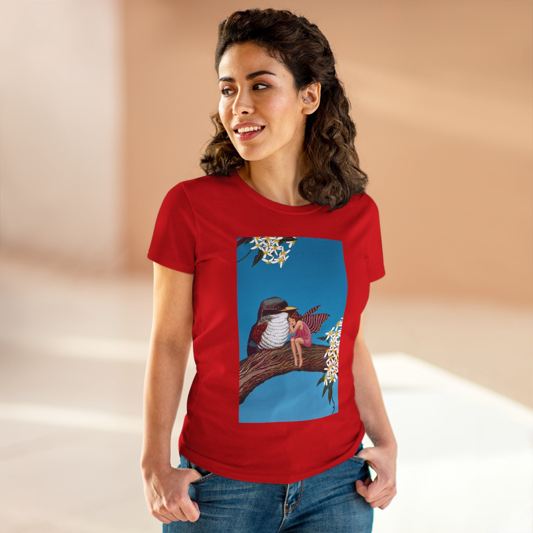 Magnolia Fairy and the Woodland Bird Cotton Tee brings together everyday comfort and enchanting artwork in one charming piece. Made from soft, light 100% cotton, this semi-fitted tee is pre-shrunk to stay true to size and features cap sleeves along with a taped neck and shoulders for lasting durability. As cozy as it is magical, the shirt showcases a serene spring tableau where a rosy-winged fairy sits beside a gentle woodland bird on a magnolia branch. White blossoms frame the scene against a vivid blue sky, creating a peaceful blend of nature and fantasy. This tee offers both quality craftsmanship and a sweet touch of whimsy, making it a perfect wearable piece of art.