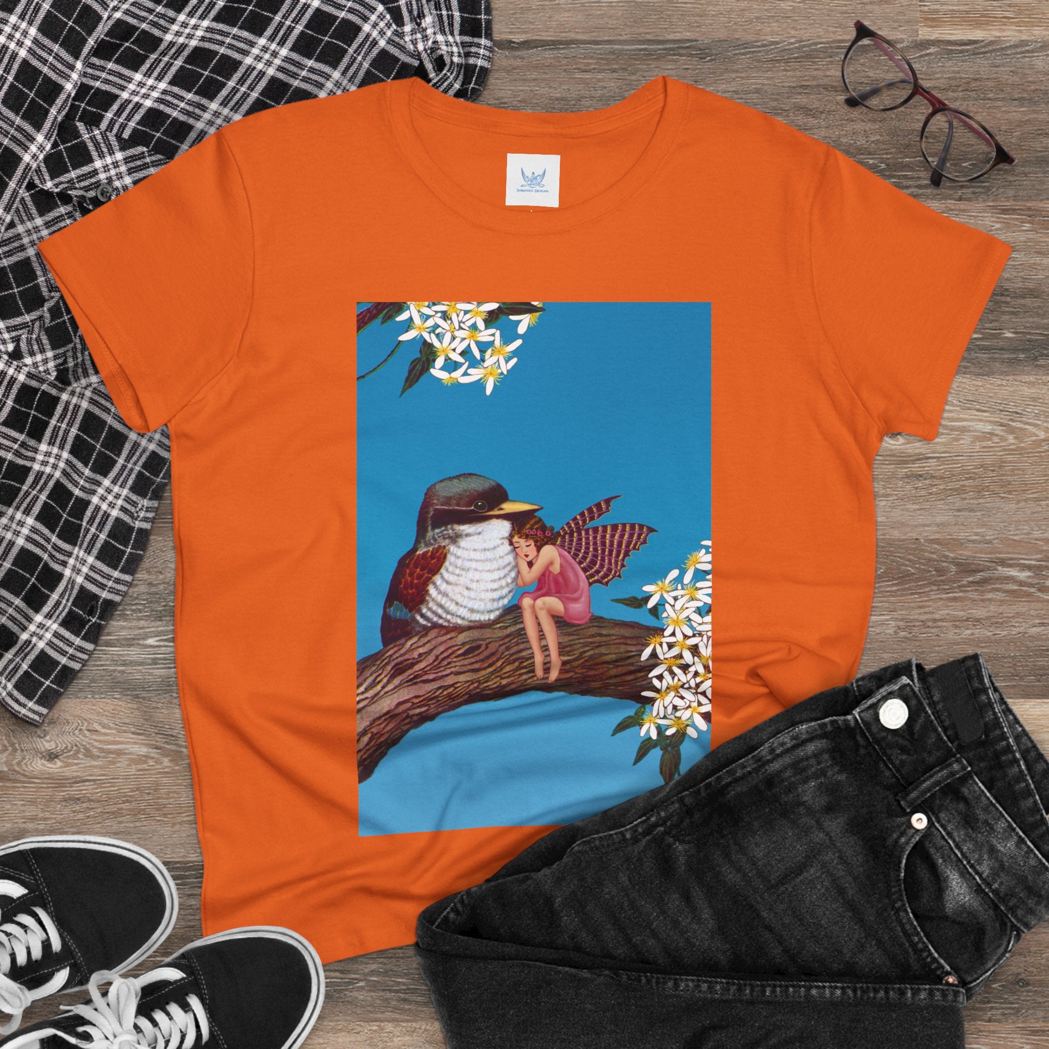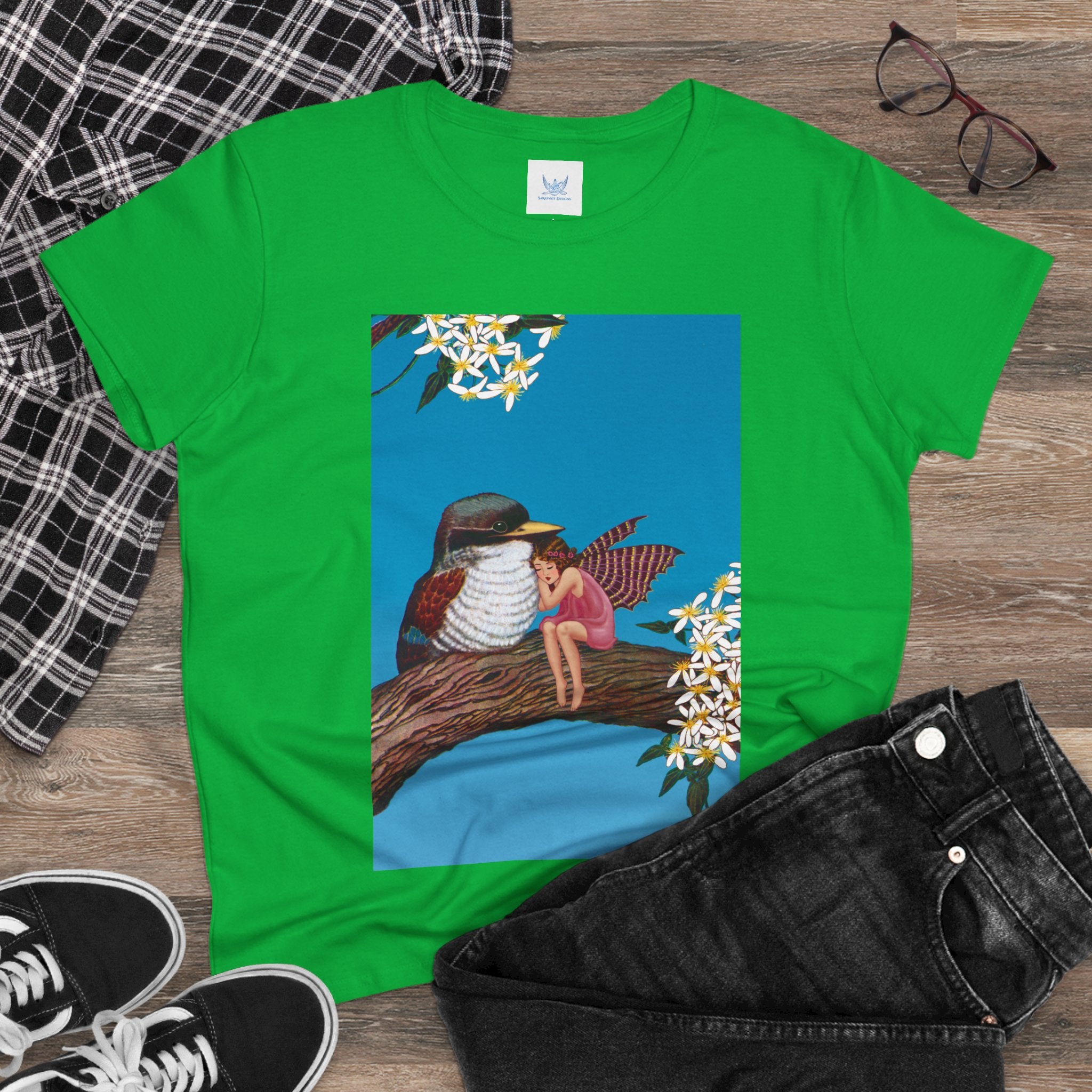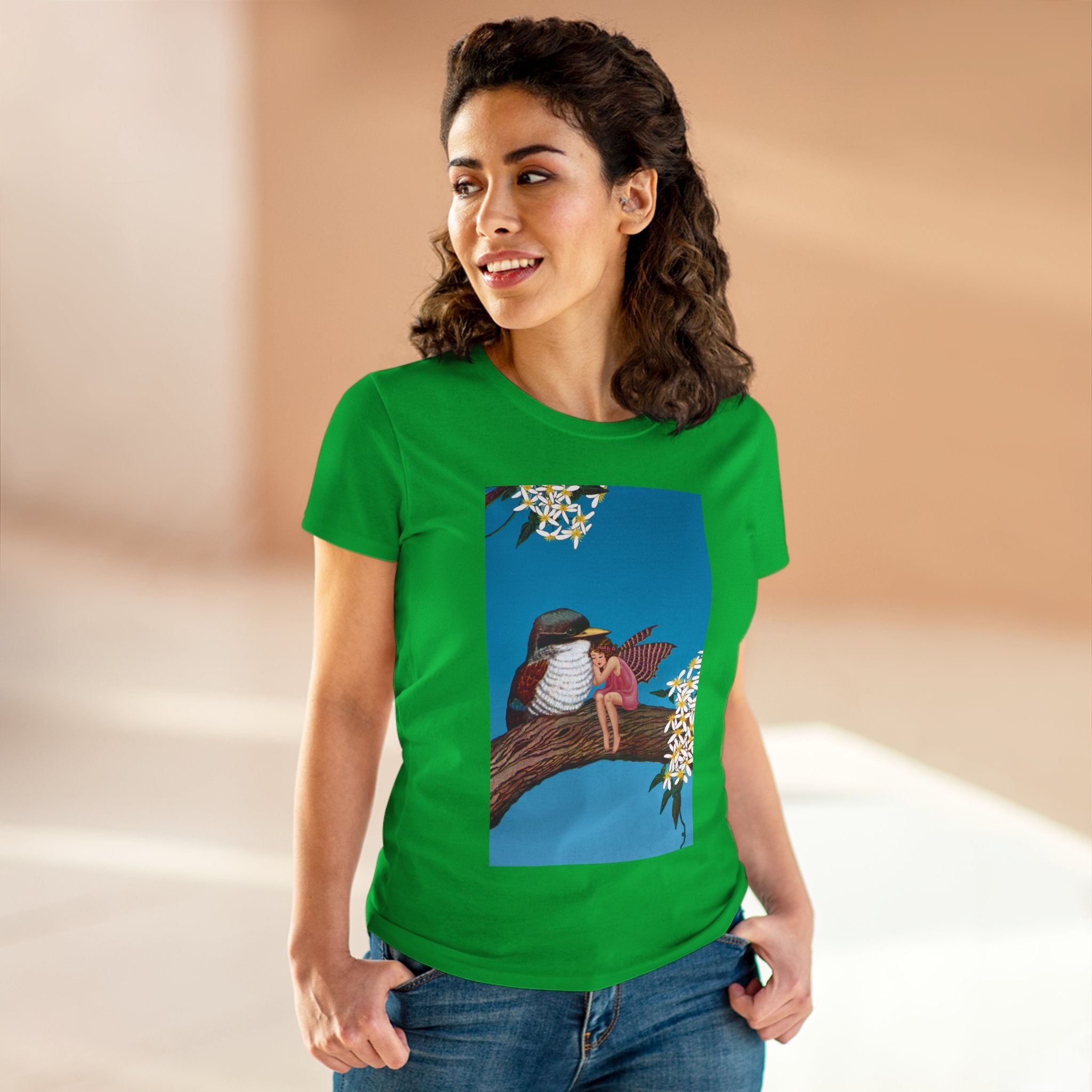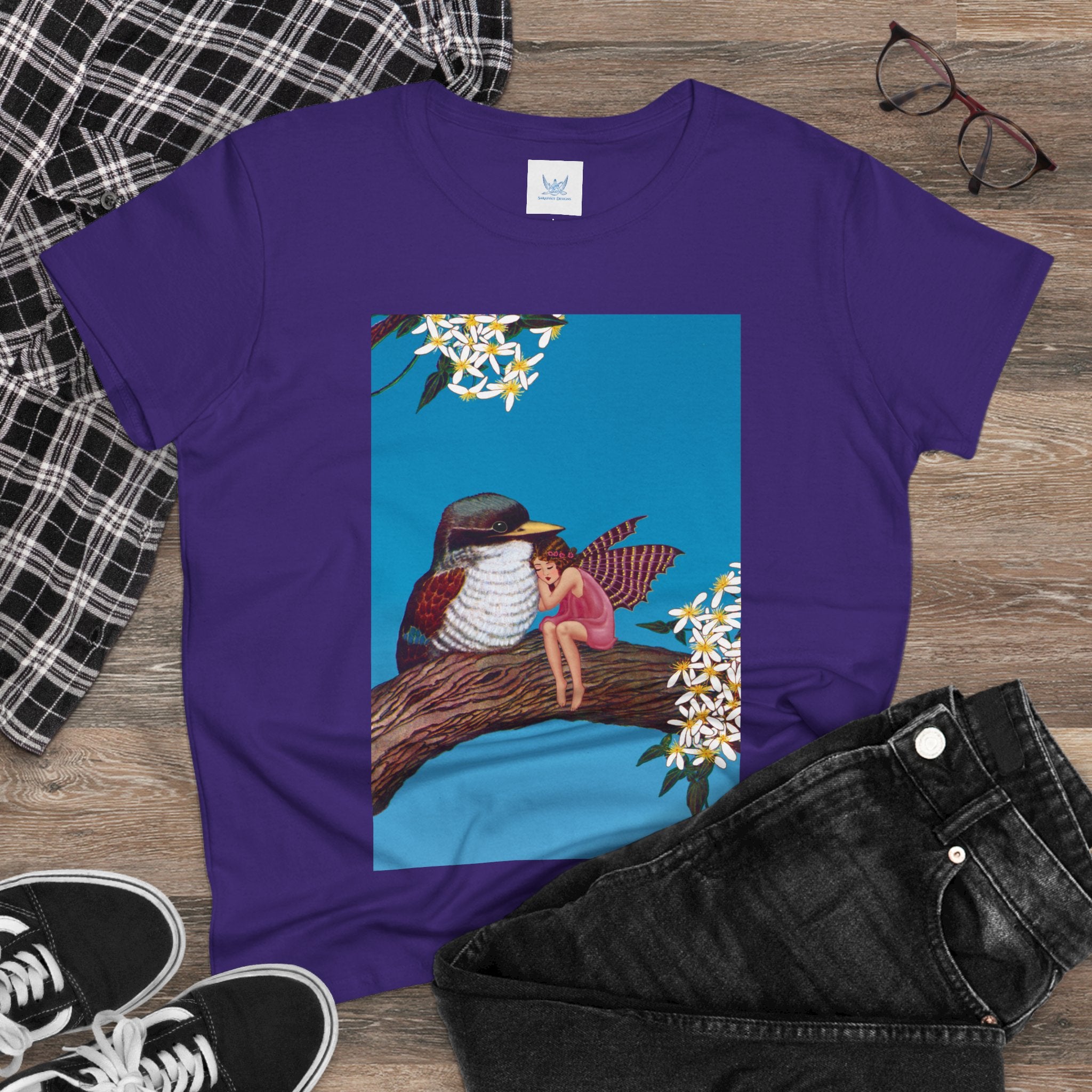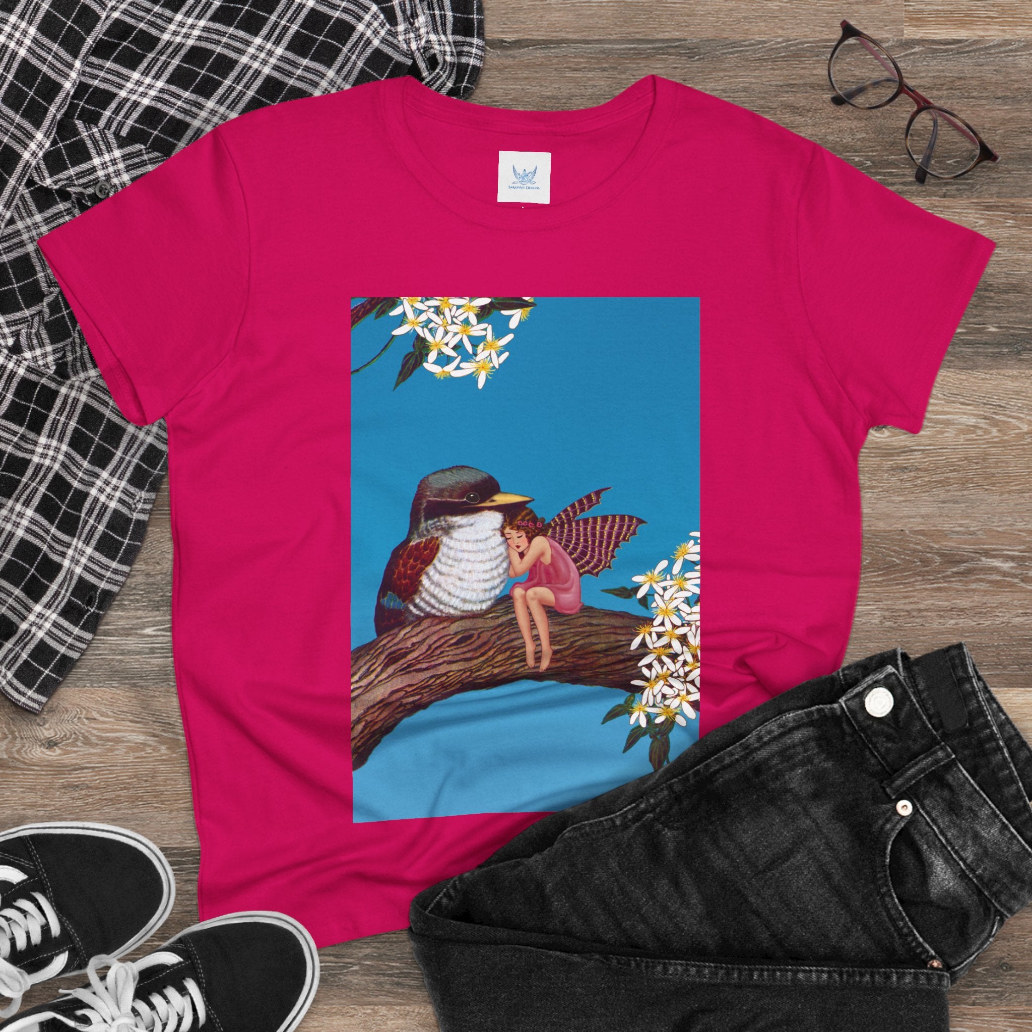 Magnolia Fairy and the Woodland Bird Cotton Tee brings together everyday comfort and enchanting artwork in one charming piece. Made from soft, light 100% cotton, this semi-fitted tee is pre-shrunk to stay true to size and features cap sleeves along with a taped neck and shoulders for lasting durability. As cozy as it is magical, the shirt showcases a serene spring tableau where a rosy-winged fairy sits beside a gentle woodland bird on a magnolia branch. White blossoms frame the scene against a vivid blue sky, creating a peaceful blend of nature and fantasy. This tee offers both quality craftsmanship and a sweet touch of whimsy, making it a perfect wearable piece of art.