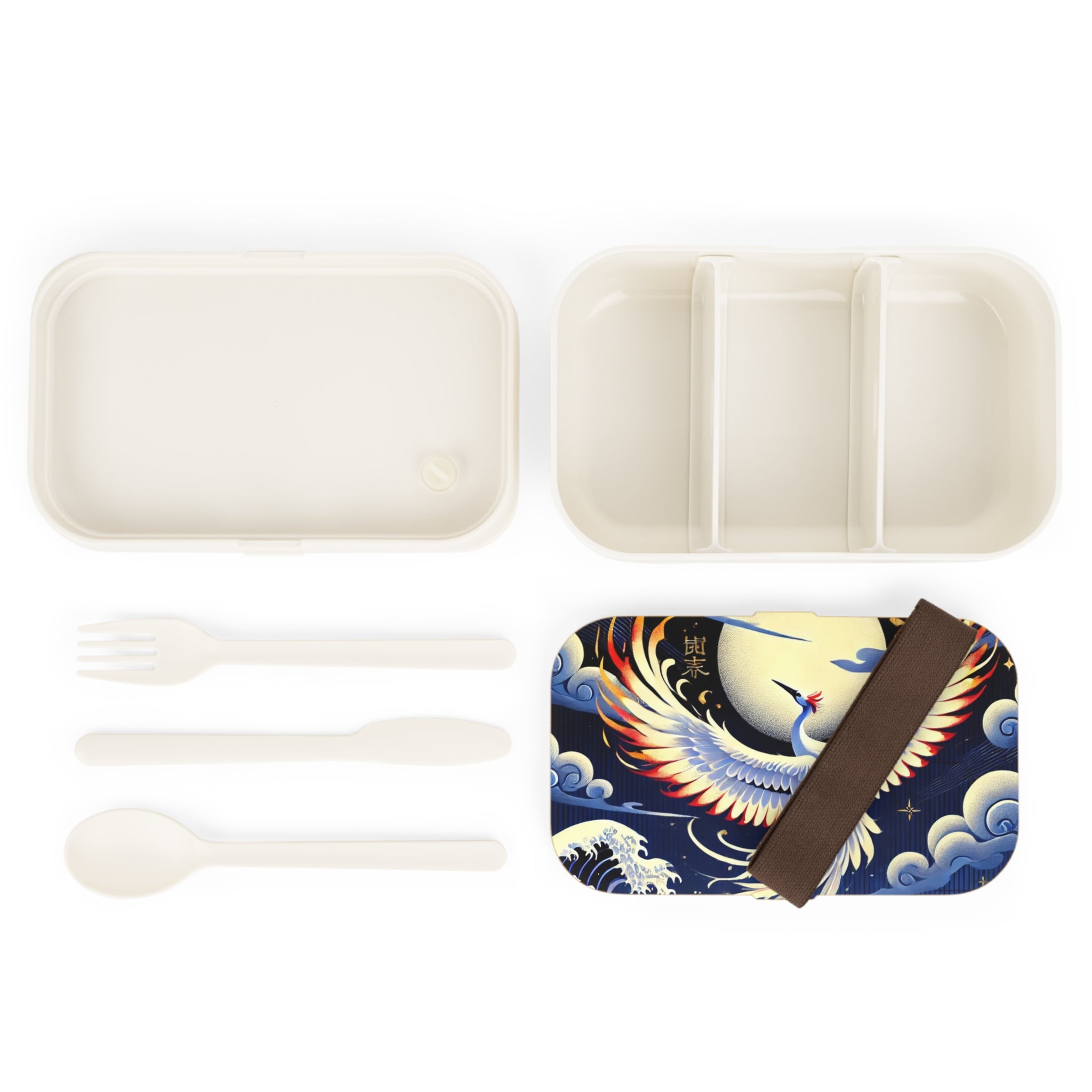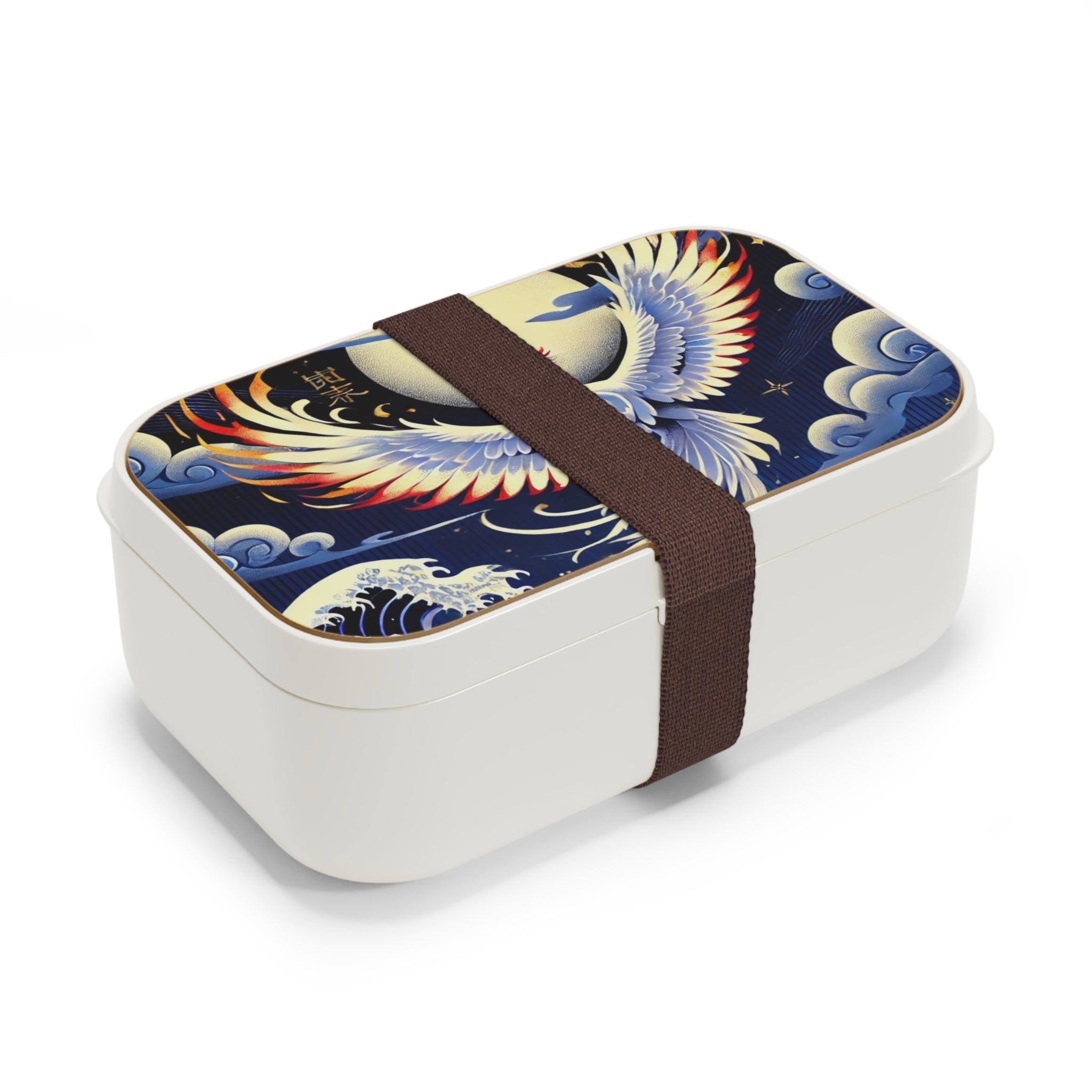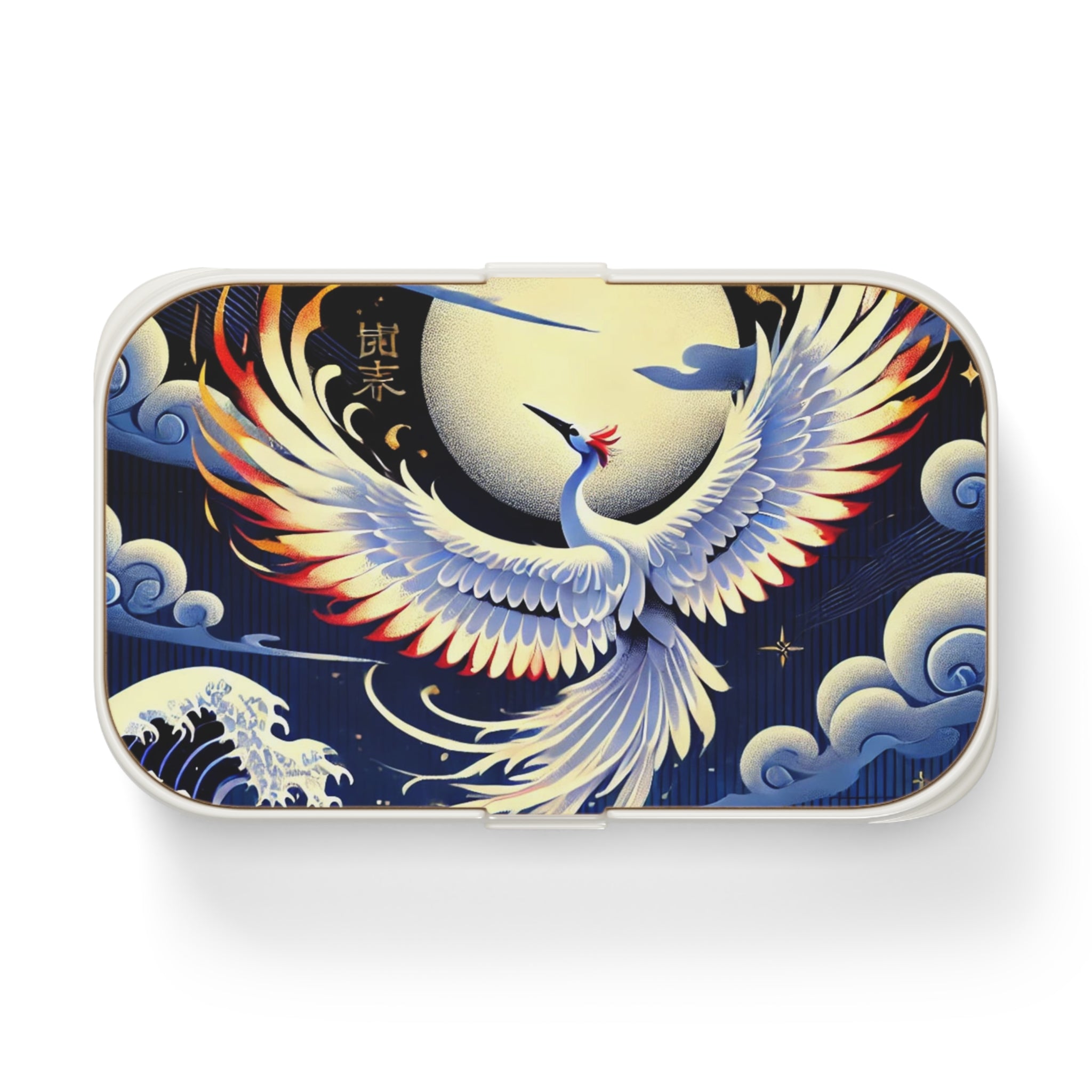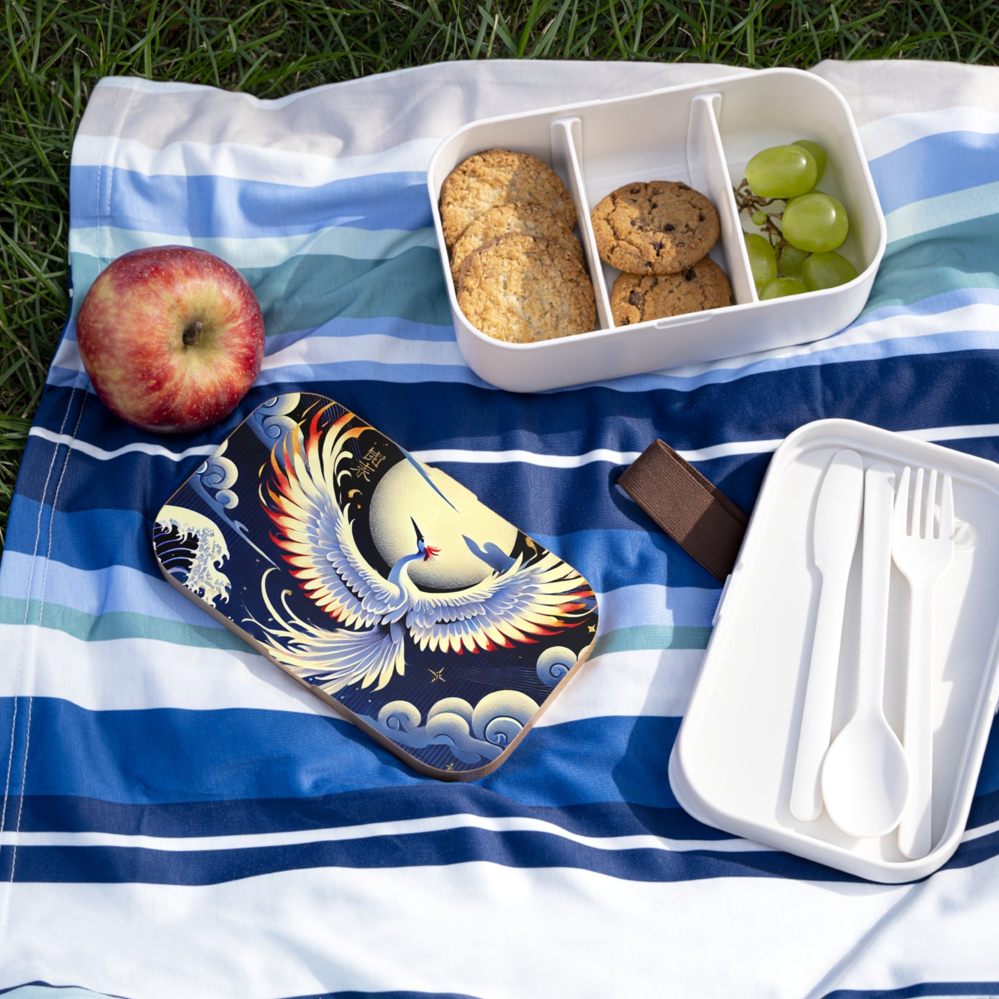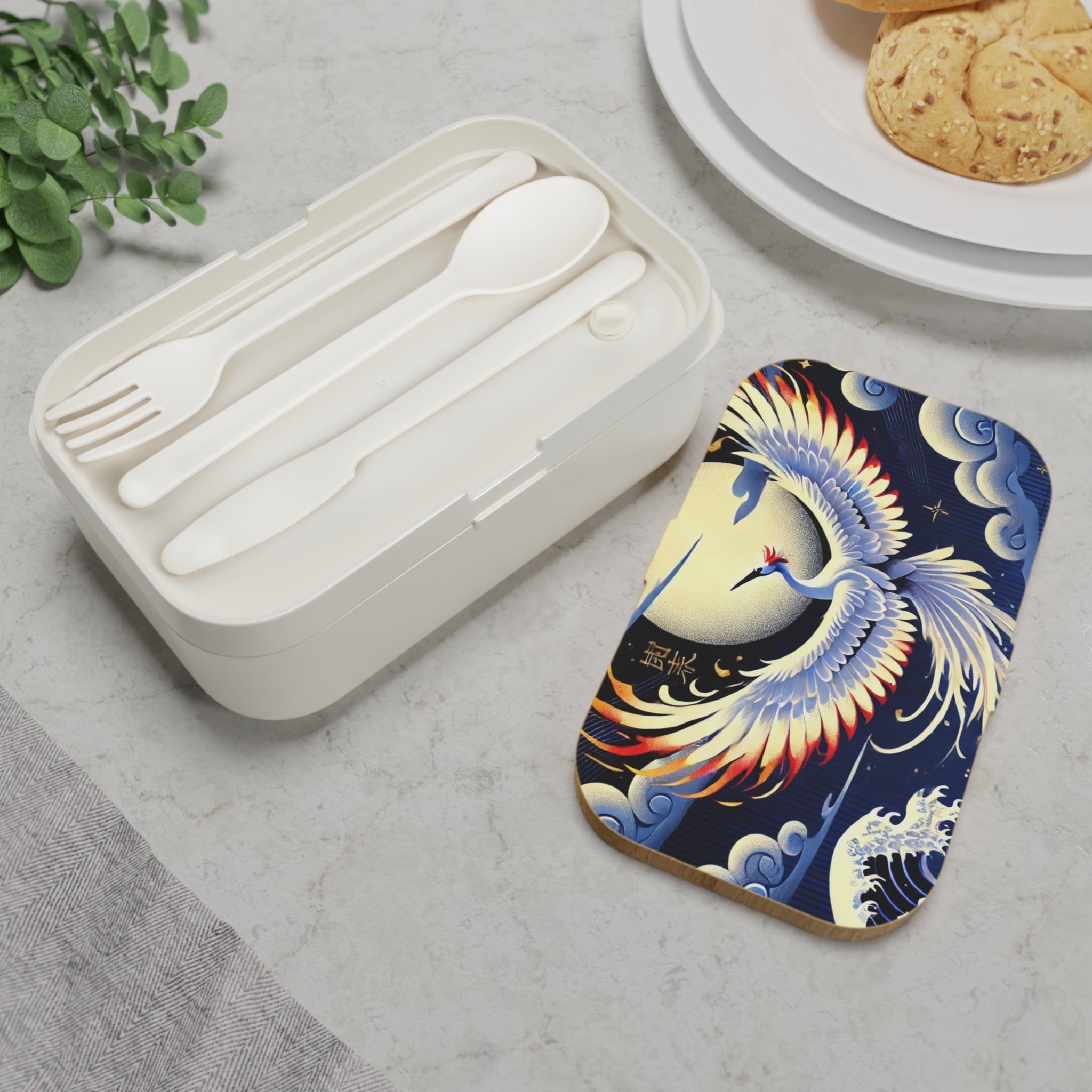 Carry your meals with elegance and artistry in this bento-style lunch box, designed for work, school, or picnics. Its smart compartments keep food neatly separated, while the stylish wooden lid doubles as a handy plate. Sized at 7.6" x 4.8", it slips easily into any bag or backpack, combining convenience with sophistication. Across its surface unfolds a Kabuki-inspired performance, where a majestic white crane takes center stage, rendered in bold flat colors and sharp clarity. The bird radiates strength and grace, framed by a backdrop of layered hues that evoke the richness of a grand theatrical set. More than a lunch box, it is a portable stage of symbolism and beauty—blending function with the timeless drama of Kabuki artistry.