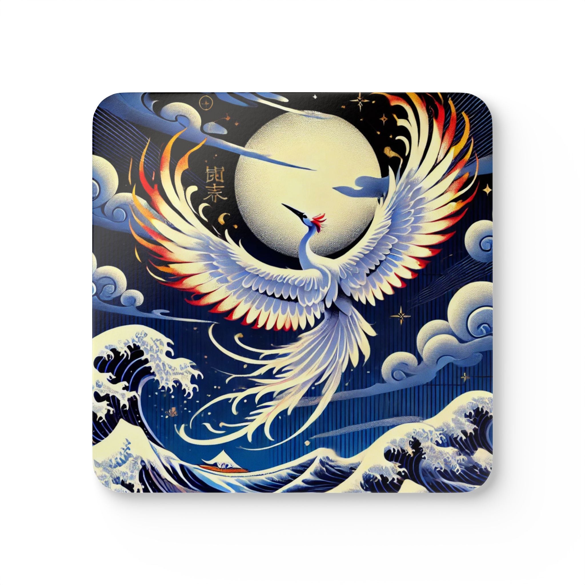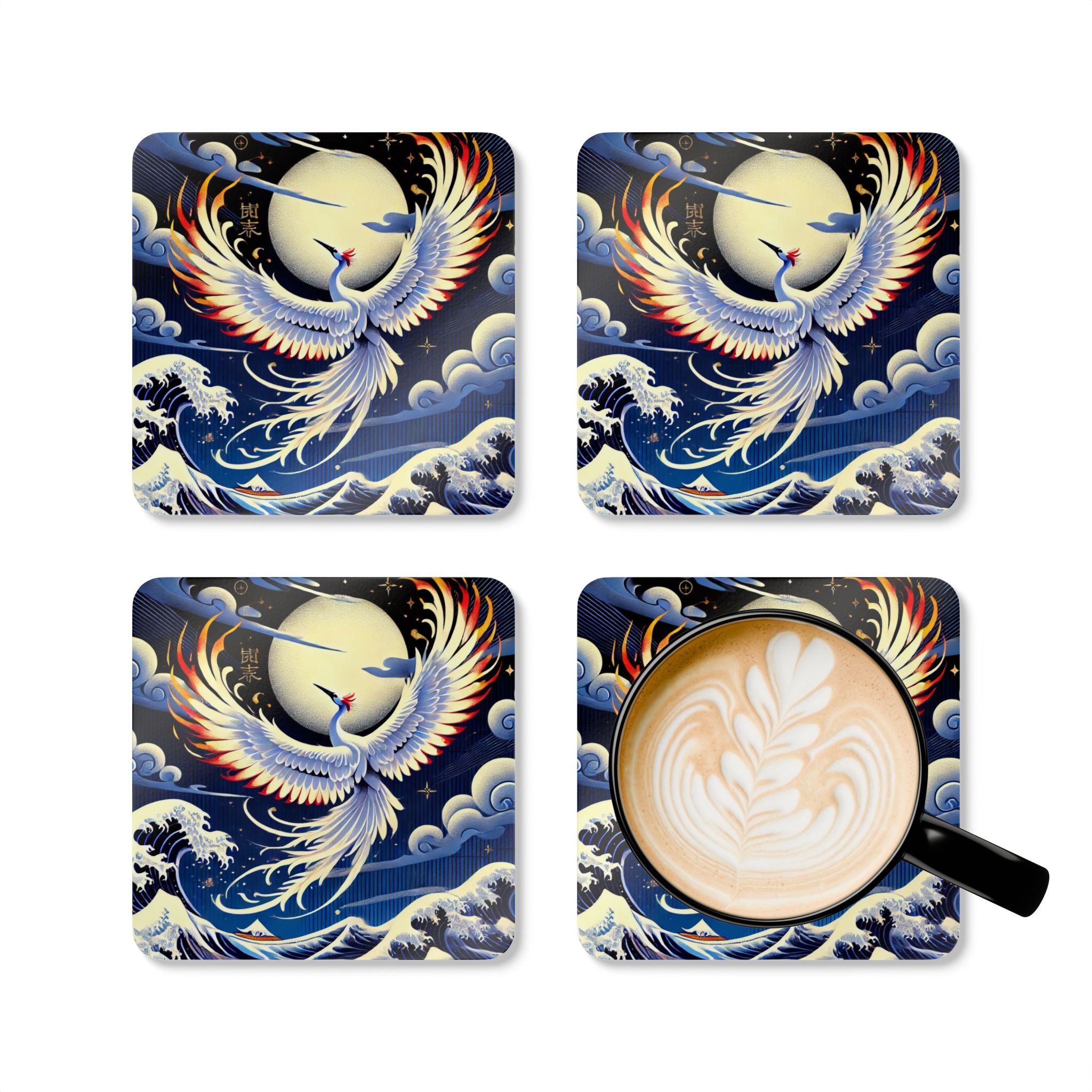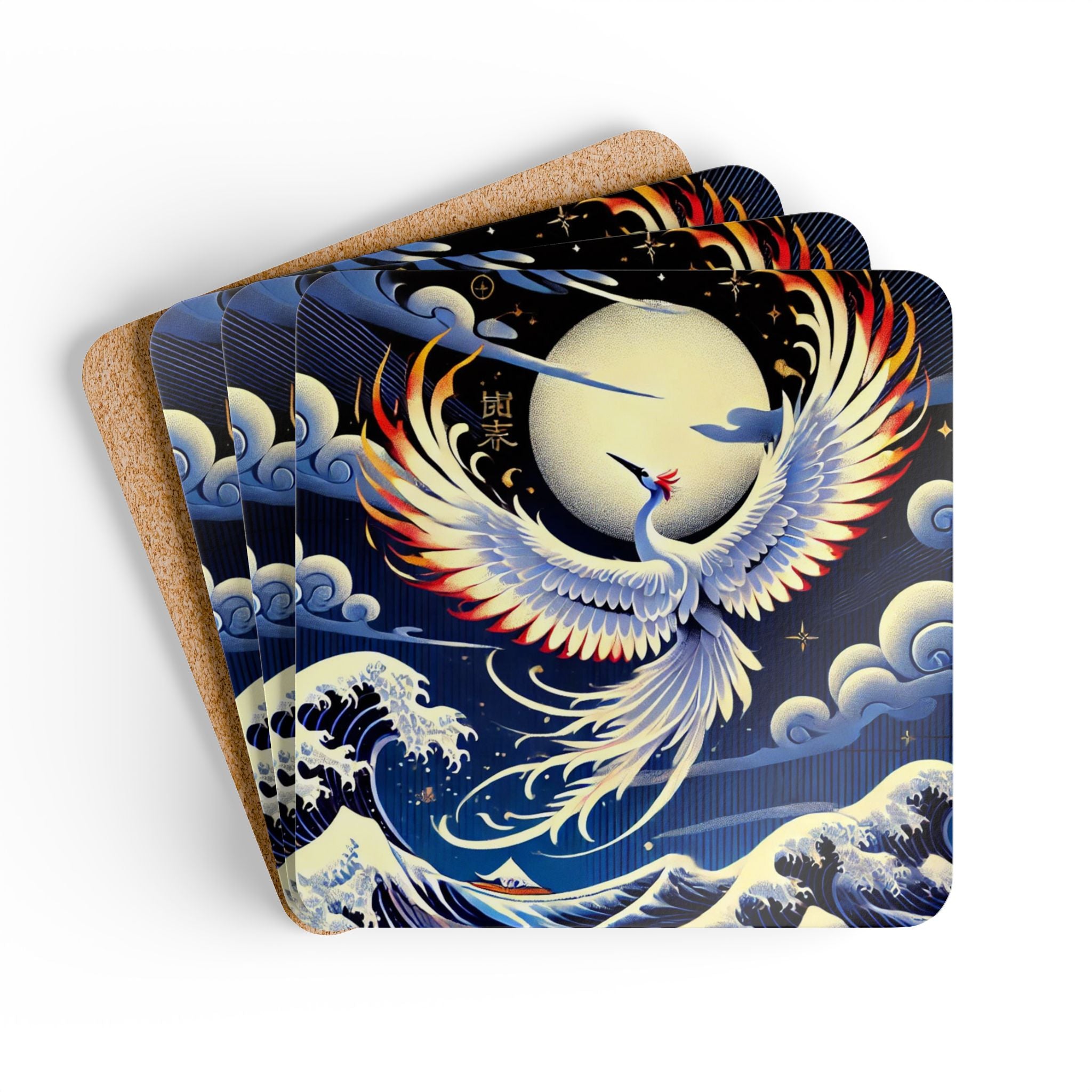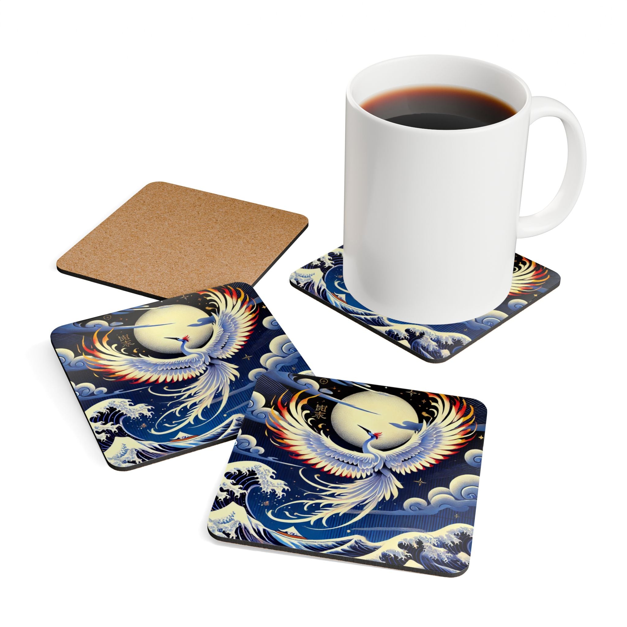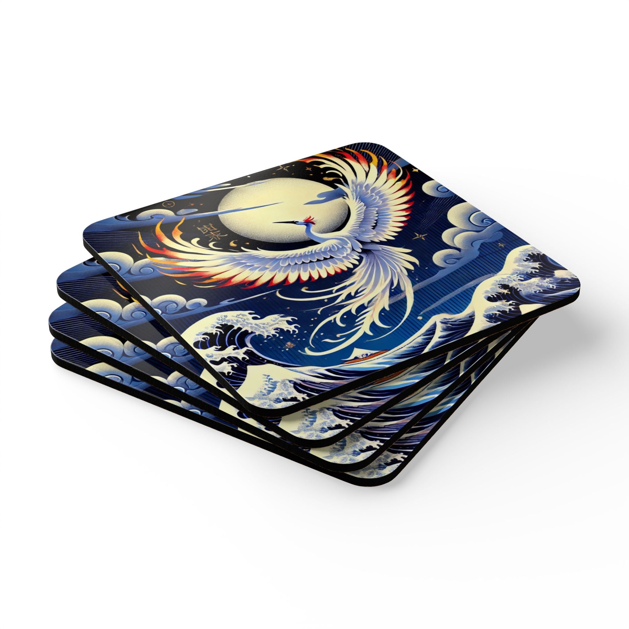 A lyrical and dramatic scene unfolds across this set of four corkwood coasters, each designed to upgrade your home décor while protecting your surfaces with style. The glossy finish becomes the perfect stage for a Kabuki-inspired performance, where every detail is steeped in symbolism and theatrical flair. At the center of the artwork, a majestic white crane spreads its wings in bold flat colors and sharp clarity, radiating elegance and strength as if taking flight from the coaster itself. Beneath its graceful form, the layered depth of the backdrop flows with rich hues and balanced design, evoking the atmosphere of a grand stage alive with meaning. Paired with a cork backing to prevent sliding, these coasters are both practical and poetic—blending durability with timeless beauty. Together, the set captures the essence of Kabuki artistry, where performance and symbolism meet in everyday use.