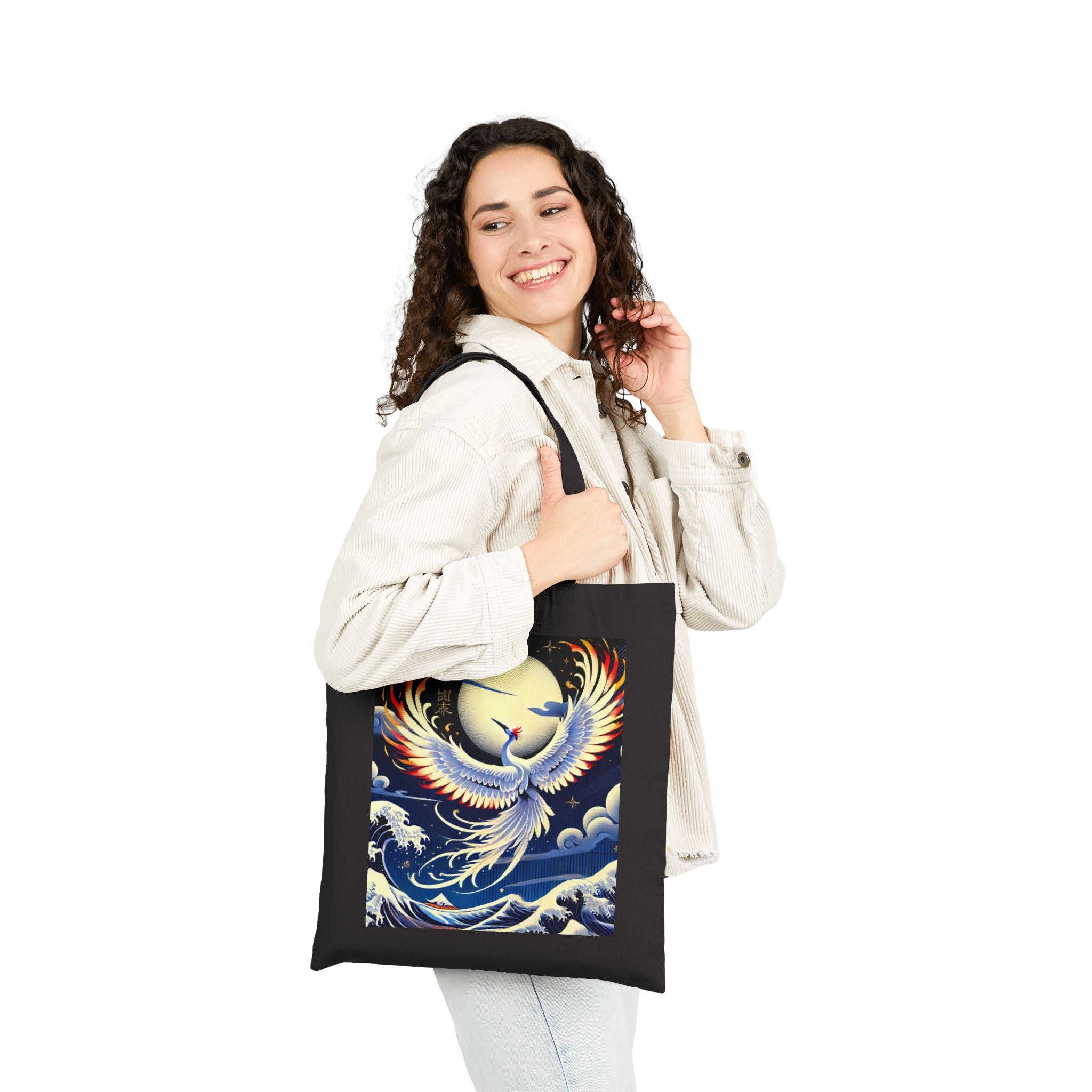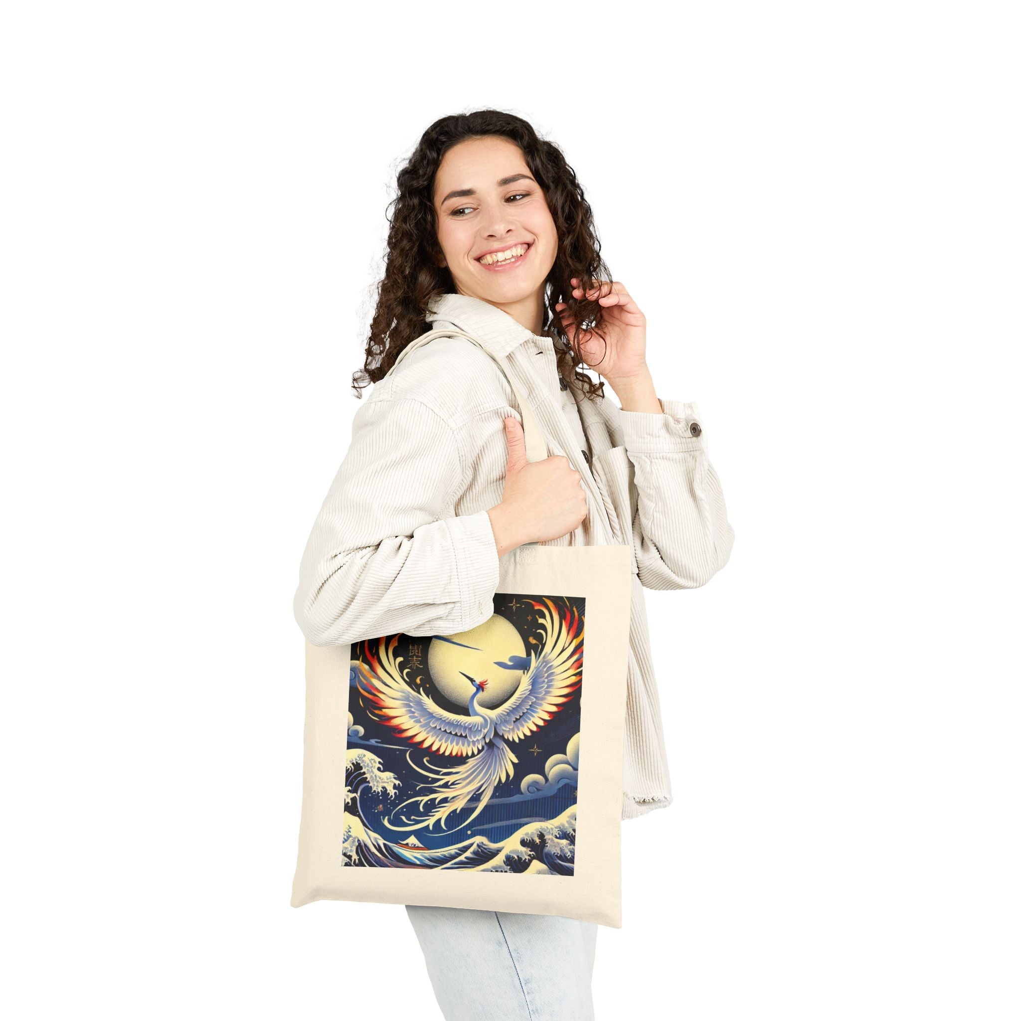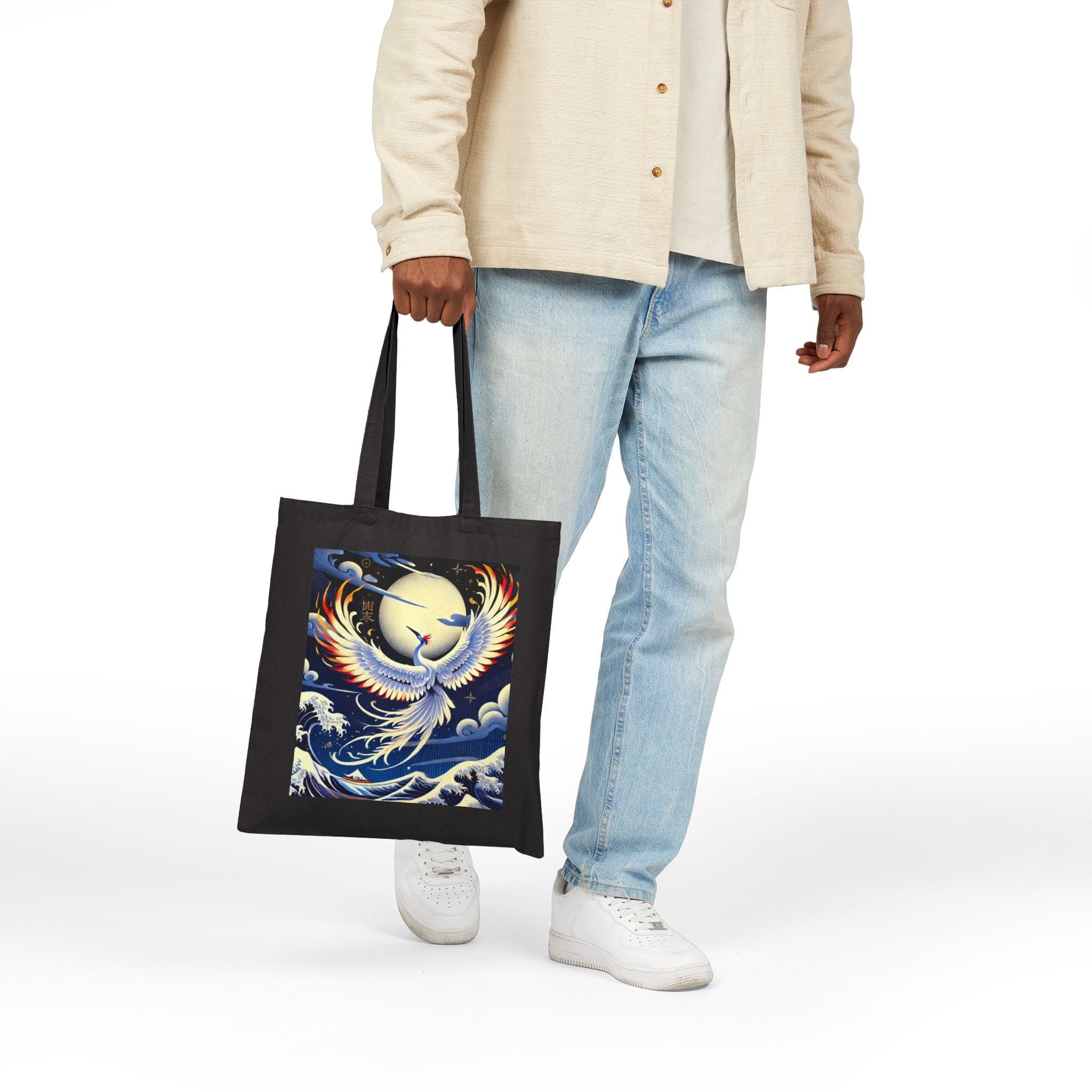 A lyrical and dramatic scene unfolds on this 100% cotton canvas tote, where practical design meets the spirit of Kabuki performance. Sized at 15" x 16", the bag carries daily essentials with ease, while the sturdy canvas ensures long-lasting durability. Its 20" handles make it comfortable to carry—whether filled with groceries, books, or a week’s worth of errands. Available in natural and black colors, the tote becomes a moving stage for the artwork: a majestic white crane, rendered in bold flat colors and sharp clarity, radiates elegance and strength at center stage. Behind the bird, layered hues create the feel of a grand theatrical backdrop alive with depth and balance. Both useful and symbolic, this tote blends everyday function with Kabuki artistry, making it not just a bag, but a portable piece of performance and timeless beauty.