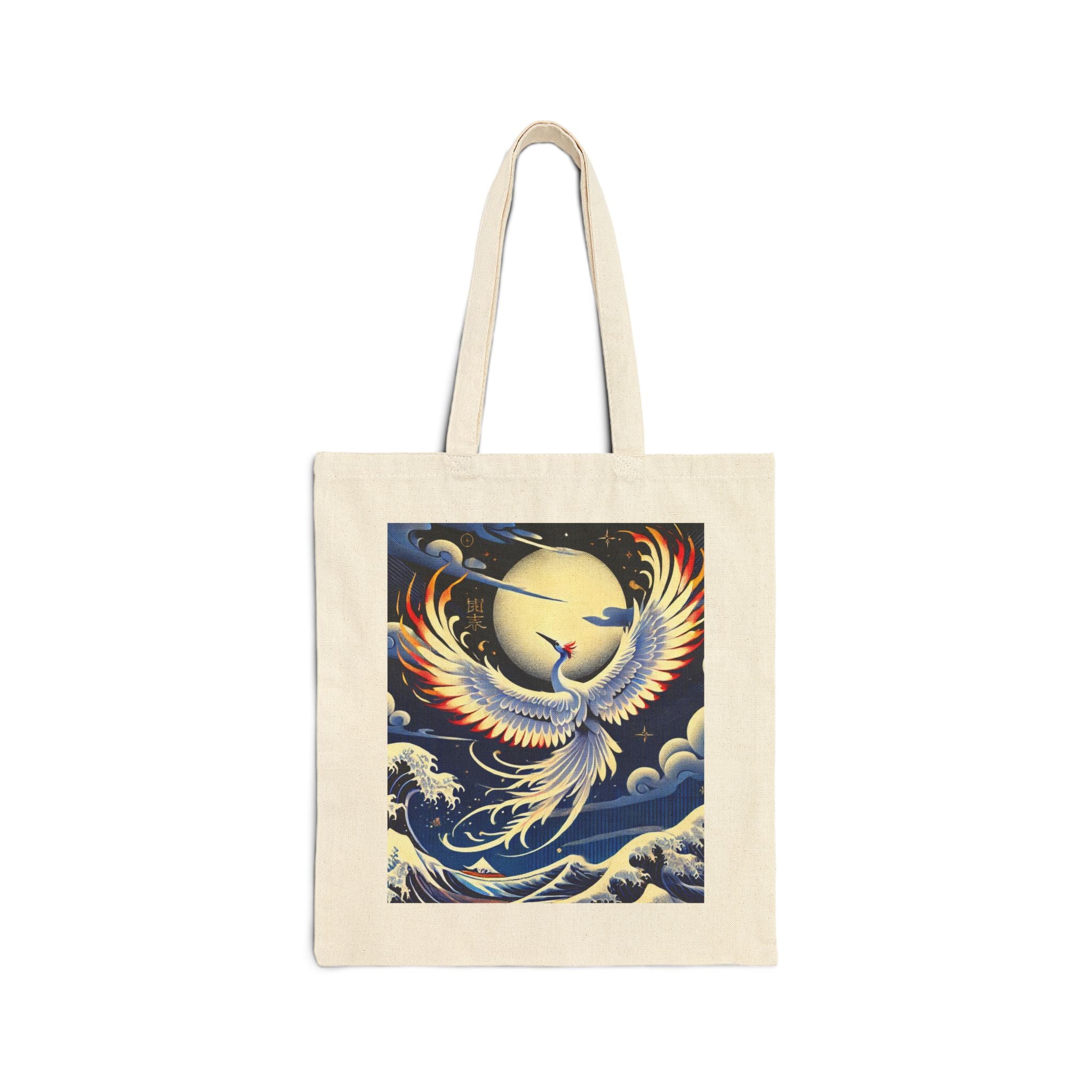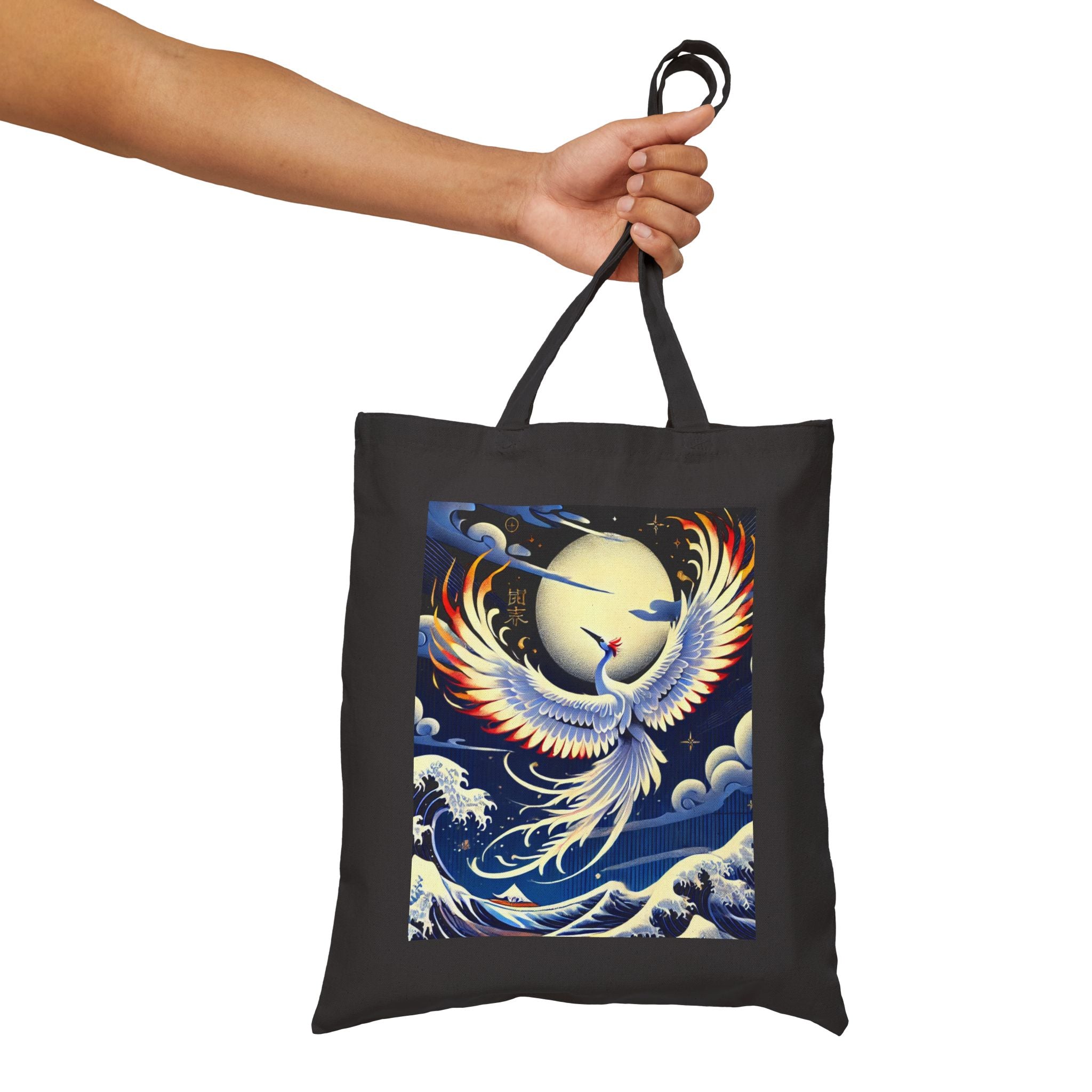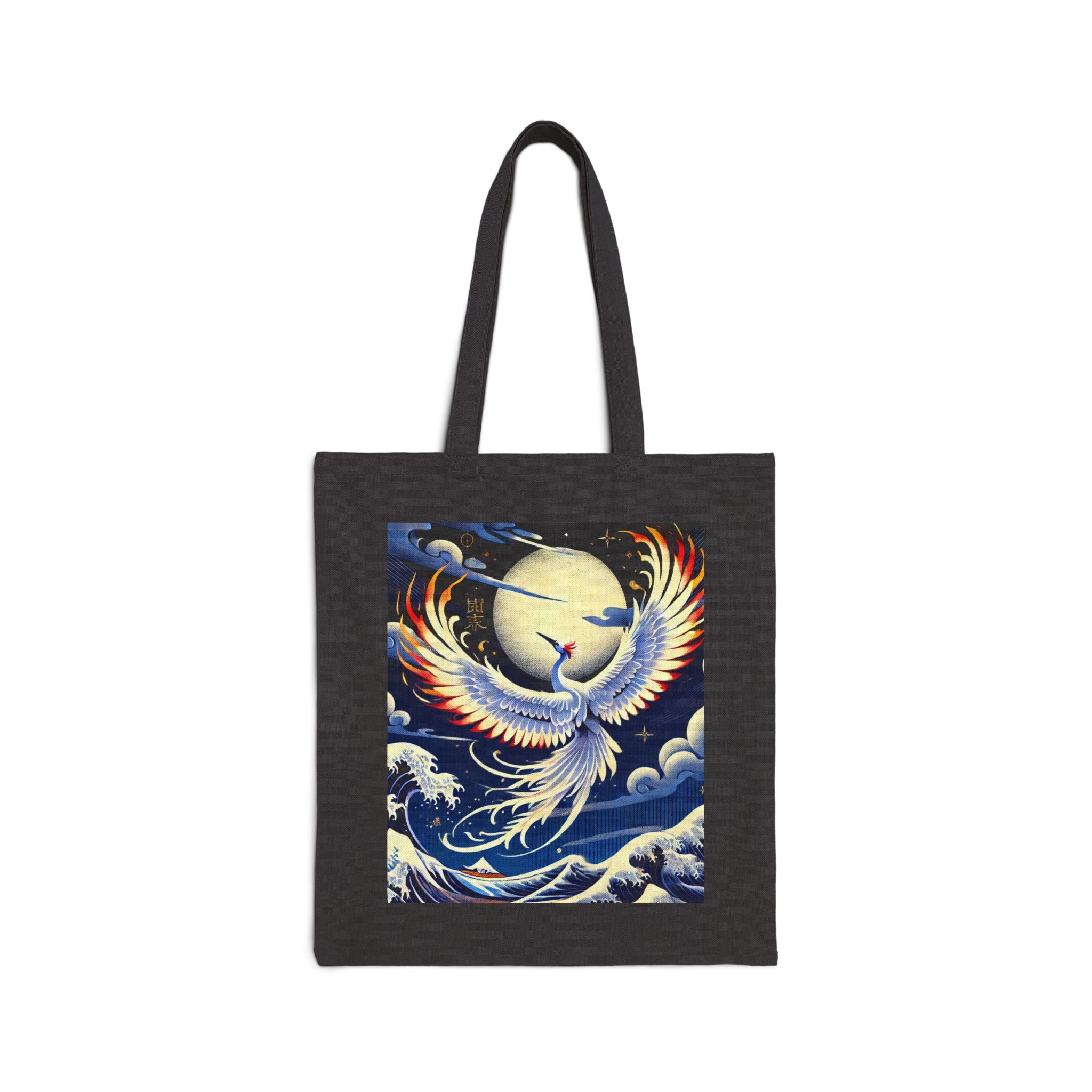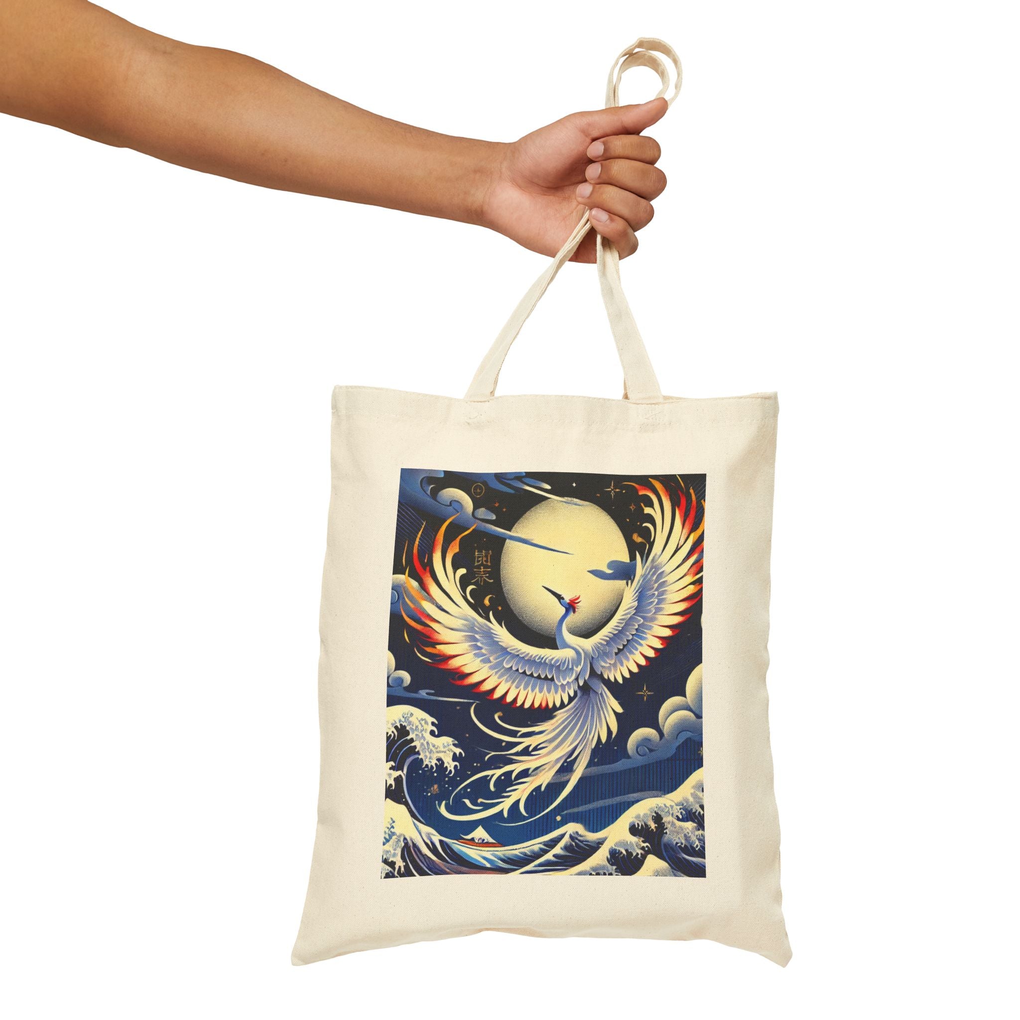 A lyrical and dramatic scene unfolds on this 100% cotton canvas tote, where practical design meets the spirit of Kabuki performance. Sized at 15" x 16", the bag carries daily essentials with ease, while the sturdy canvas ensures long-lasting durability. Its 20" handles make it comfortable to carry—whether filled with groceries, books, or a week’s worth of errands. Available in natural and black colors, the tote becomes a moving stage for the artwork: a majestic white crane, rendered in bold flat colors and sharp clarity, radiates elegance and strength at center stage. Behind the bird, layered hues create the feel of a grand theatrical backdrop alive with depth and balance. Both useful and symbolic, this tote blends everyday function with Kabuki artistry, making it not just a bag, but a portable piece of performance and timeless beauty.