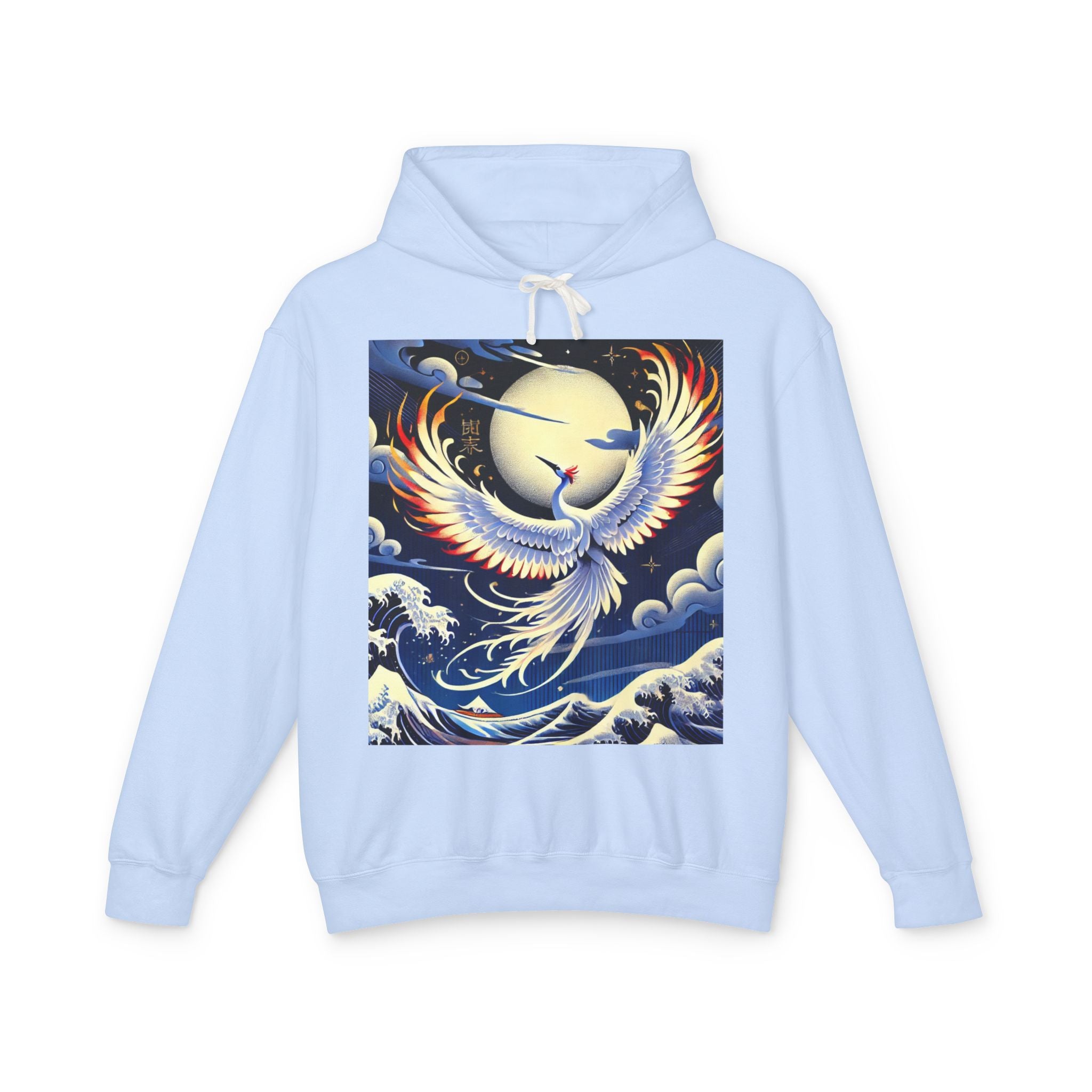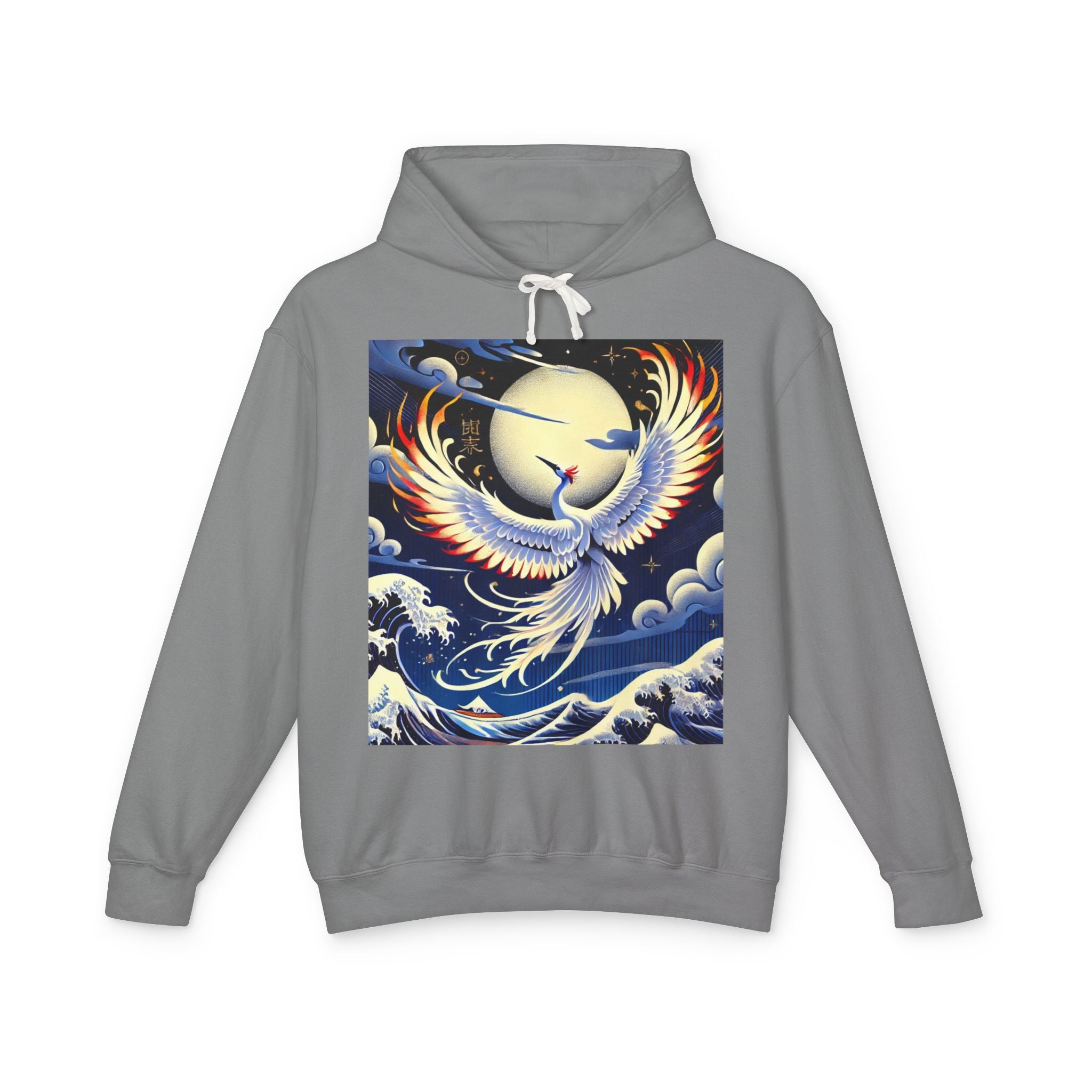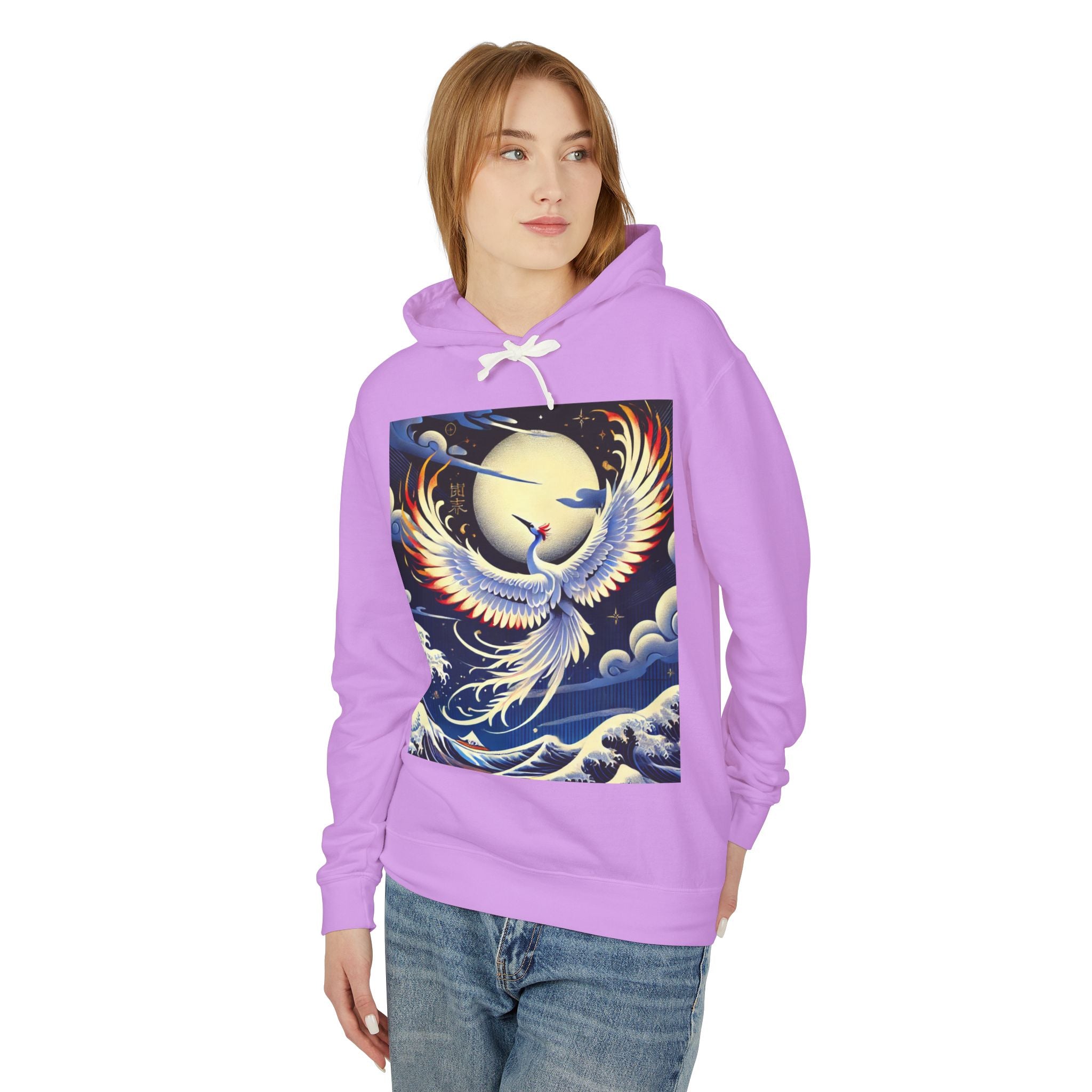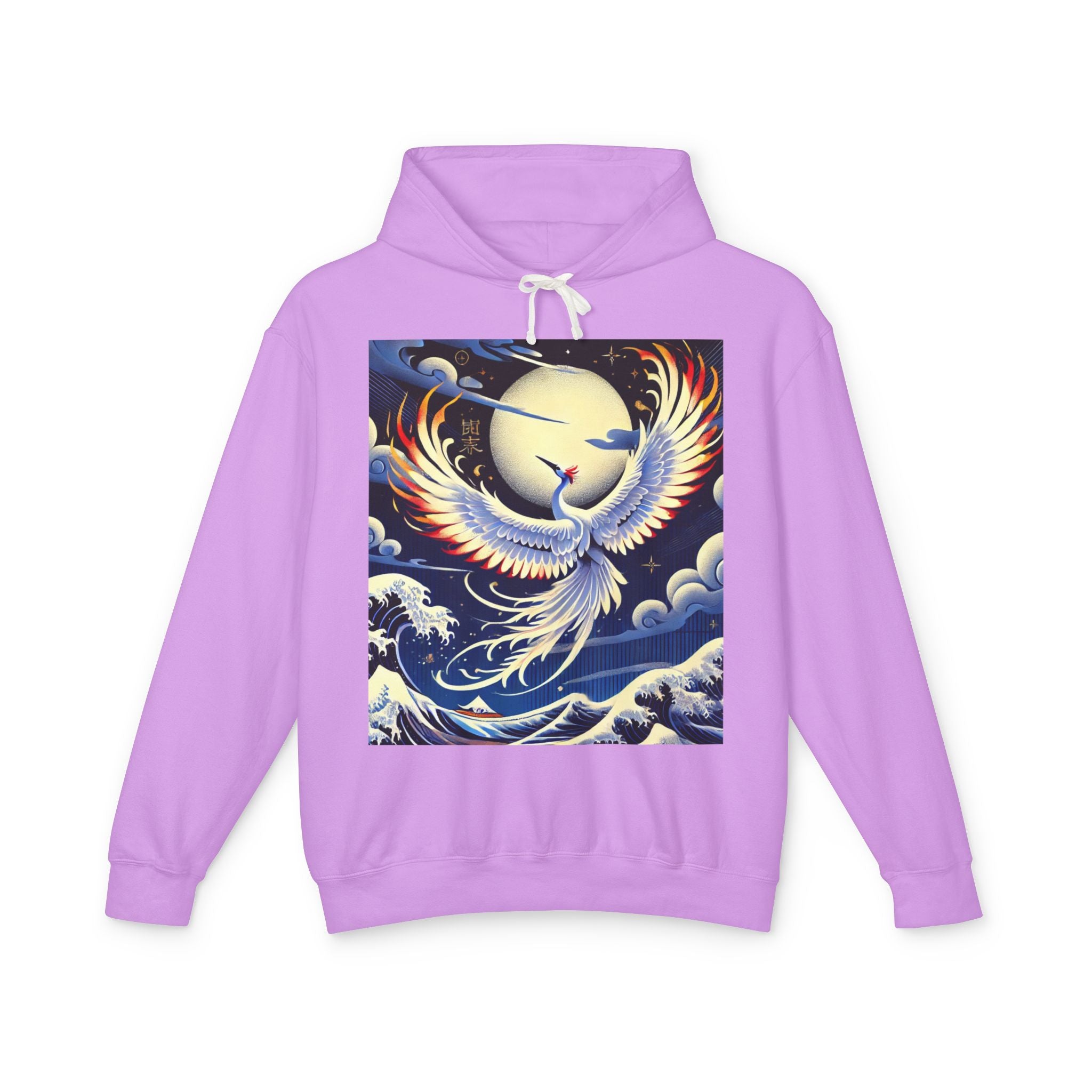 This lyrical Kabuki-inspired performance scene features a majestic white crane taking center stage. Rendered in bold flat colors and crisp clarity, the crane radiates elegance, balance, and quiet strength. Behind it, layered hues and theatrical depth evoke the grandeur of a stage alive with symbolism and movement. The artwork blends traditional Japanese aesthetics with modern expressive style, turning the hoodie into a graceful, wearable statement piece.