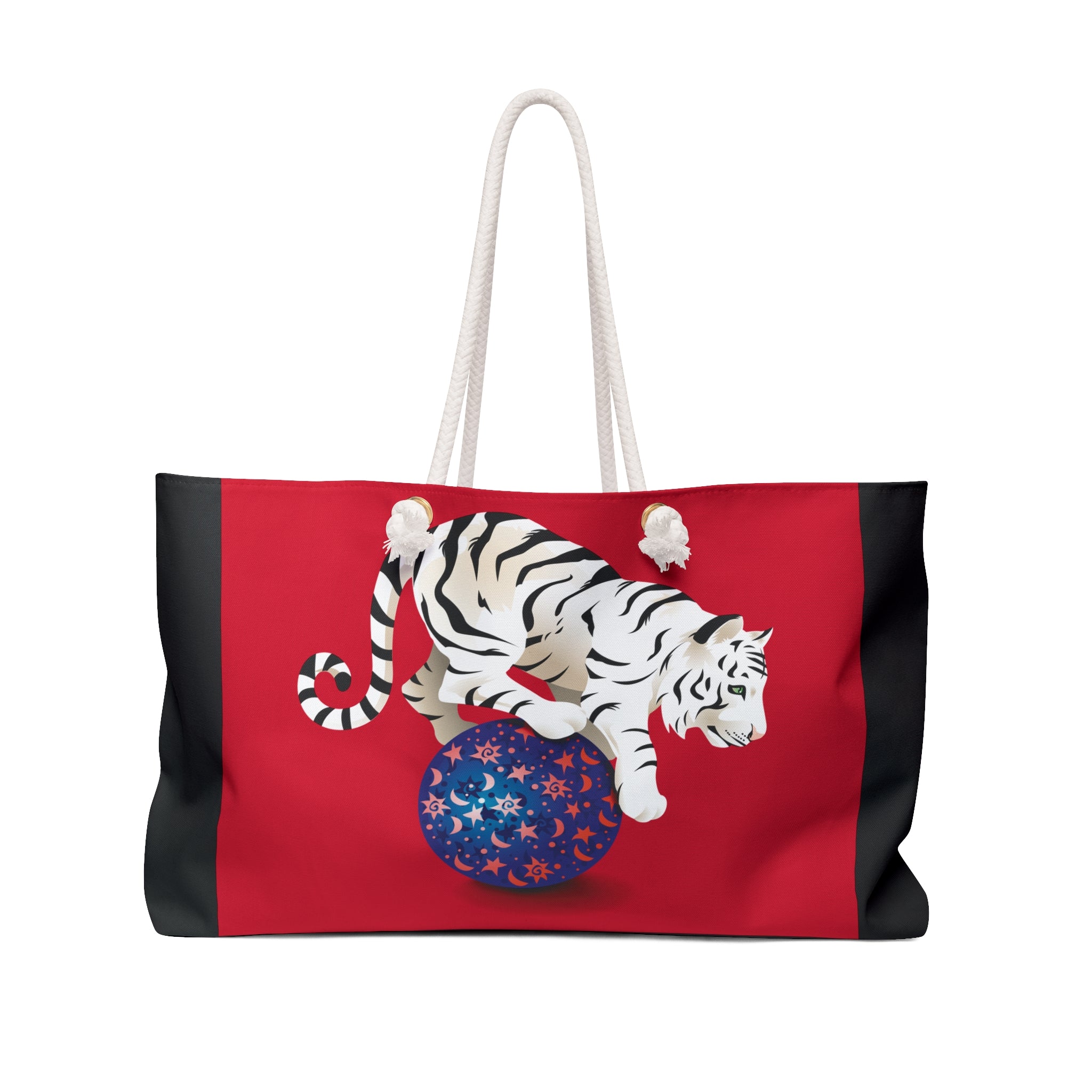 Artwork created, designed and digitally remastered by Sarasvati Designs. A bold, contemporary, and vibrant artwork depicts a white tiger on a blue ball against a red background.