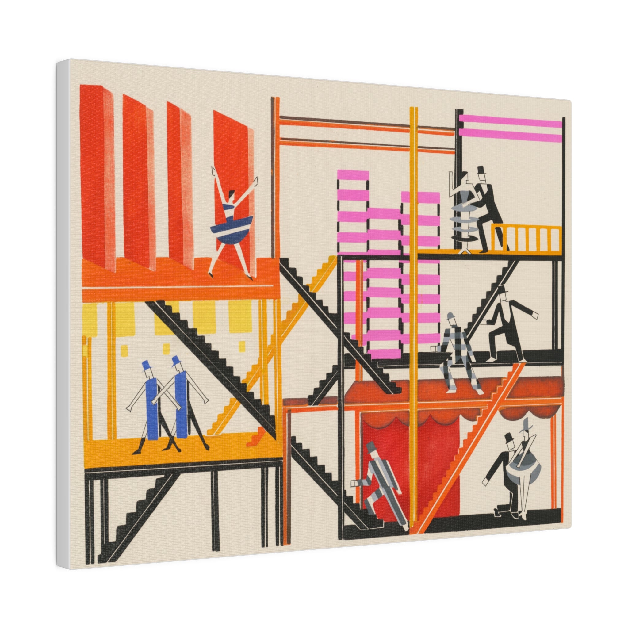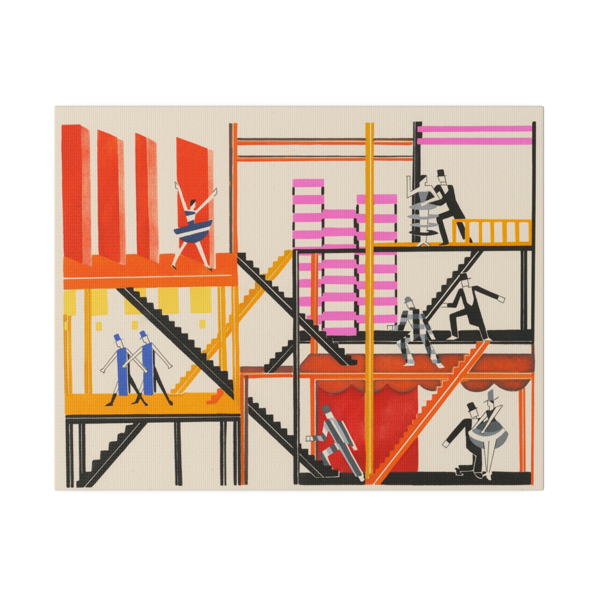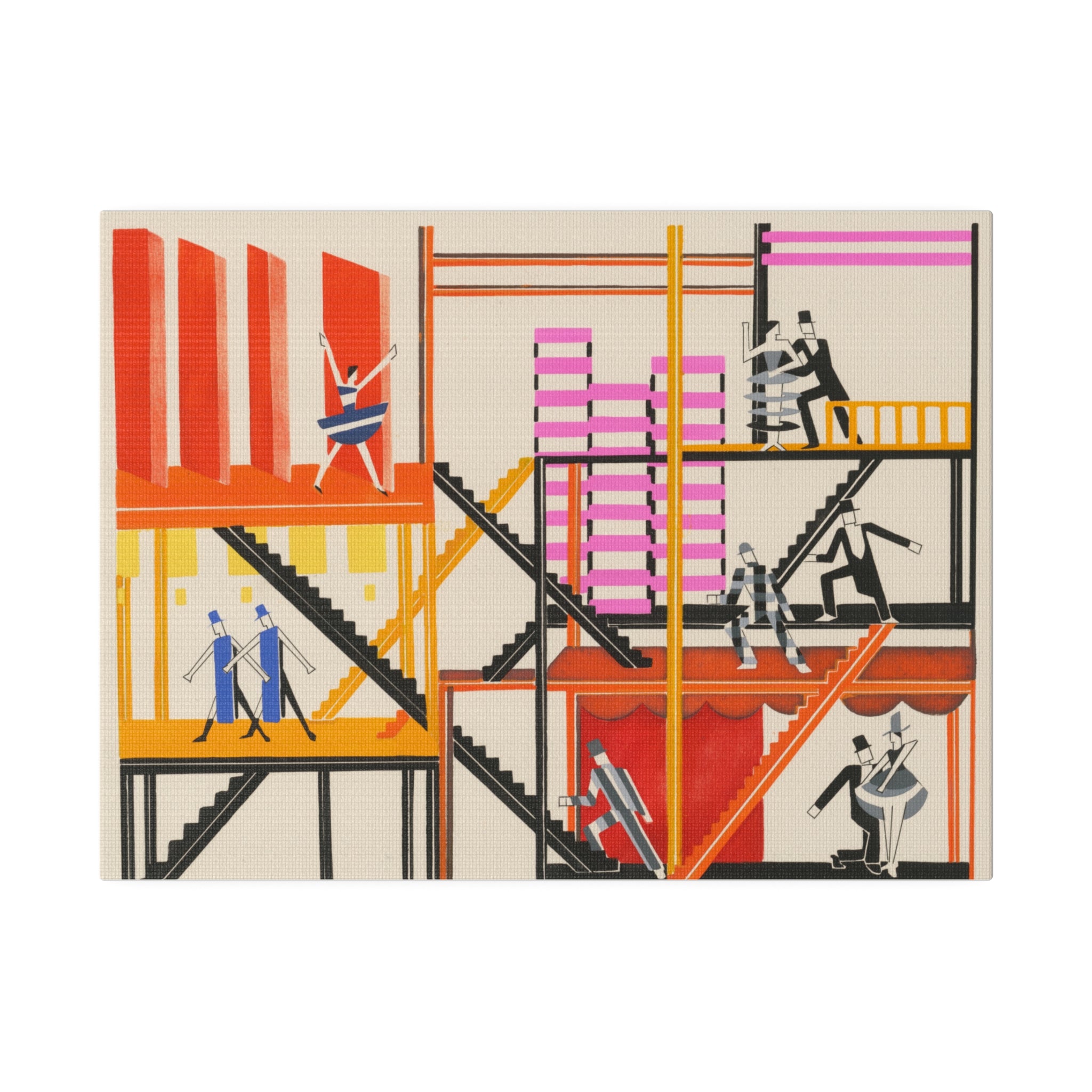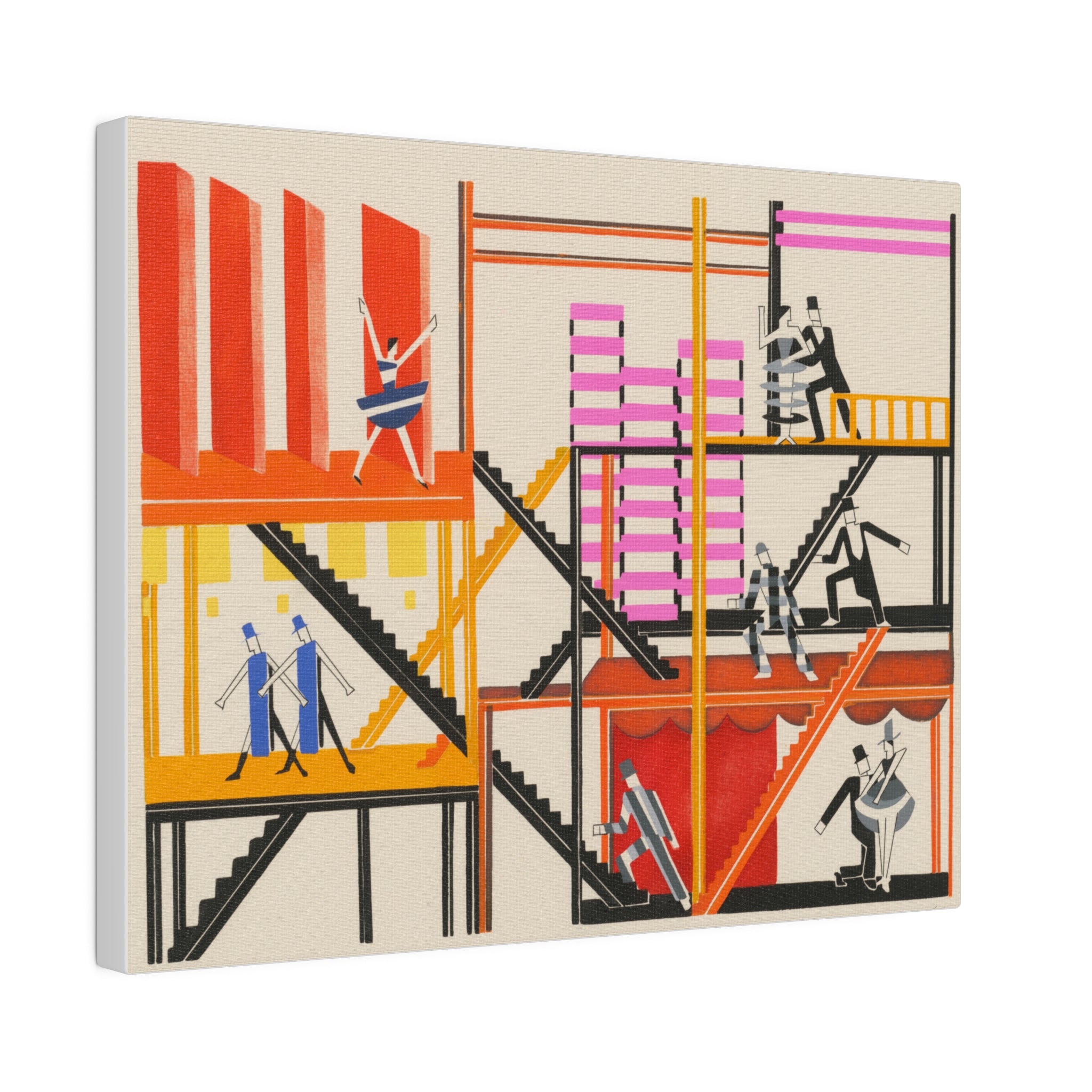 Artwork designed and digitally remastered by Sarasvati Designs. "Maquettes de Théâtre 4" by Alexandra Exter, a Ukrainian-French artist, features a series of theatrical maquettes, miniature models used for set design, crafted with meticulous attention to detail. The composition bursts with vibrant colors, bold shapes, and dynamic forms, creating a sense of energy and movement. Exter's unique artistic language blends elements of Cubism and Futurism, resulting in a visually striking and modern interpretation of theater design.