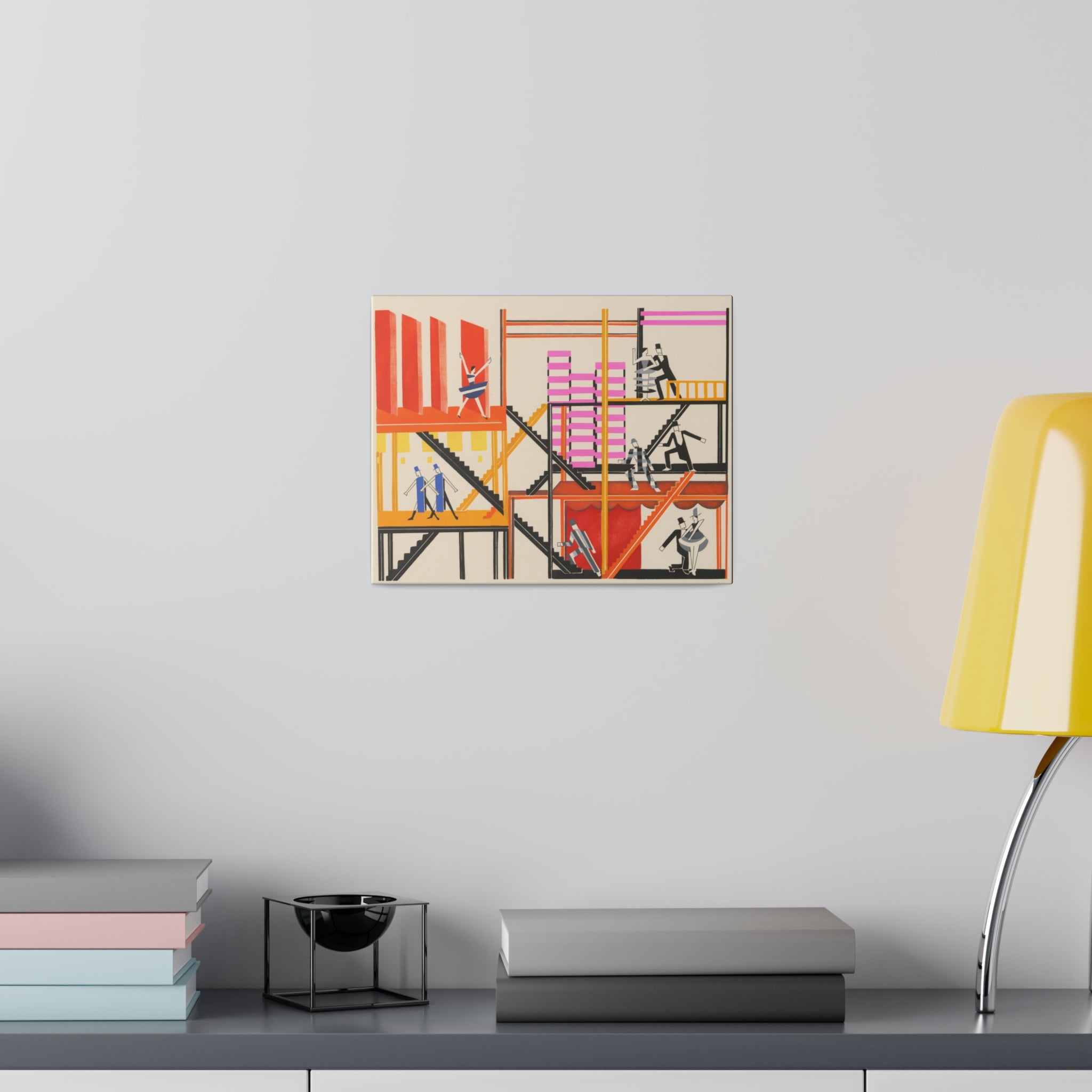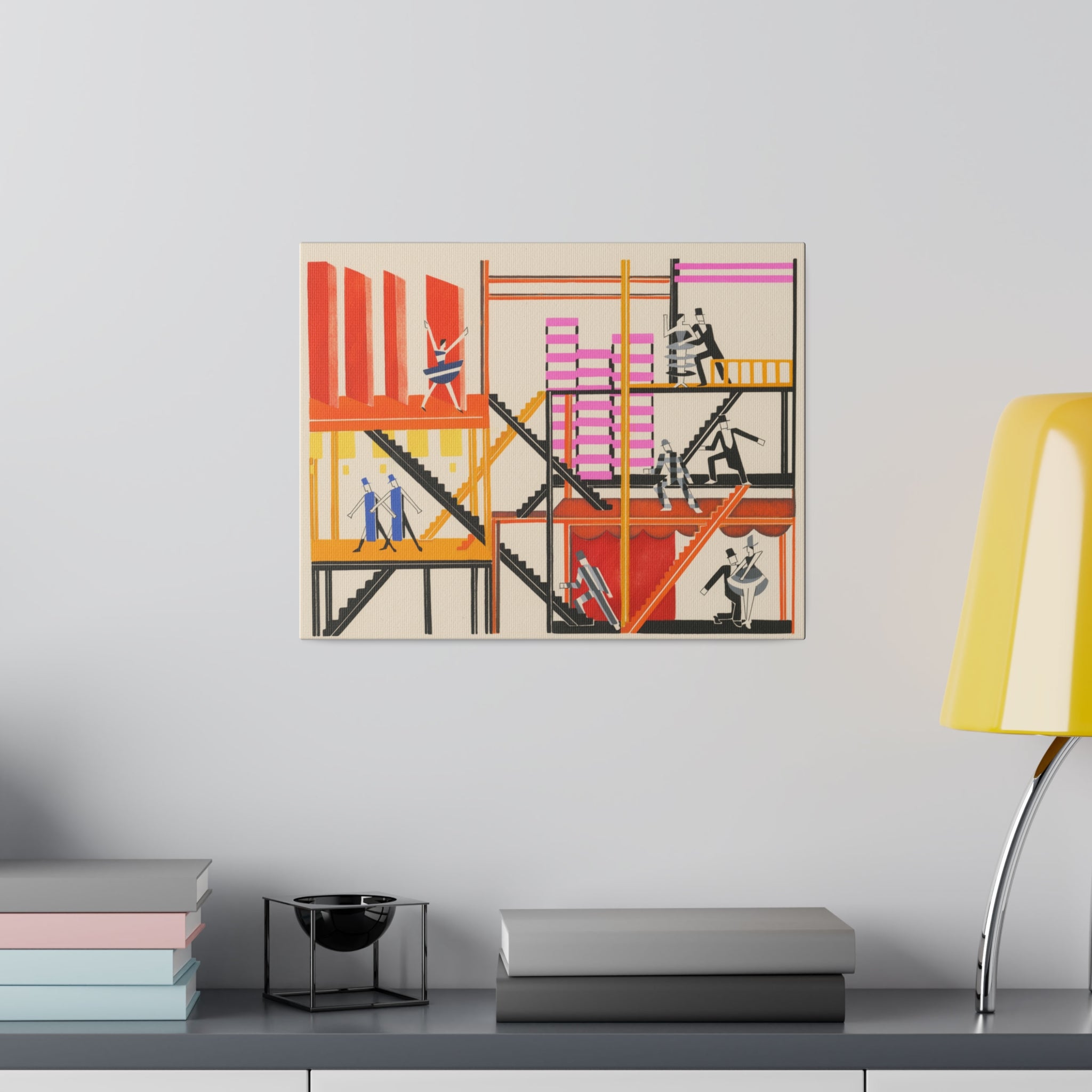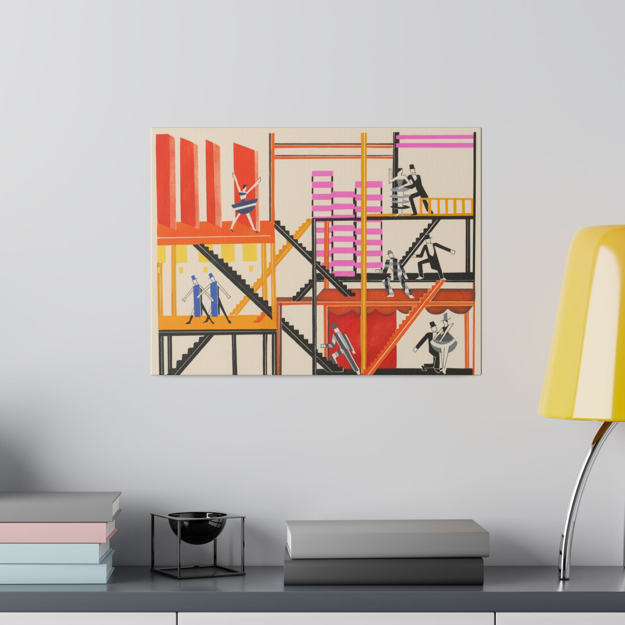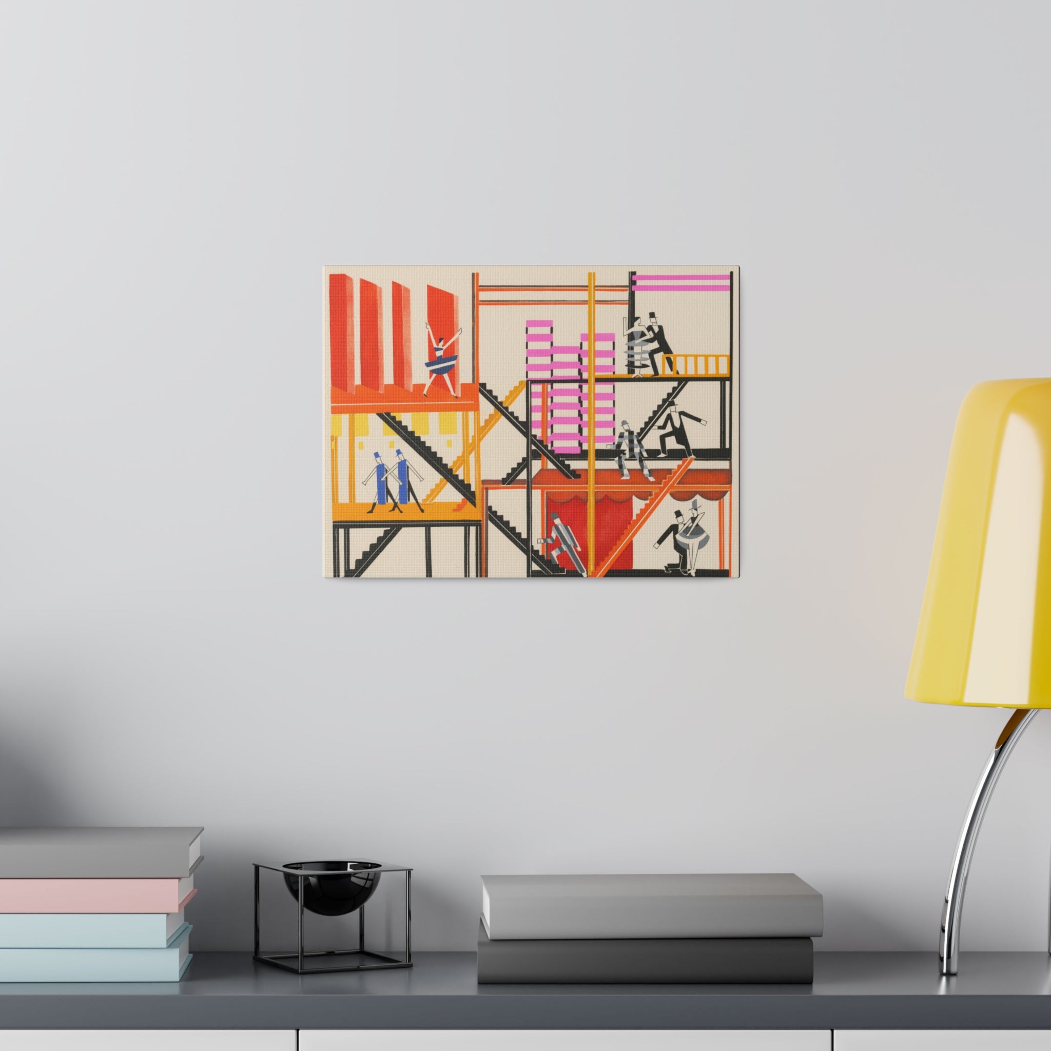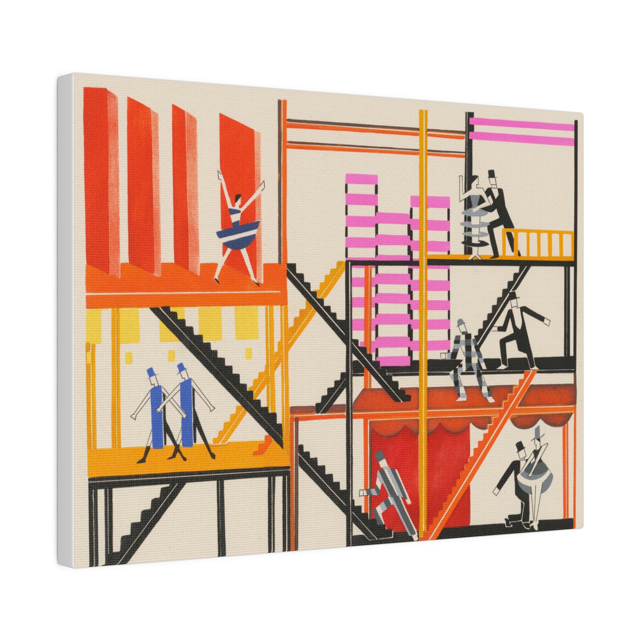 Artwork designed and digitally remastered by Sarasvati Designs. "Maquettes de Théâtre 4" by Alexandra Exter, a Ukrainian-French artist, features a series of theatrical maquettes, miniature models used for set design, crafted with meticulous attention to detail. The composition bursts with vibrant colors, bold shapes, and dynamic forms, creating a sense of energy and movement. Exter's unique artistic language blends elements of Cubism and Futurism, resulting in a visually striking and modern interpretation of theater design.
