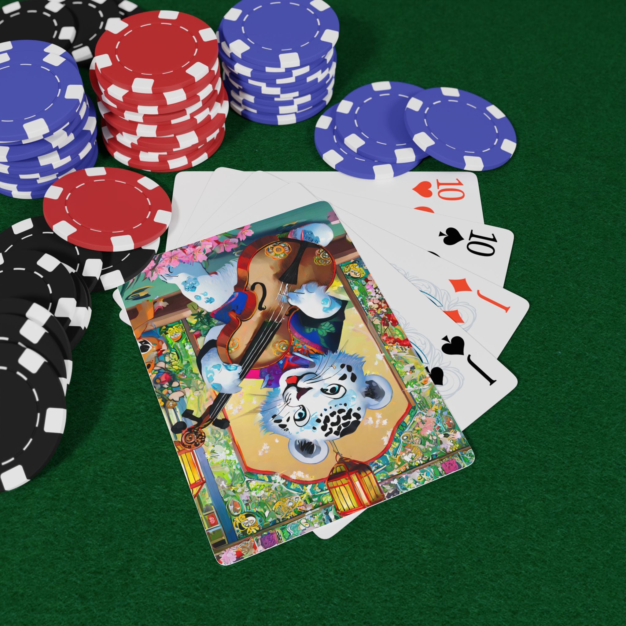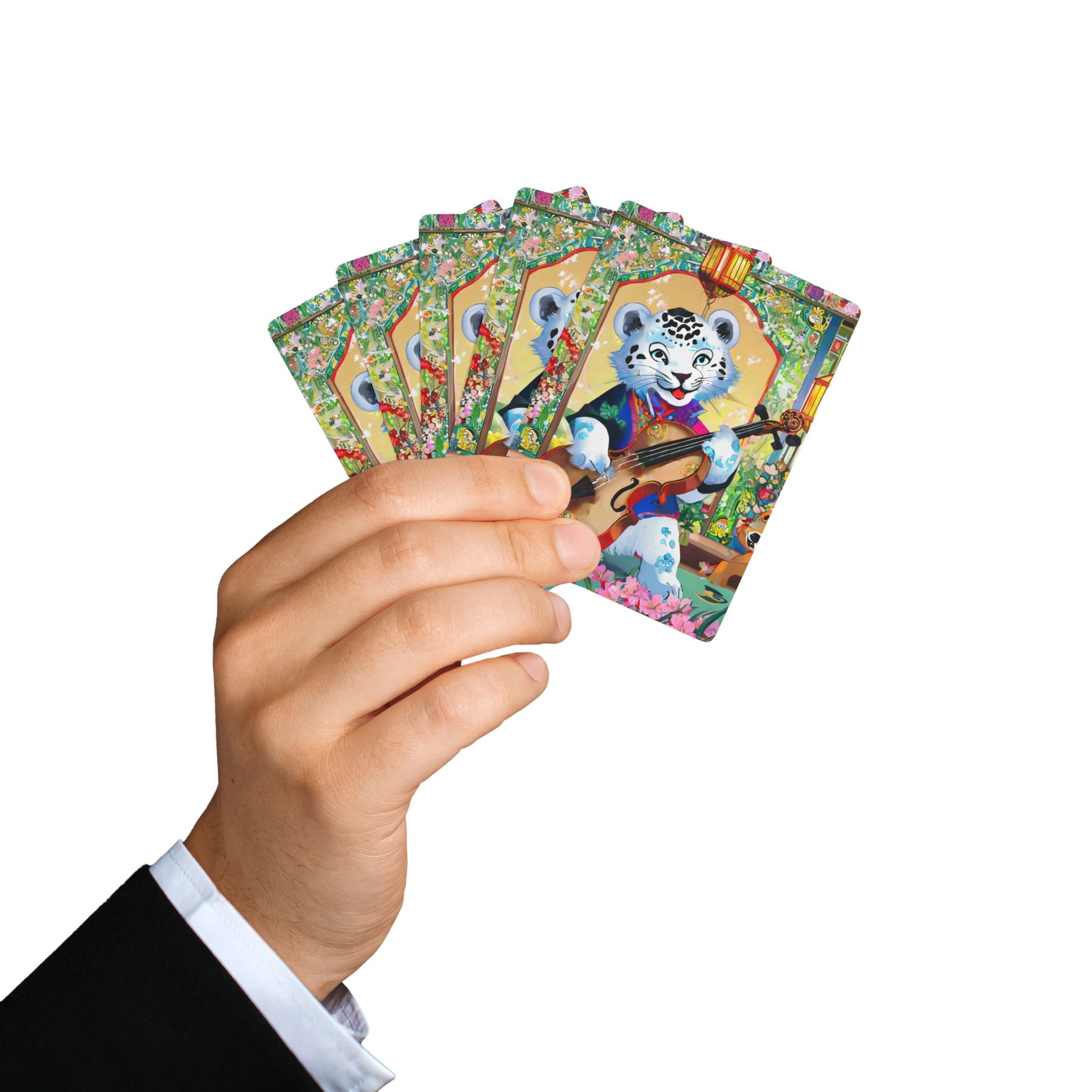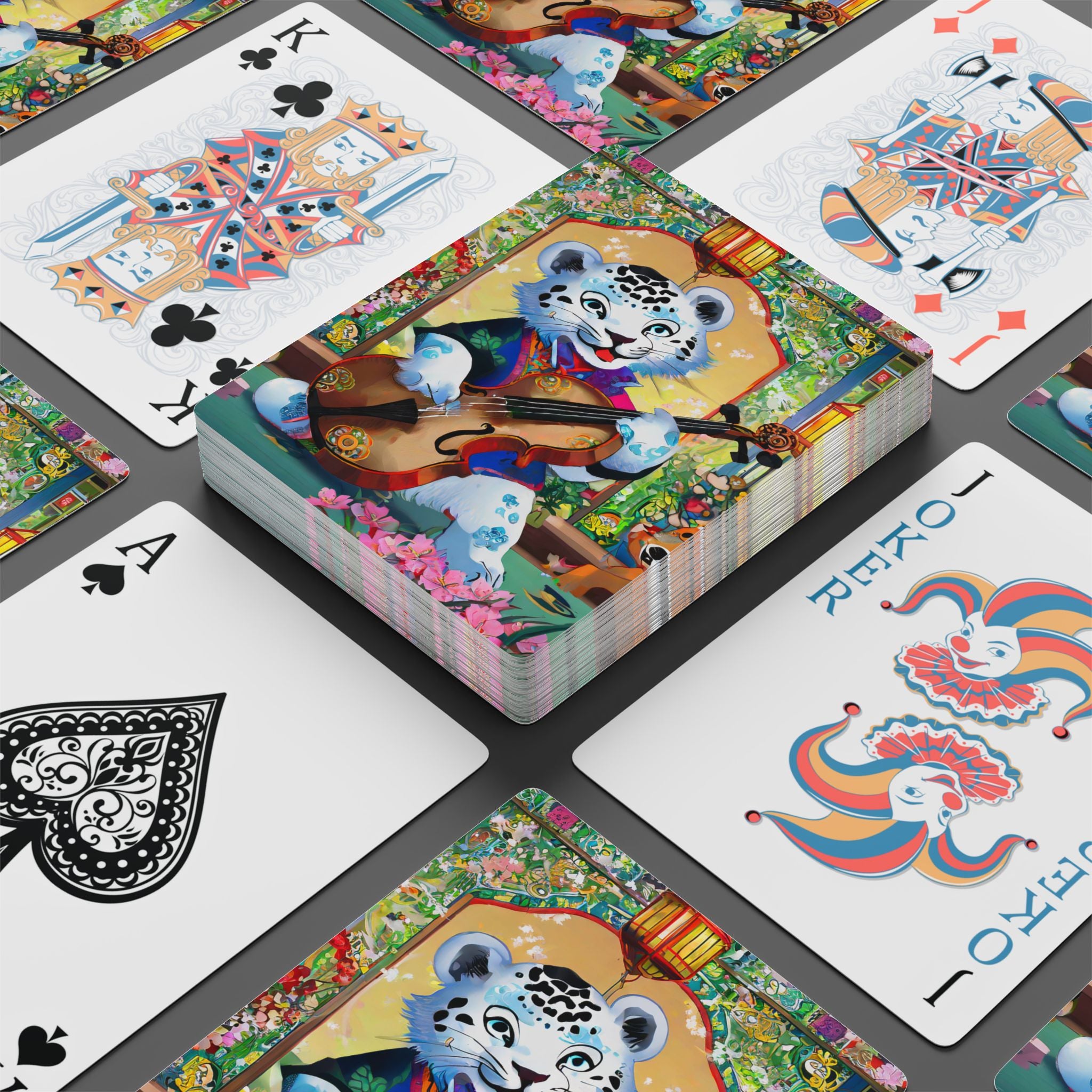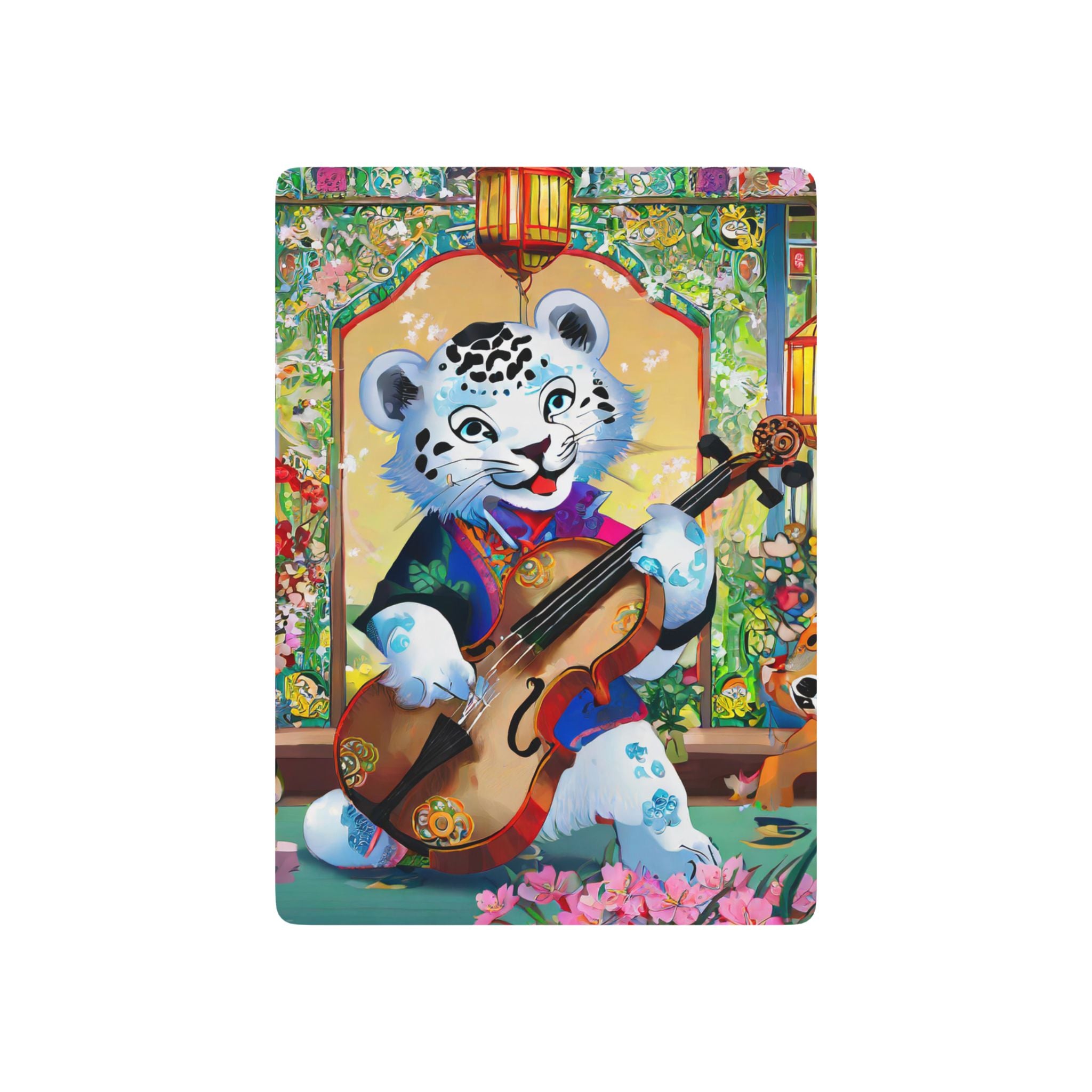 Poker and family game nights are a great deal of fun, but a deck of cards featuring “Melodies of the Snow Lion Cub” adds a whimsical charm and cultural elegance to every hand. This heartwarming design showcases a jubilant snow lion cub delightfully playing the violin within an enchanting Asian setting. The scene captures the spirit of joy, harmony, and mythical innocence through the lens of timeless tradition and magical realism.