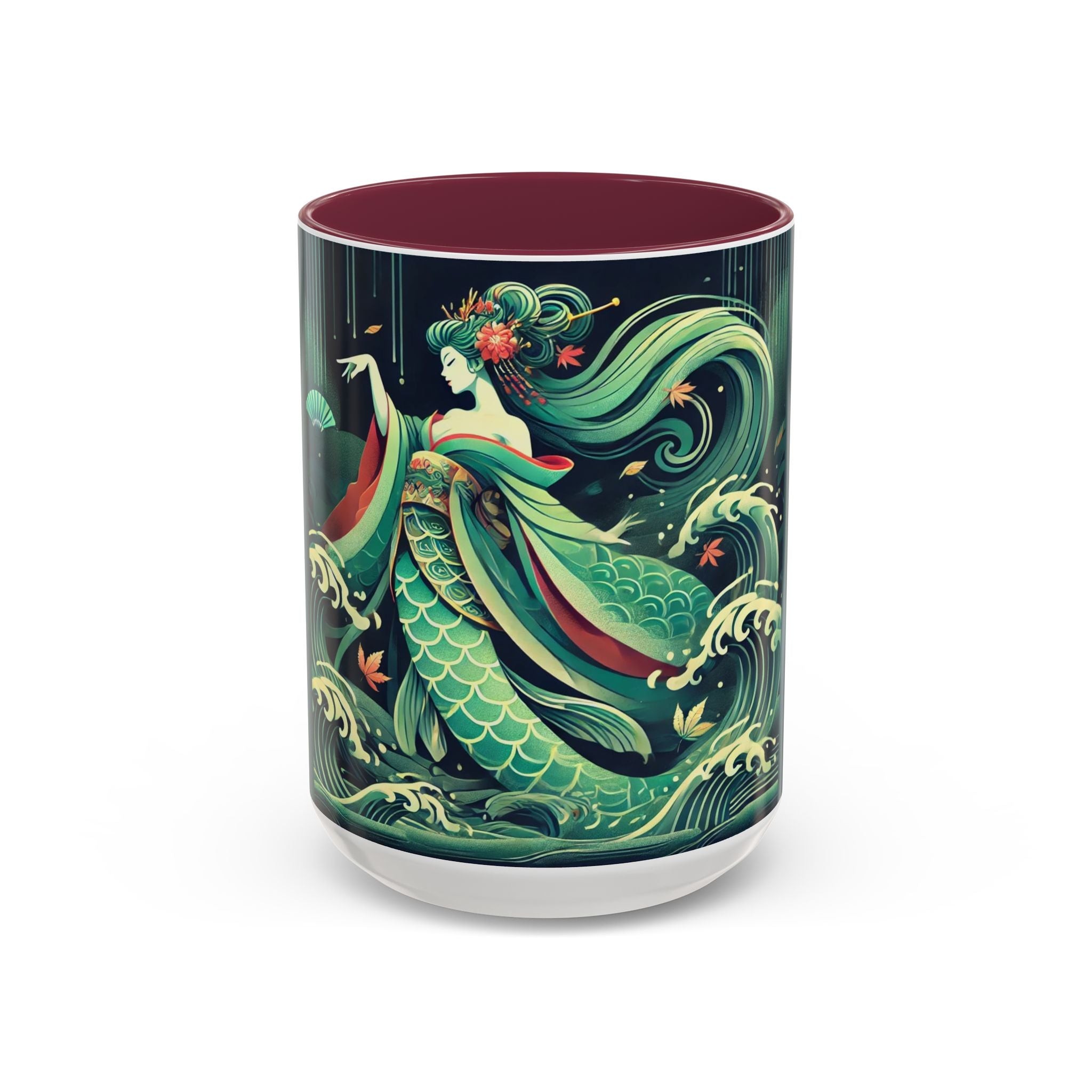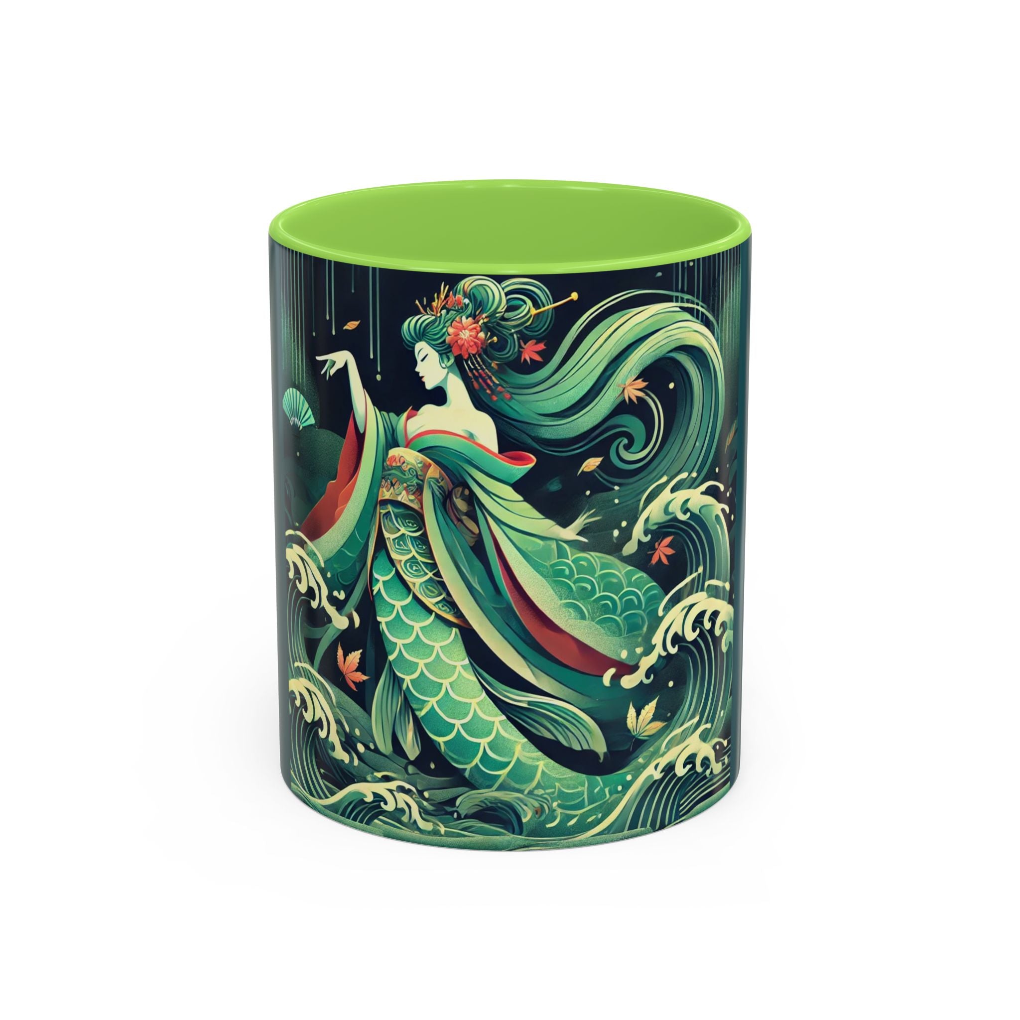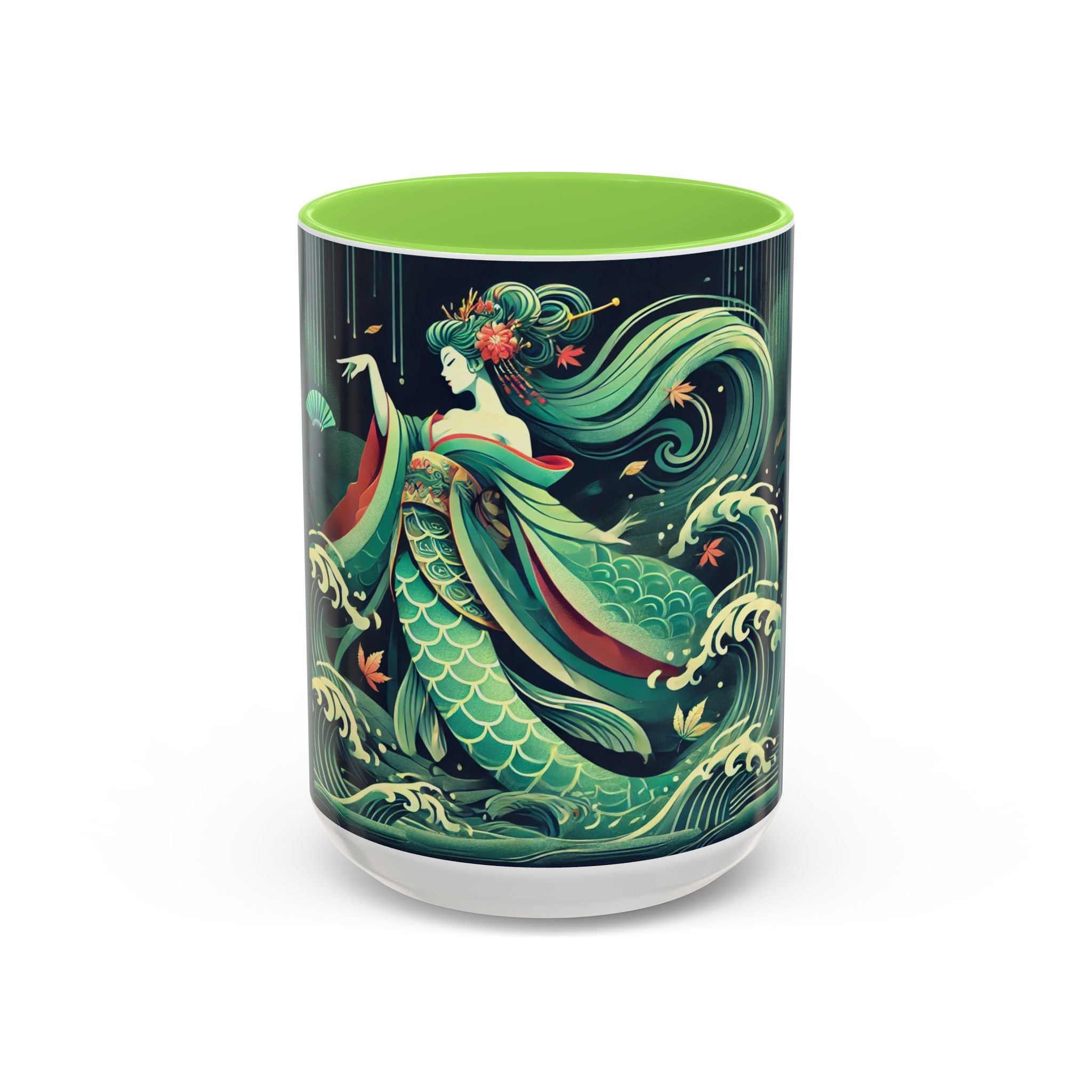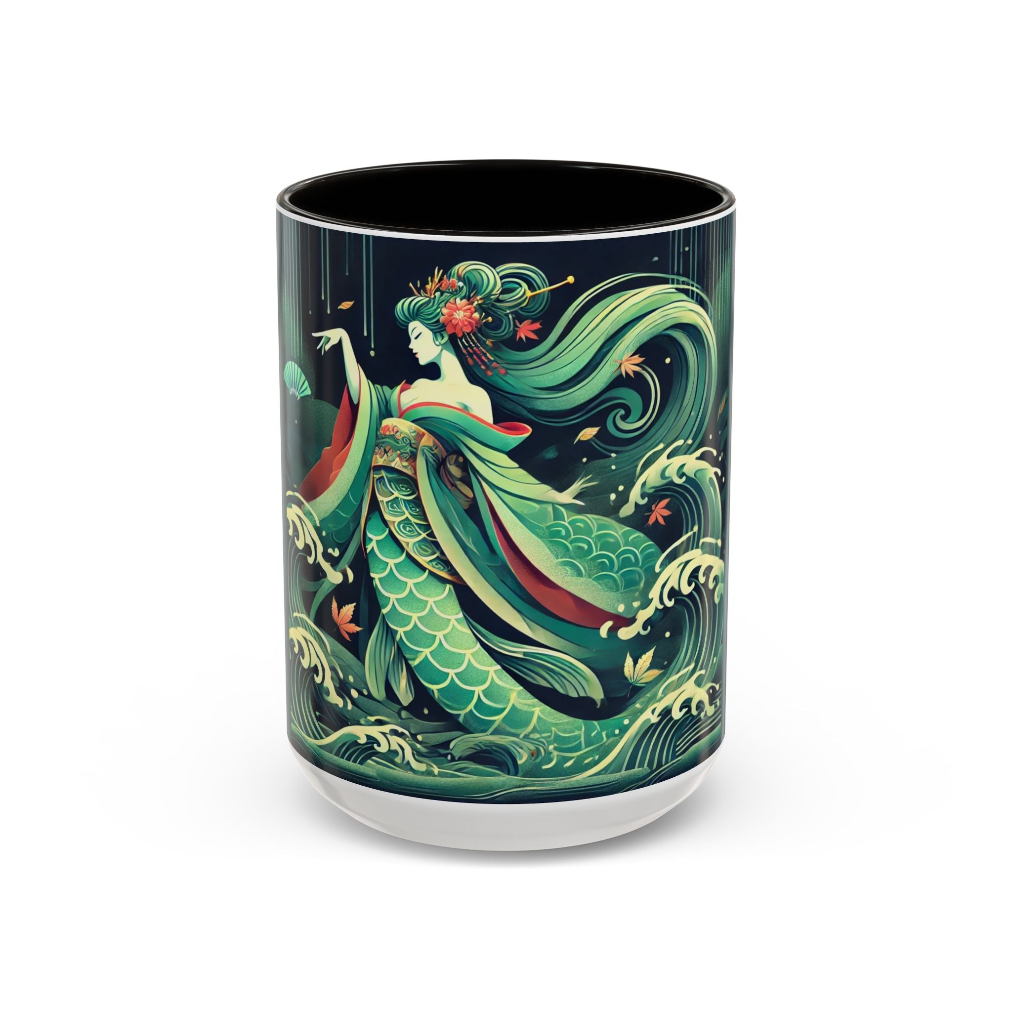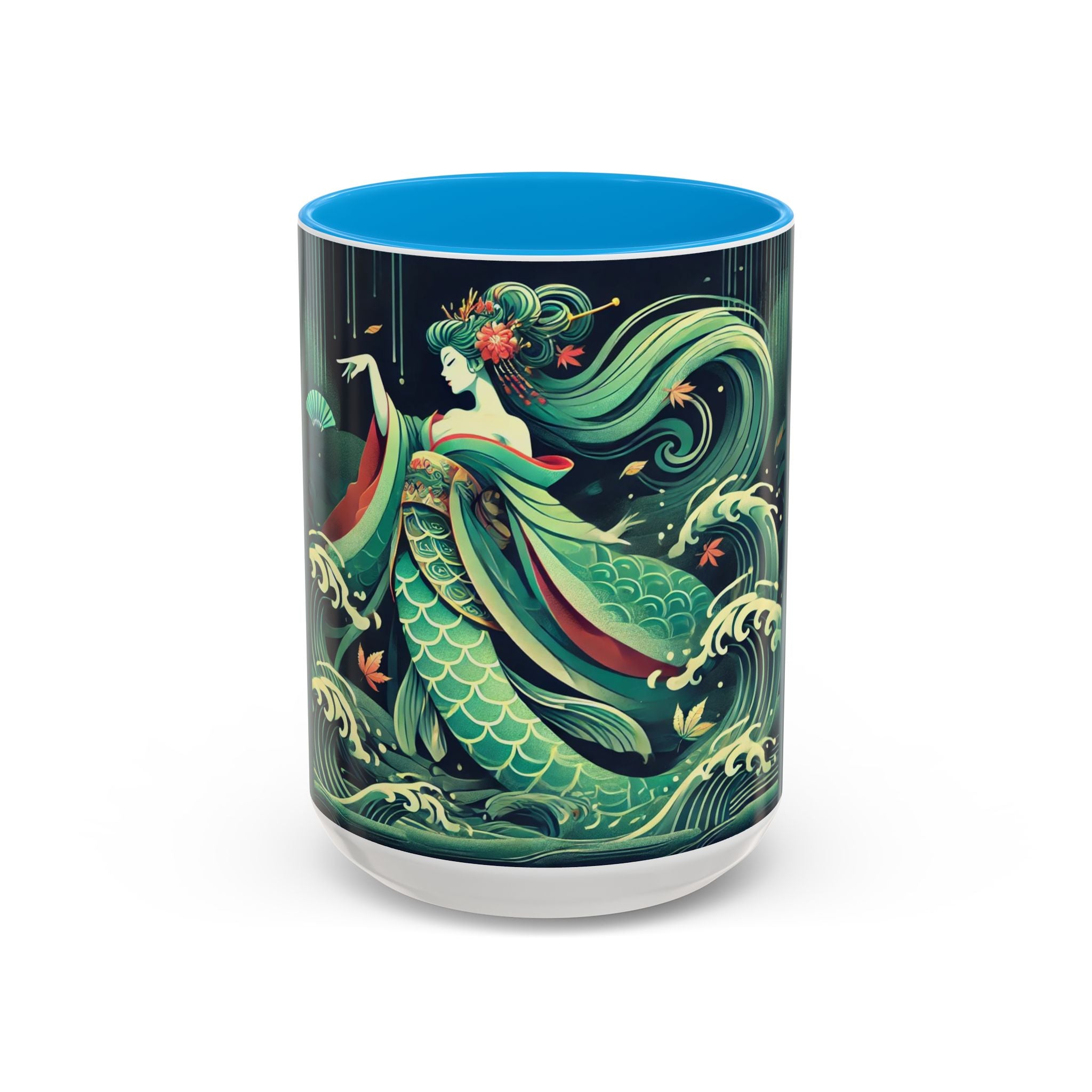 Mermaid Queen Rising from the Deep Colorful Mugs are everyday essentials that transform daily rituals into moments of artistry. Available in 11oz or 15oz sizes and offered in twelve striking color options, each mug features a glossy finish that enhances the vibrancy and detail of the artwork. With a colored handle and interior, these mugs bring personality and flair to every sip, making them instant favorites in any kitchen or office. The featured artwork captures a kabuki-inspired mermaid queen rising from deep green waters, her shimmering tail adorned with intricate patterns that glow with theatrical drama. Rendered in a bold flat style, the scene blends fantasy with Japanese theater influences, celebrating strength, grace, and imagination. Both lyrical and dramatic, this design turns a classic mug into a statement piece.