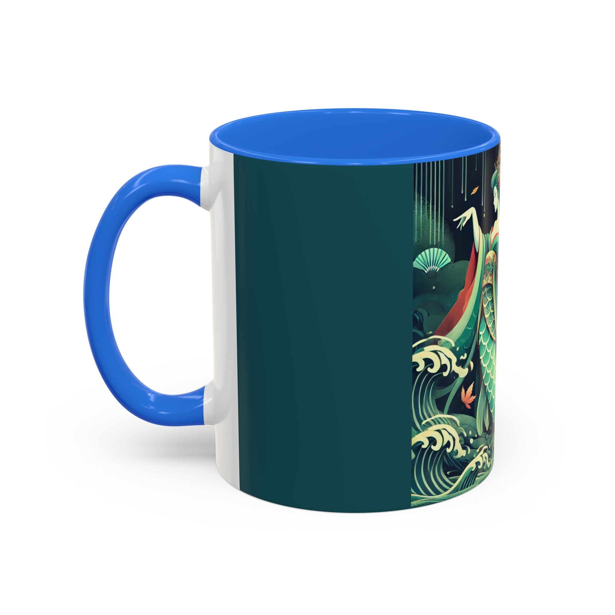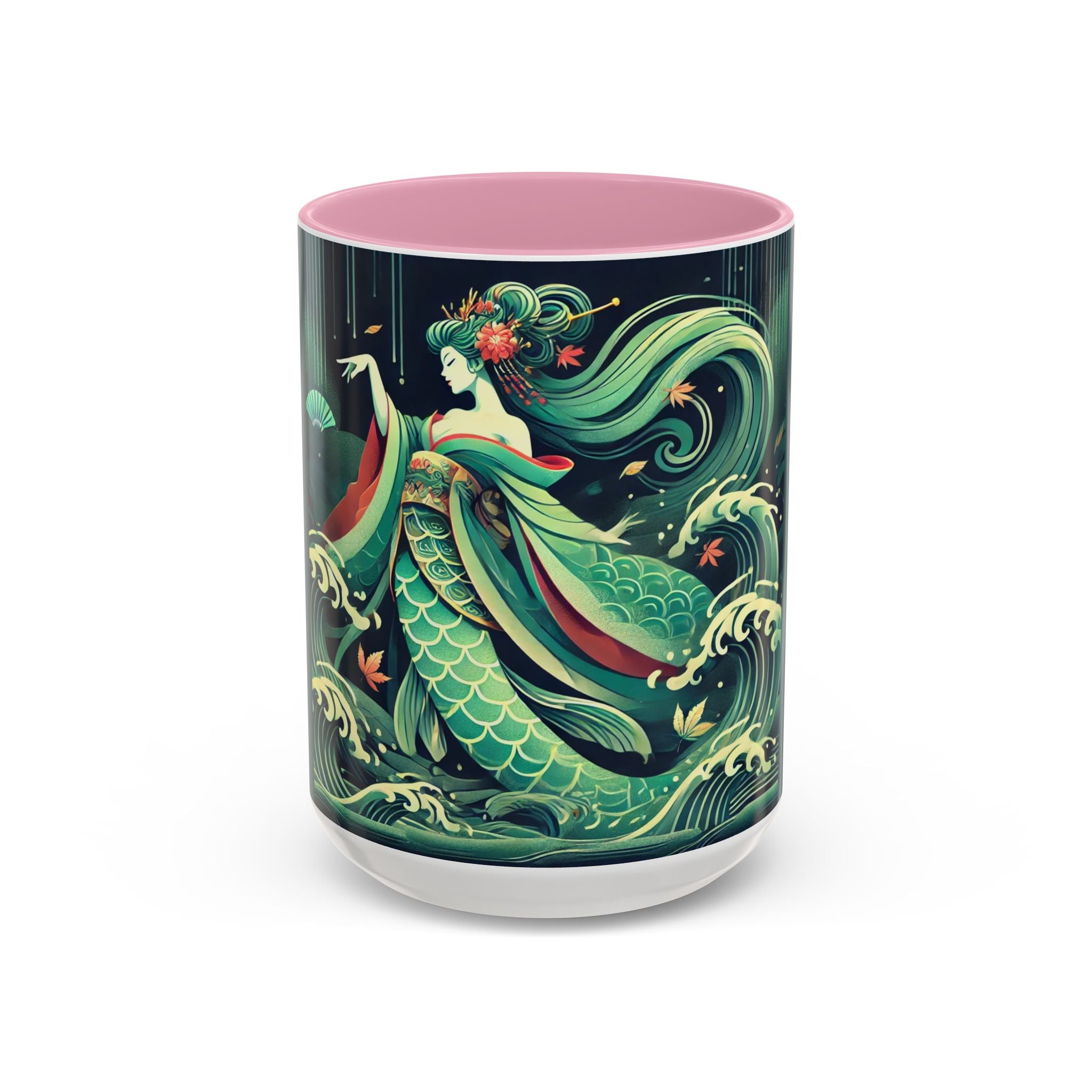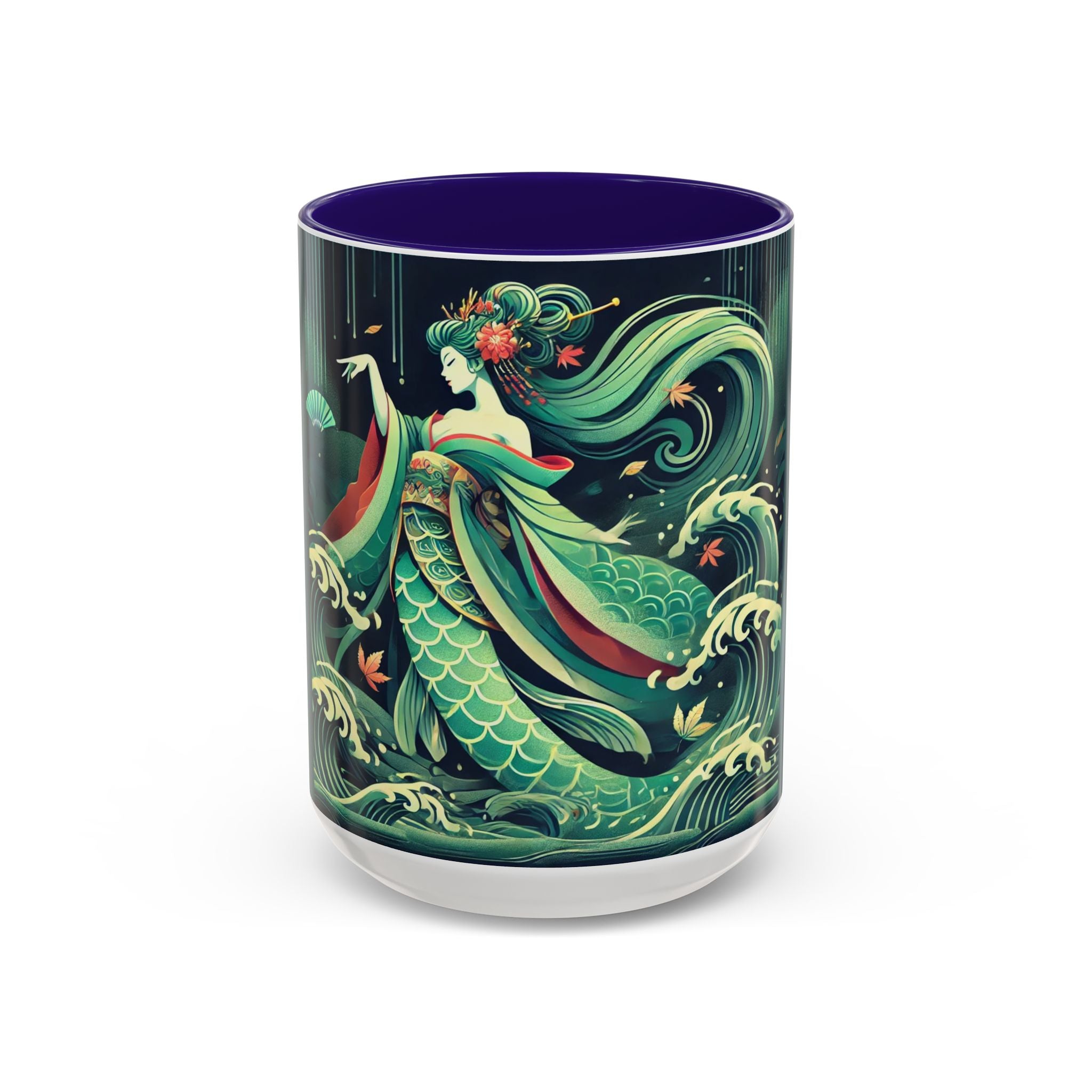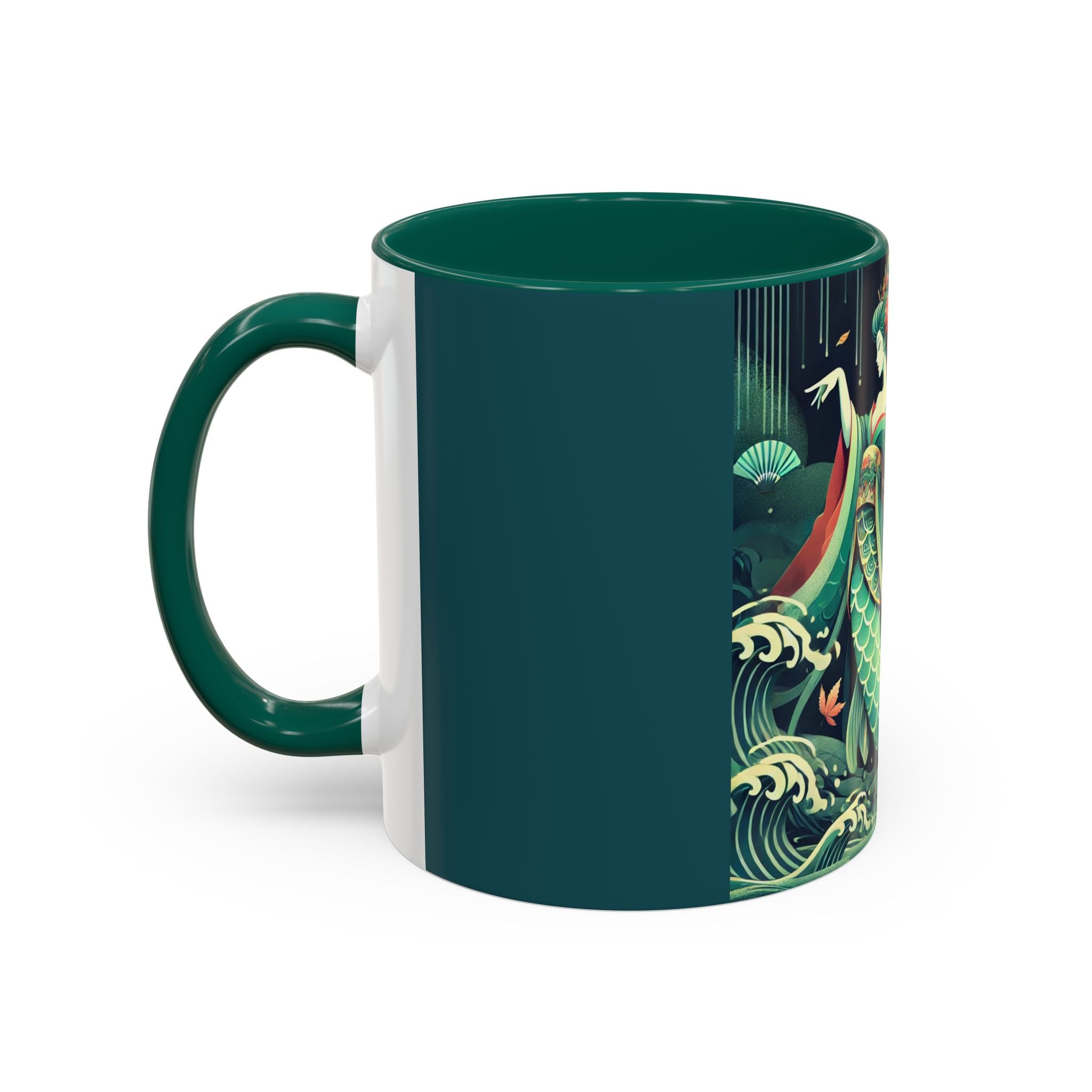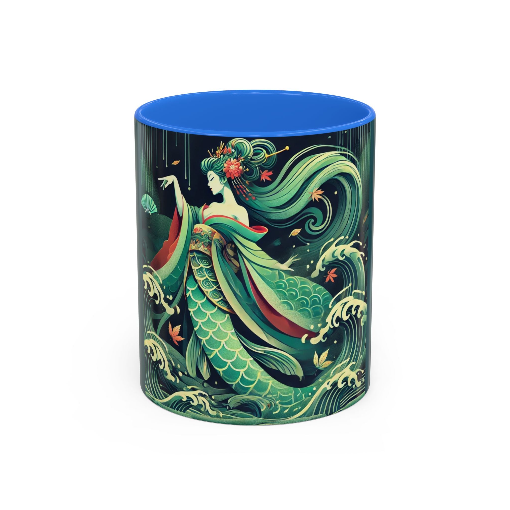 Mermaid Queen Rising from the Deep Colorful Mugs are everyday essentials that transform daily rituals into moments of artistry. Available in 11oz or 15oz sizes and offered in twelve striking color options, each mug features a glossy finish that enhances the vibrancy and detail of the artwork. With a colored handle and interior, these mugs bring personality and flair to every sip, making them instant favorites in any kitchen or office. The featured artwork captures a kabuki-inspired mermaid queen rising from deep green waters, her shimmering tail adorned with intricate patterns that glow with theatrical drama. Rendered in a bold flat style, the scene blends fantasy with Japanese theater influences, celebrating strength, grace, and imagination. Both lyrical and dramatic, this design turns a classic mug into a statement piece.