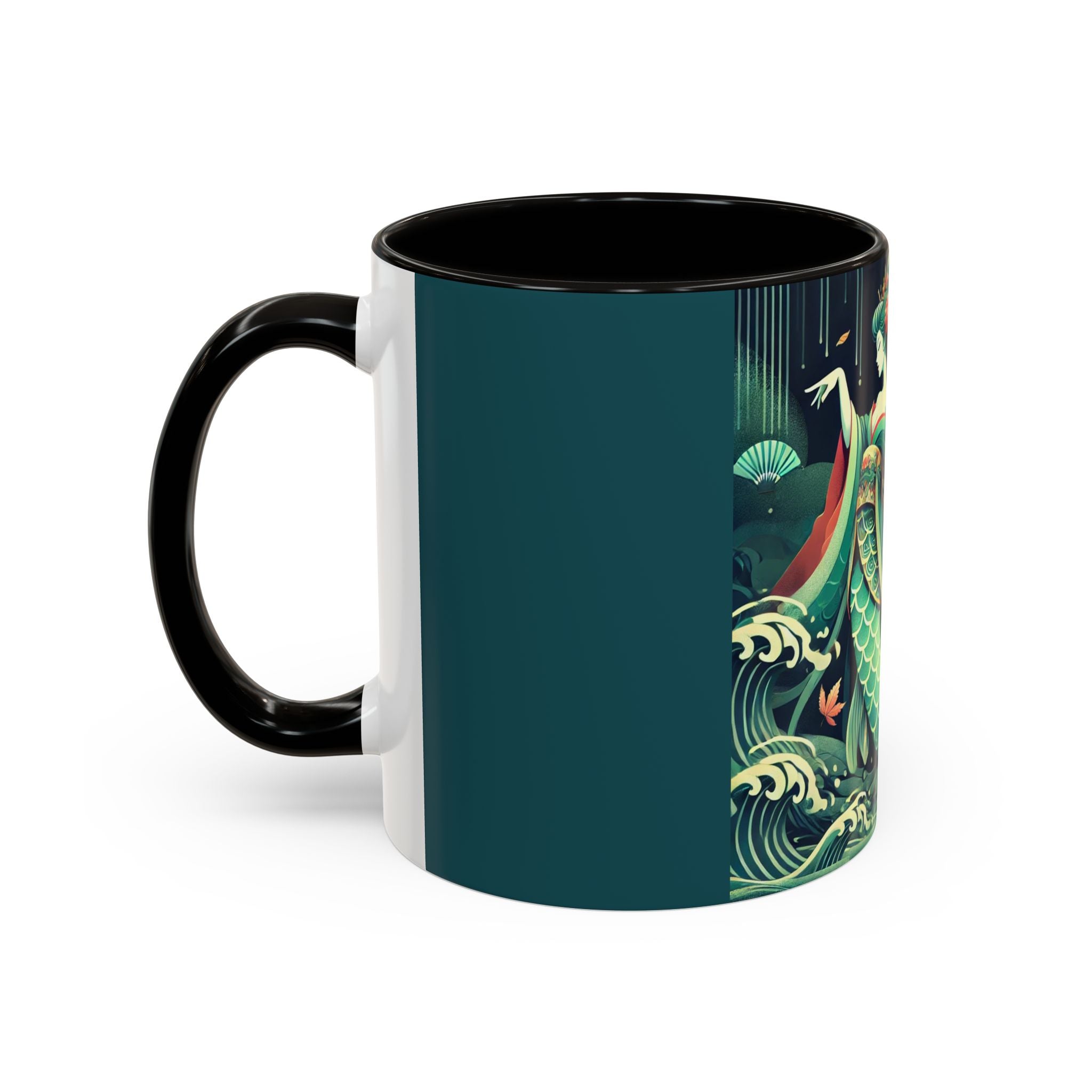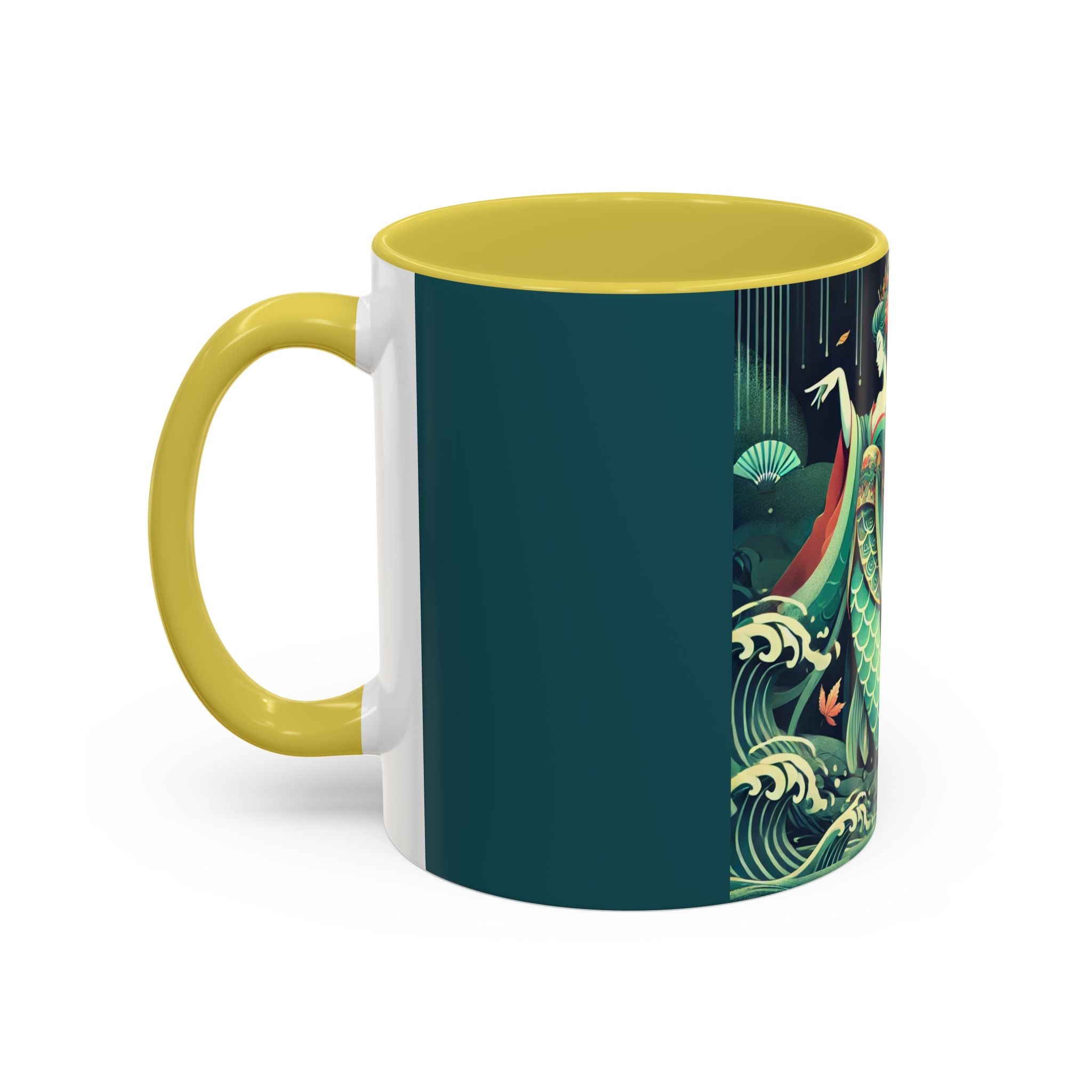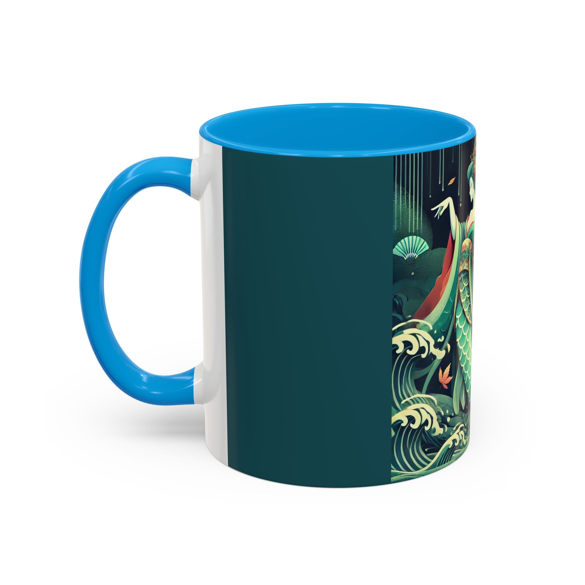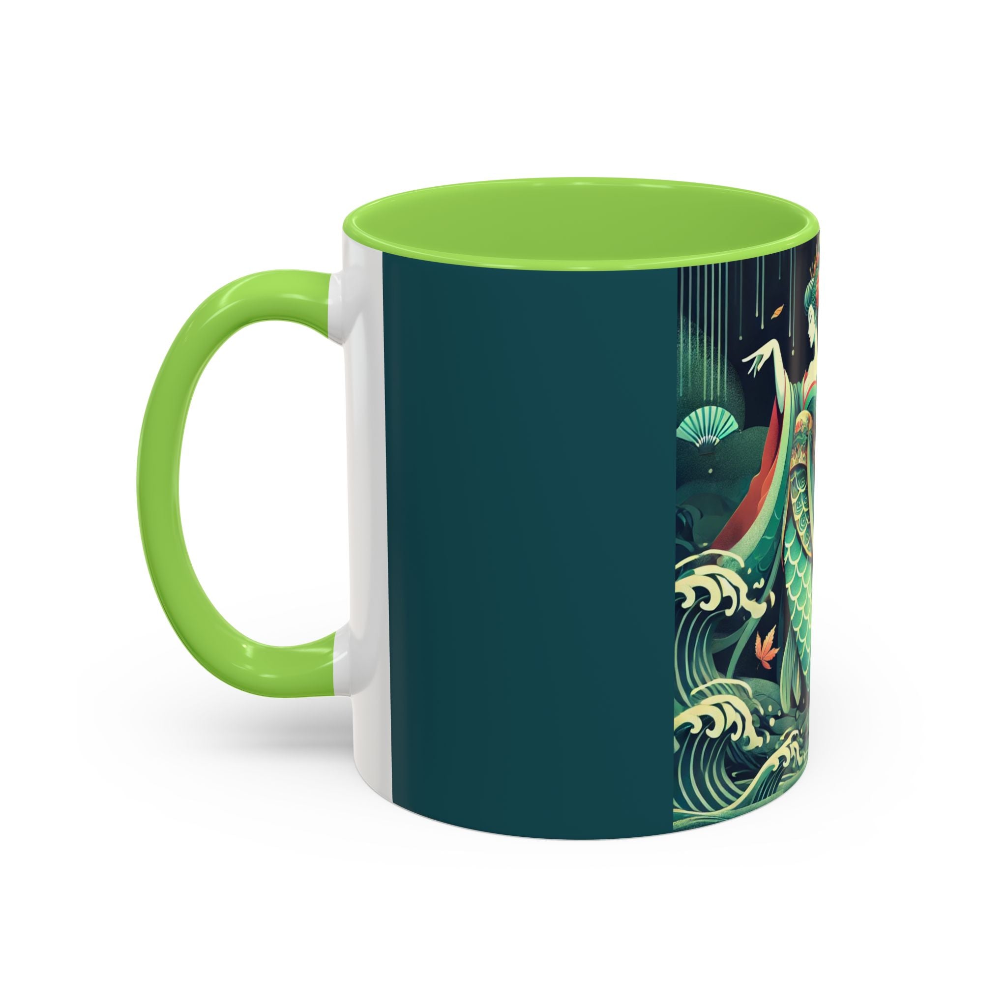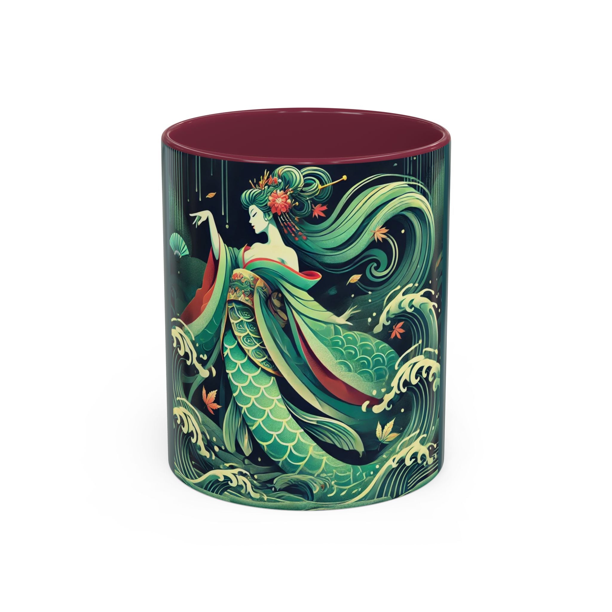 Mermaid Queen Rising from the Deep Colorful Mugs are everyday essentials that transform daily rituals into moments of artistry. Available in 11oz or 15oz sizes and offered in twelve striking color options, each mug features a glossy finish that enhances the vibrancy and detail of the artwork. With a colored handle and interior, these mugs bring personality and flair to every sip, making them instant favorites in any kitchen or office. The featured artwork captures a kabuki-inspired mermaid queen rising from deep green waters, her shimmering tail adorned with intricate patterns that glow with theatrical drama. Rendered in a bold flat style, the scene blends fantasy with Japanese theater influences, celebrating strength, grace, and imagination. Both lyrical and dramatic, this design turns a classic mug into a statement piece.