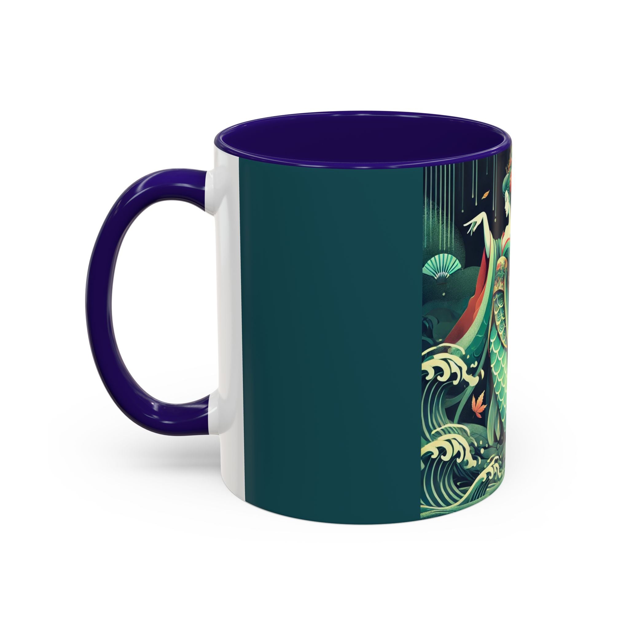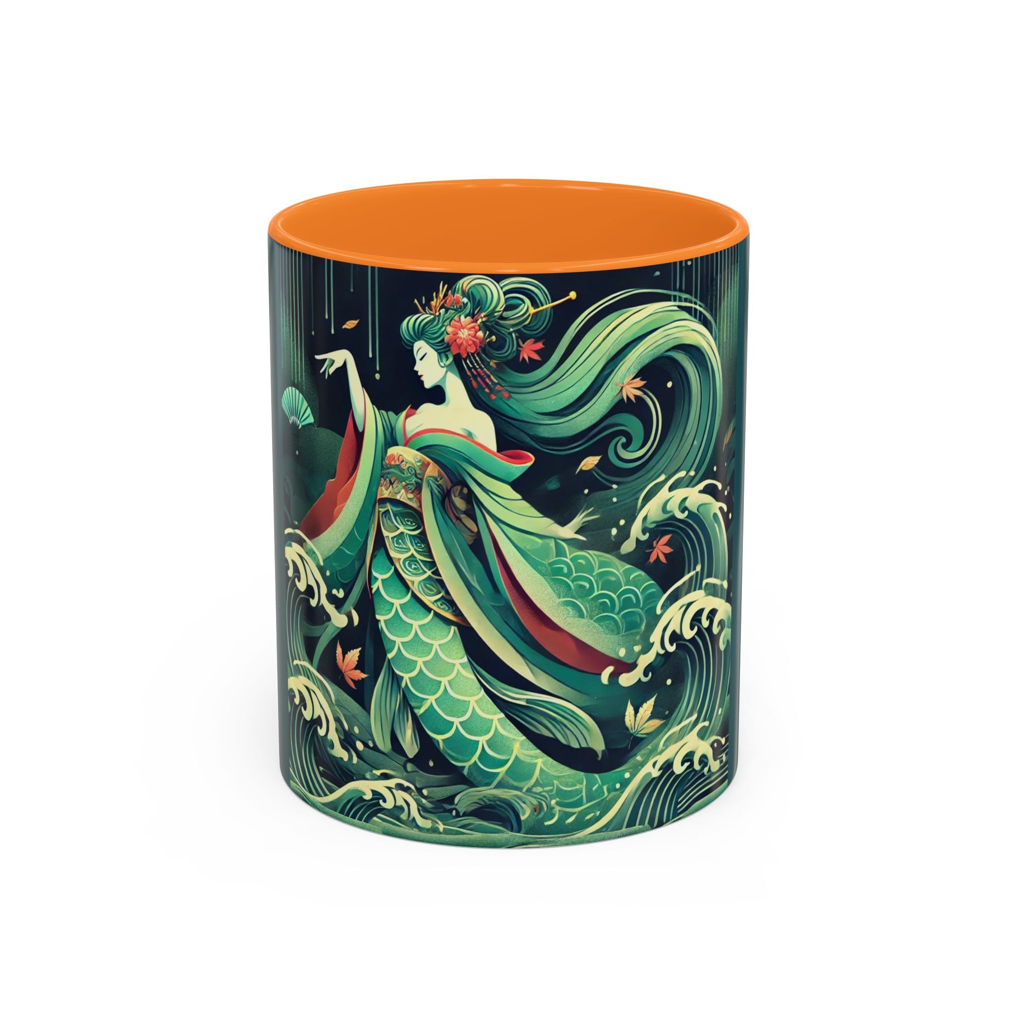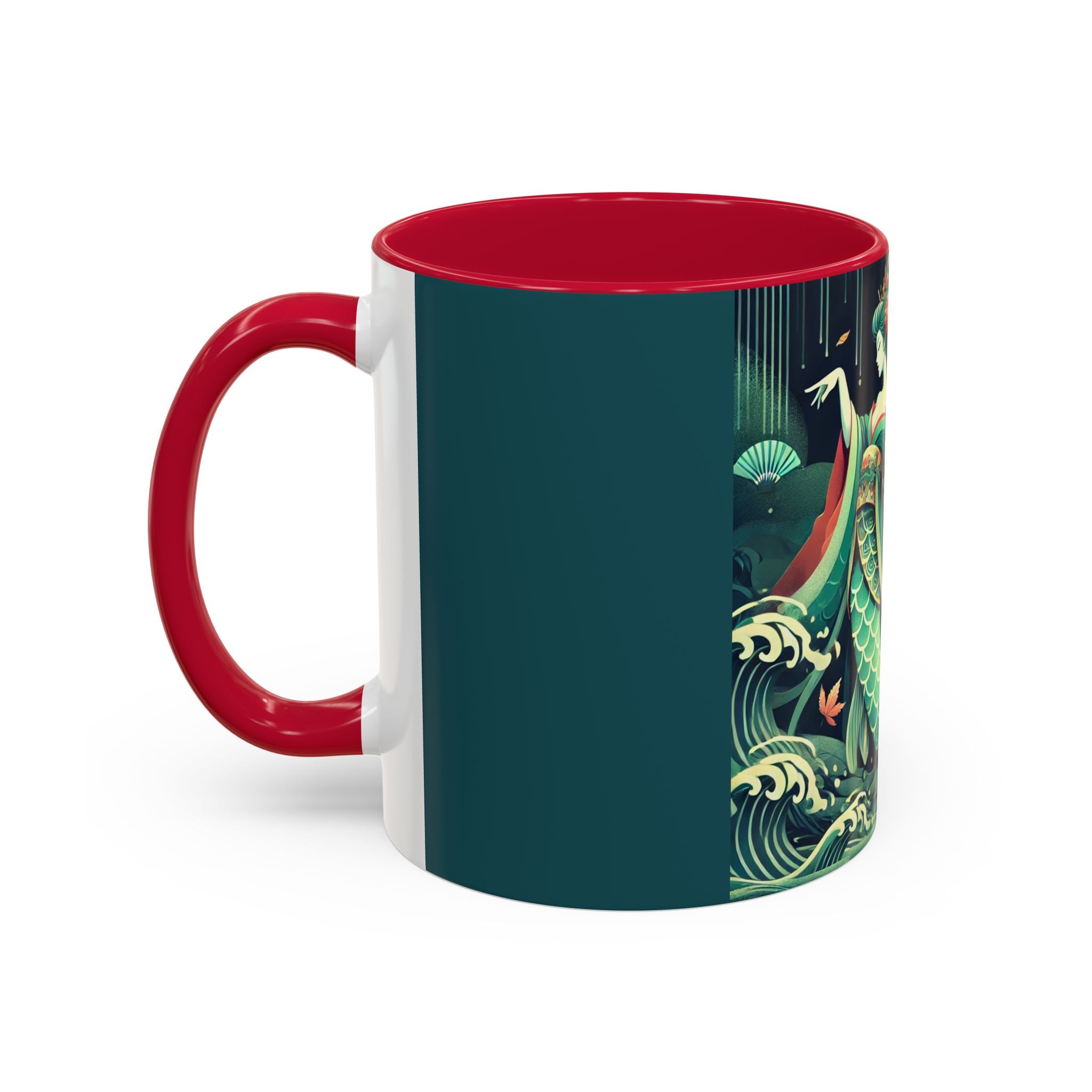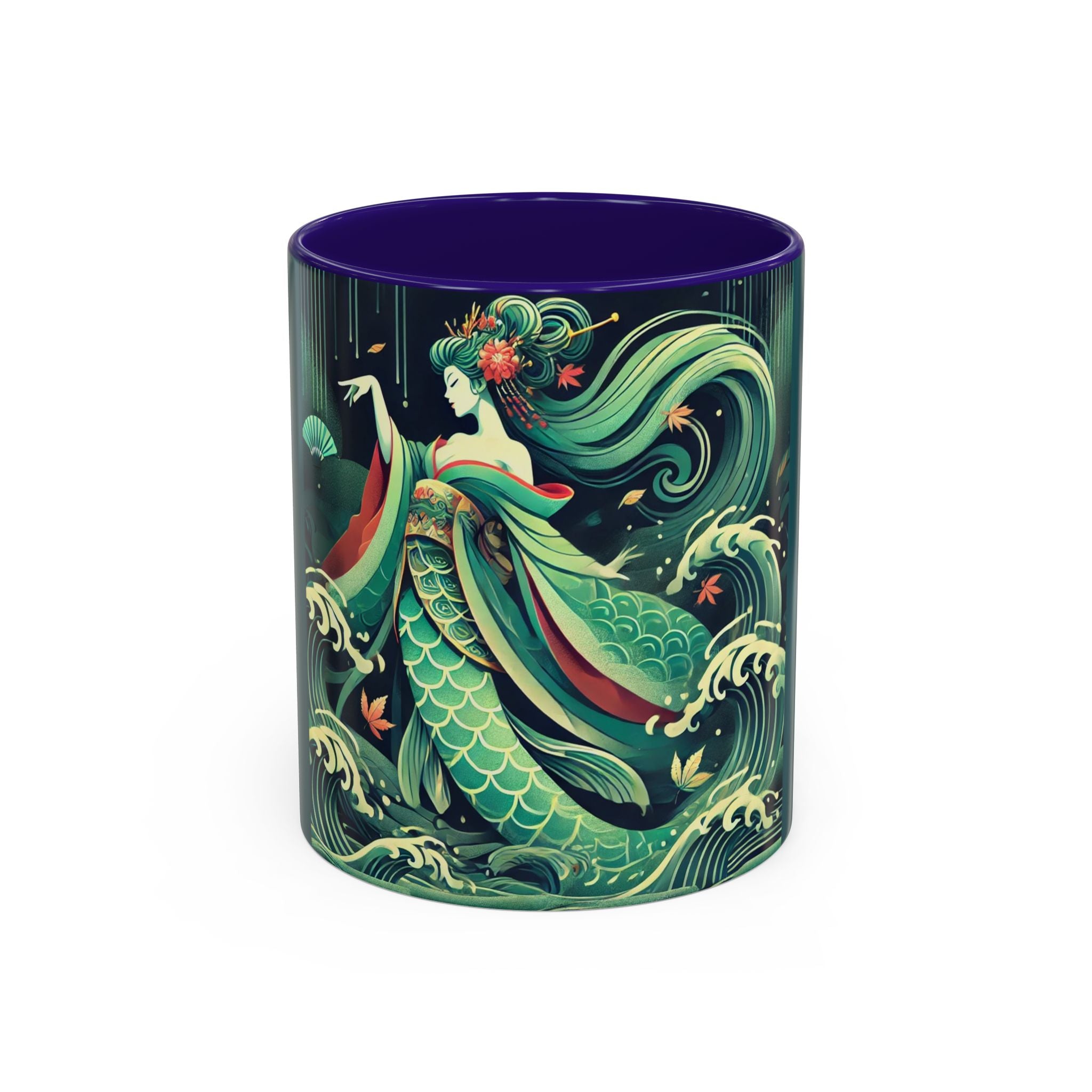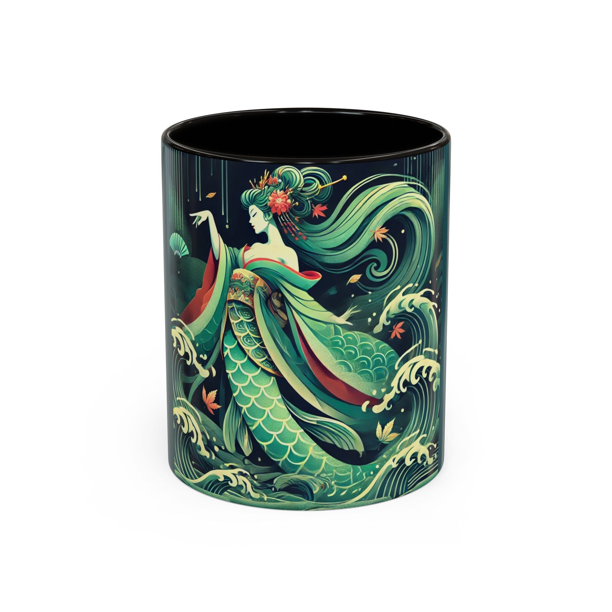 Mermaid Queen Rising from the Deep Colorful Mugs are everyday essentials that transform daily rituals into moments of artistry. Available in 11oz or 15oz sizes and offered in twelve striking color options, each mug features a glossy finish that enhances the vibrancy and detail of the artwork. With a colored handle and interior, these mugs bring personality and flair to every sip, making them instant favorites in any kitchen or office. The featured artwork captures a kabuki-inspired mermaid queen rising from deep green waters, her shimmering tail adorned with intricate patterns that glow with theatrical drama. Rendered in a bold flat style, the scene blends fantasy with Japanese theater influences, celebrating strength, grace, and imagination. Both lyrical and dramatic, this design turns a classic mug into a statement piece.