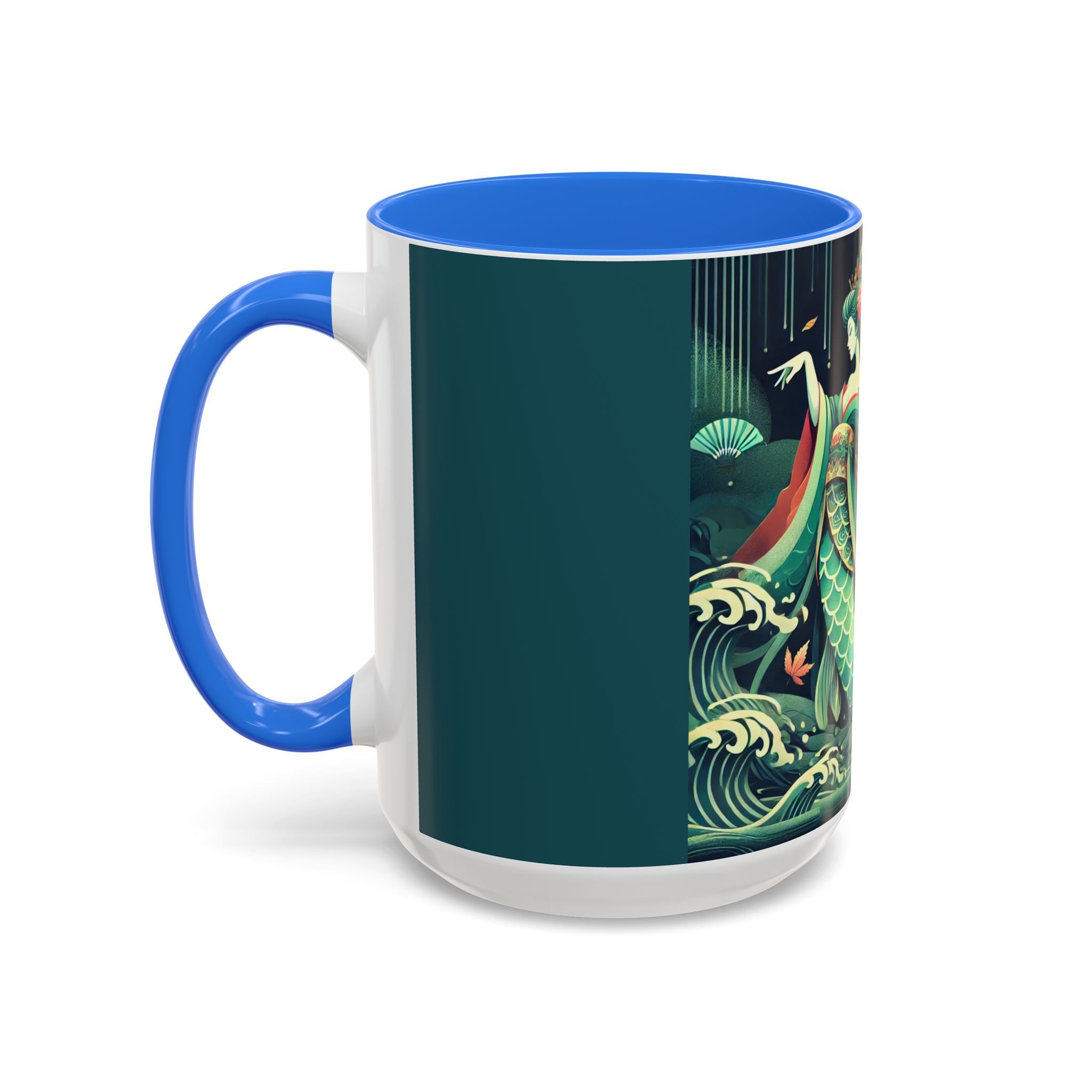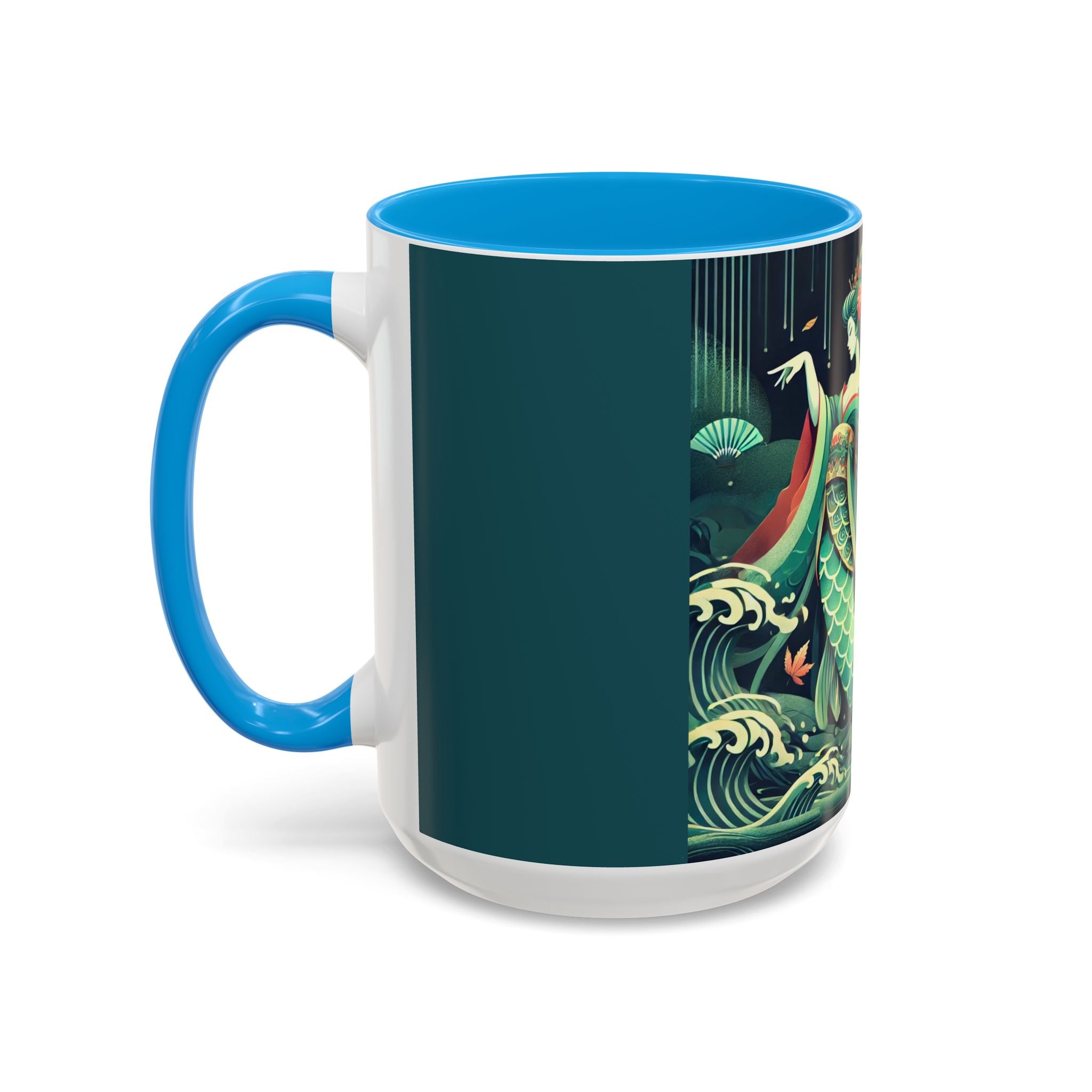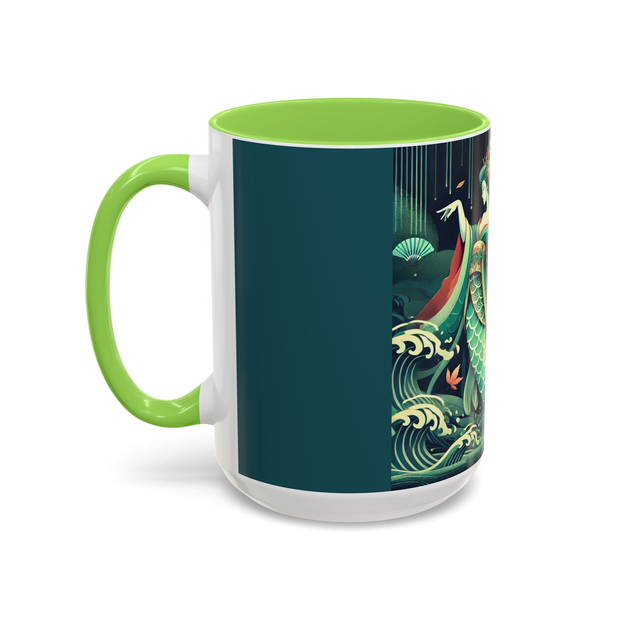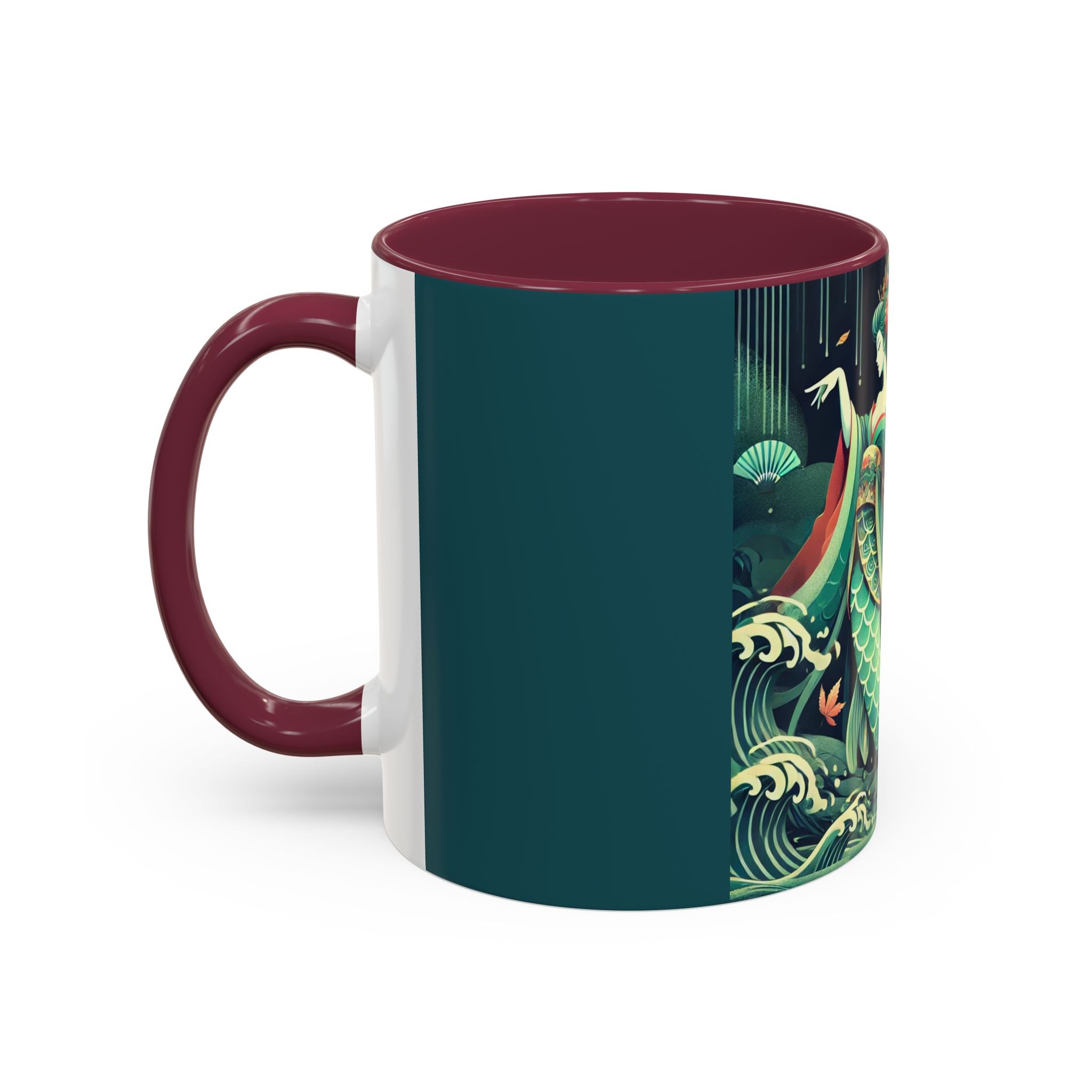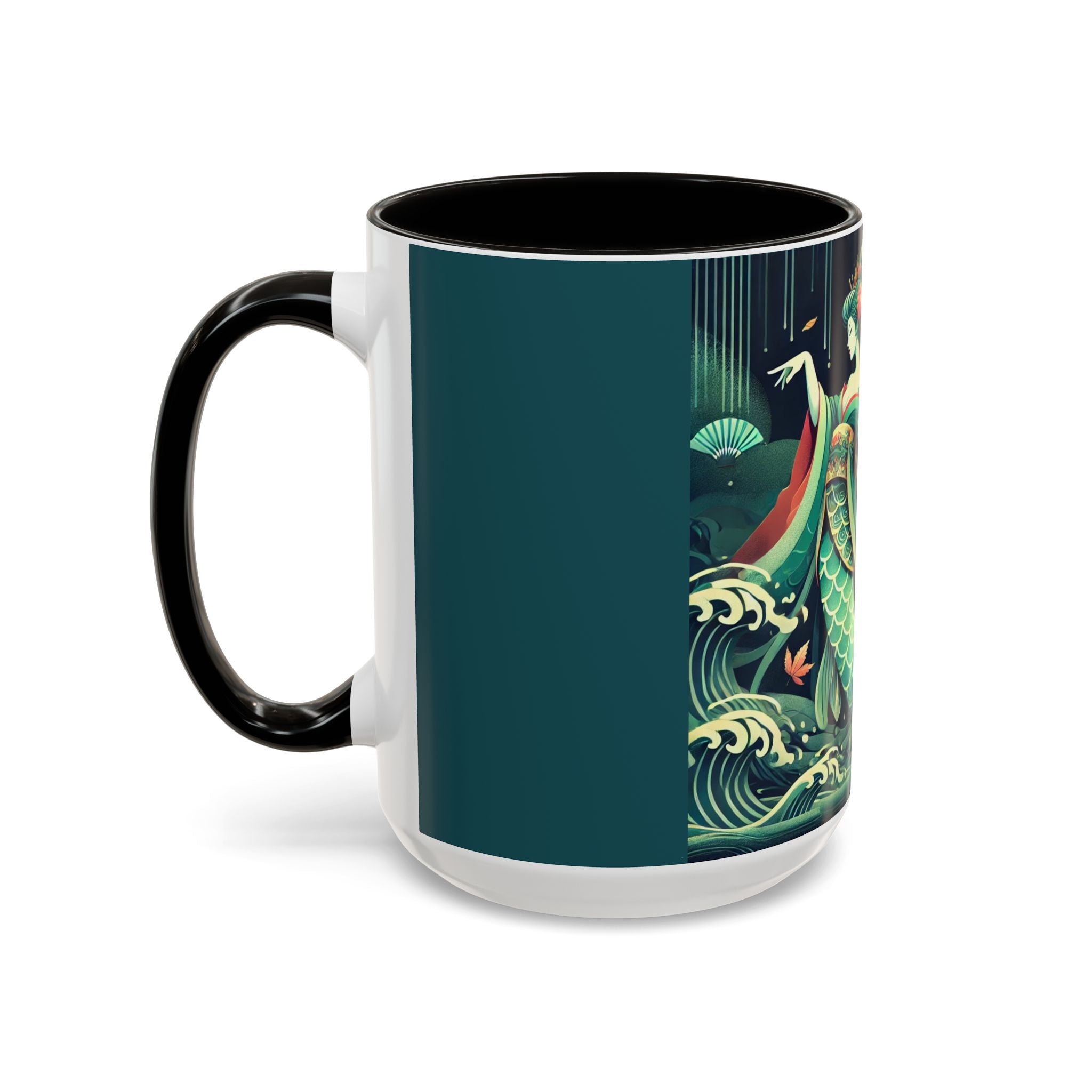 Mermaid Queen Rising from the Deep Colorful Mugs are everyday essentials that transform daily rituals into moments of artistry. Available in 11oz or 15oz sizes and offered in twelve striking color options, each mug features a glossy finish that enhances the vibrancy and detail of the artwork. With a colored handle and interior, these mugs bring personality and flair to every sip, making them instant favorites in any kitchen or office. The featured artwork captures a kabuki-inspired mermaid queen rising from deep green waters, her shimmering tail adorned with intricate patterns that glow with theatrical drama. Rendered in a bold flat style, the scene blends fantasy with Japanese theater influences, celebrating strength, grace, and imagination. Both lyrical and dramatic, this design turns a classic mug into a statement piece.
