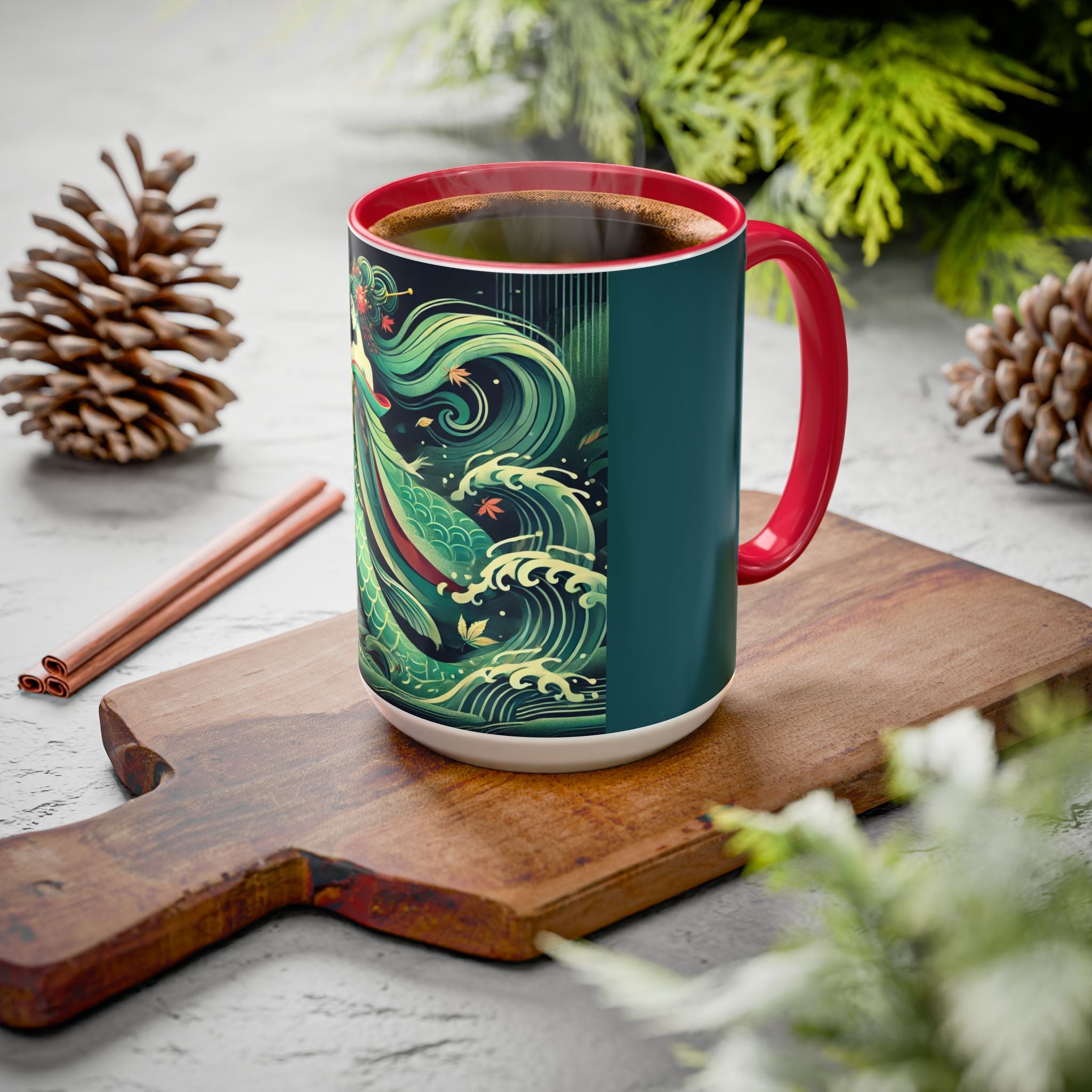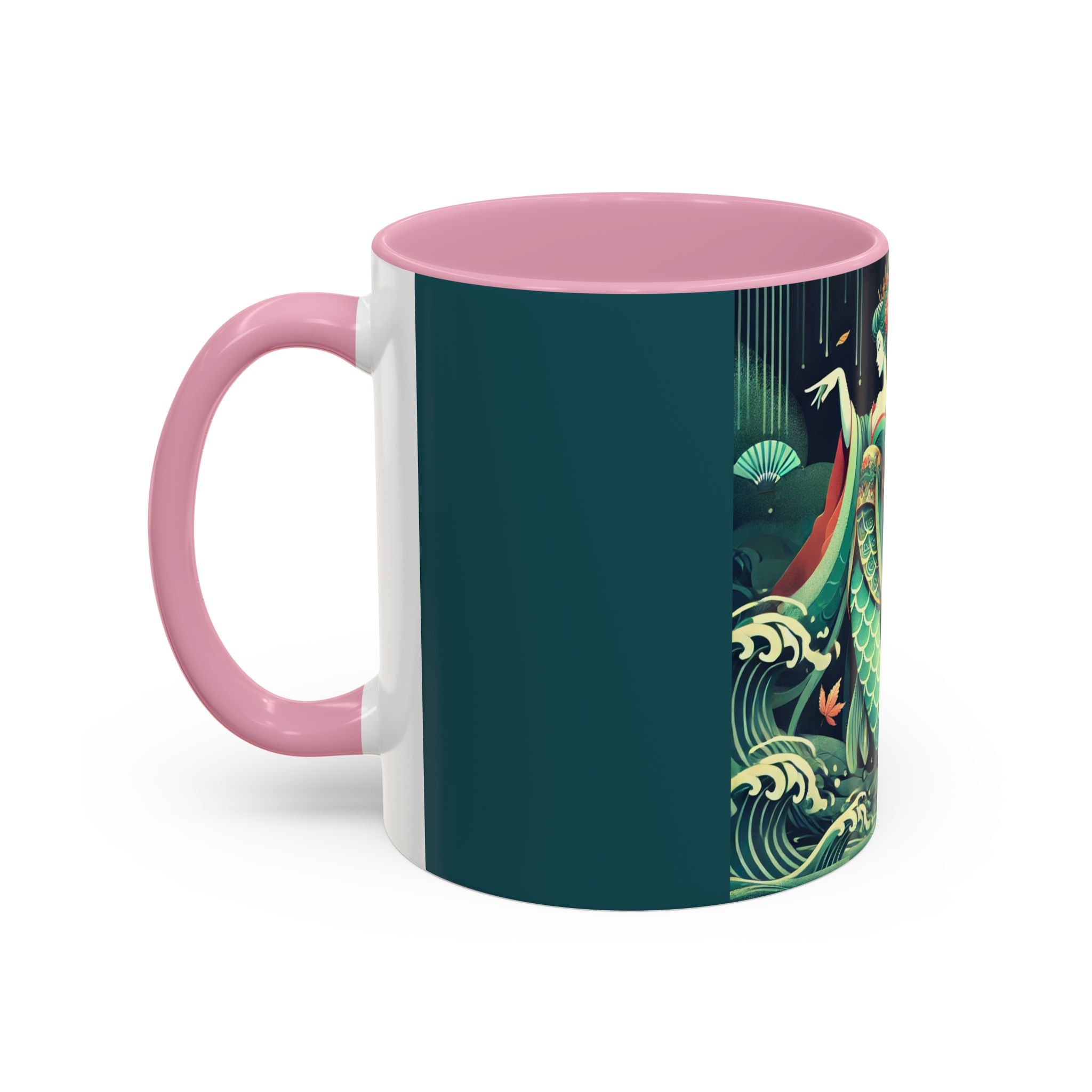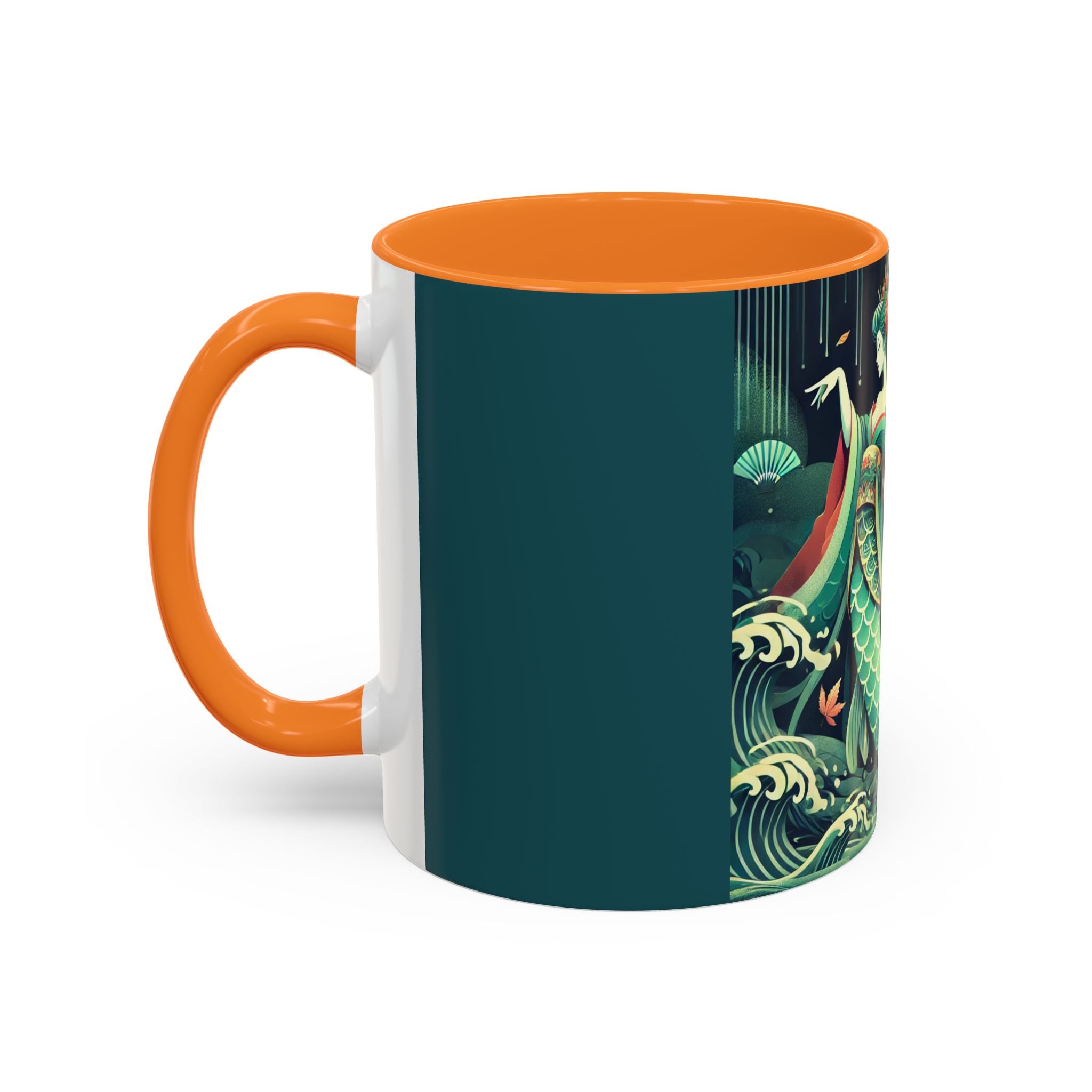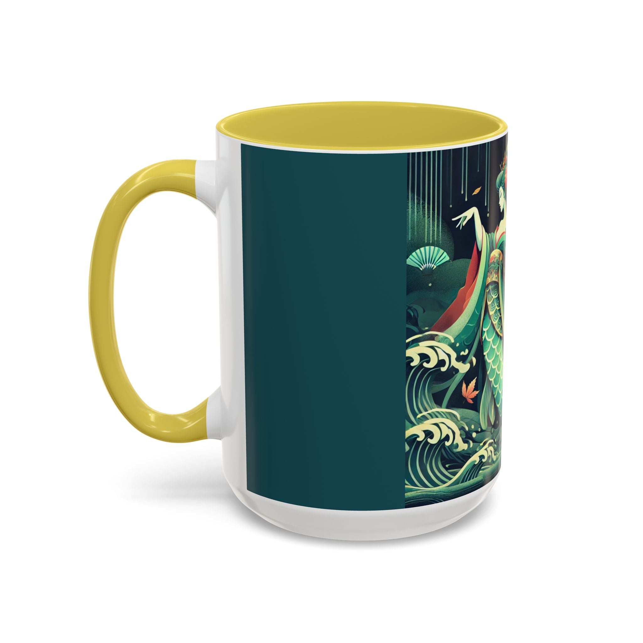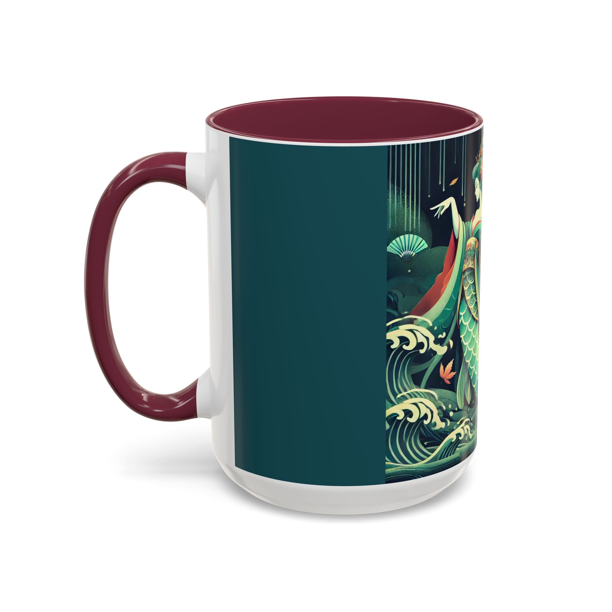 Mermaid Queen Rising from the Deep Colorful Mugs are everyday essentials that transform daily rituals into moments of artistry. Available in 11oz or 15oz sizes and offered in twelve striking color options, each mug features a glossy finish that enhances the vibrancy and detail of the artwork. With a colored handle and interior, these mugs bring personality and flair to every sip, making them instant favorites in any kitchen or office. The featured artwork captures a kabuki-inspired mermaid queen rising from deep green waters, her shimmering tail adorned with intricate patterns that glow with theatrical drama. Rendered in a bold flat style, the scene blends fantasy with Japanese theater influences, celebrating strength, grace, and imagination. Both lyrical and dramatic, this design turns a classic mug into a statement piece.