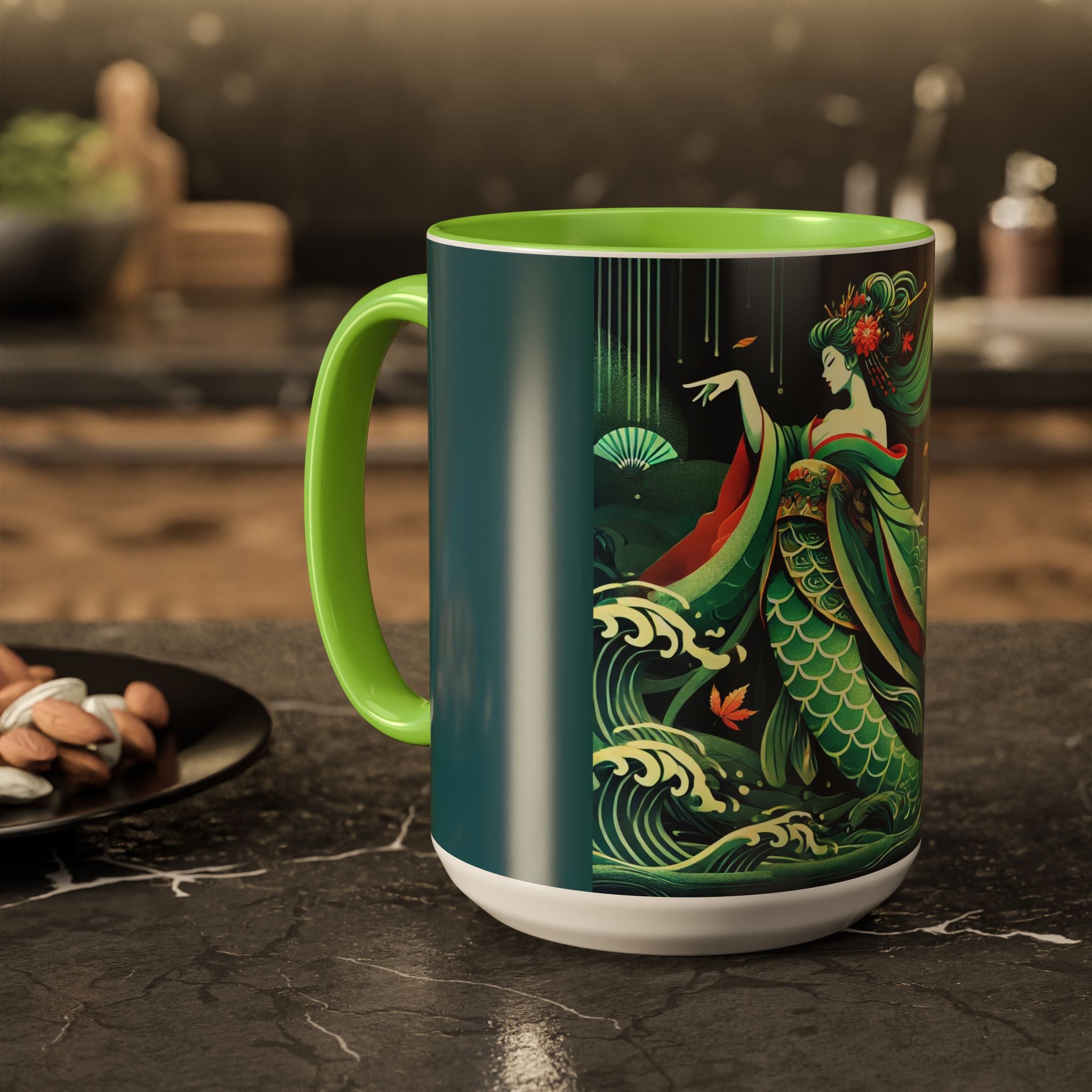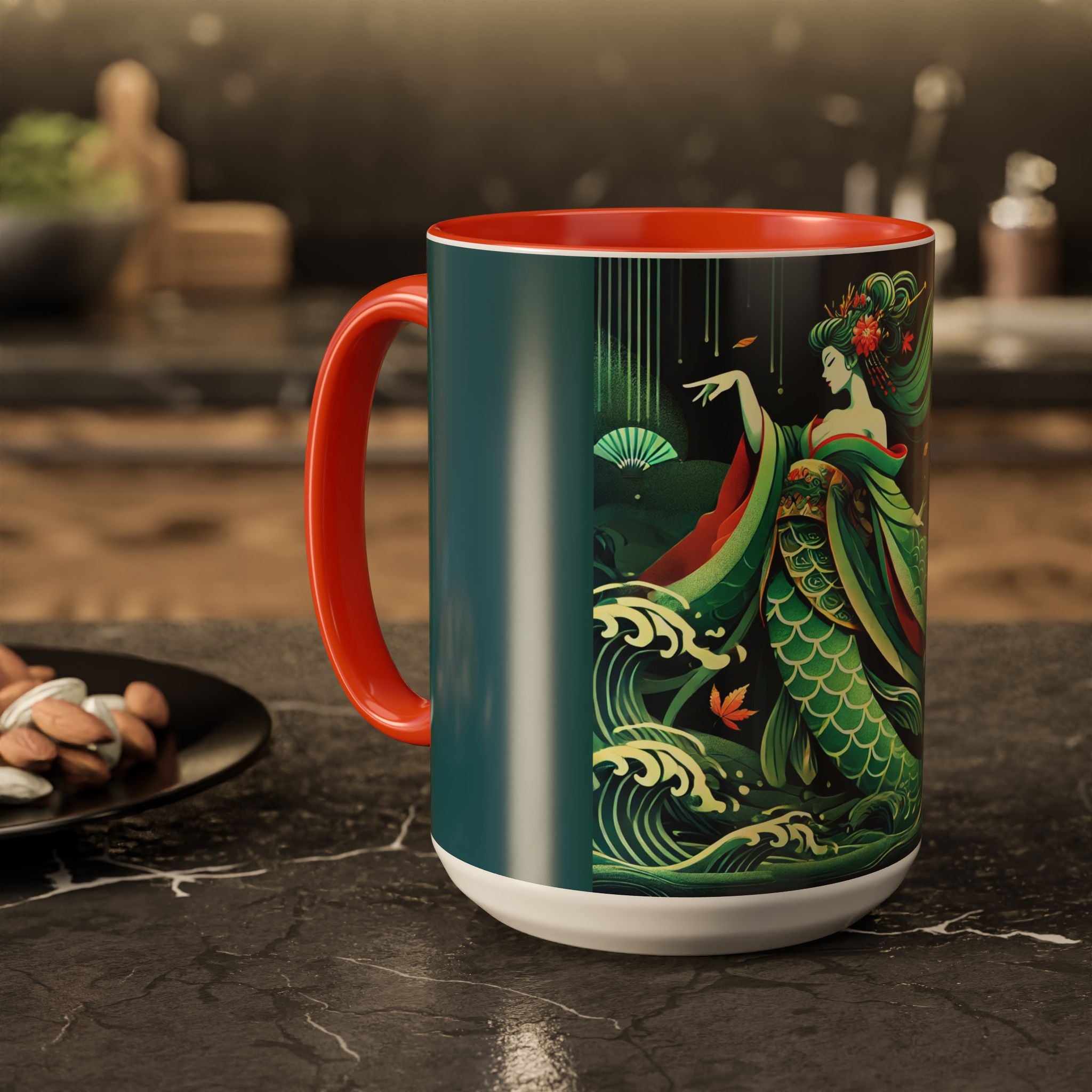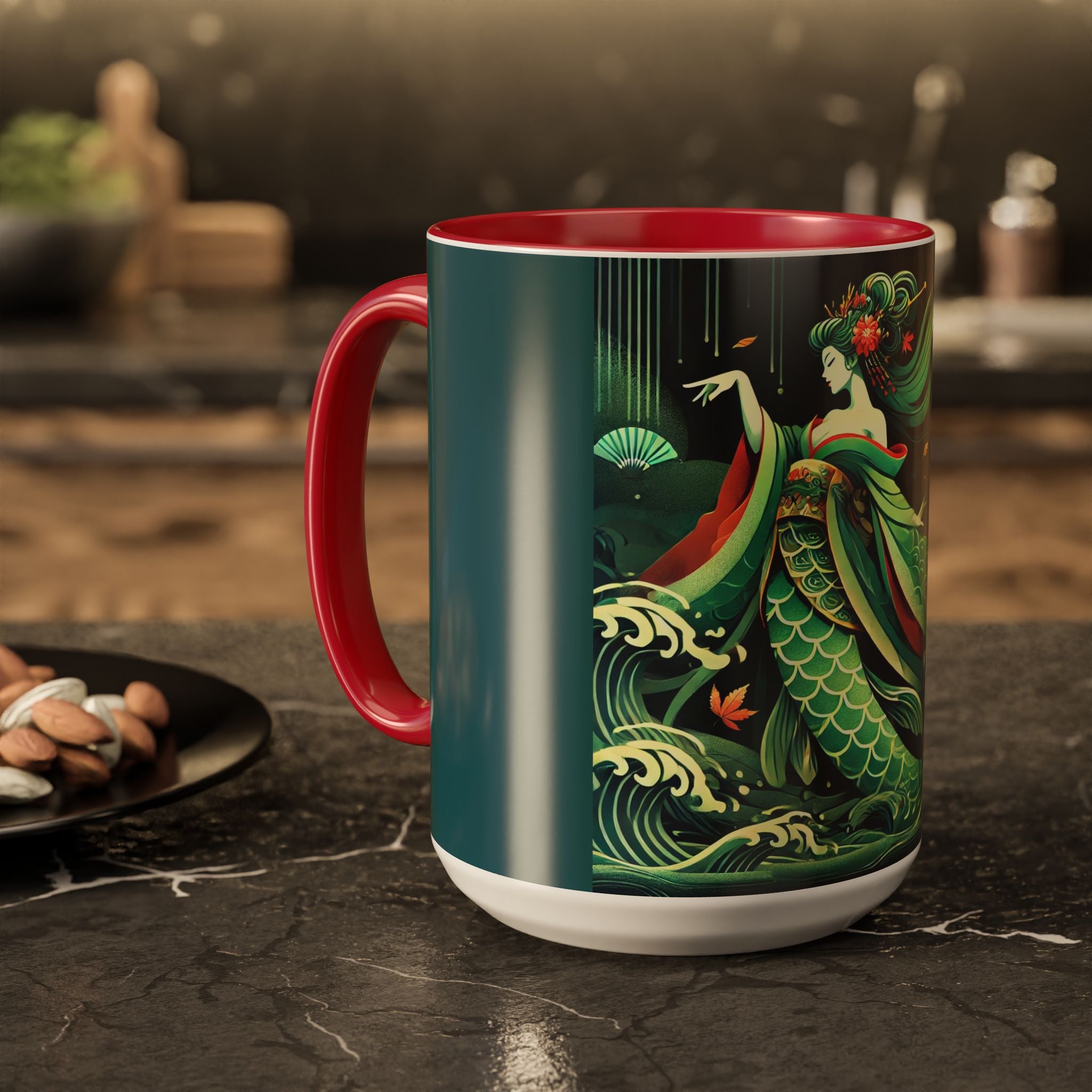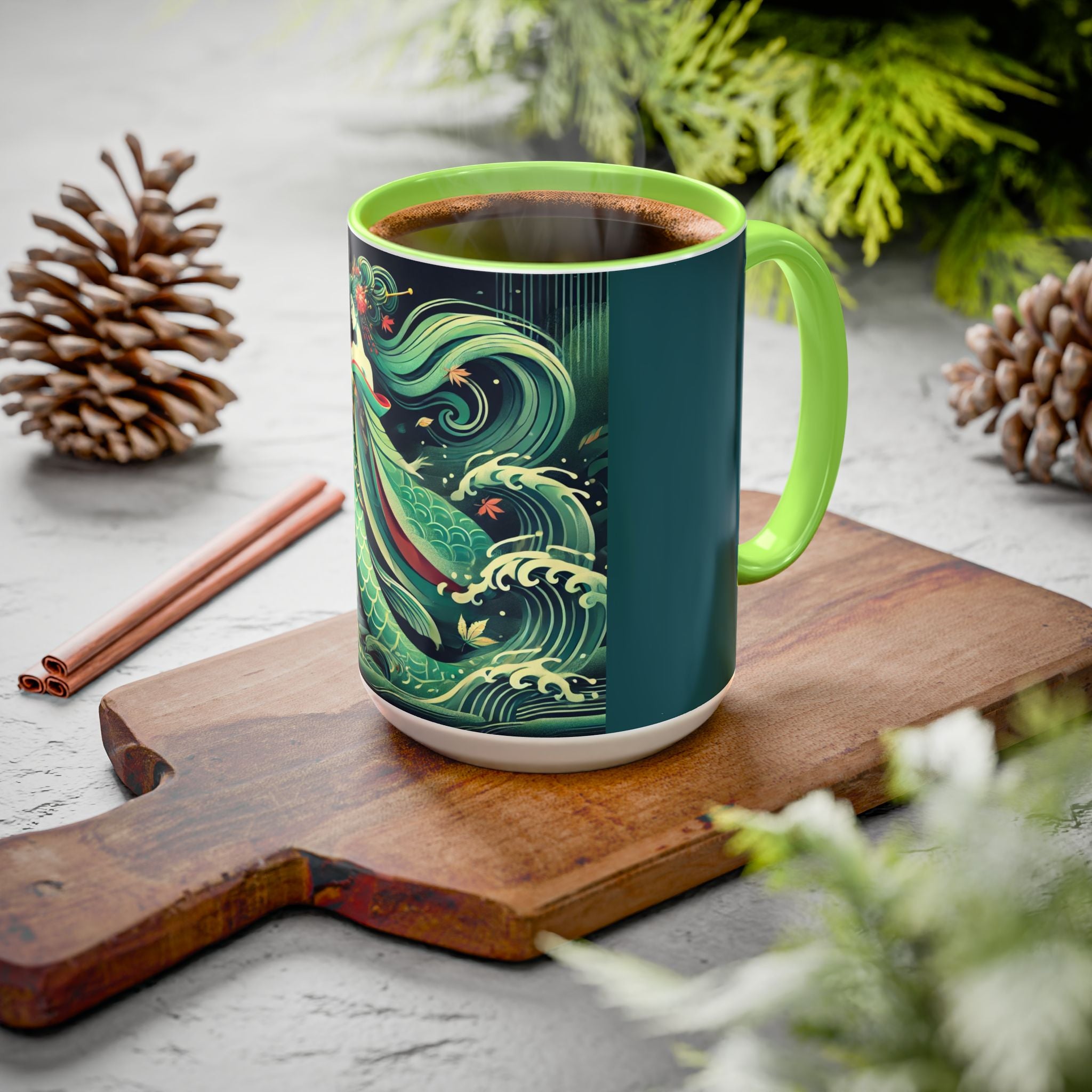 Mermaid Queen Rising from the Deep Colorful Mugs are everyday essentials that transform daily rituals into moments of artistry. Available in 11oz or 15oz sizes and offered in twelve striking color options, each mug features a glossy finish that enhances the vibrancy and detail of the artwork. With a colored handle and interior, these mugs bring personality and flair to every sip, making them instant favorites in any kitchen or office. The featured artwork captures a kabuki-inspired mermaid queen rising from deep green waters, her shimmering tail adorned with intricate patterns that glow with theatrical drama. Rendered in a bold flat style, the scene blends fantasy with Japanese theater influences, celebrating strength, grace, and imagination. Both lyrical and dramatic, this design turns a classic mug into a statement piece.
