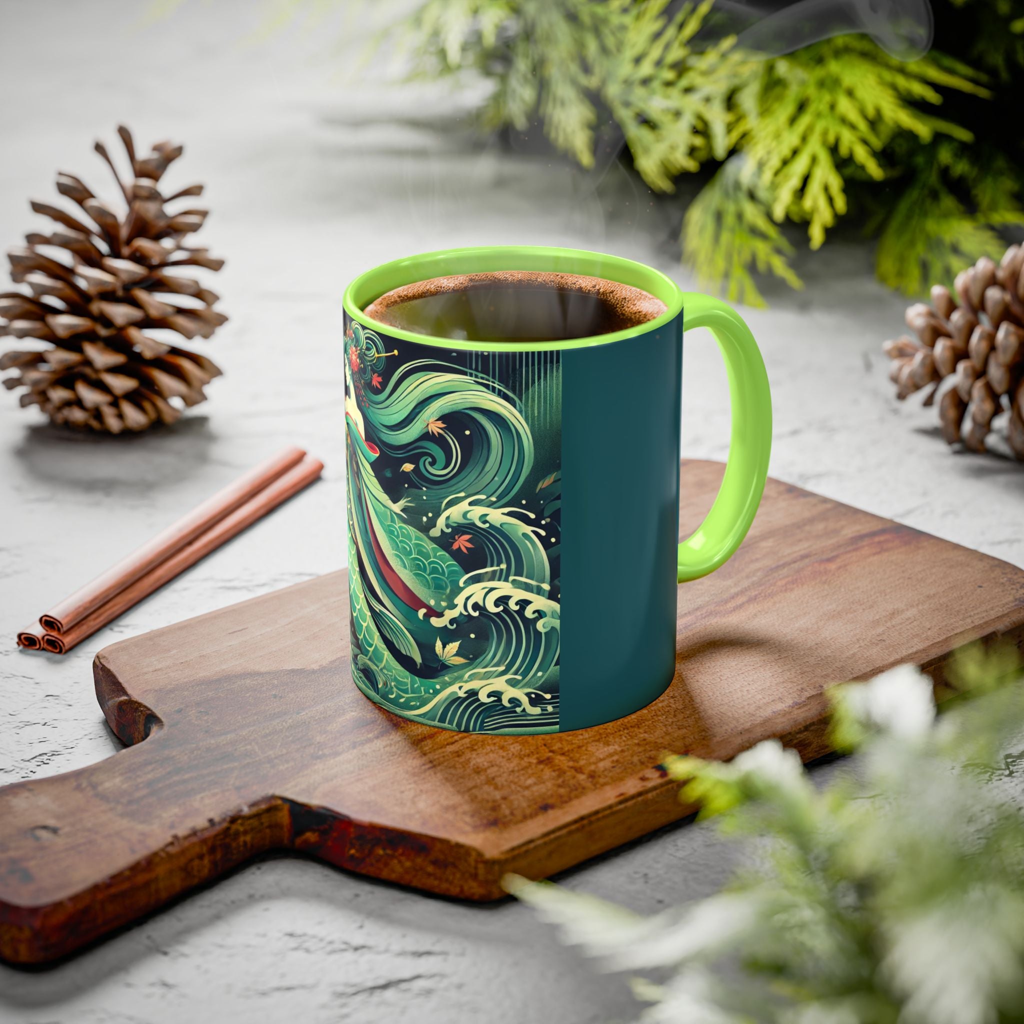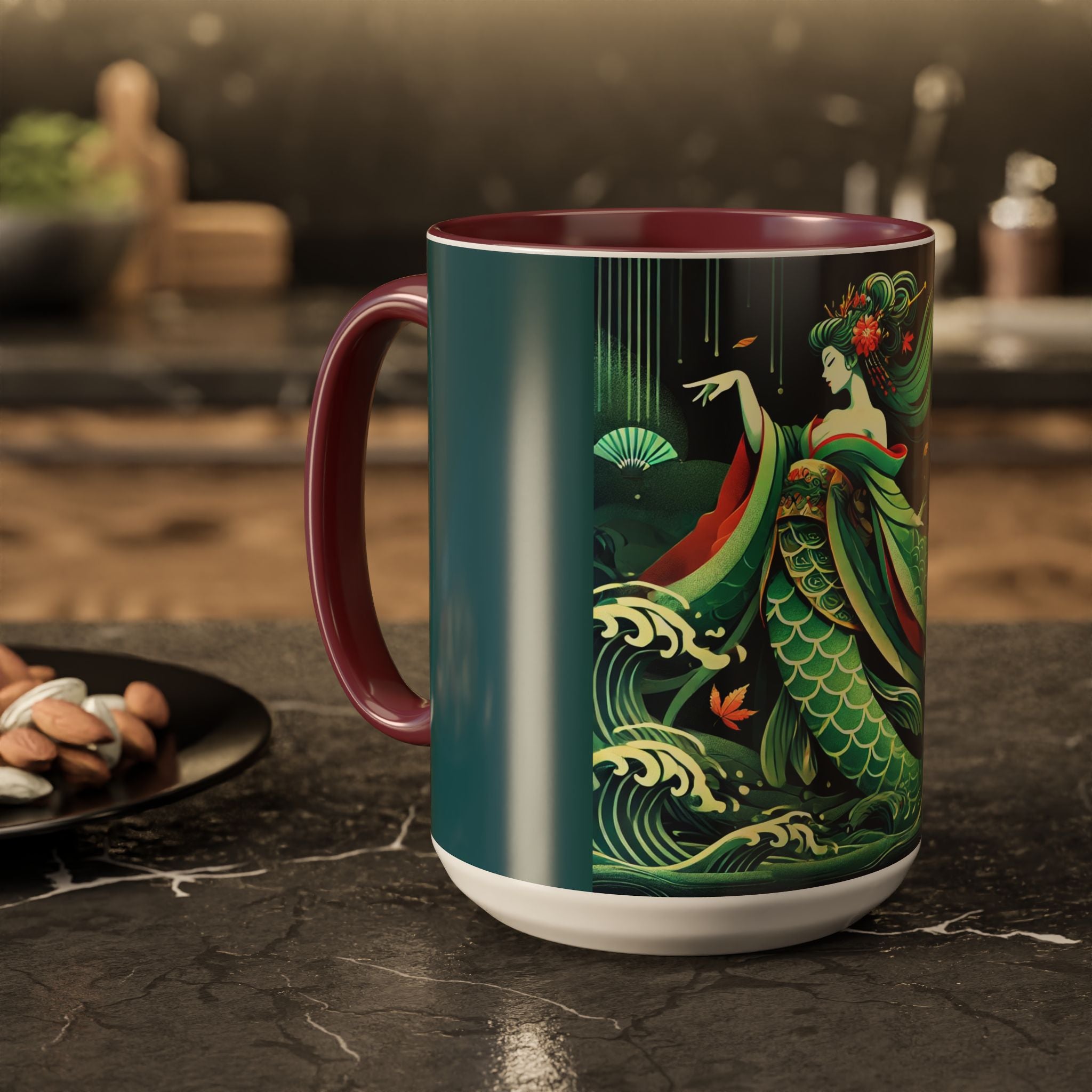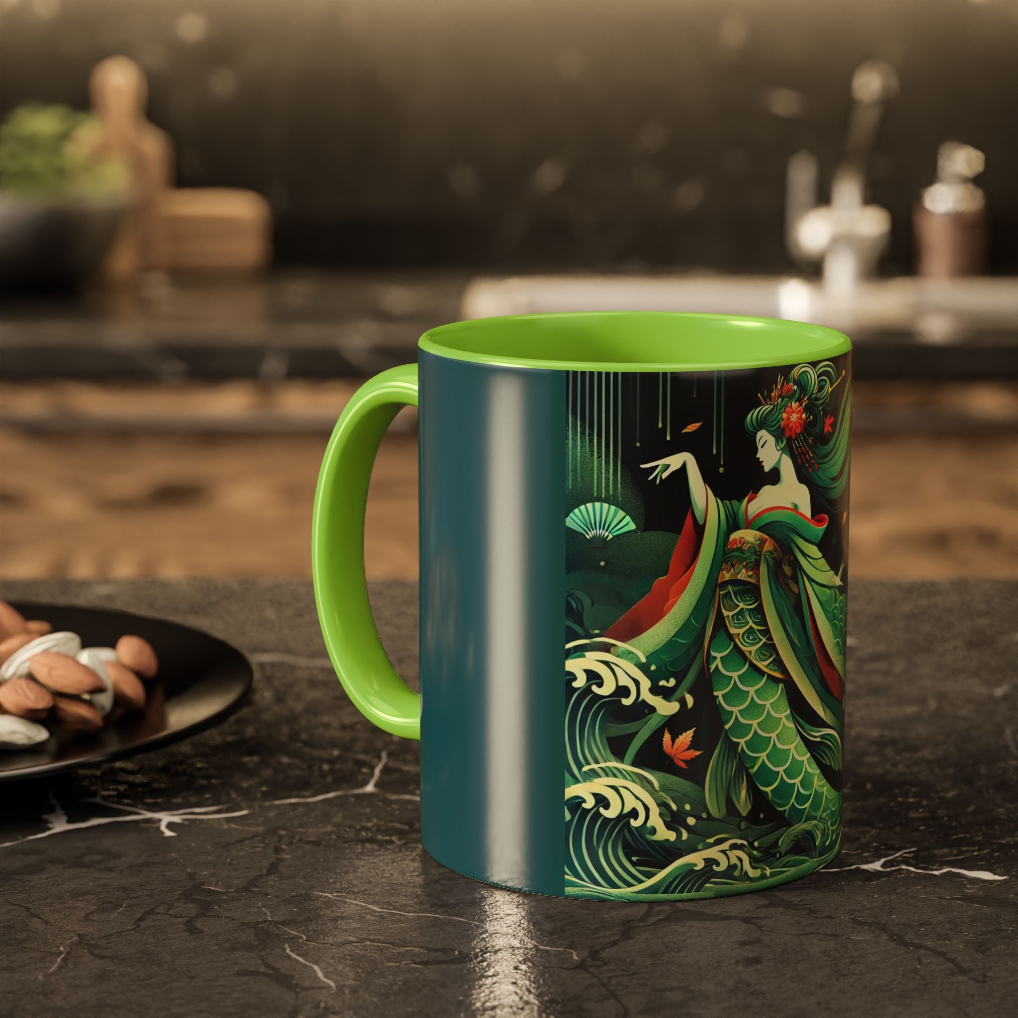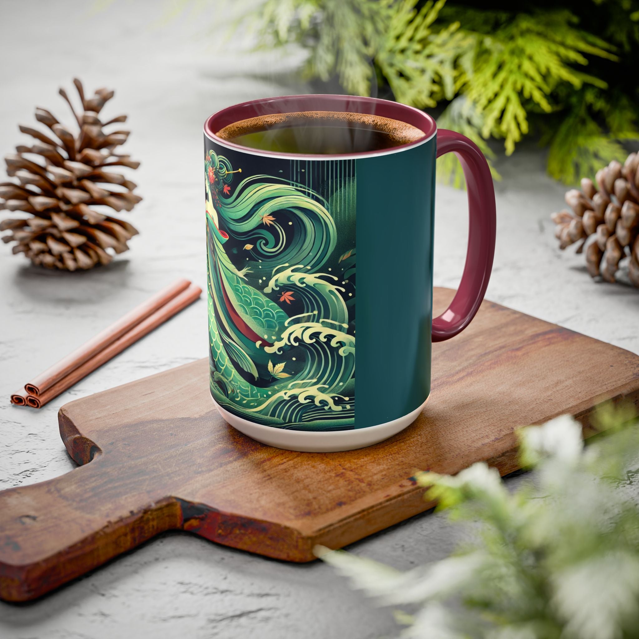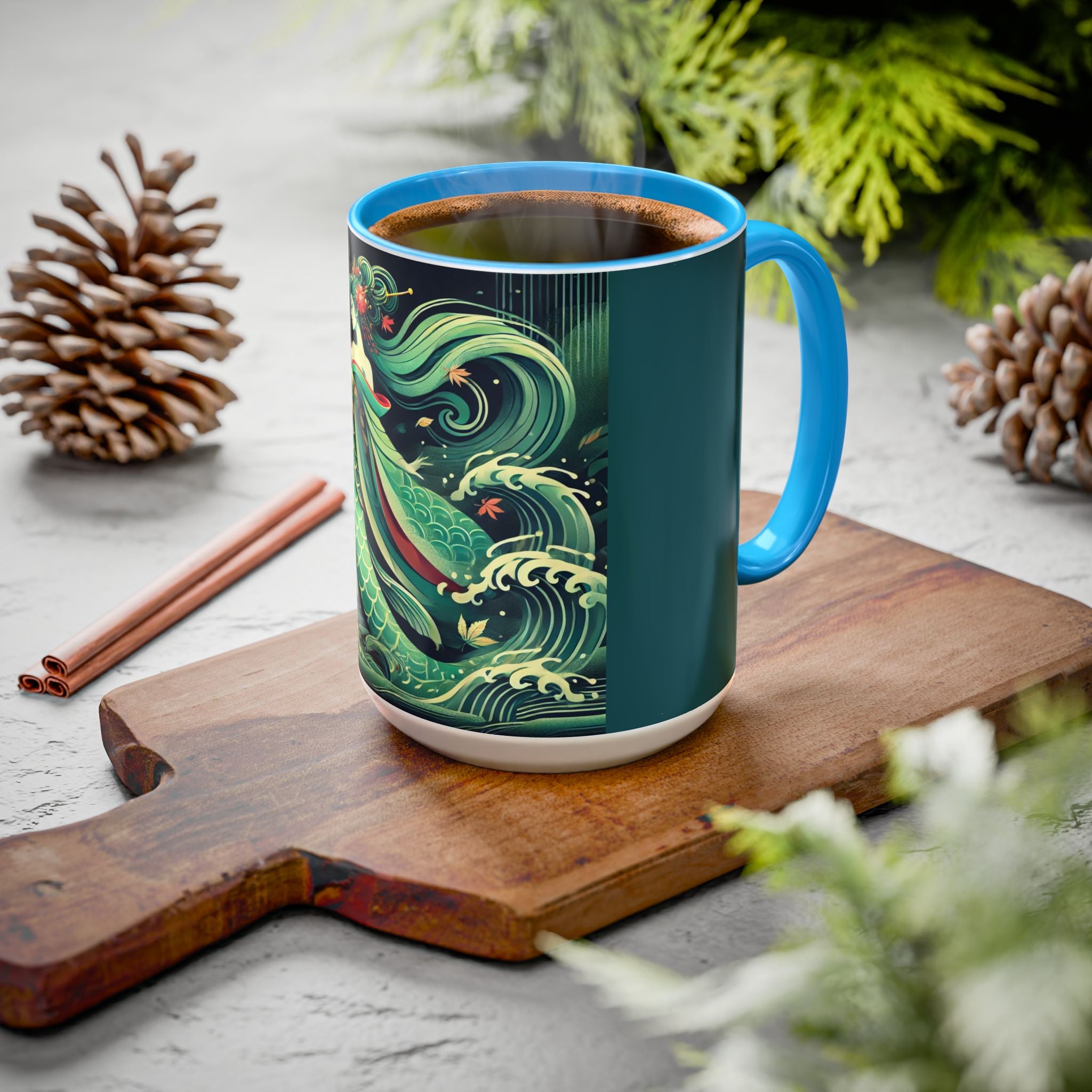 Mermaid Queen Rising from the Deep Colorful Mugs are everyday essentials that transform daily rituals into moments of artistry. Available in 11oz or 15oz sizes and offered in twelve striking color options, each mug features a glossy finish that enhances the vibrancy and detail of the artwork. With a colored handle and interior, these mugs bring personality and flair to every sip, making them instant favorites in any kitchen or office. The featured artwork captures a kabuki-inspired mermaid queen rising from deep green waters, her shimmering tail adorned with intricate patterns that glow with theatrical drama. Rendered in a bold flat style, the scene blends fantasy with Japanese theater influences, celebrating strength, grace, and imagination. Both lyrical and dramatic, this design turns a classic mug into a statement piece.