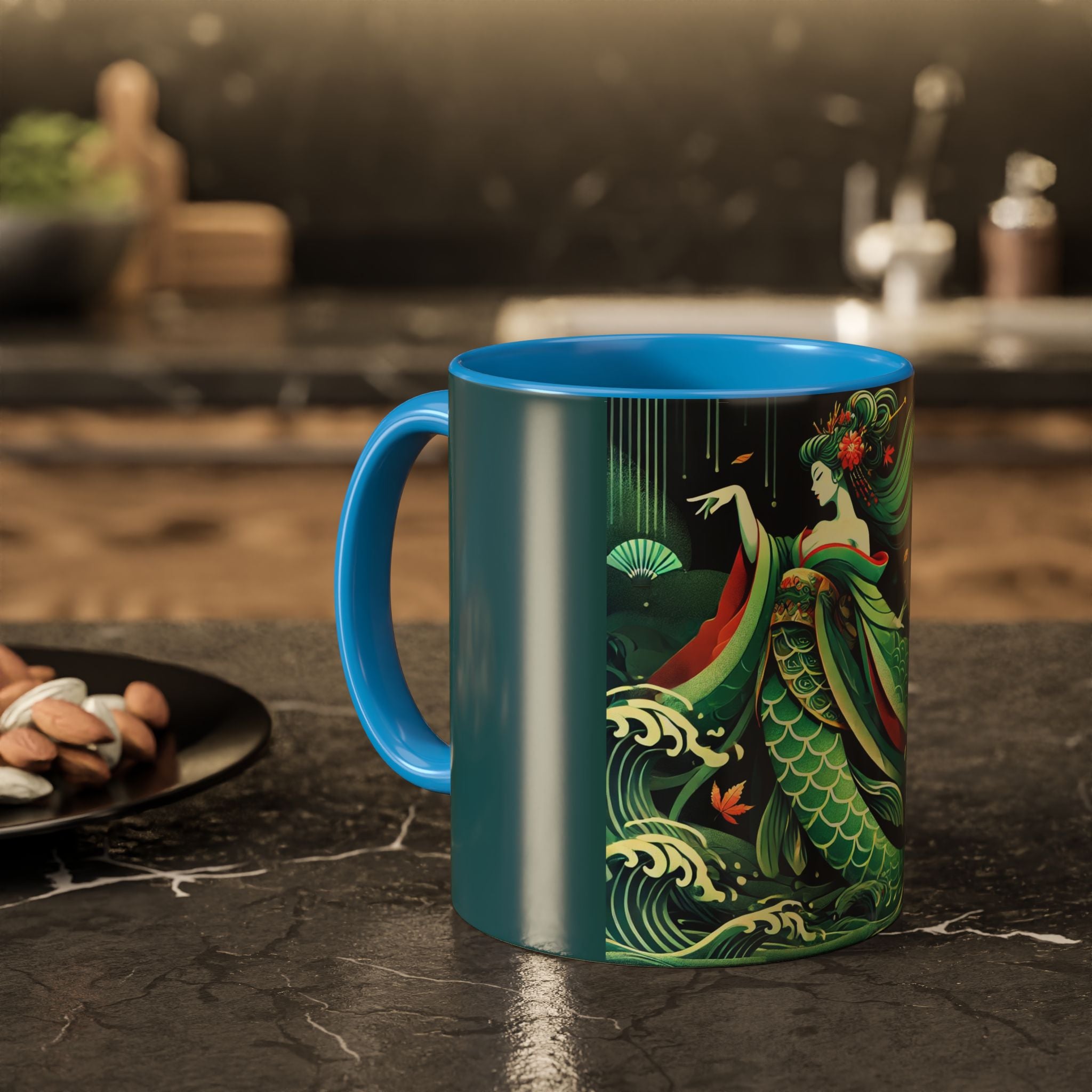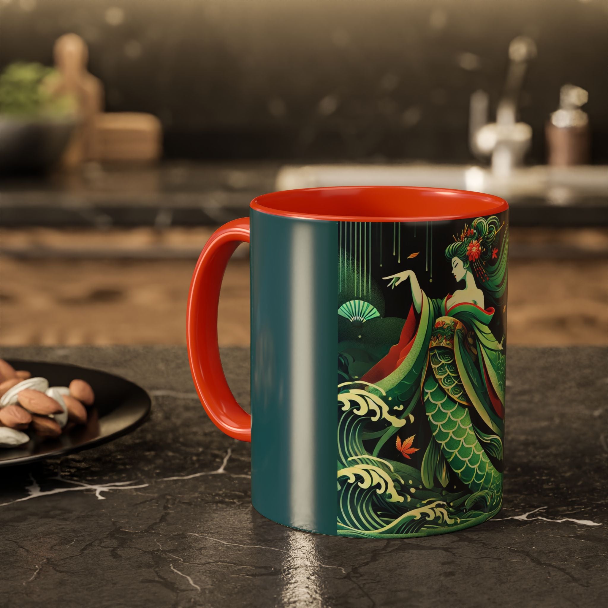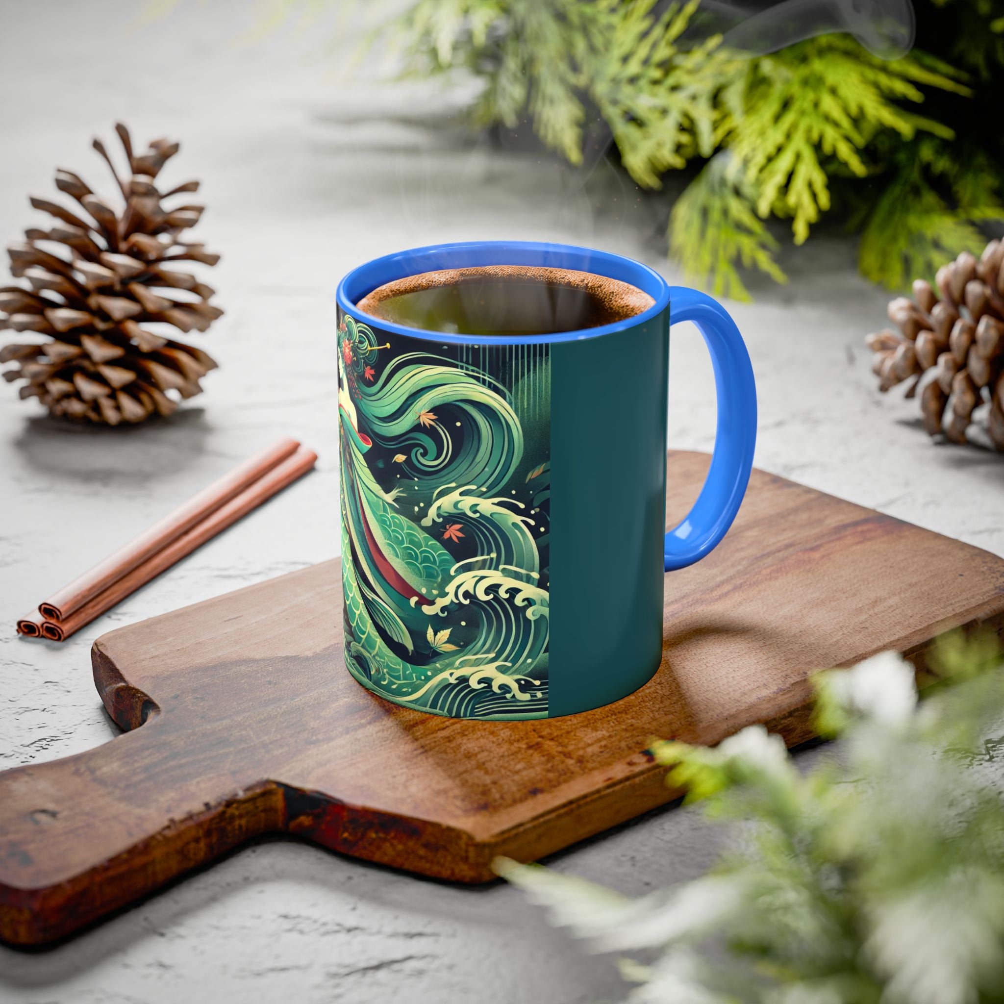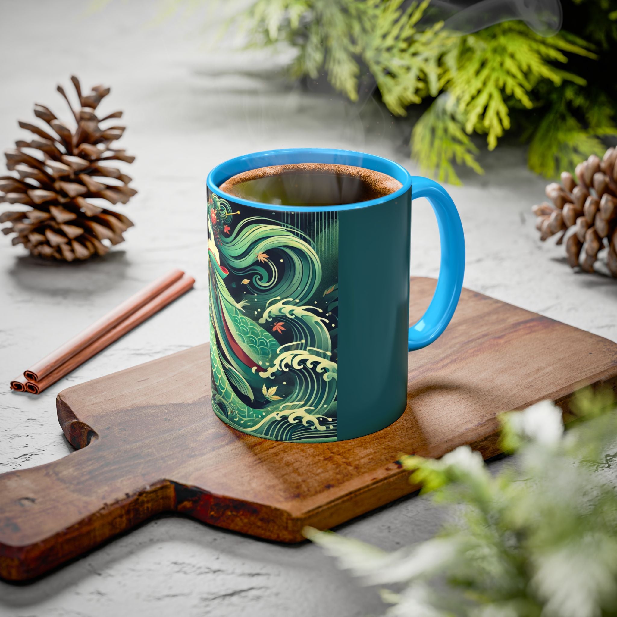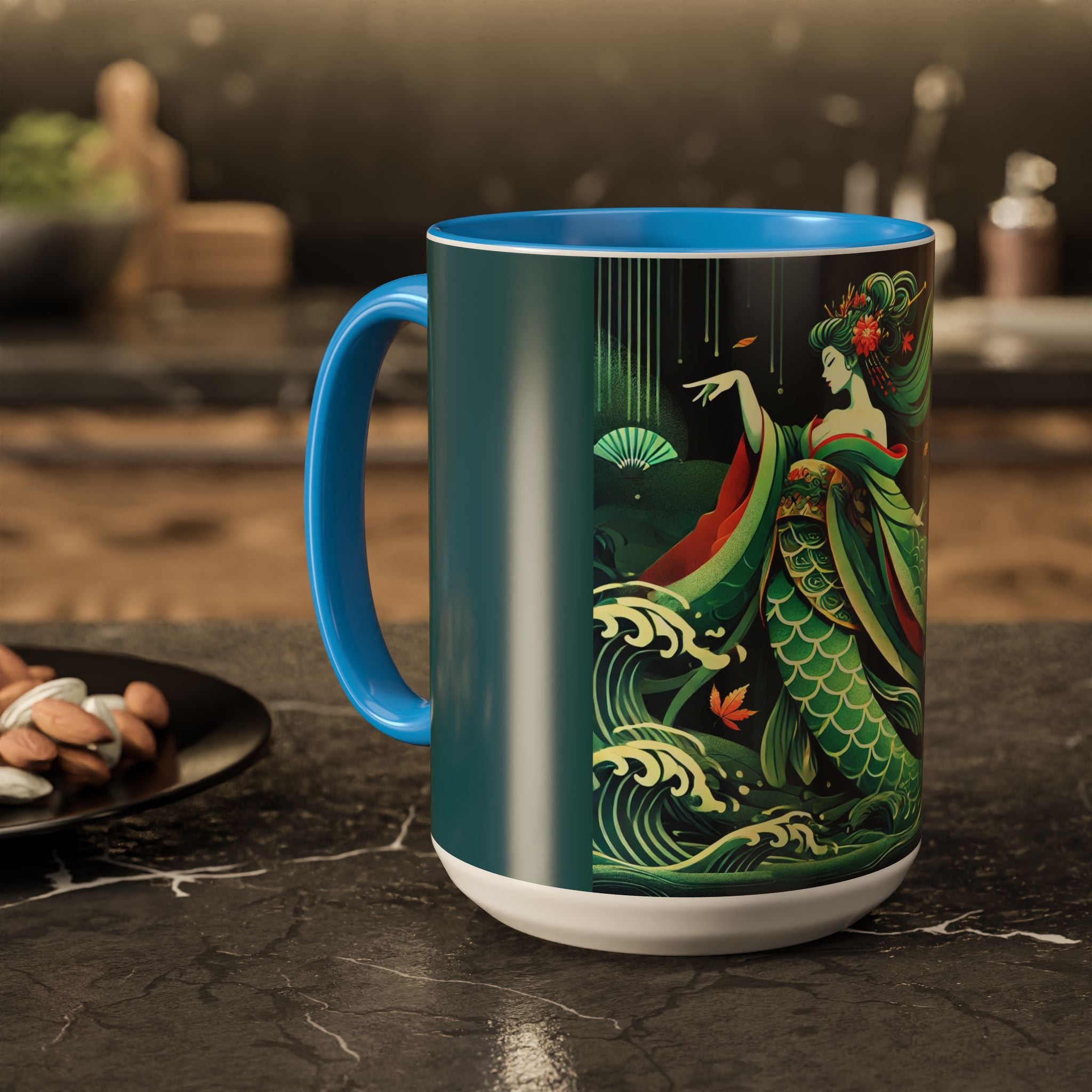 Mermaid Queen Rising from the Deep Colorful Mugs are everyday essentials that transform daily rituals into moments of artistry. Available in 11oz or 15oz sizes and offered in twelve striking color options, each mug features a glossy finish that enhances the vibrancy and detail of the artwork. With a colored handle and interior, these mugs bring personality and flair to every sip, making them instant favorites in any kitchen or office. The featured artwork captures a kabuki-inspired mermaid queen rising from deep green waters, her shimmering tail adorned with intricate patterns that glow with theatrical drama. Rendered in a bold flat style, the scene blends fantasy with Japanese theater influences, celebrating strength, grace, and imagination. Both lyrical and dramatic, this design turns a classic mug into a statement piece.