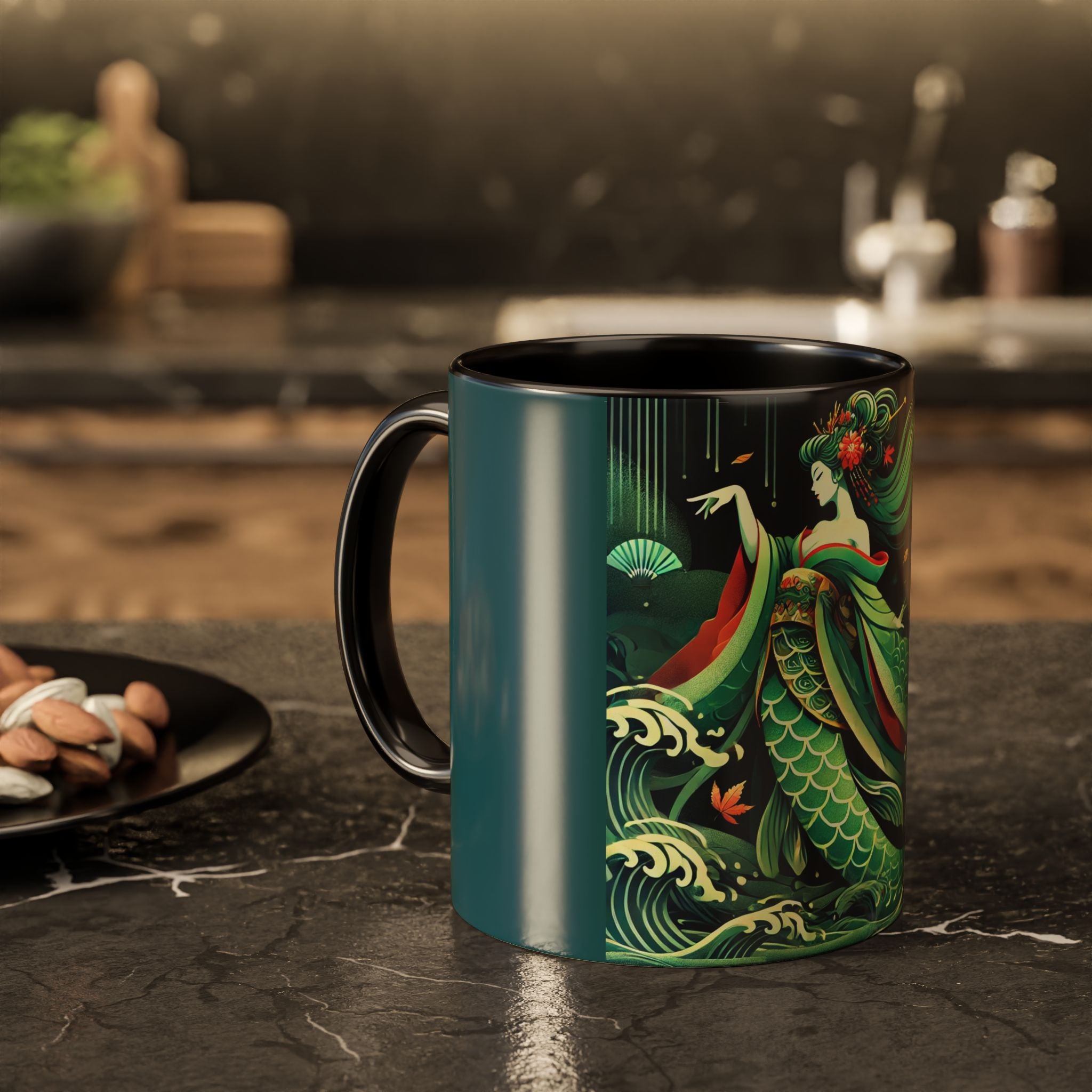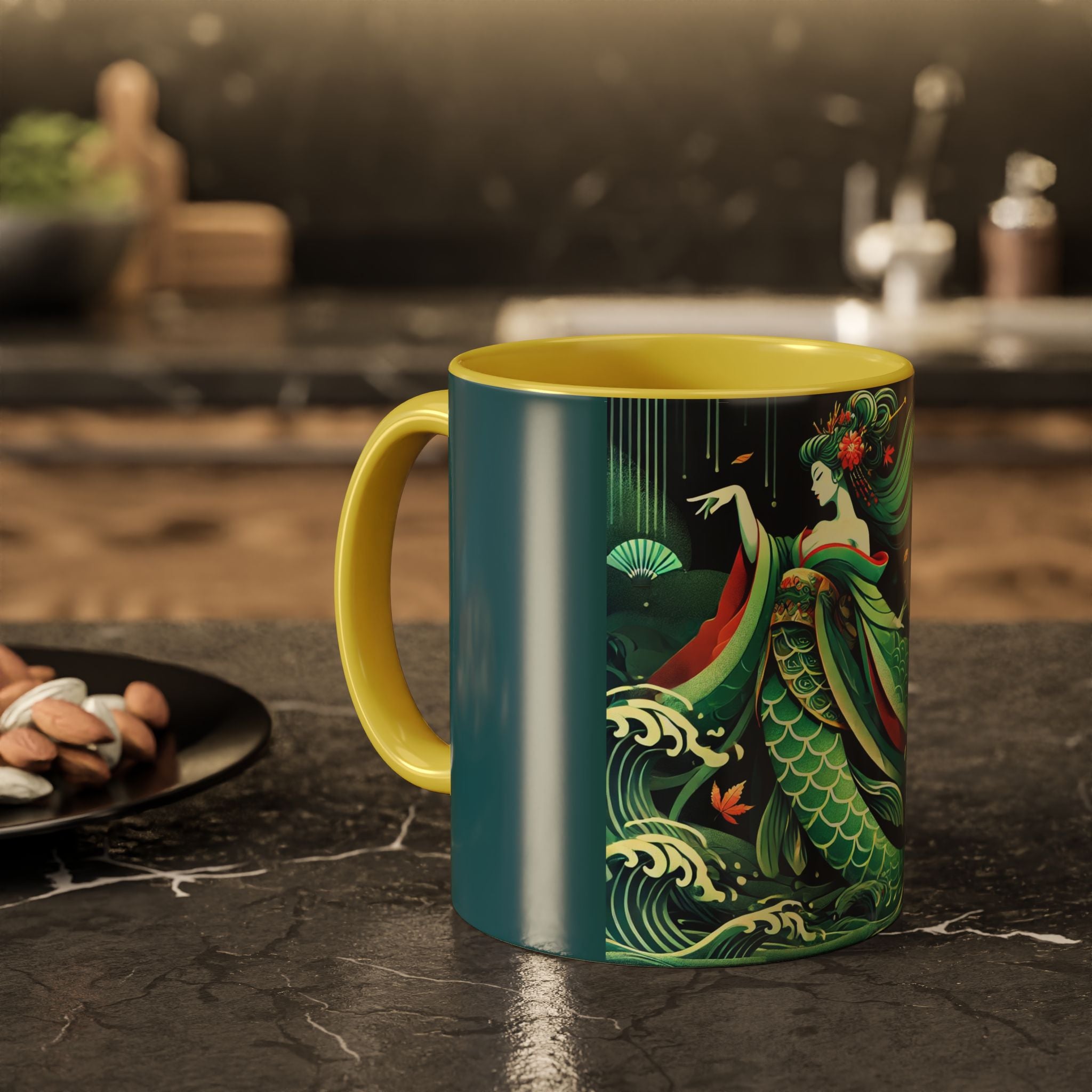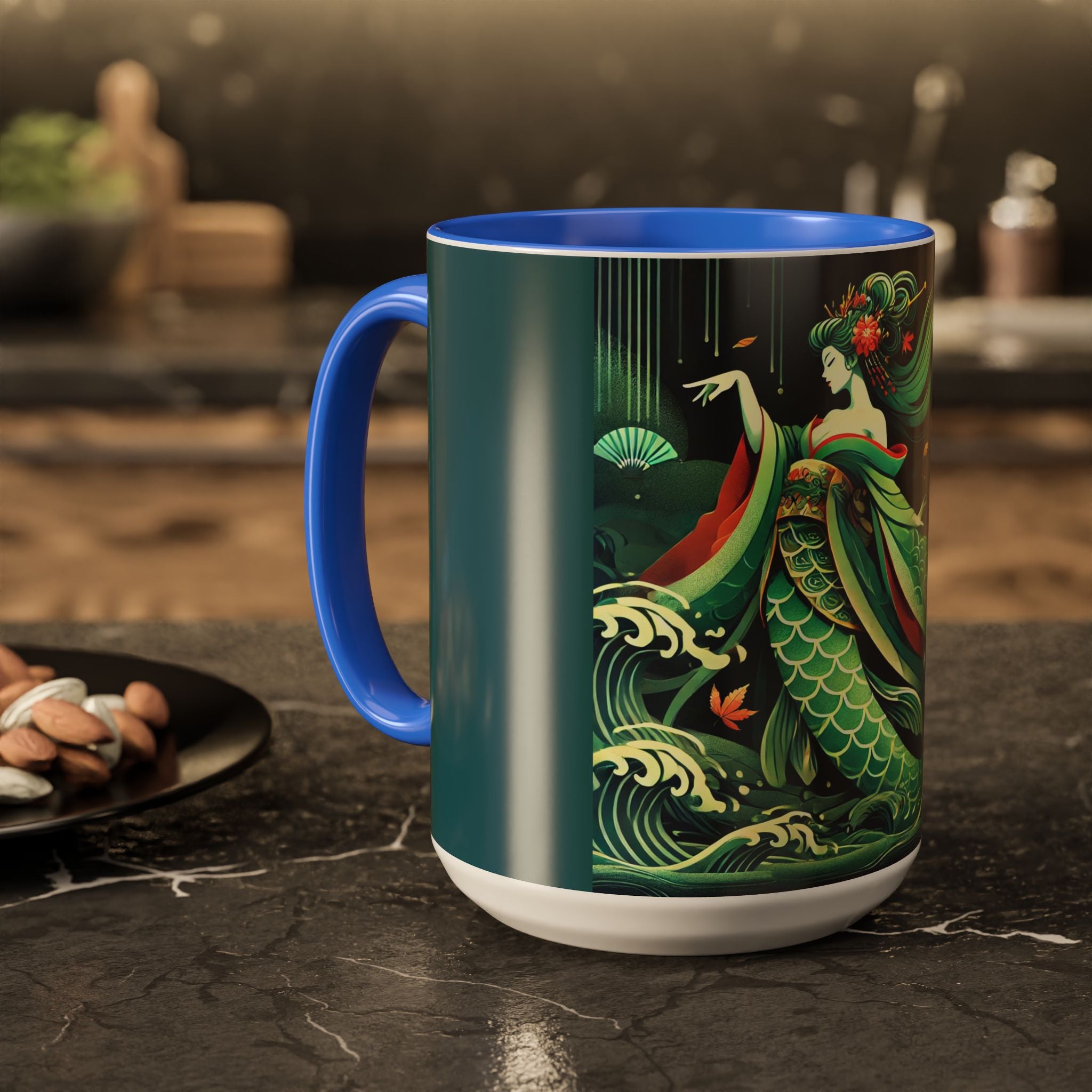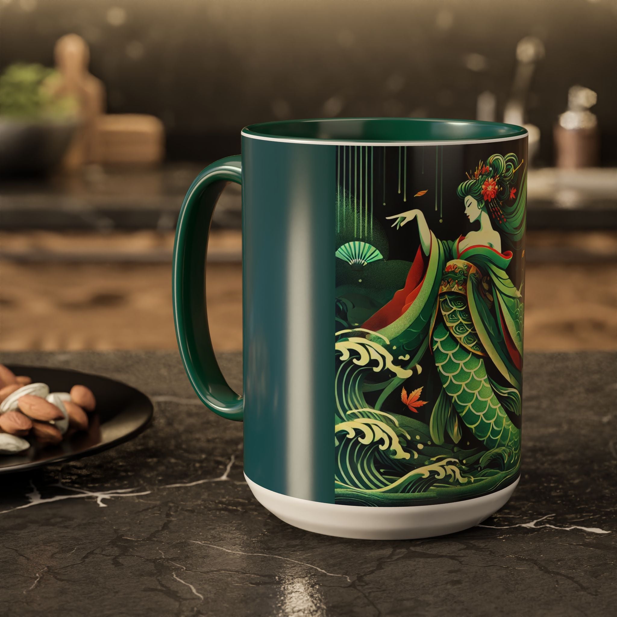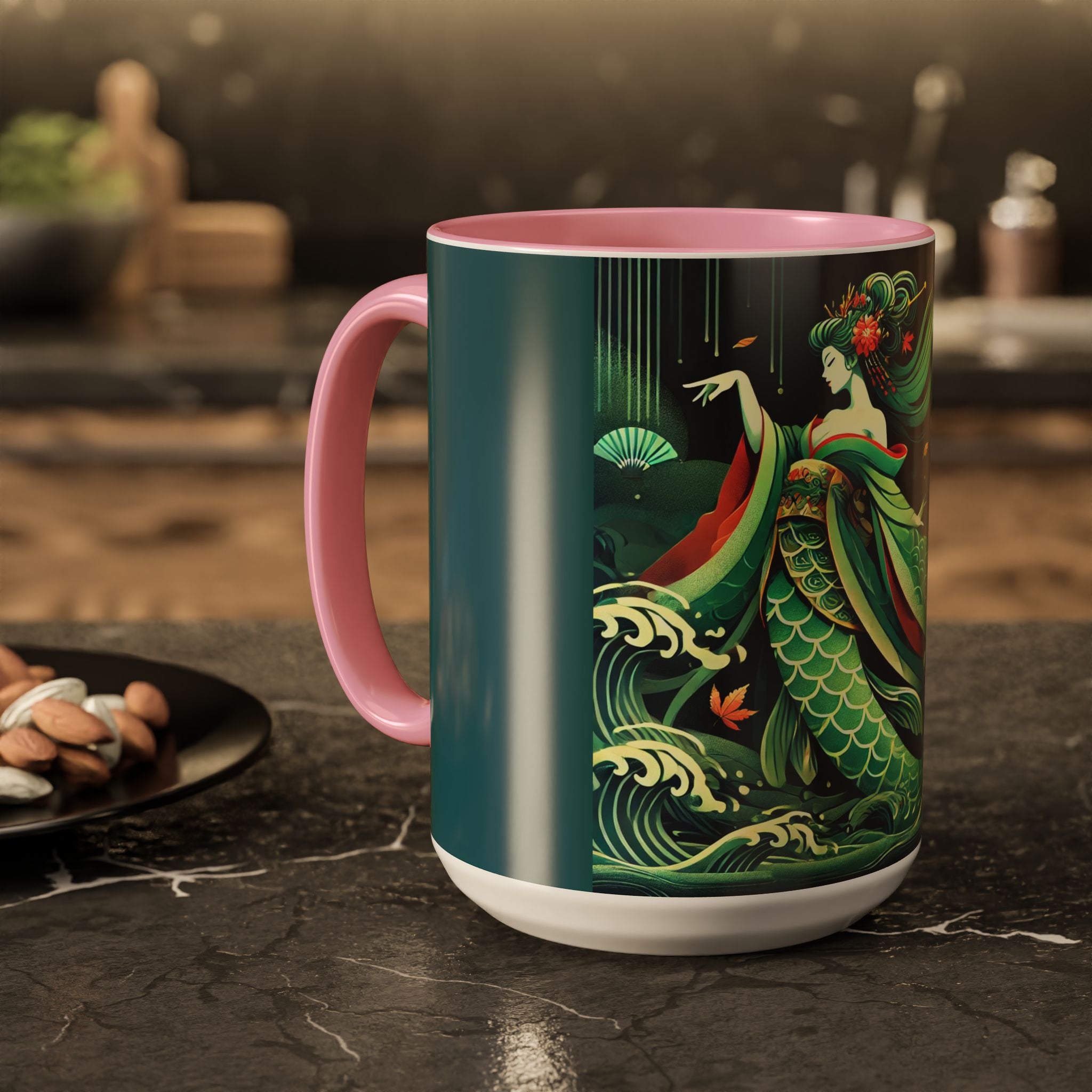 Mermaid Queen Rising from the Deep Colorful Mugs are everyday essentials that transform daily rituals into moments of artistry. Available in 11oz or 15oz sizes and offered in twelve striking color options, each mug features a glossy finish that enhances the vibrancy and detail of the artwork. With a colored handle and interior, these mugs bring personality and flair to every sip, making them instant favorites in any kitchen or office. The featured artwork captures a kabuki-inspired mermaid queen rising from deep green waters, her shimmering tail adorned with intricate patterns that glow with theatrical drama. Rendered in a bold flat style, the scene blends fantasy with Japanese theater influences, celebrating strength, grace, and imagination. Both lyrical and dramatic, this design turns a classic mug into a statement piece.