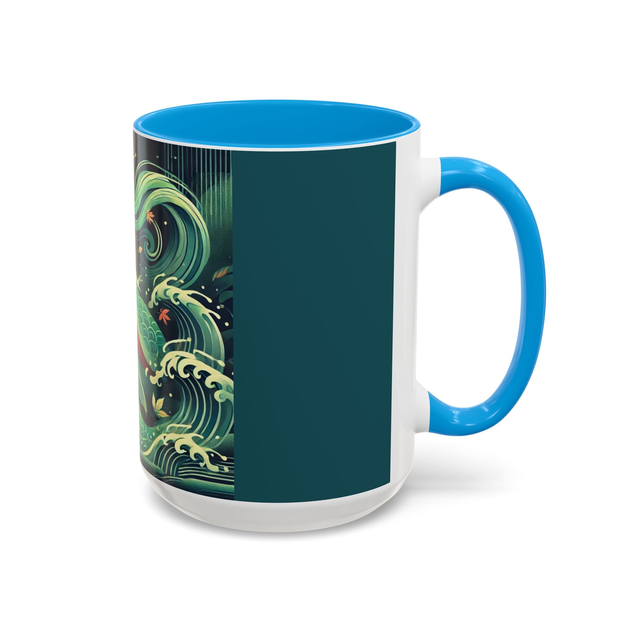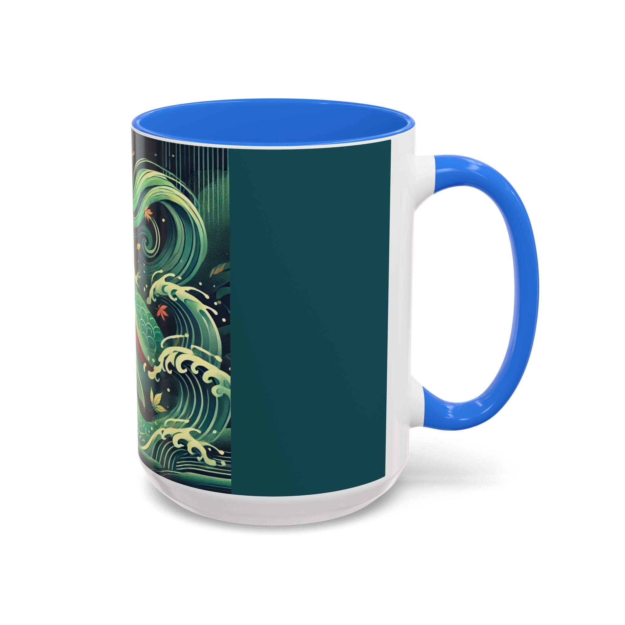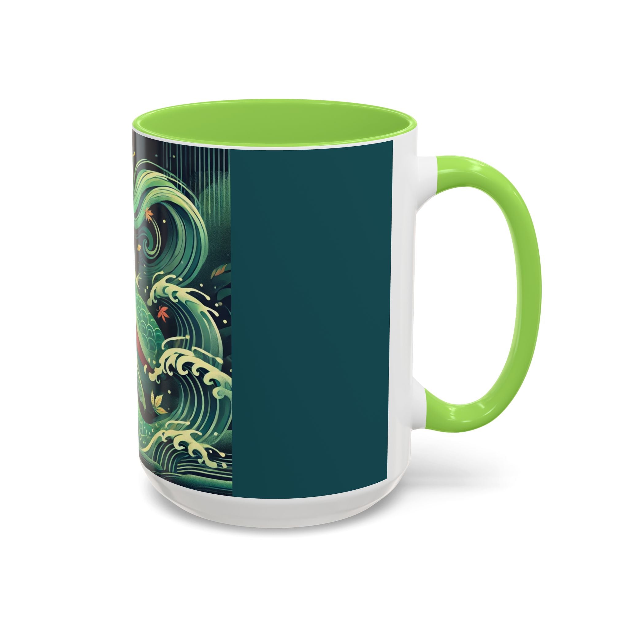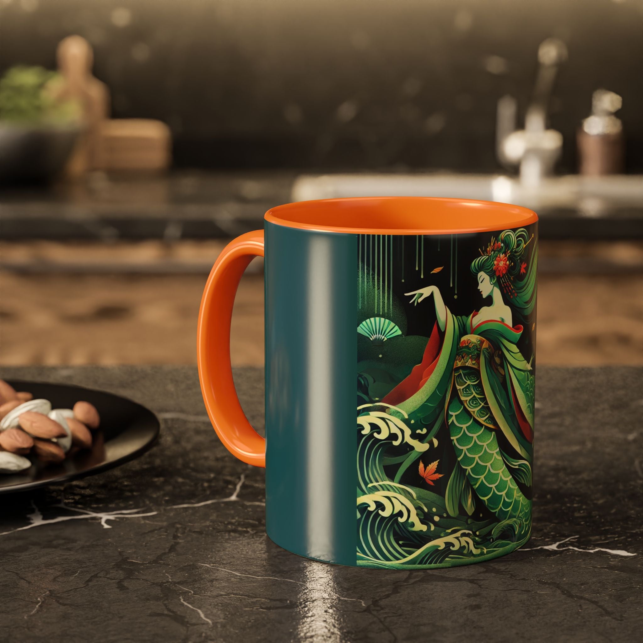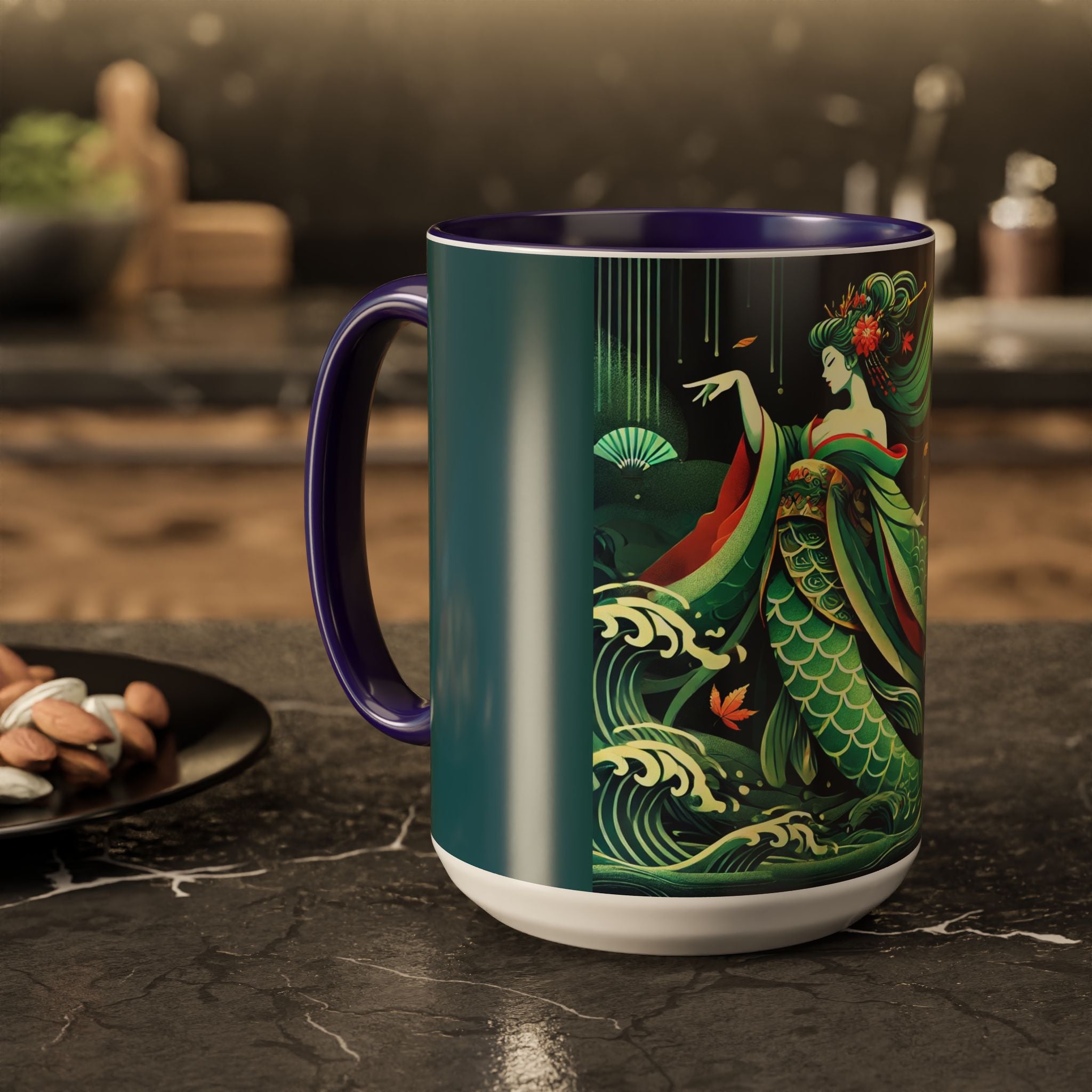 Mermaid Queen Rising from the Deep Colorful Mugs are everyday essentials that transform daily rituals into moments of artistry. Available in 11oz or 15oz sizes and offered in twelve striking color options, each mug features a glossy finish that enhances the vibrancy and detail of the artwork. With a colored handle and interior, these mugs bring personality and flair to every sip, making them instant favorites in any kitchen or office. The featured artwork captures a kabuki-inspired mermaid queen rising from deep green waters, her shimmering tail adorned with intricate patterns that glow with theatrical drama. Rendered in a bold flat style, the scene blends fantasy with Japanese theater influences, celebrating strength, grace, and imagination. Both lyrical and dramatic, this design turns a classic mug into a statement piece.