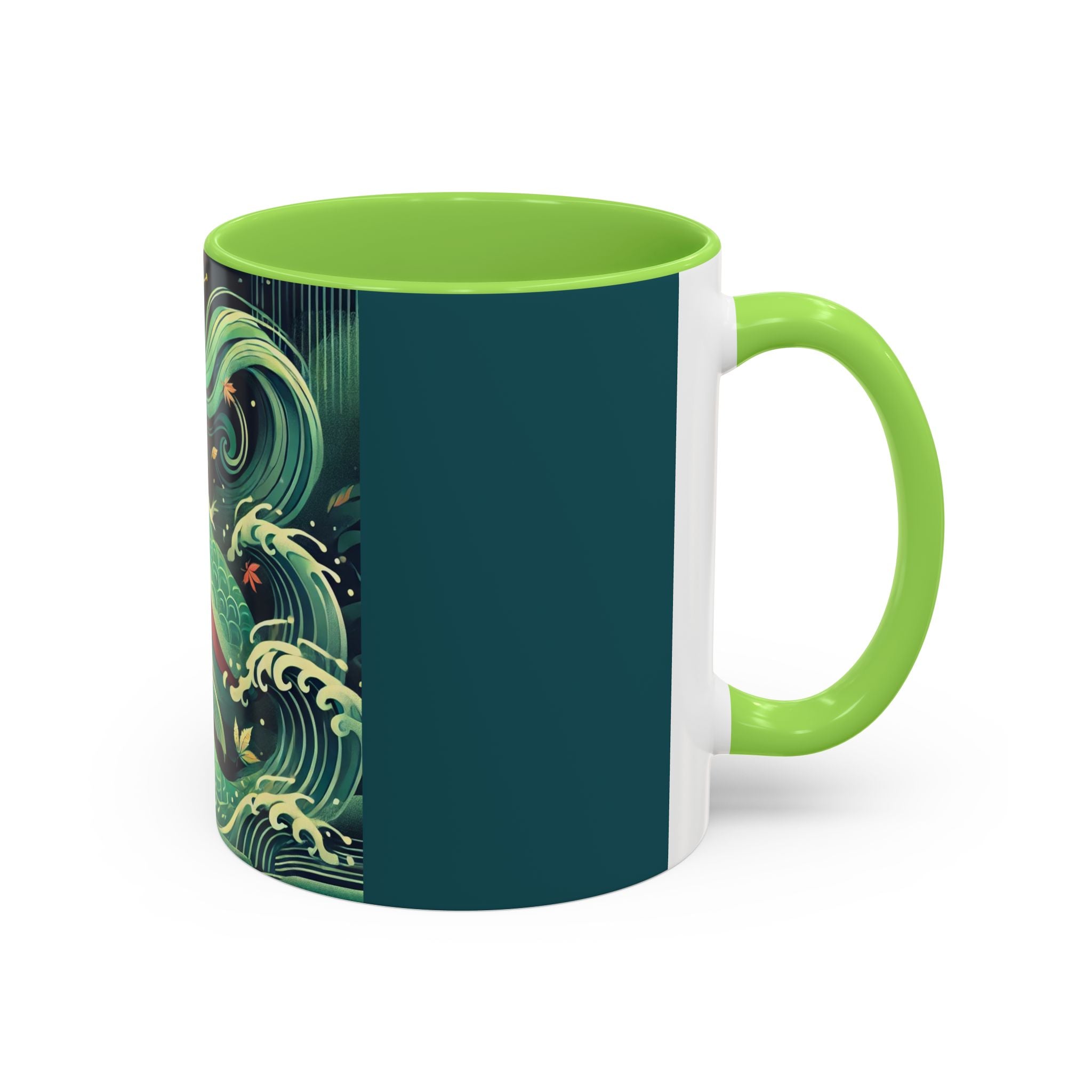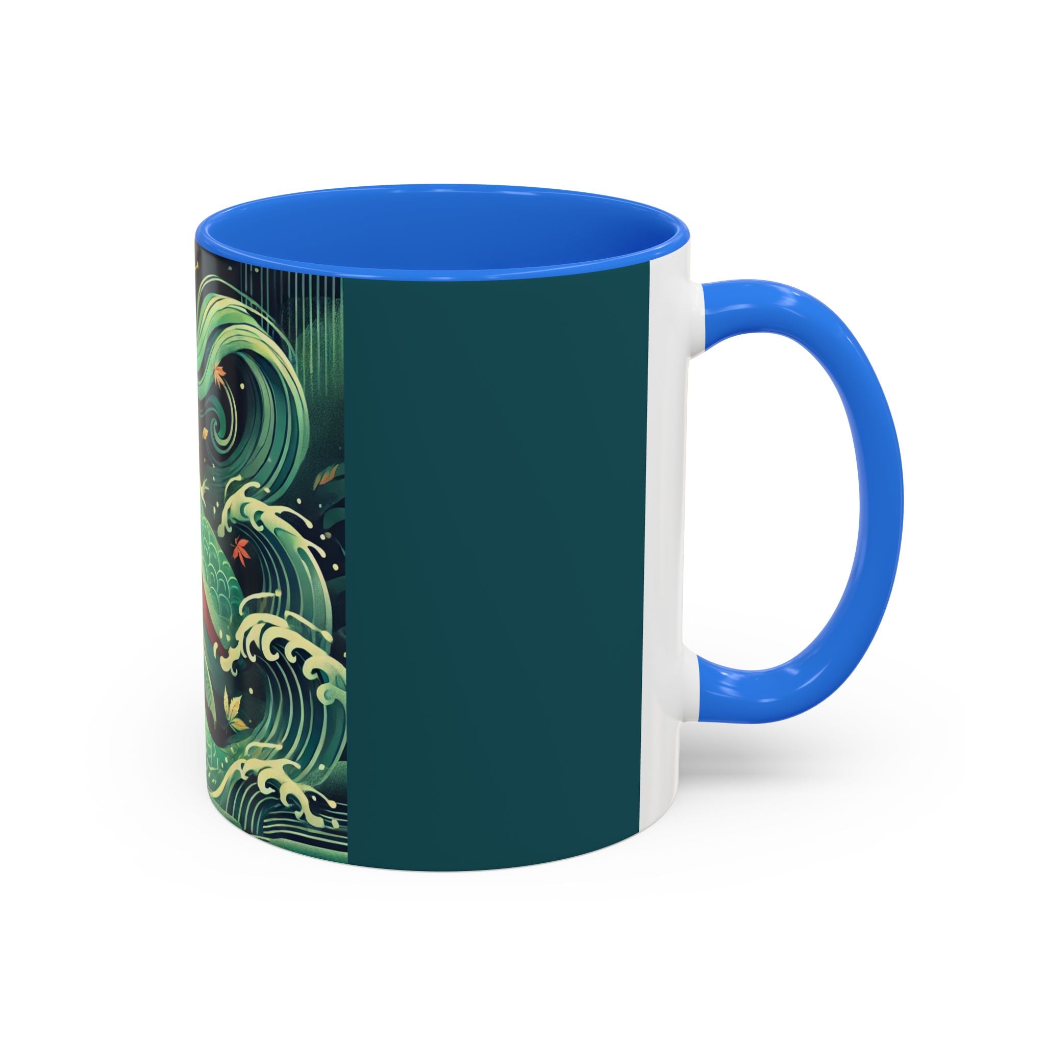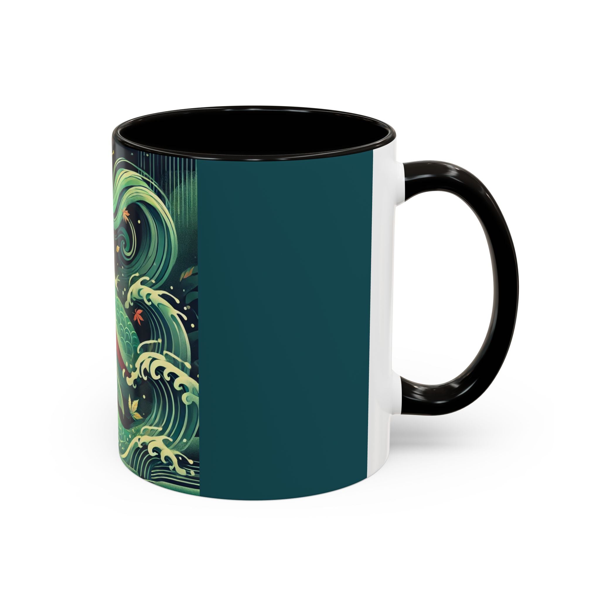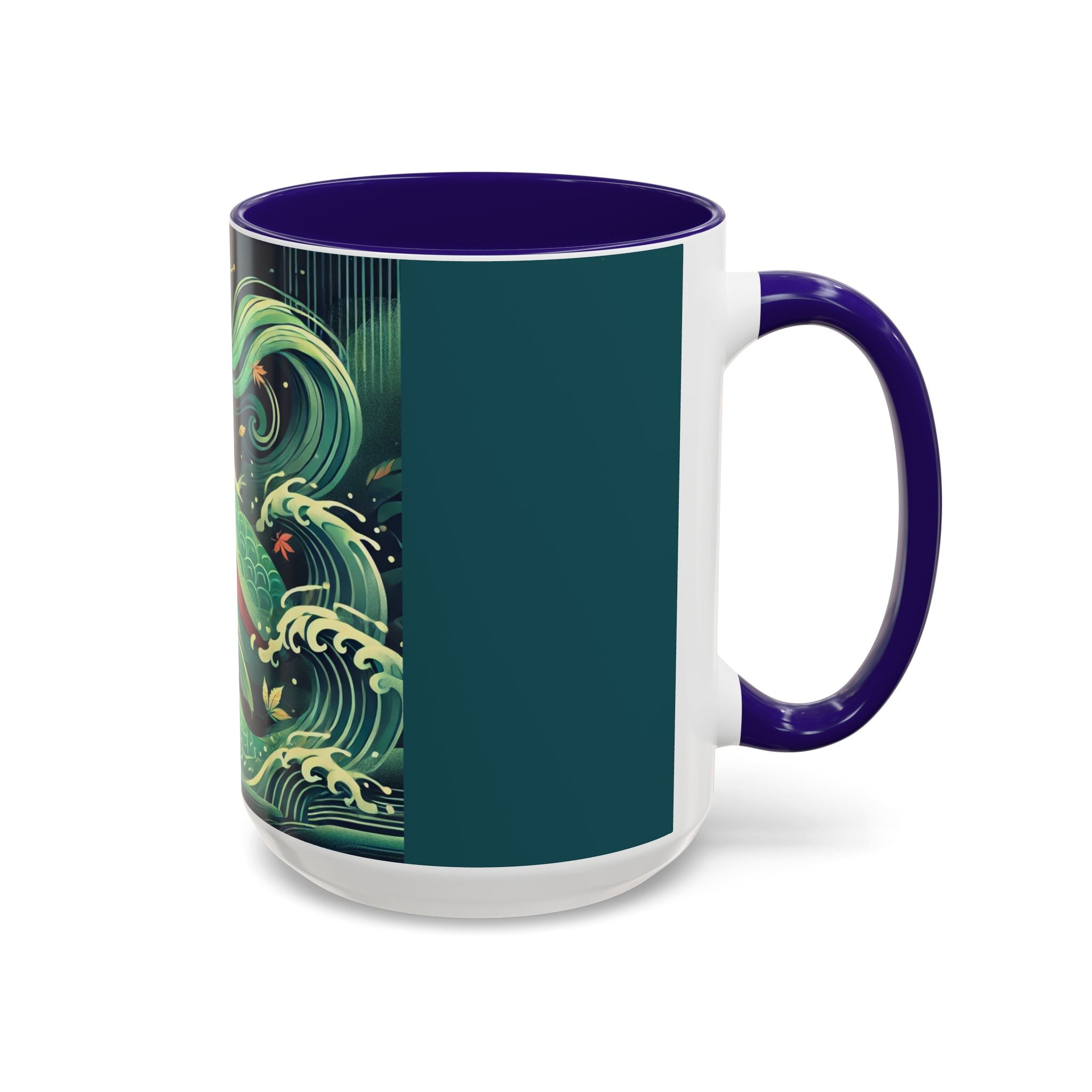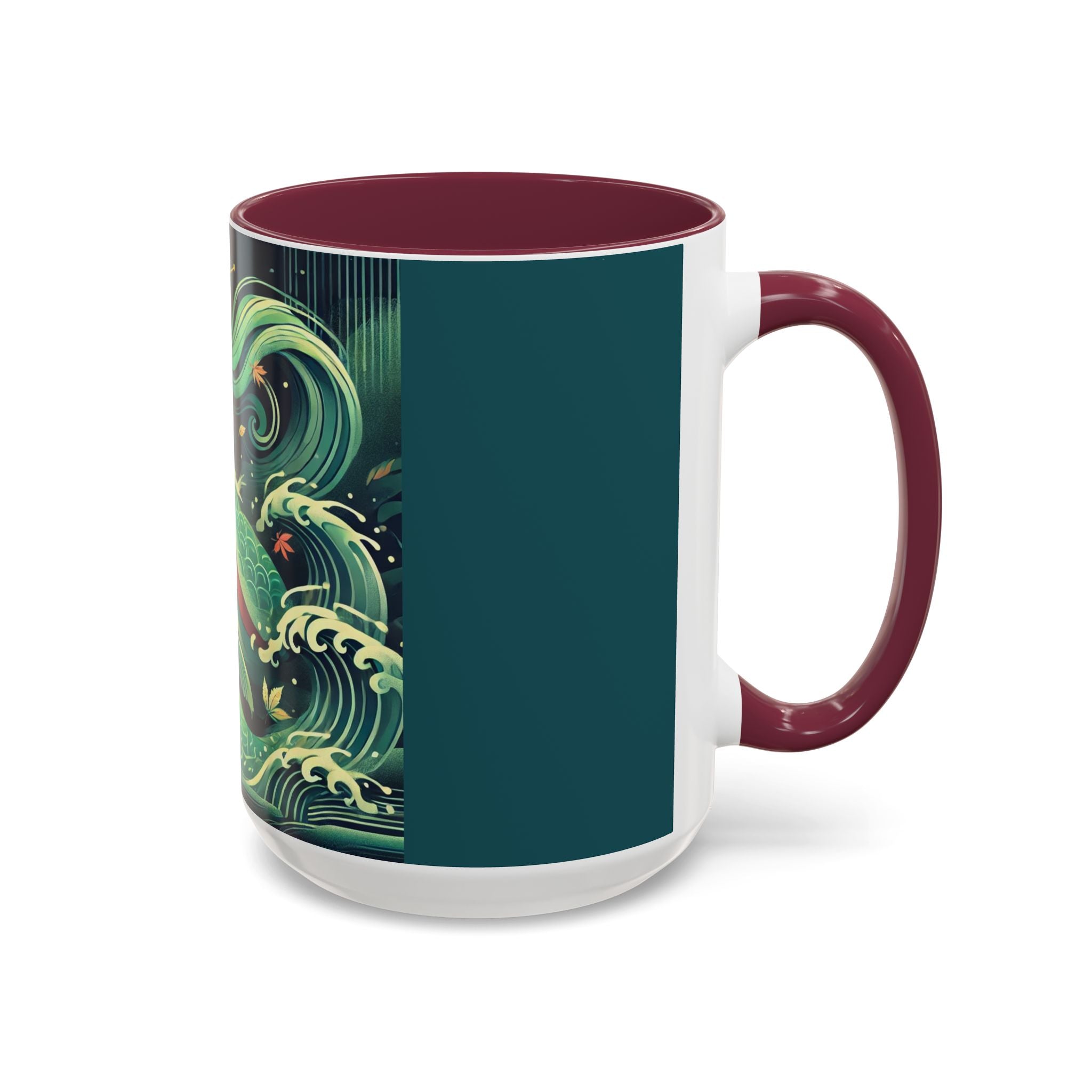 Mermaid Queen Rising from the Deep Colorful Mugs are everyday essentials that transform daily rituals into moments of artistry. Available in 11oz or 15oz sizes and offered in twelve striking color options, each mug features a glossy finish that enhances the vibrancy and detail of the artwork. With a colored handle and interior, these mugs bring personality and flair to every sip, making them instant favorites in any kitchen or office. The featured artwork captures a kabuki-inspired mermaid queen rising from deep green waters, her shimmering tail adorned with intricate patterns that glow with theatrical drama. Rendered in a bold flat style, the scene blends fantasy with Japanese theater influences, celebrating strength, grace, and imagination. Both lyrical and dramatic, this design turns a classic mug into a statement piece.