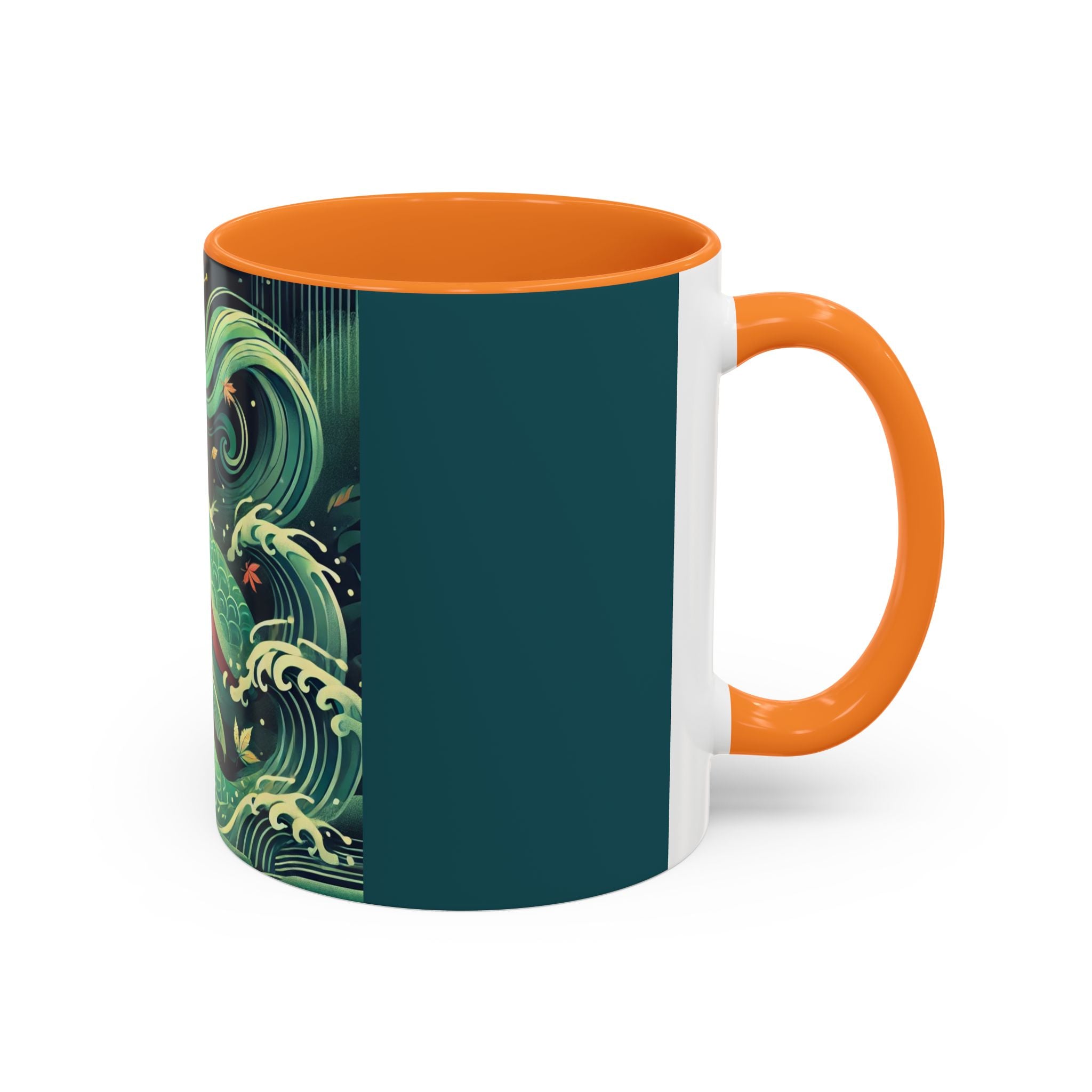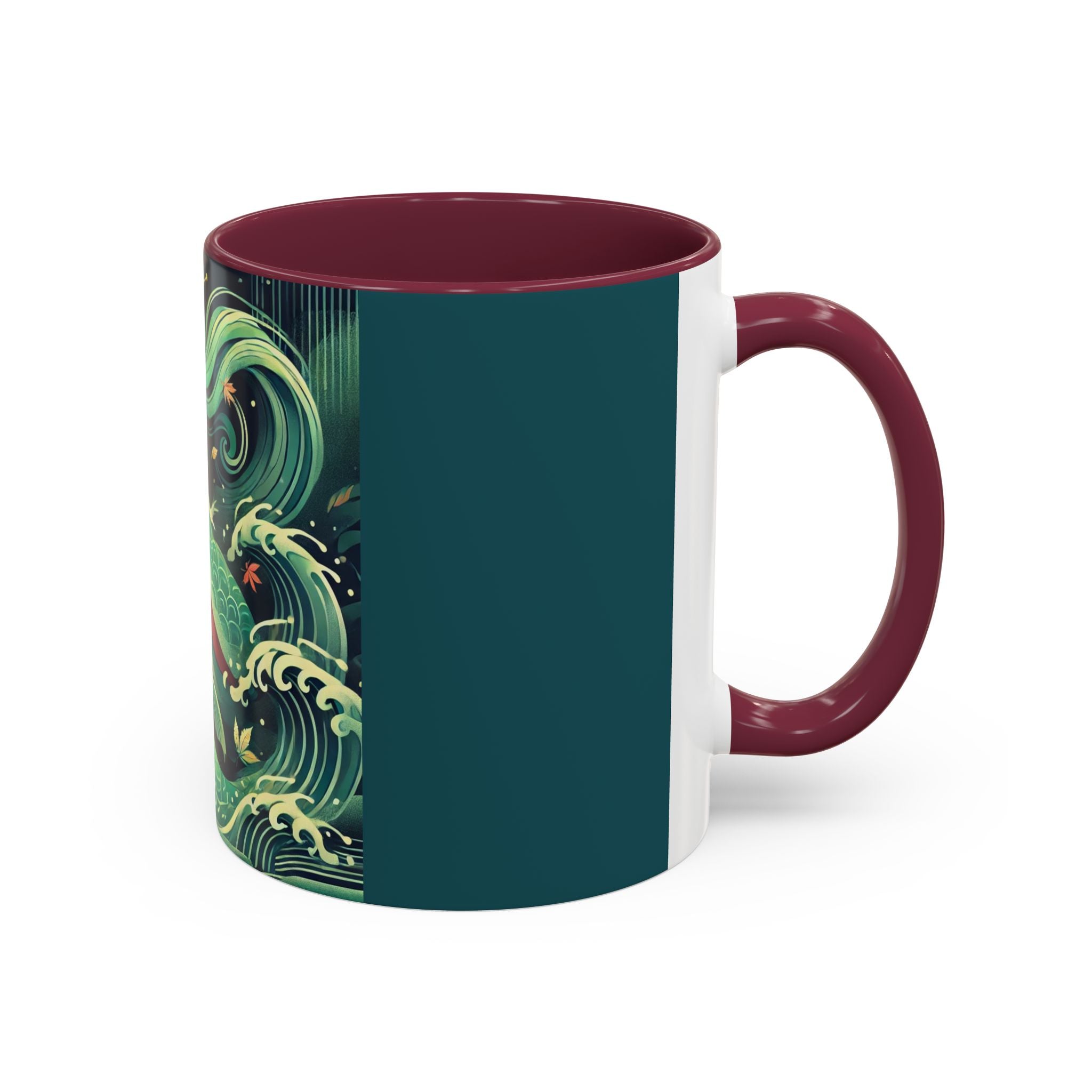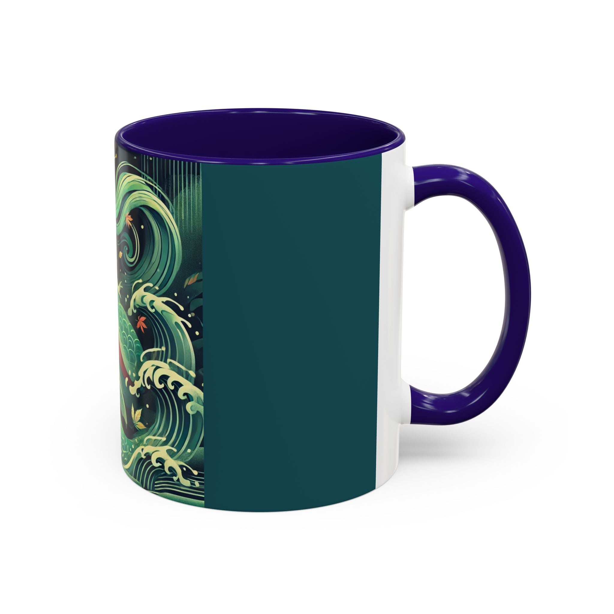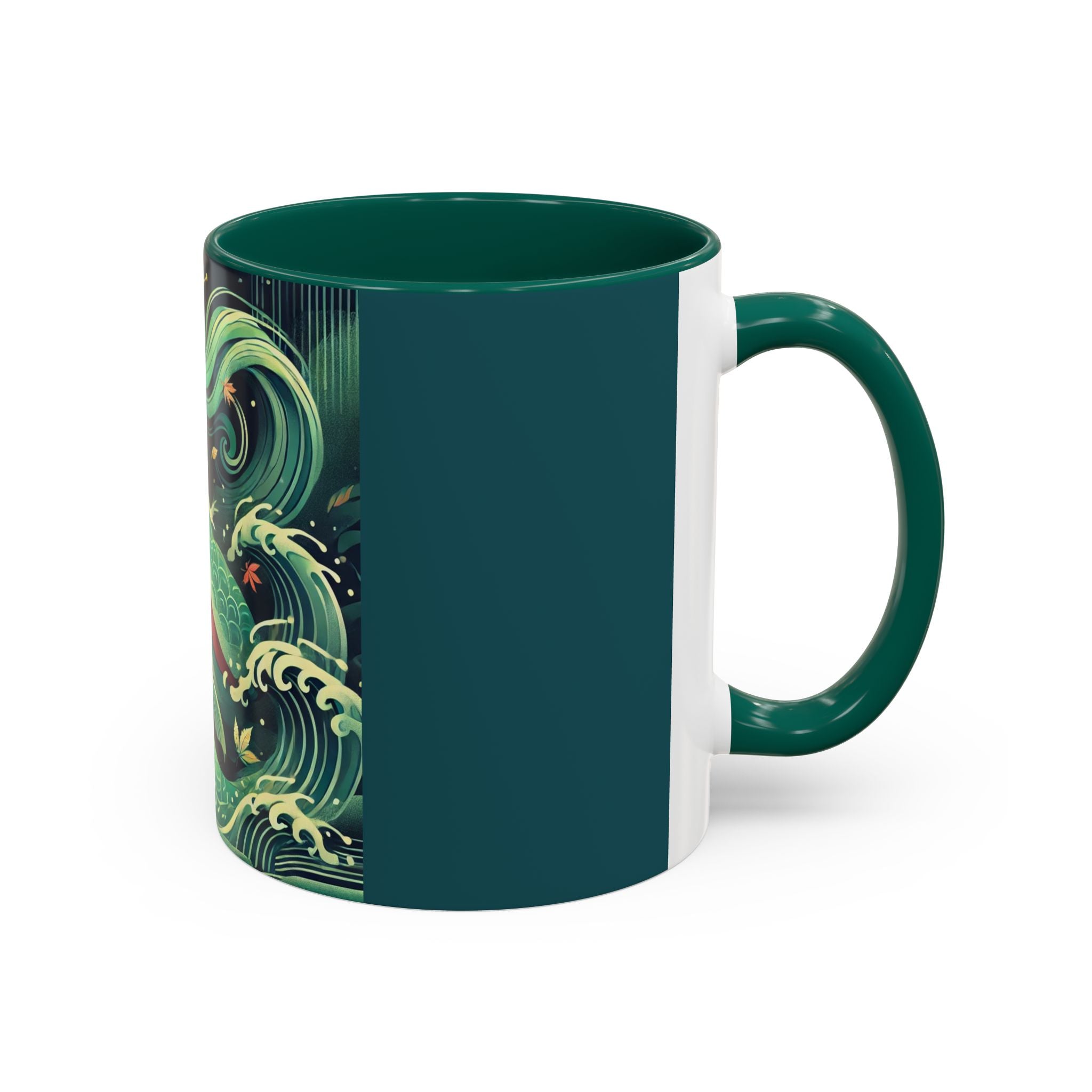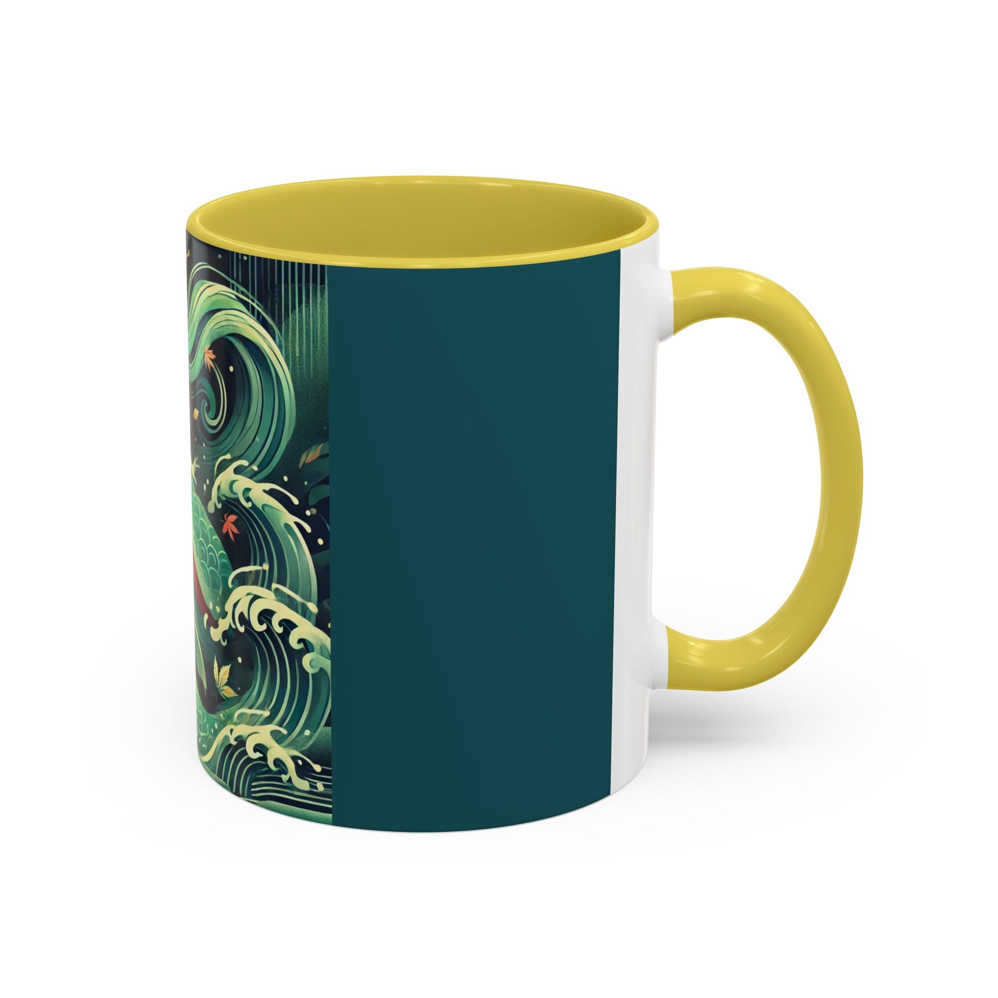 Mermaid Queen Rising from the Deep Colorful Mugs are everyday essentials that transform daily rituals into moments of artistry. Available in 11oz or 15oz sizes and offered in twelve striking color options, each mug features a glossy finish that enhances the vibrancy and detail of the artwork. With a colored handle and interior, these mugs bring personality and flair to every sip, making them instant favorites in any kitchen or office. The featured artwork captures a kabuki-inspired mermaid queen rising from deep green waters, her shimmering tail adorned with intricate patterns that glow with theatrical drama. Rendered in a bold flat style, the scene blends fantasy with Japanese theater influences, celebrating strength, grace, and imagination. Both lyrical and dramatic, this design turns a classic mug into a statement piece.