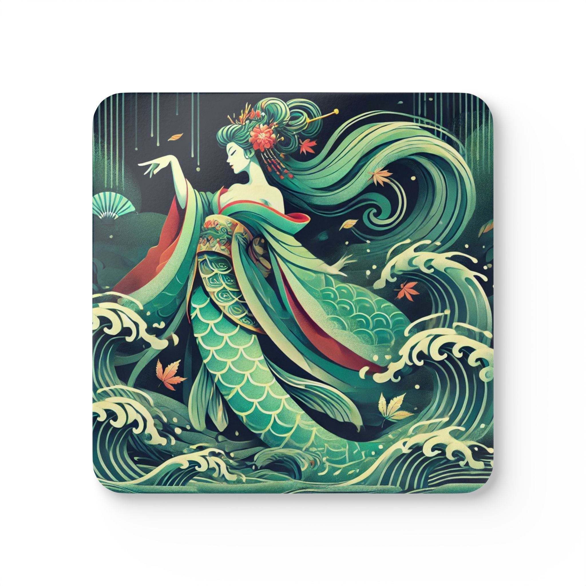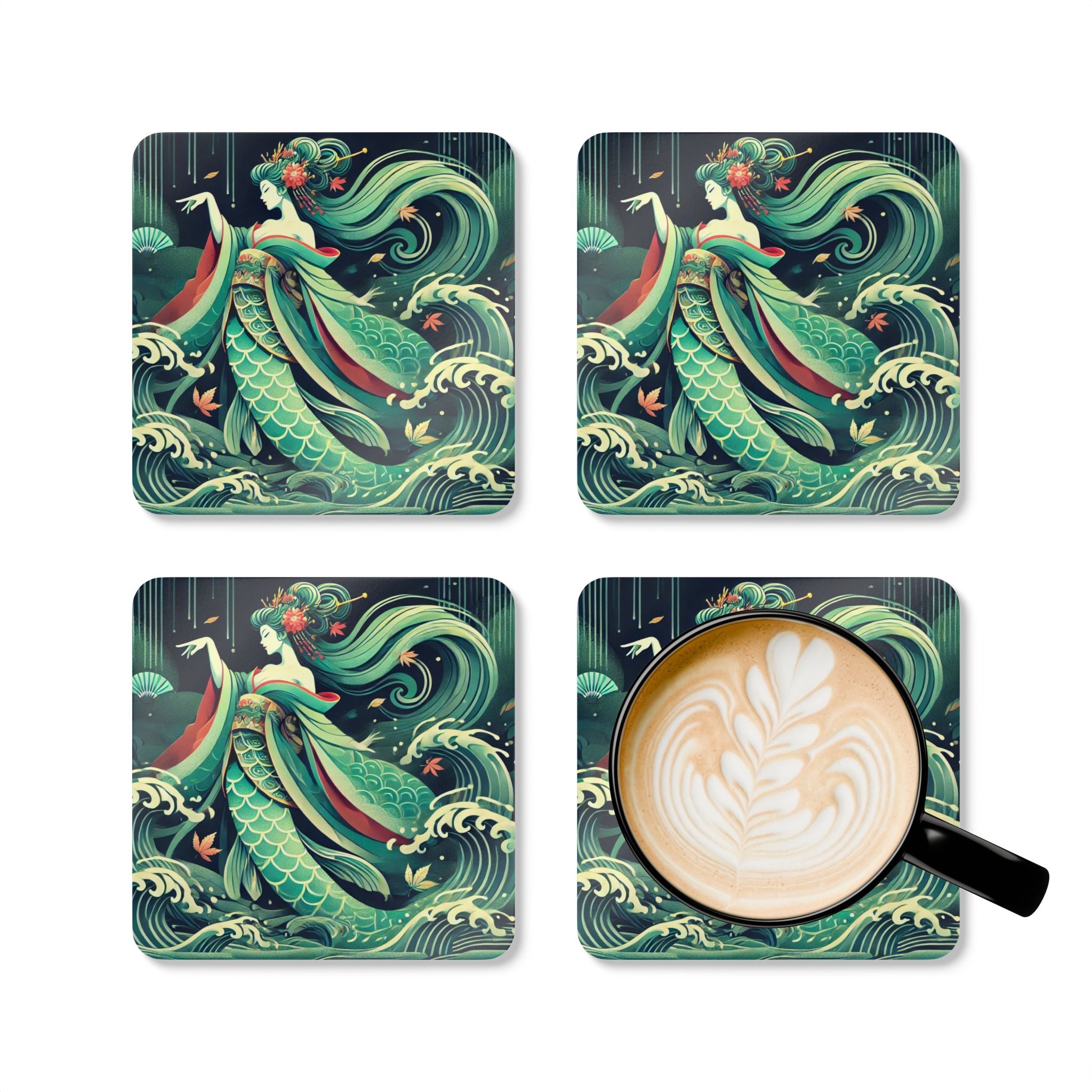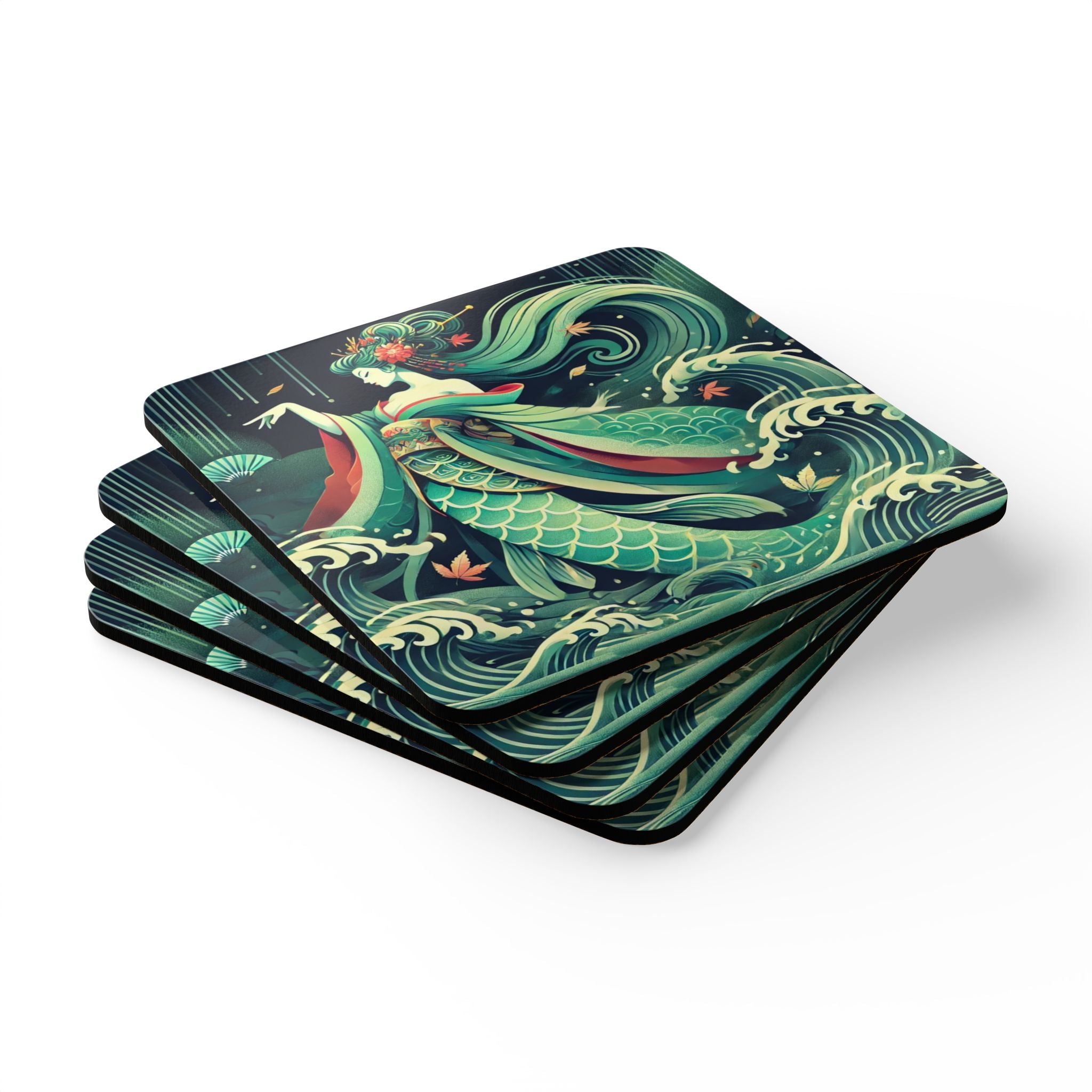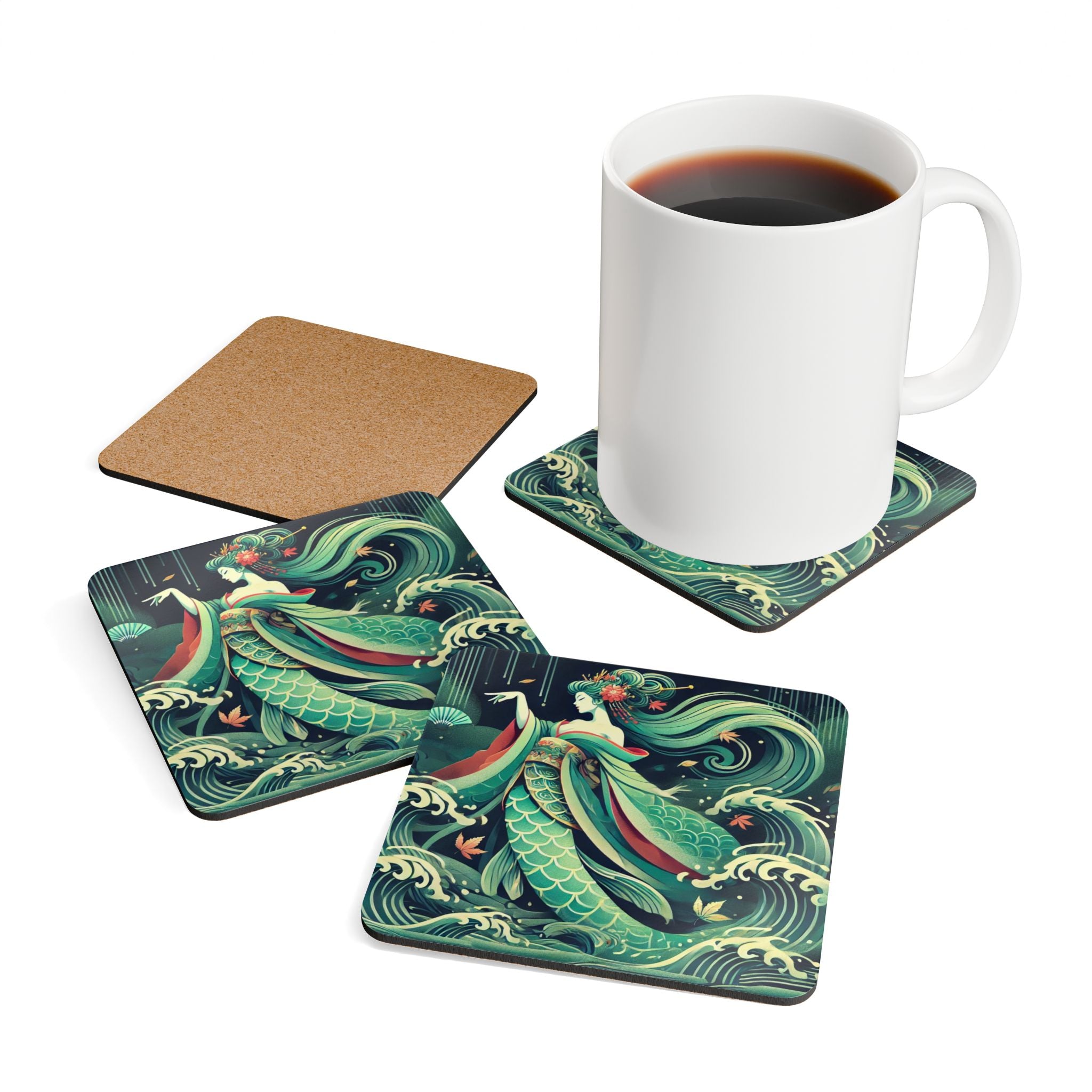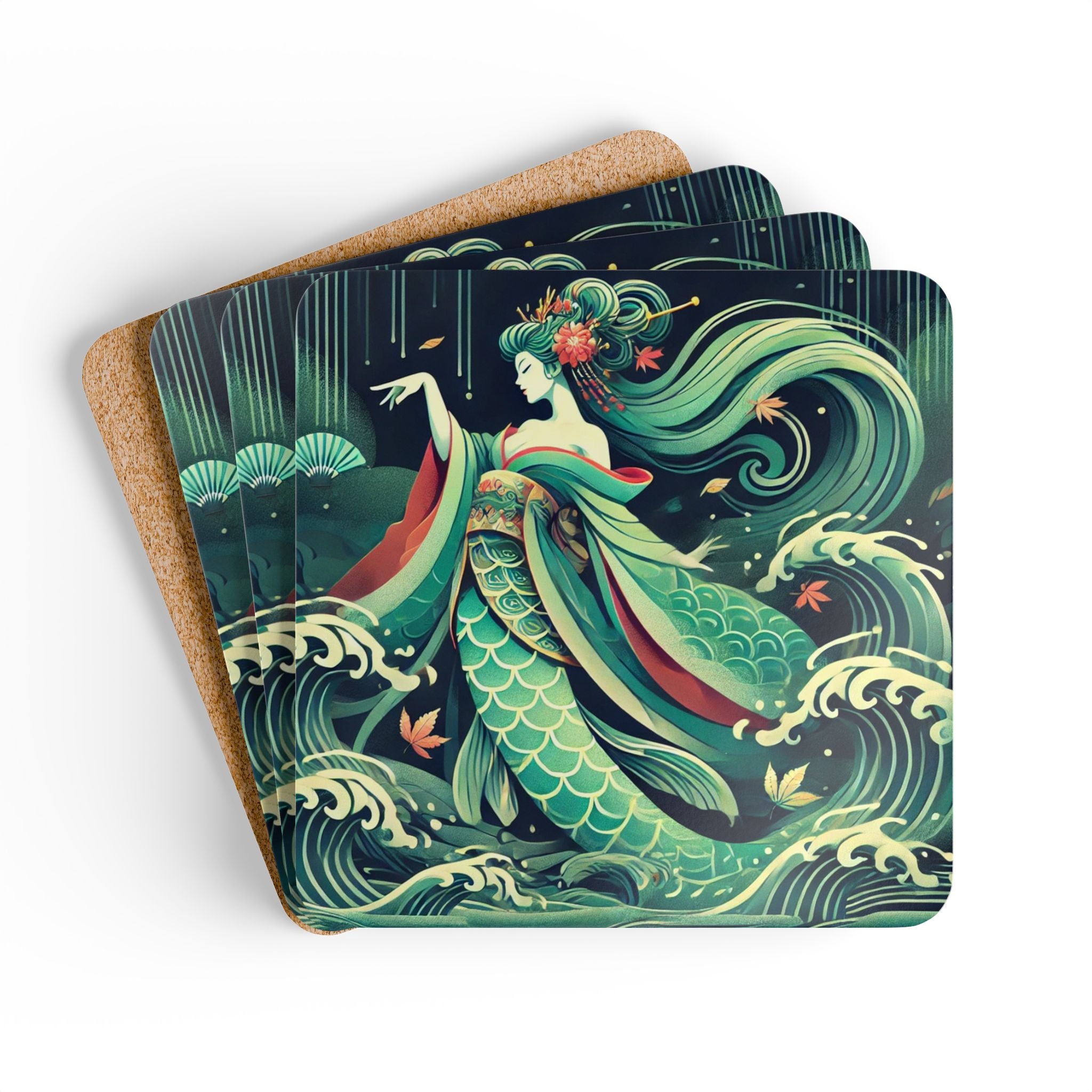 Mermaid Queen Rising from the Deep Corkwood Coaster Set is designed to elevate any home or office décor while also making a distinctive choice for business promotion. Each set includes four coasters, crafted with a high-gloss top that enhances the artwork and a cork back that prevents slipping and protects surfaces. The featured artwork showcases a kabuki-inspired mermaid queen rising from deep green waters, her shimmering tail adorned with intricate patterns that glow with color and movement. Rendered in a bold flat style, the scene blends fantasy with Japanese theater influences, creating a lyrical and dramatic composition. With its mix of strength, grace, and theatrical flair, this design transforms everyday coasters into captivating pieces of functional art.