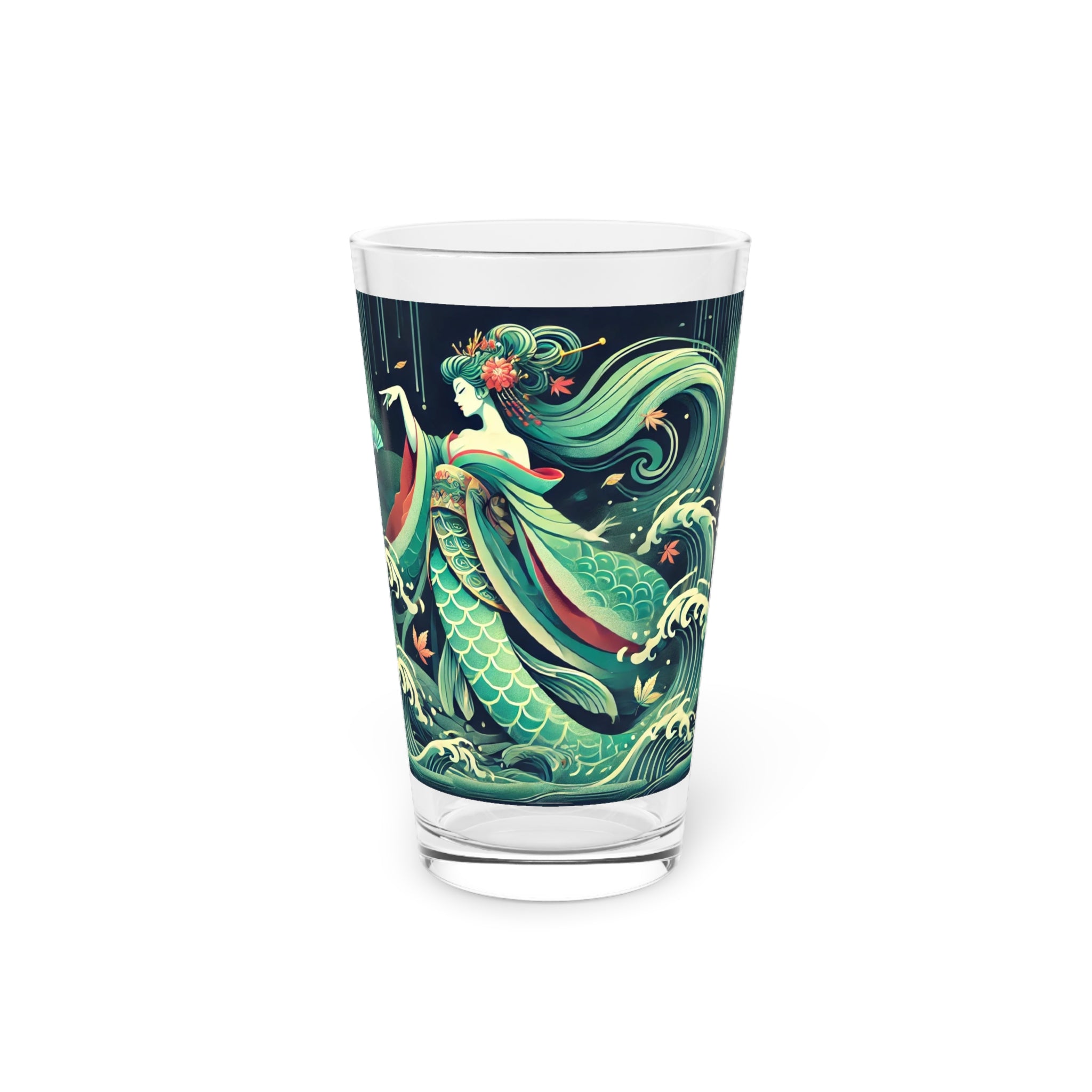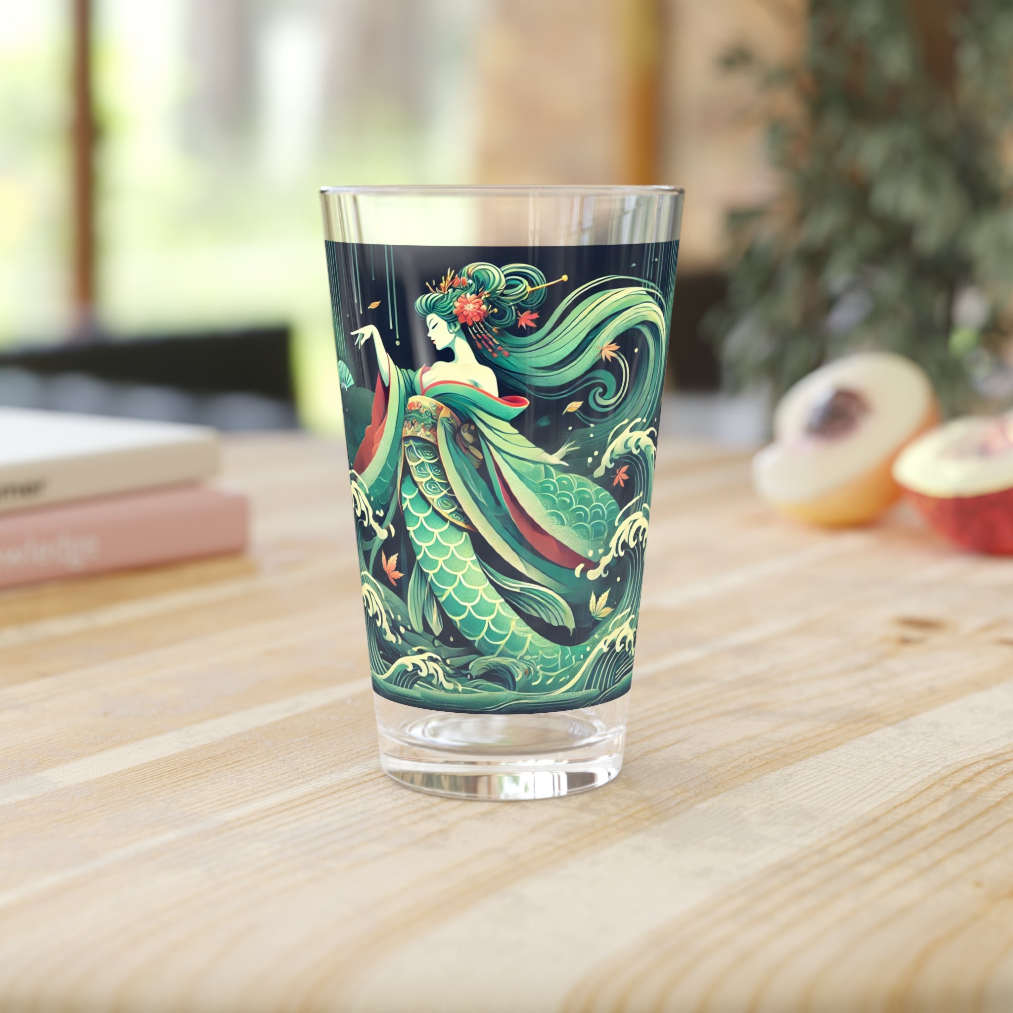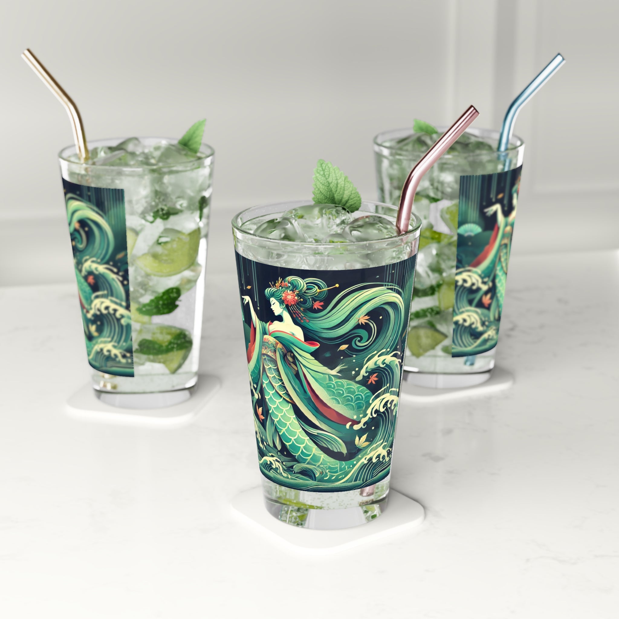 Mermaid Queen Rising from the Deep Glass, 16oz, brings a touch of artistry and drama to every sip. These long, transparent pint glasses are versatile enough for daily use, whether serving water, iced tea, or craft beer, and they also make memorable housewarming gifts. With a sleek 16oz design, they are as practical as they are stylish, destined to find a place in any household. The featured artwork showcases a kabuki-inspired mermaid queen rising from deep green waters, her shimmering tail covered with intricate, colorful patterns. Boldly rendered in a flat style, the scene blends fantasy with Japanese theater influences, capturing both strength and grace. Lyrical and dramatic, this piece transforms an everyday glass into a captivating vessel of imagination and cultural flair.