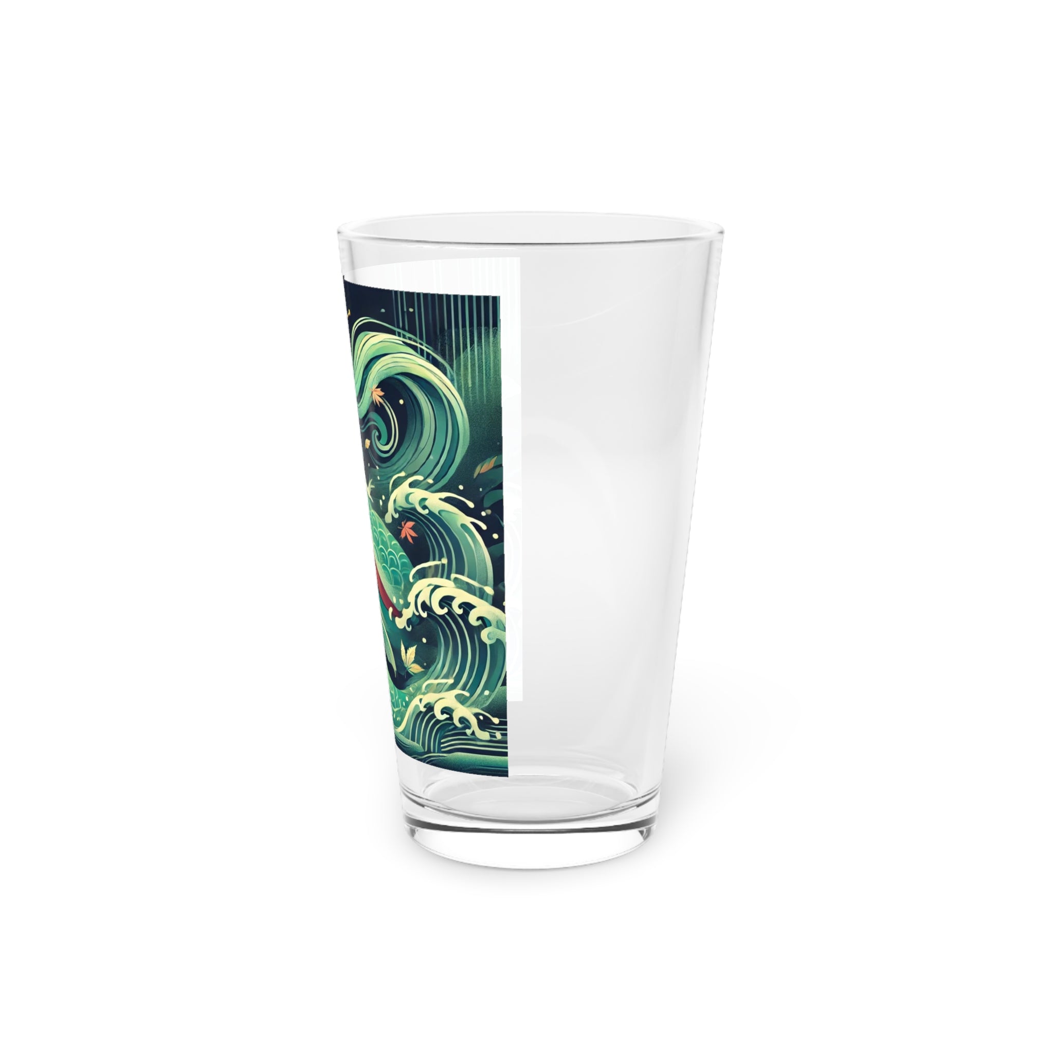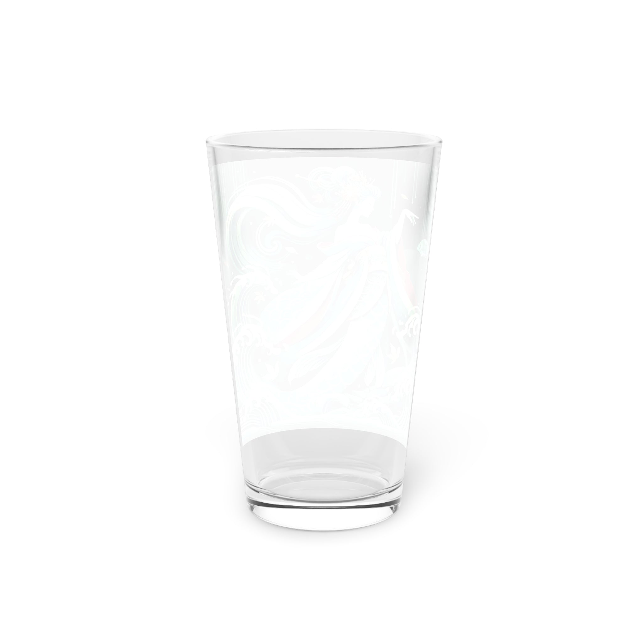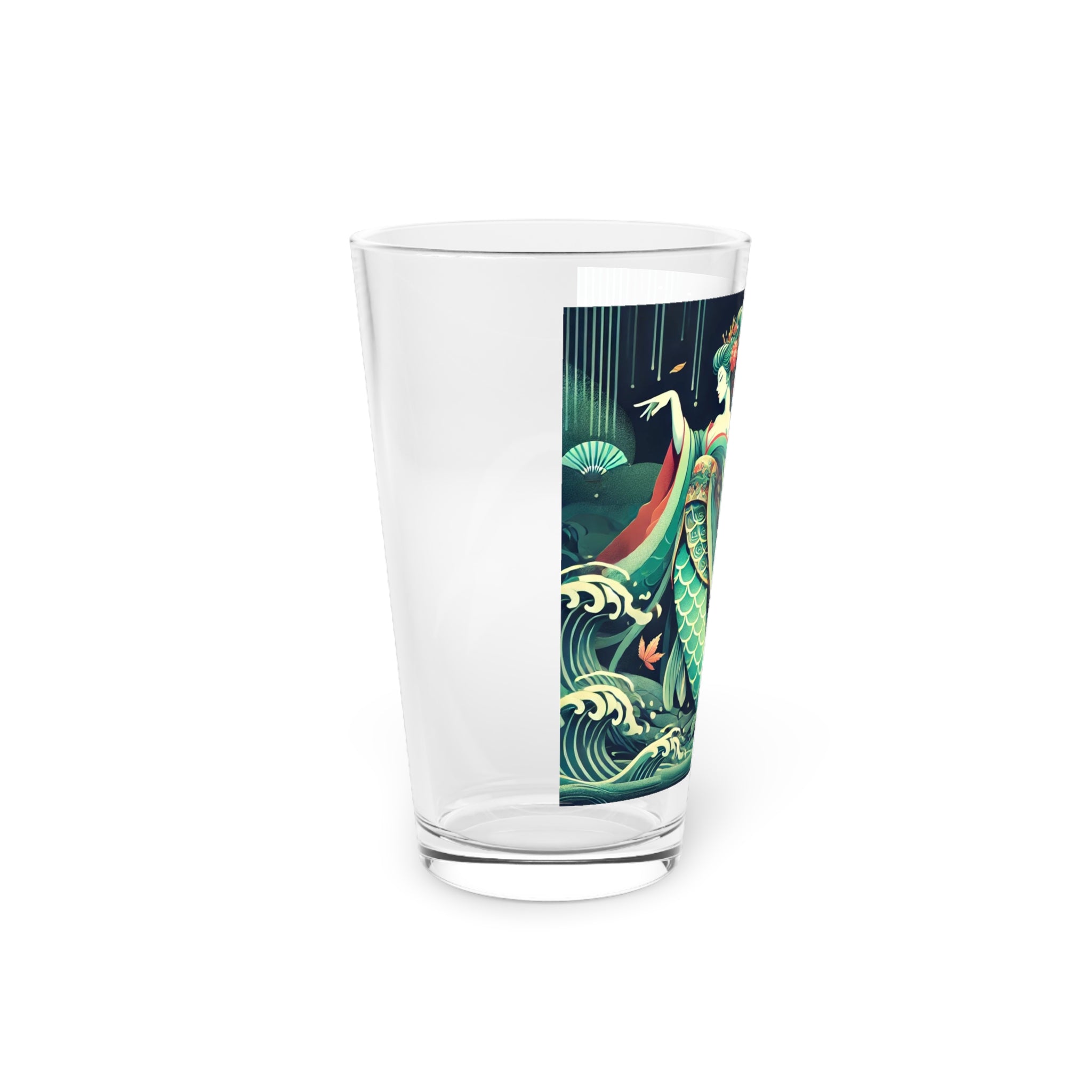 Mermaid Queen Rising from the Deep Glass, 16oz, brings a touch of artistry and drama to every sip. These long, transparent pint glasses are versatile enough for daily use, whether serving water, iced tea, or craft beer, and they also make memorable housewarming gifts. With a sleek 16oz design, they are as practical as they are stylish, destined to find a place in any household. The featured artwork showcases a kabuki-inspired mermaid queen rising from deep green waters, her shimmering tail covered with intricate, colorful patterns. Boldly rendered in a flat style, the scene blends fantasy with Japanese theater influences, capturing both strength and grace. Lyrical and dramatic, this piece transforms an everyday glass into a captivating vessel of imagination and cultural flair.