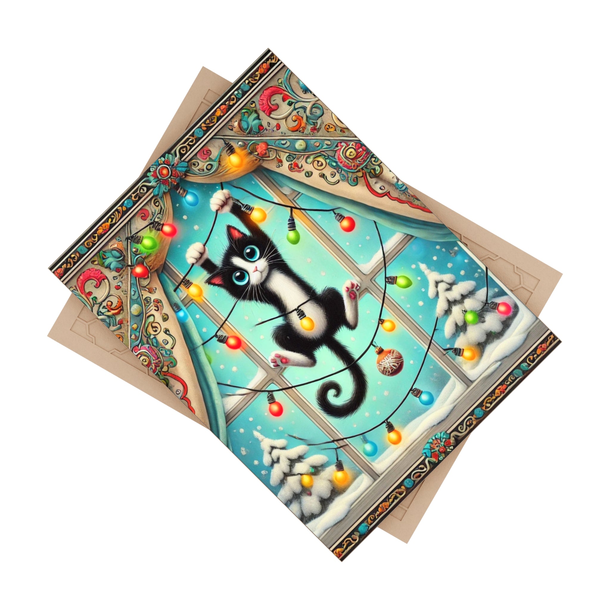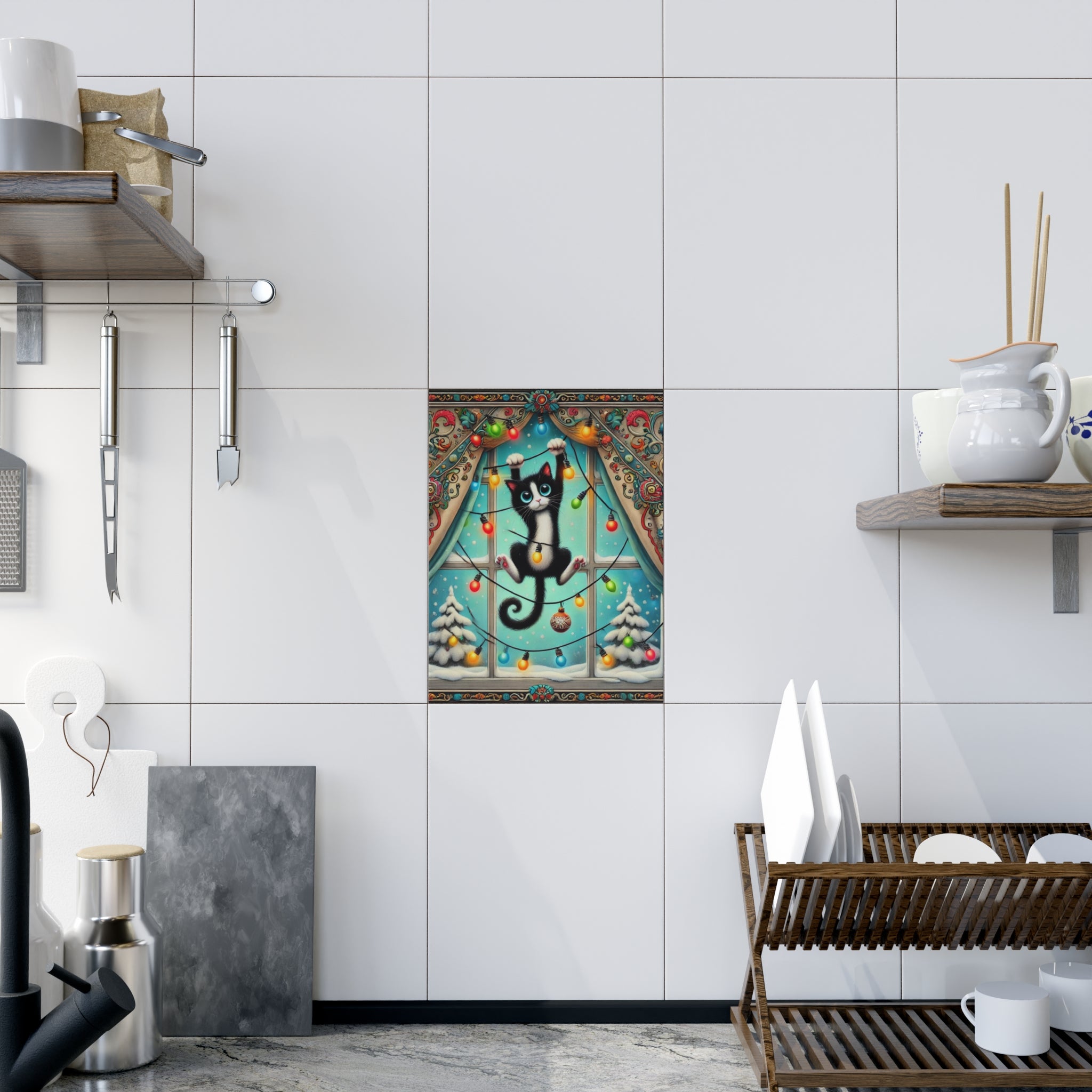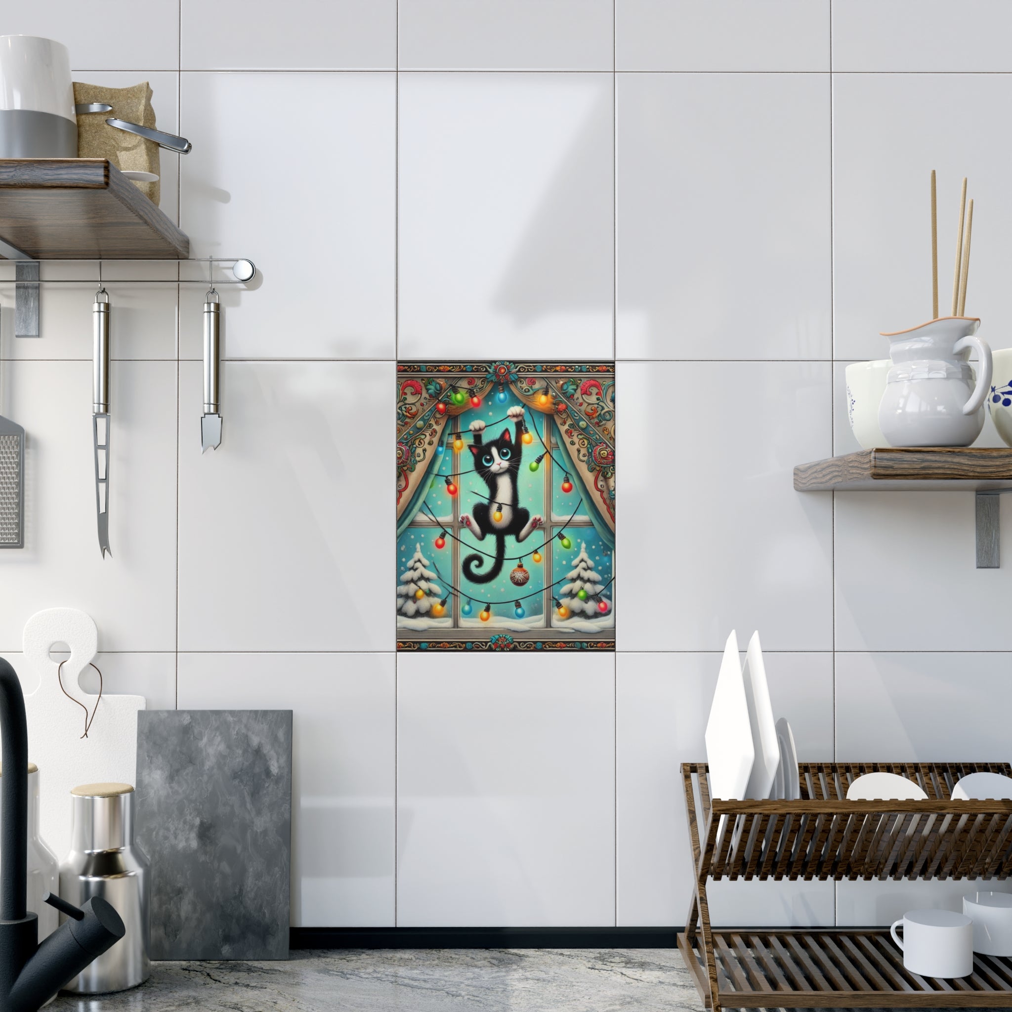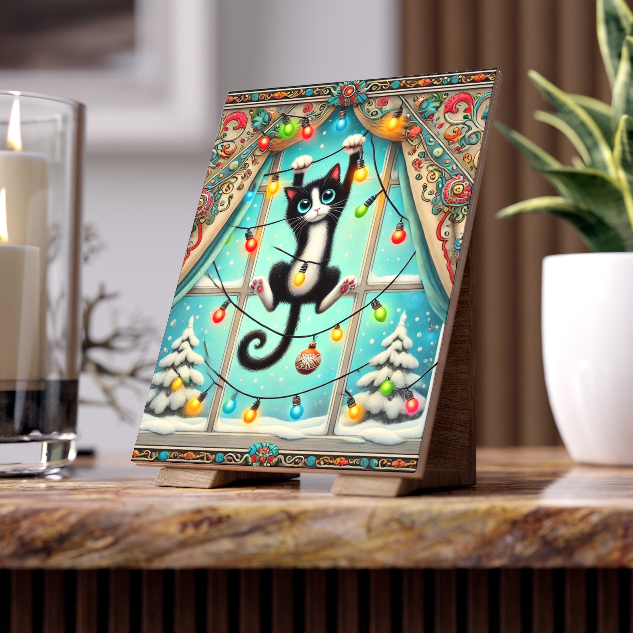 Add a splash of festive mischief to your décor with the Mischief in Tinselland Ceramic Tile. This delightful Christmas artwork captures a playful black-and-white kitten tangled in glowing holiday lights, its wide eyes full of wonder and humor. Behind it, ornate festive curtains frame a frosted window revealing snow-covered trees under a bright turquoise sky — a joyful scene filled with color, warmth, and holiday cheer. 🎄🐾✨