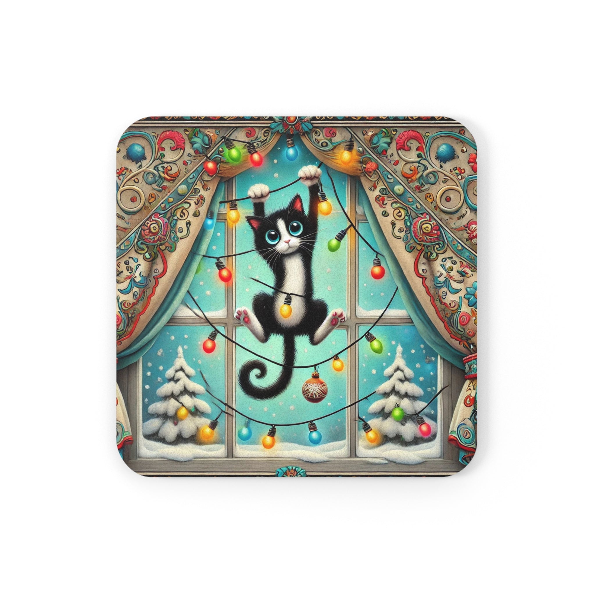 Bring a touch of festive mischief to your table with the Mischief in Tinselland Coaster. This charming Christmas design features a black-and-white kitten tangled in colorful lights, playfully posed before a frosted window framed by swirling curtains and a turquoise winter sky. The scene captures the joyful chaos and cozy warmth of the holidays. šš¾āØ