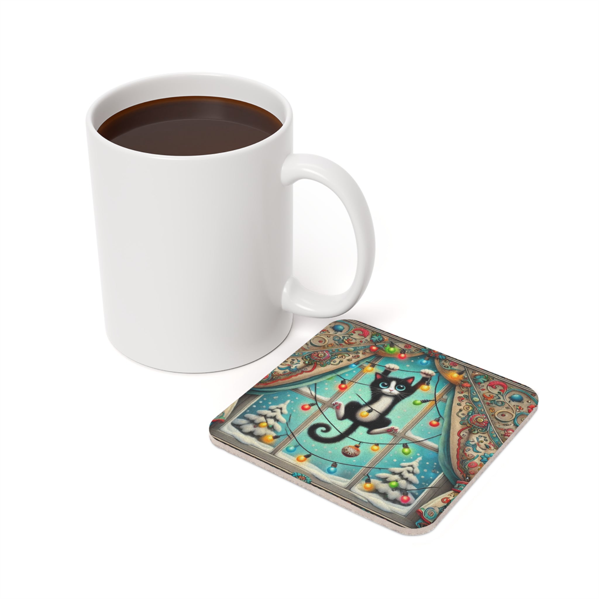 Each coaster features a glossy, polyester-coated top that highlights the vivid artwork and a genuine cork bottom to prevent slipping. Perfect for adding seasonal charm to your home or gifting to a fellow cat lover.