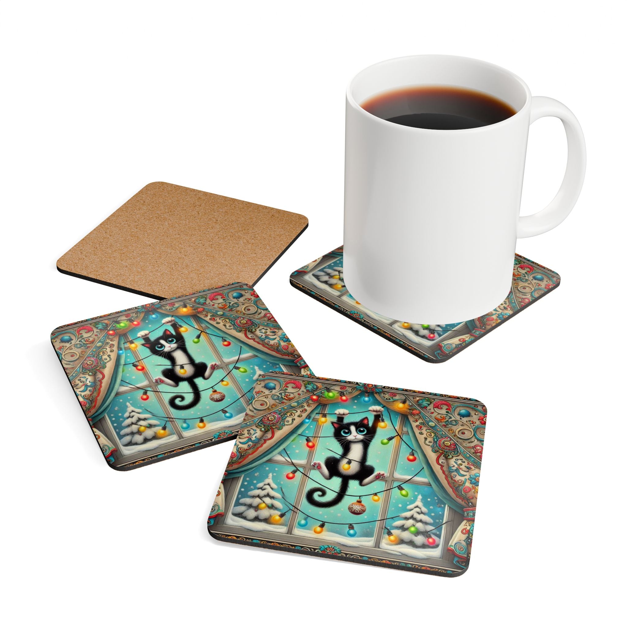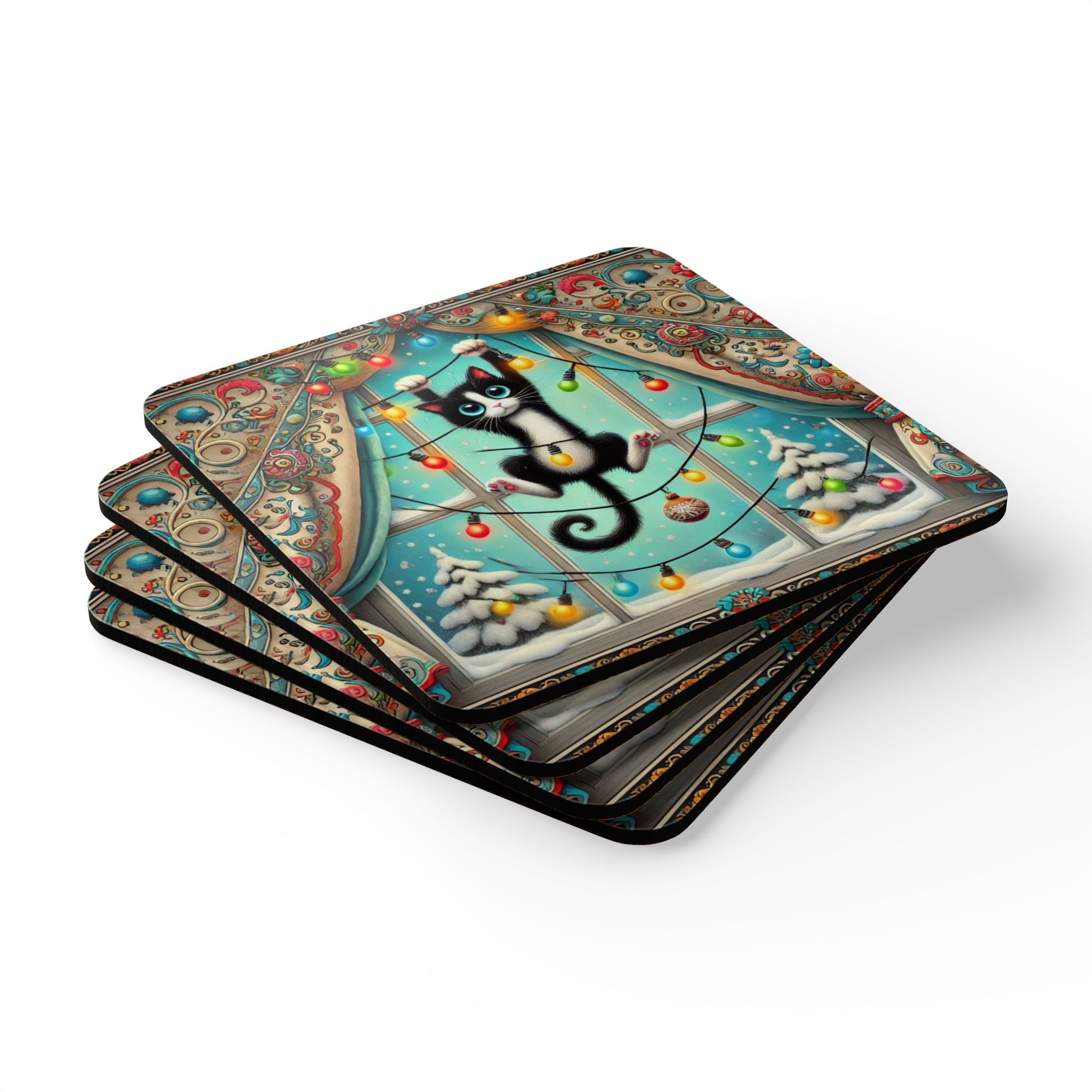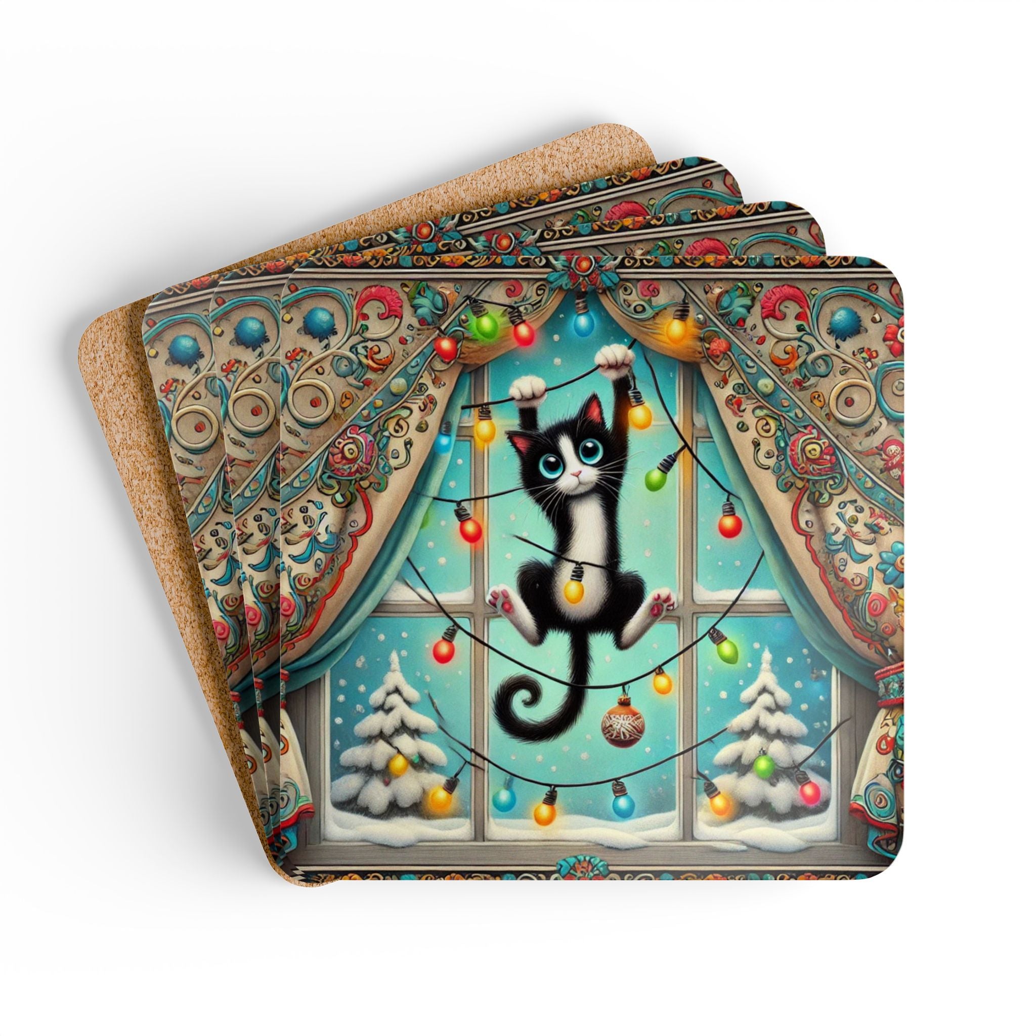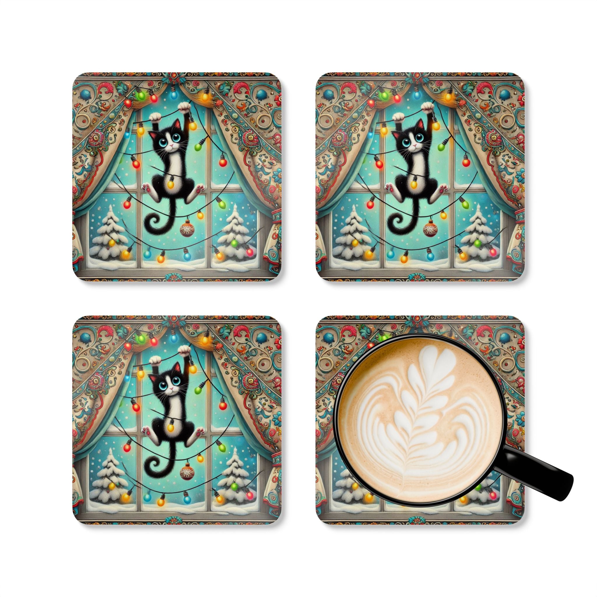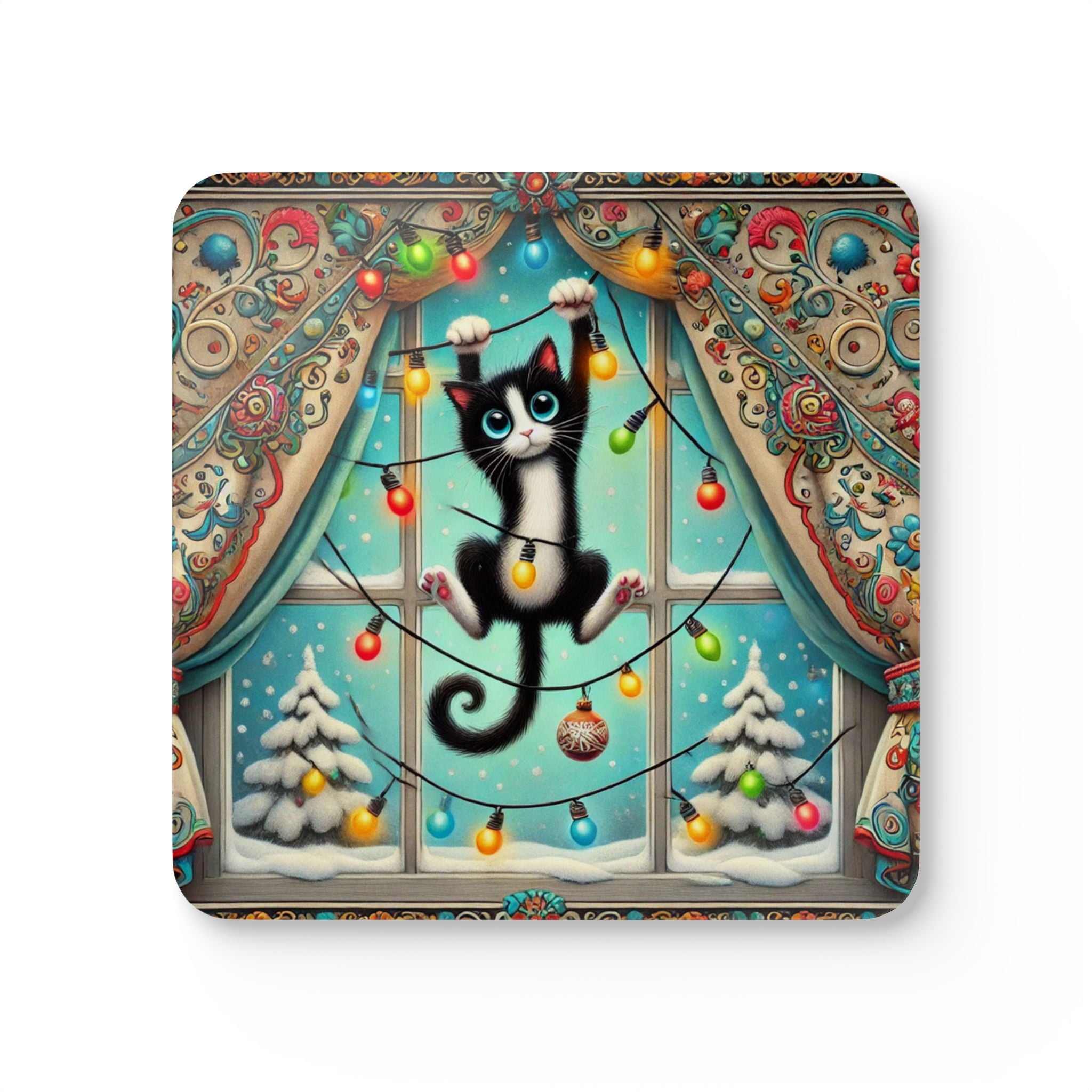 Add a playful touch of holiday cheer to your home with the Mischief in Tinselland Coaster Set. This festive design features a mischievous black-and-white kitten tangled in glowing Christmas lights, playfully perched before a frosted window framed by swirling curtains and a turquoise winter sky. The scene captures the joyful, colorful spirit of the season. šš¾āØ