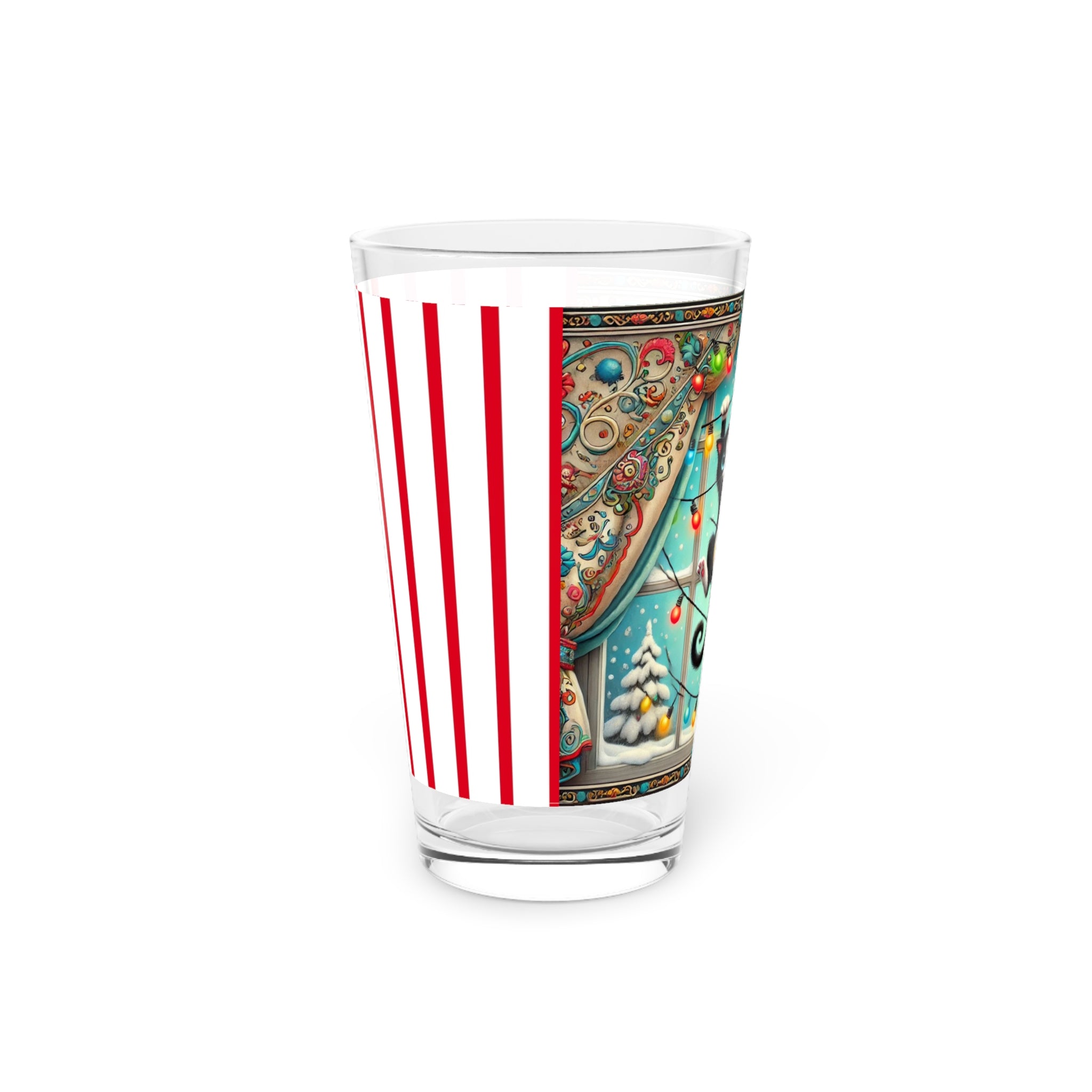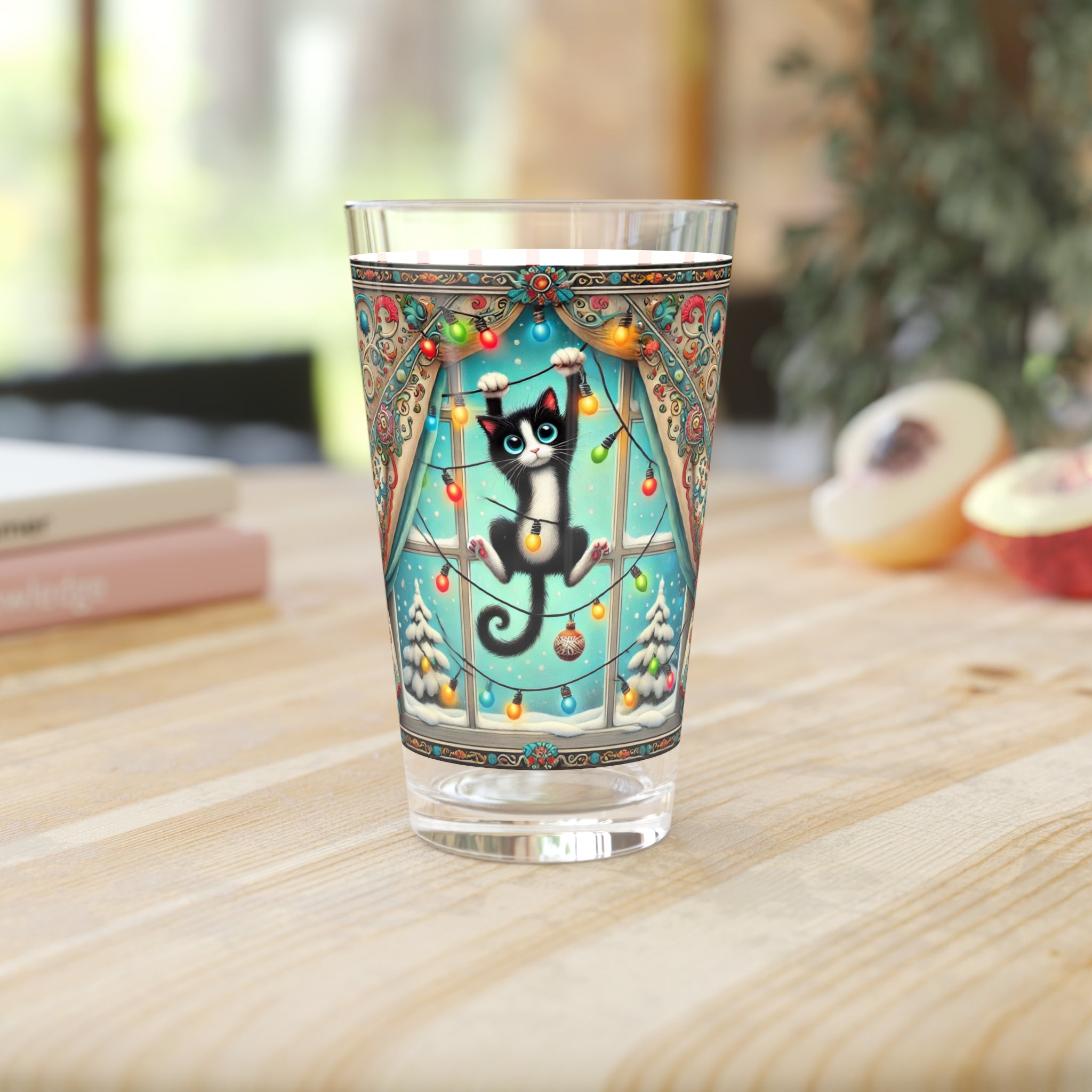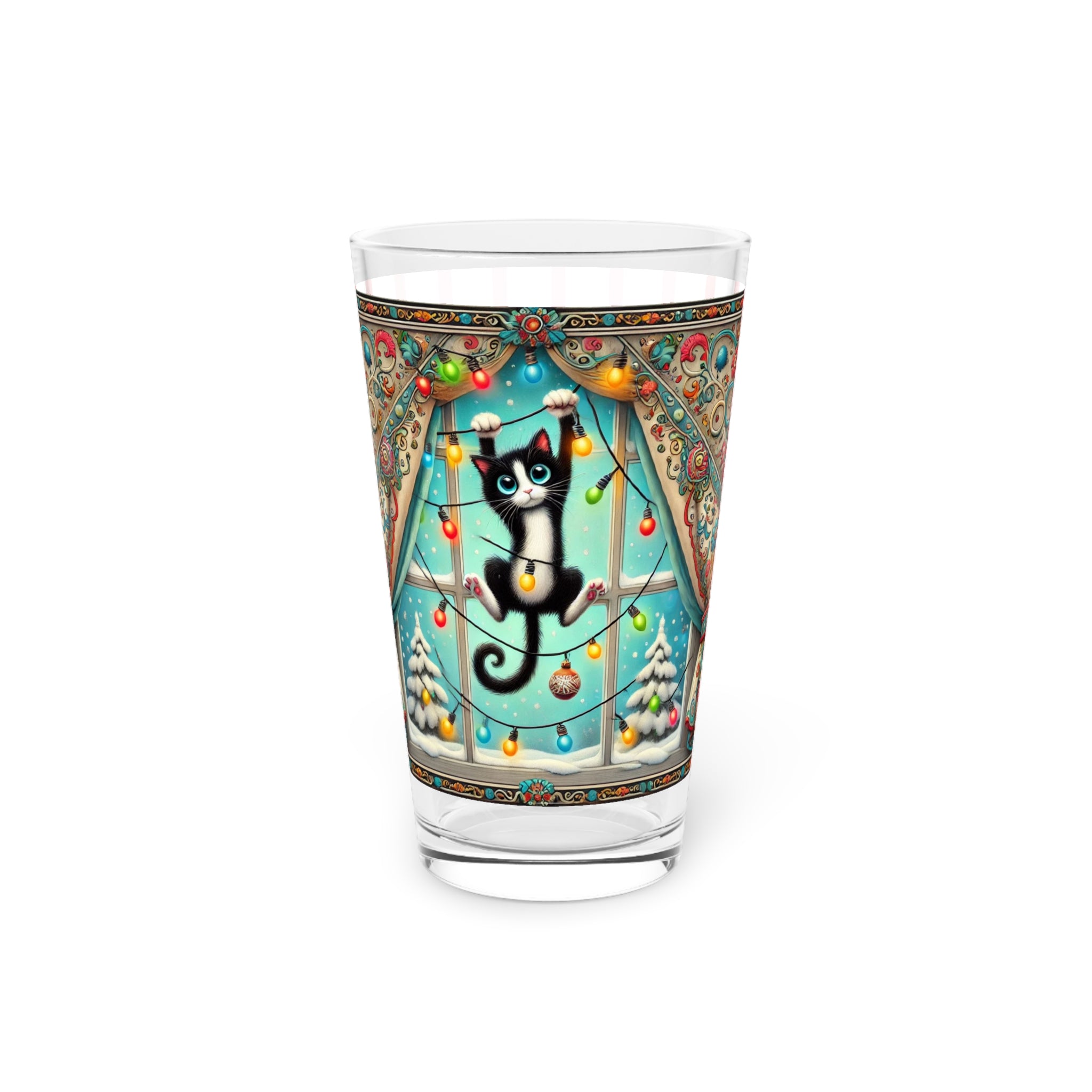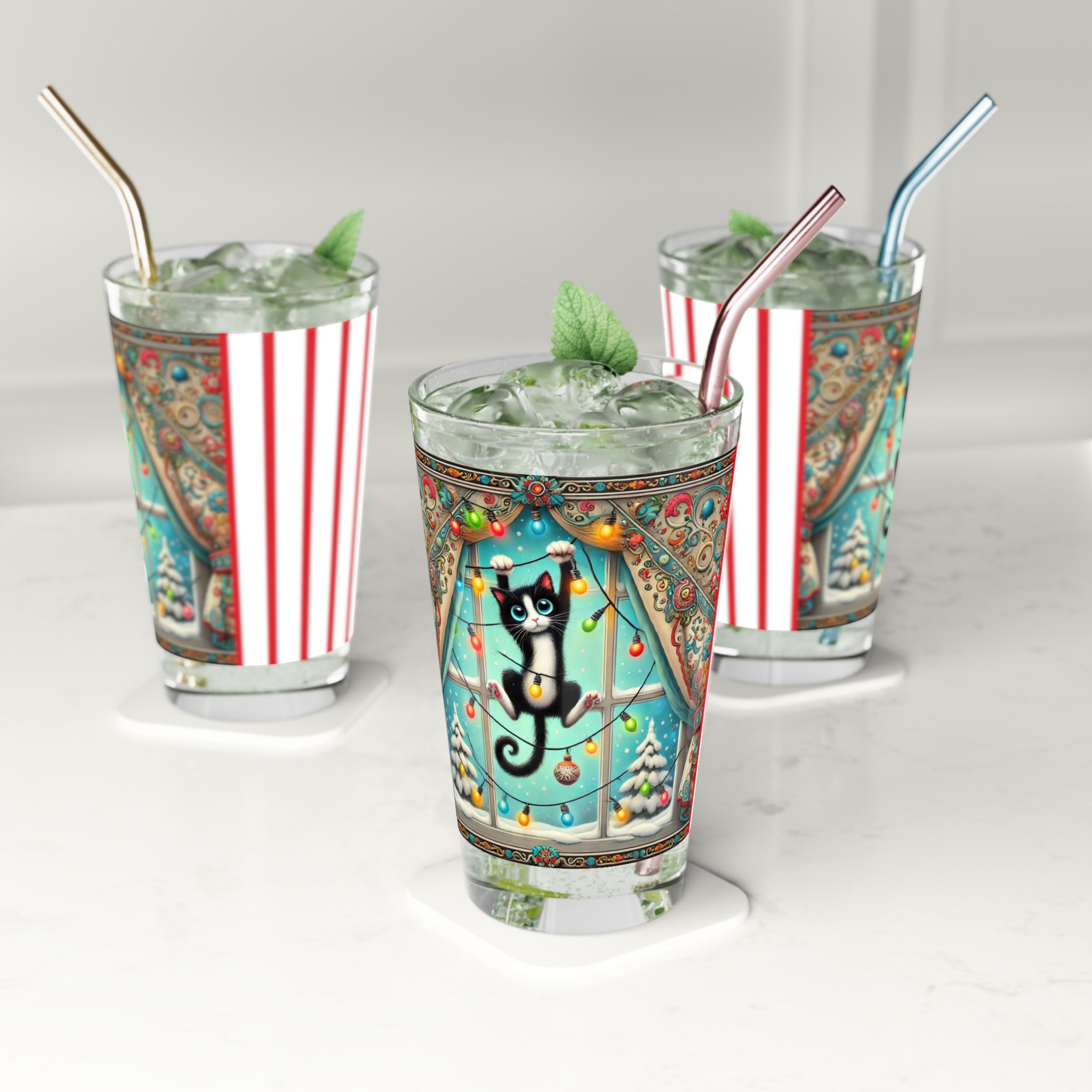 Bring a touch of playful holiday magic to your table with the Mischief in Tinselland glass. This whimsical Christmas illustration captures a mischievous black-and-white kitten tangled in a string of colorful lights — wide-eyed and full of charm as it dangles in front of a frosted window. Behind it, swirling floral curtains frame a scene of snow-covered trees shimmering under a bright turquoise winter sky. The artwork overflows with humor, color, and warmth, perfectly embodying the joyful chaos of the season. 🎄🐾✨