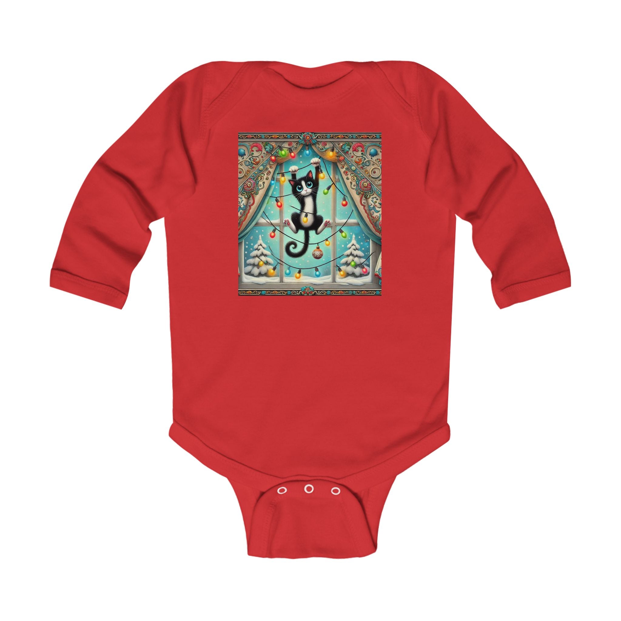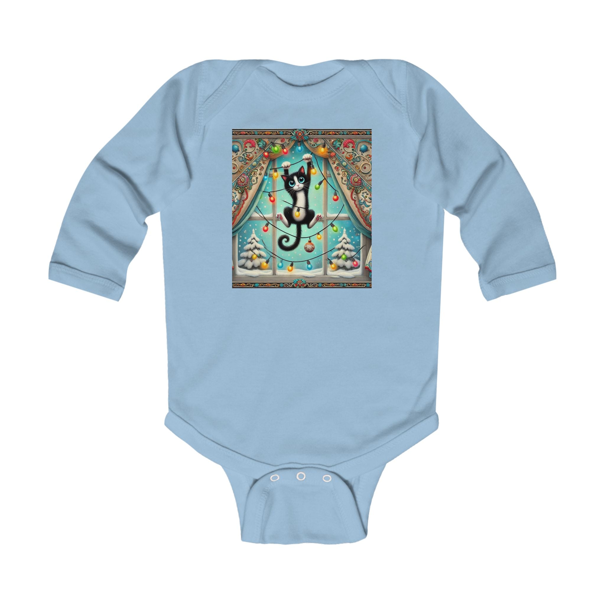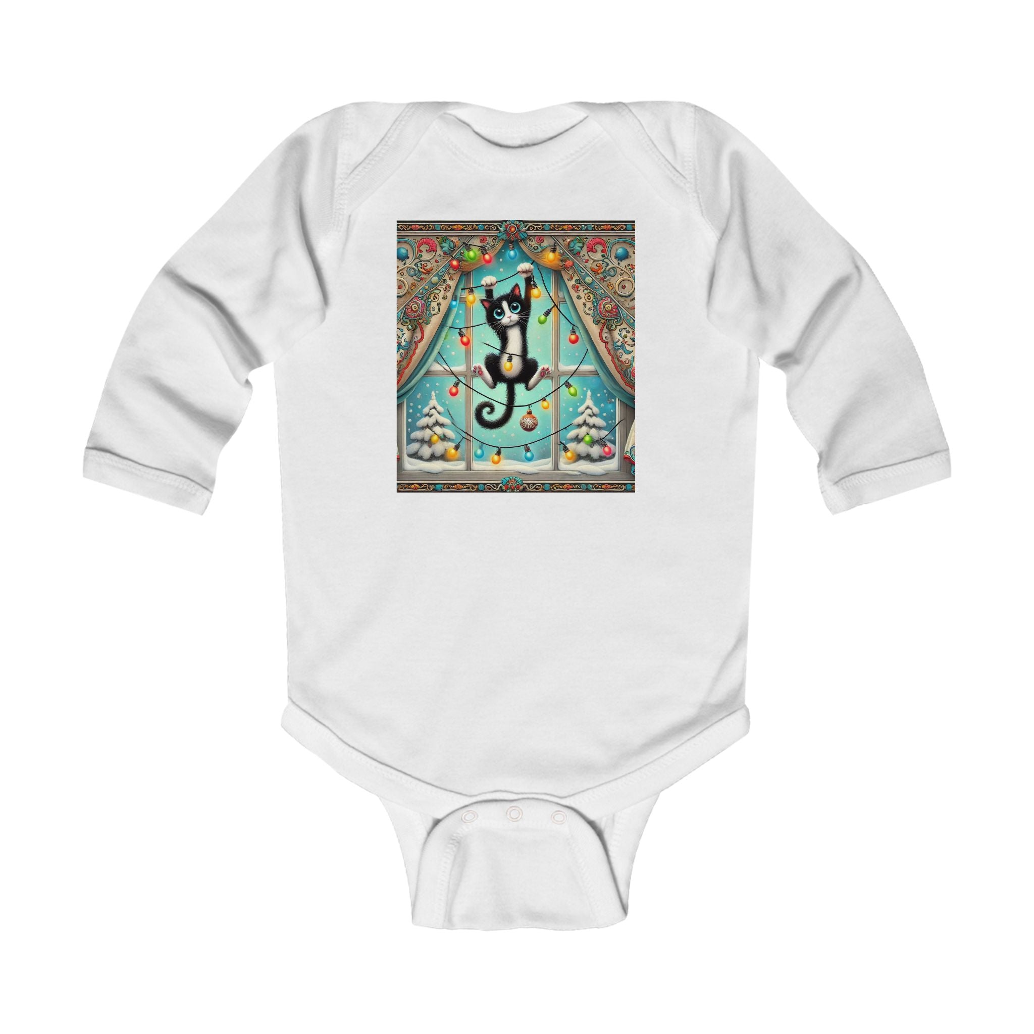 Wrap your little one in holiday warmth and playful charm with the Mischief in Tinselland Infant Long Sleeve Bodysuit. This heartwarming Christmas design features a mischievous black-and-white kitten tangled in twinkling holiday lights, gazing out a frosted window framed by ornate, festive curtains. Beyond the glass, snow-covered trees sparkle under a turquoise winter sky — a joyful scene filled with color, humor, and the cozy spirit of the season. 🎄🐾✨