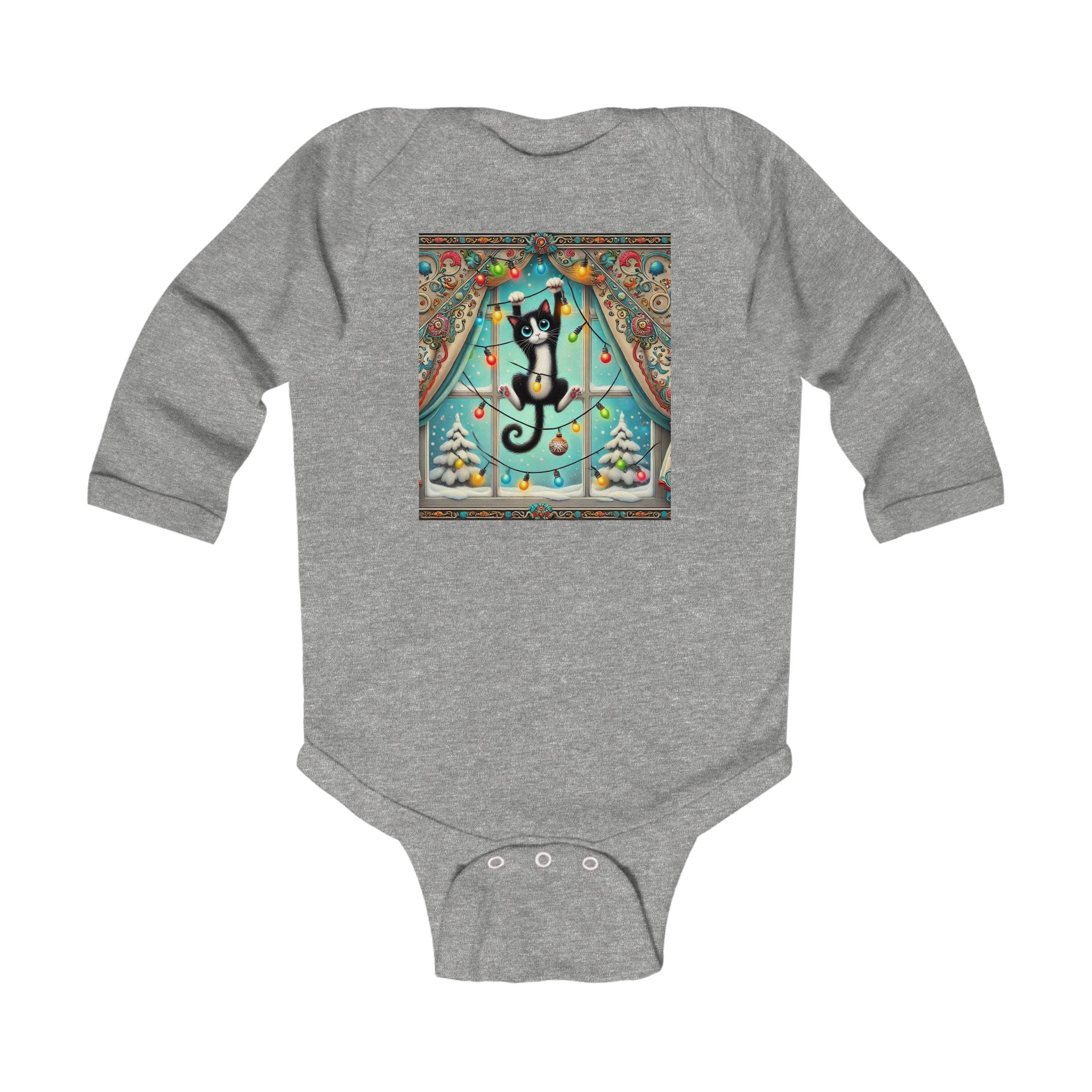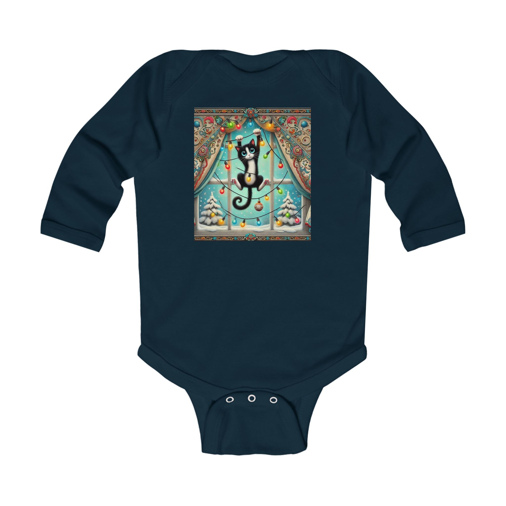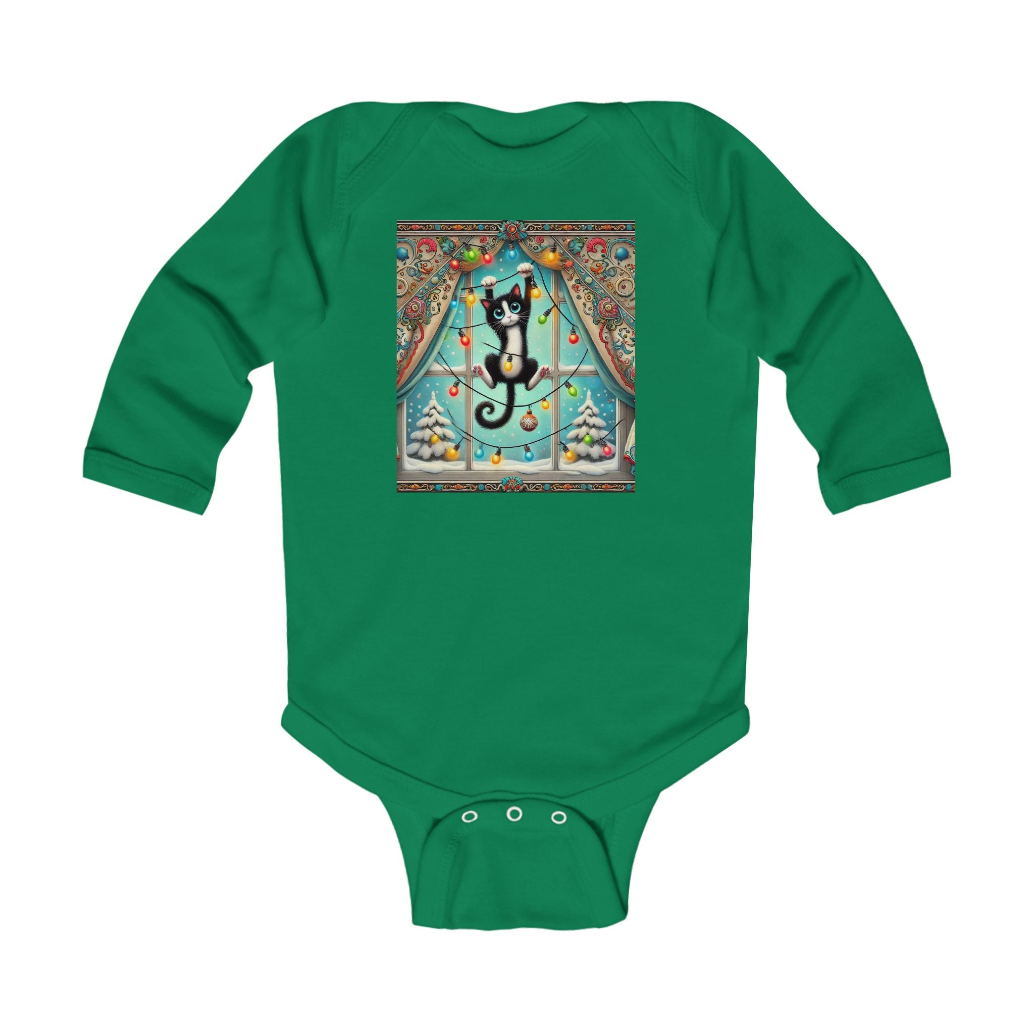 Wrap your little one in holiday warmth and playful charm with the Mischief in Tinselland Infant Long Sleeve Bodysuit. This heartwarming Christmas design features a mischievous black-and-white kitten tangled in twinkling holiday lights, gazing out a frosted window framed by ornate, festive curtains. Beyond the glass, snow-covered trees sparkle under a turquoise winter sky — a joyful scene filled with color, humor, and the cozy spirit of the season. 🎄🐾✨