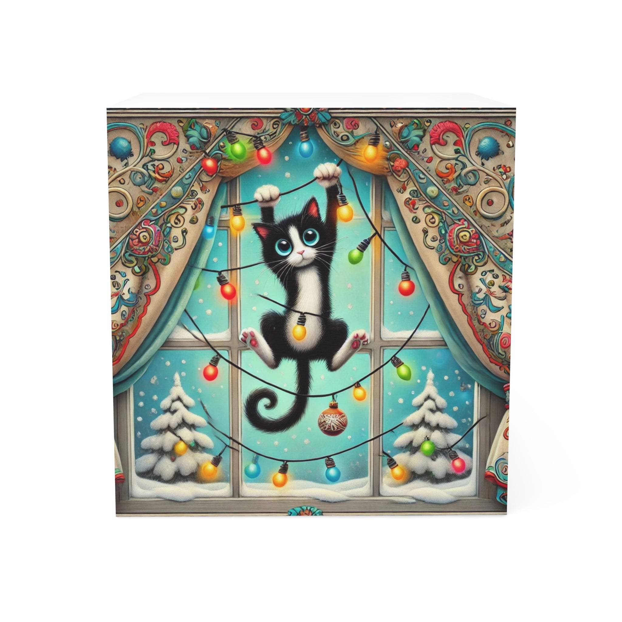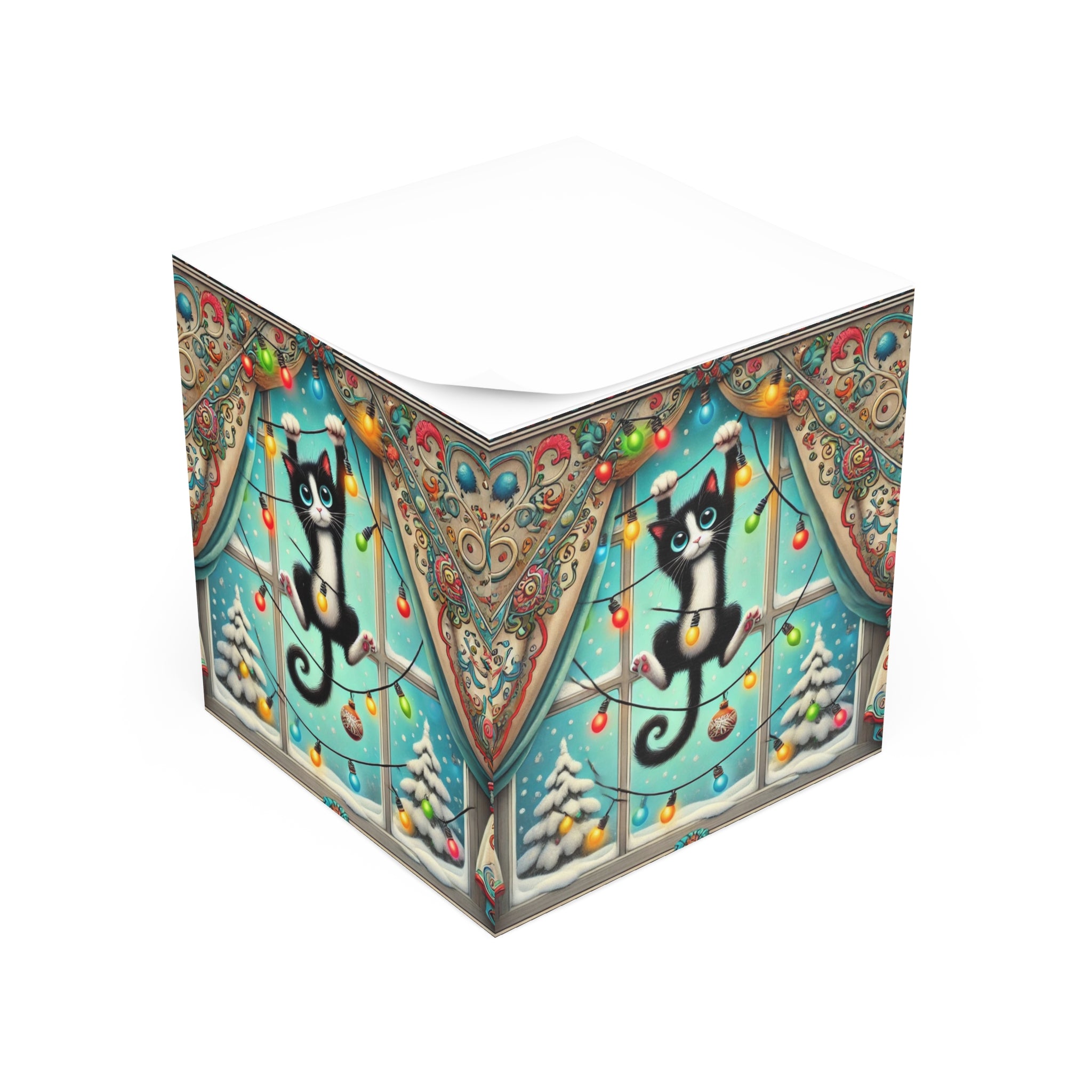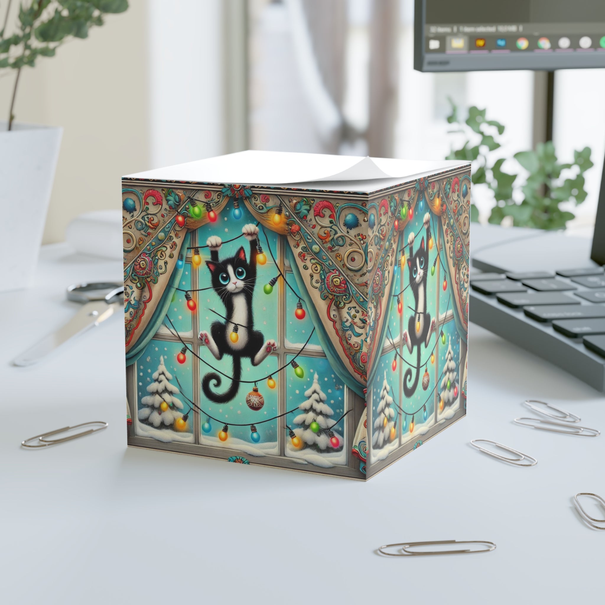 Add a sprinkle of festive fun to your workspace with the Mischief in Tinselland Note Cube ā where practicality meets playful charm. This delightful design captures a mischievous black-and-white kitten tangled in twinkling Christmas lights, peeking out from a frosted window framed by ornate holiday curtains. Outside, snow-covered trees sparkle beneath a turquoise winter sky, bringing color, warmth, and a touch of holiday mischief to your desk. šš¾āØ