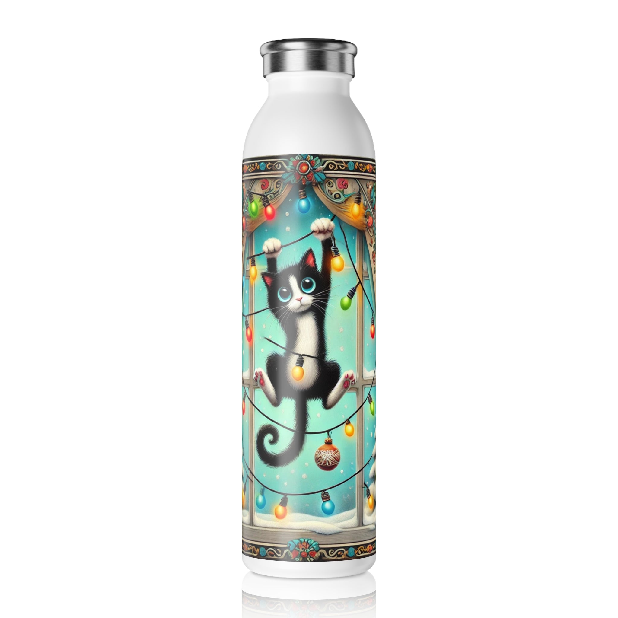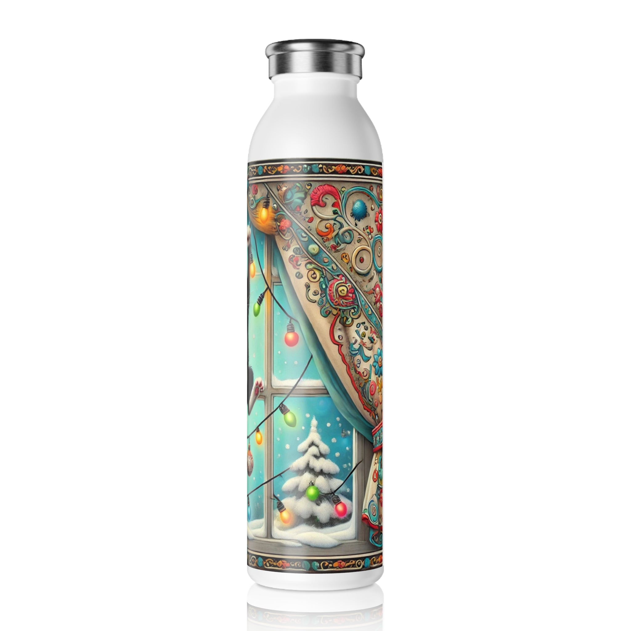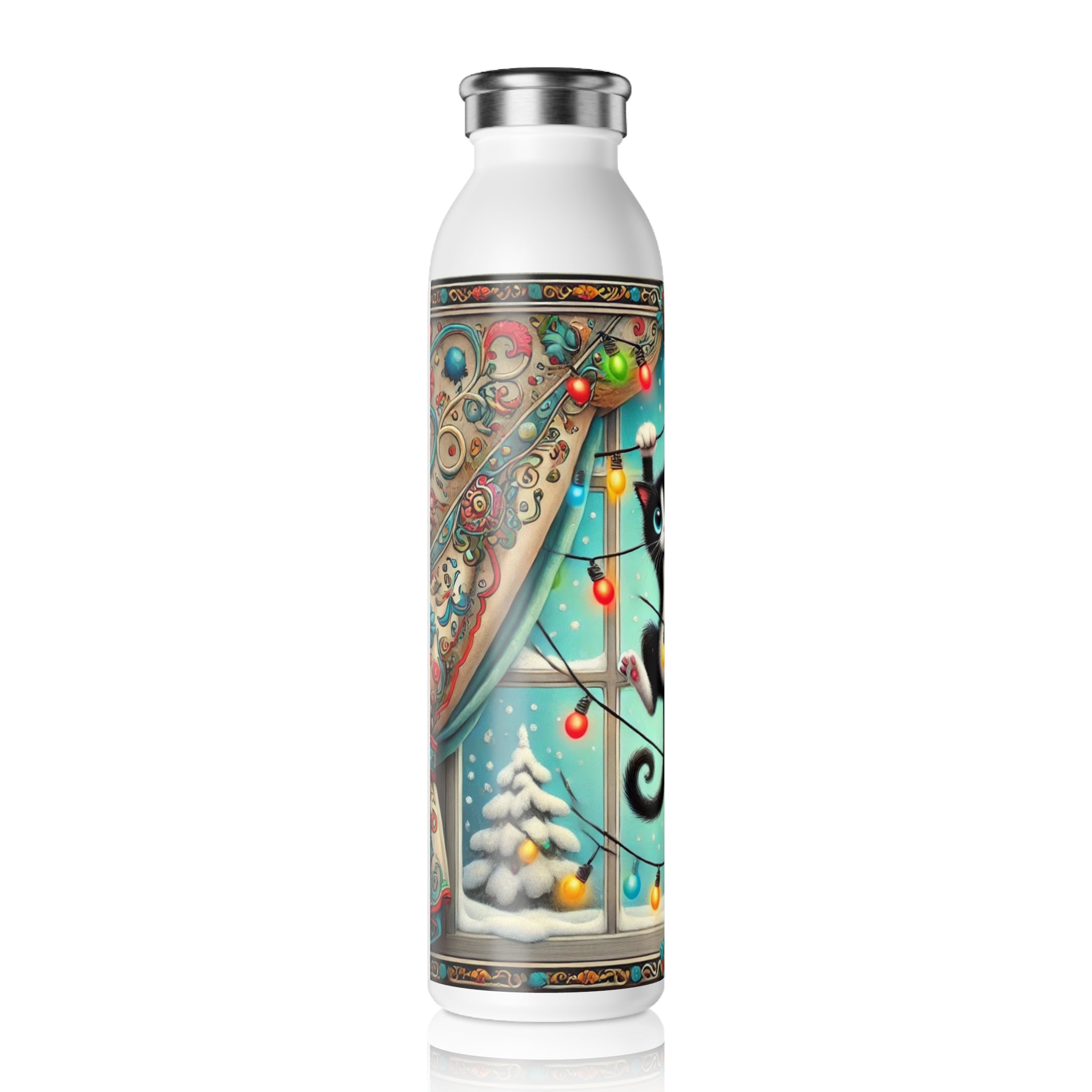 Add a splash of holiday mischief to your day with the Mischief in Tinselland Slim Water Bottle. This playful Christmas design features a black-and-white kitten tangled in colorful lights, hanging in front of a frosted window framed by festive, swirling curtains. Outside, snow-covered trees sparkle under a turquoise winter sky ā a cheerful scene full of humor and charm. šš¾āØ