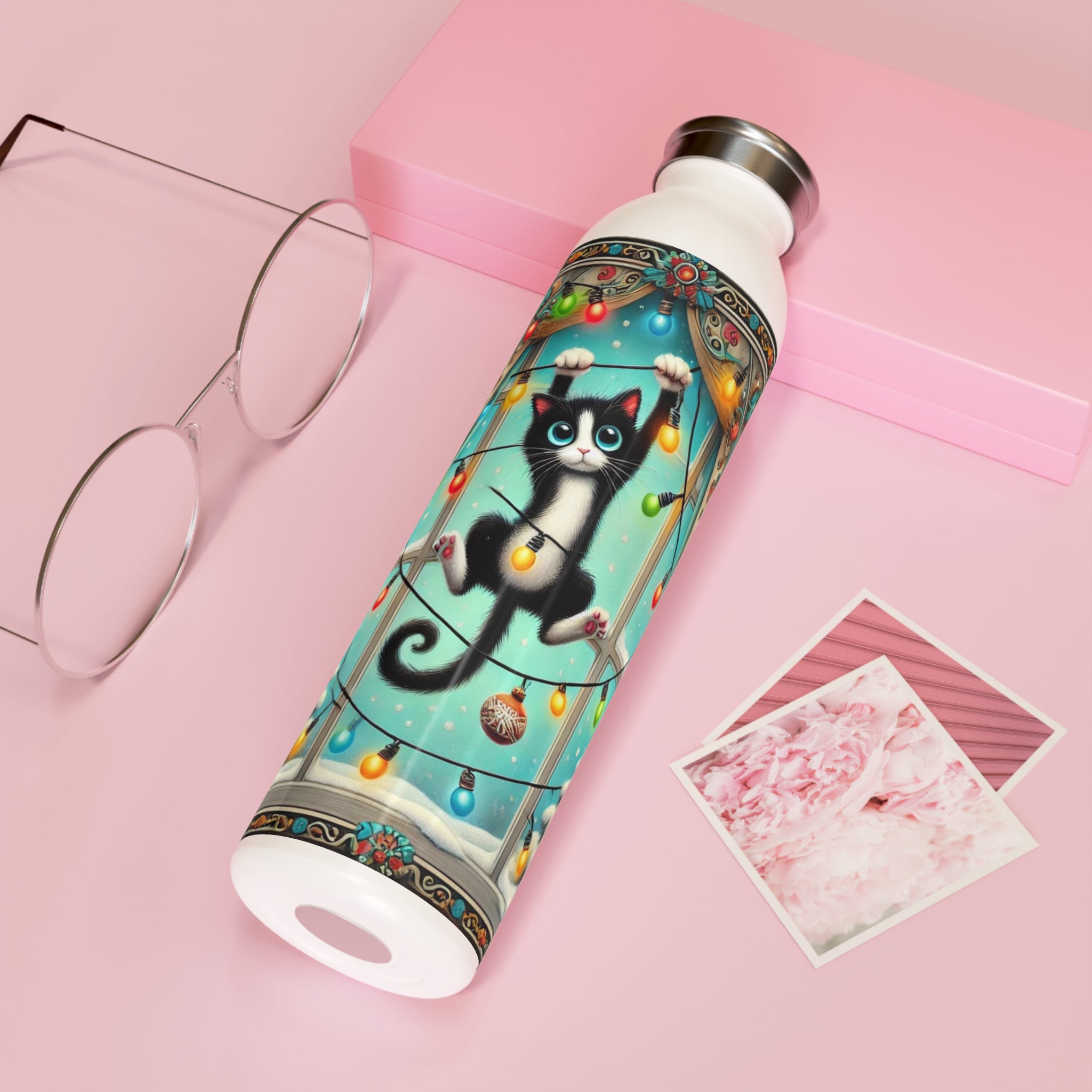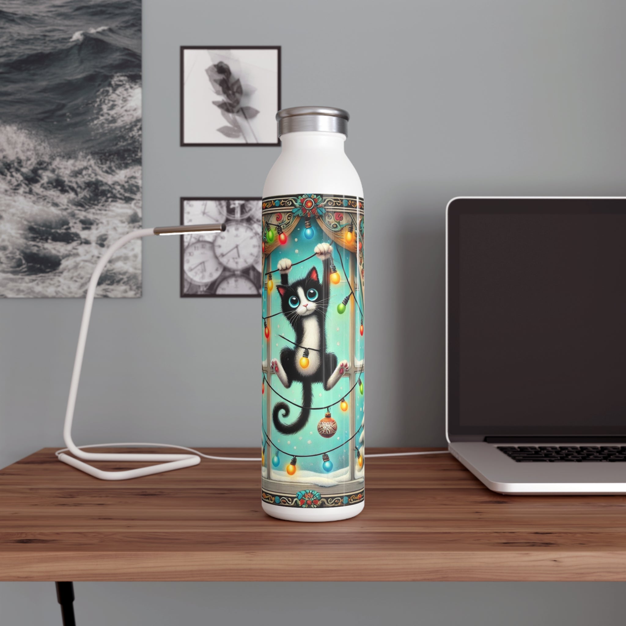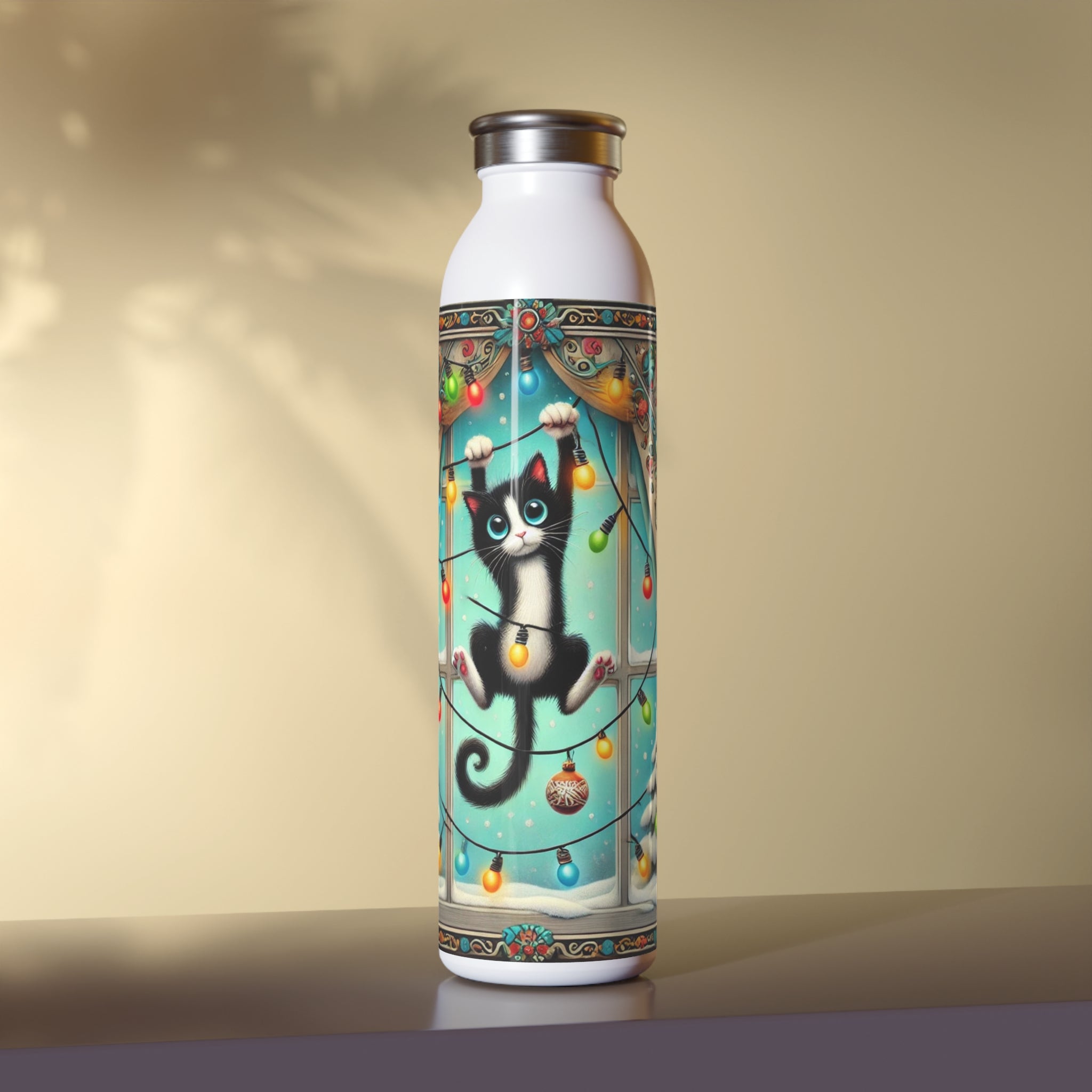 Add a splash of holiday mischief to your day with the Mischief in Tinselland Slim Water Bottle. This playful Christmas design features a black-and-white kitten tangled in colorful lights, hanging in front of a frosted window framed by festive, swirling curtains. Outside, snow-covered trees sparkle under a turquoise winter sky ā a cheerful scene full of humor and charm. šš¾āØ
