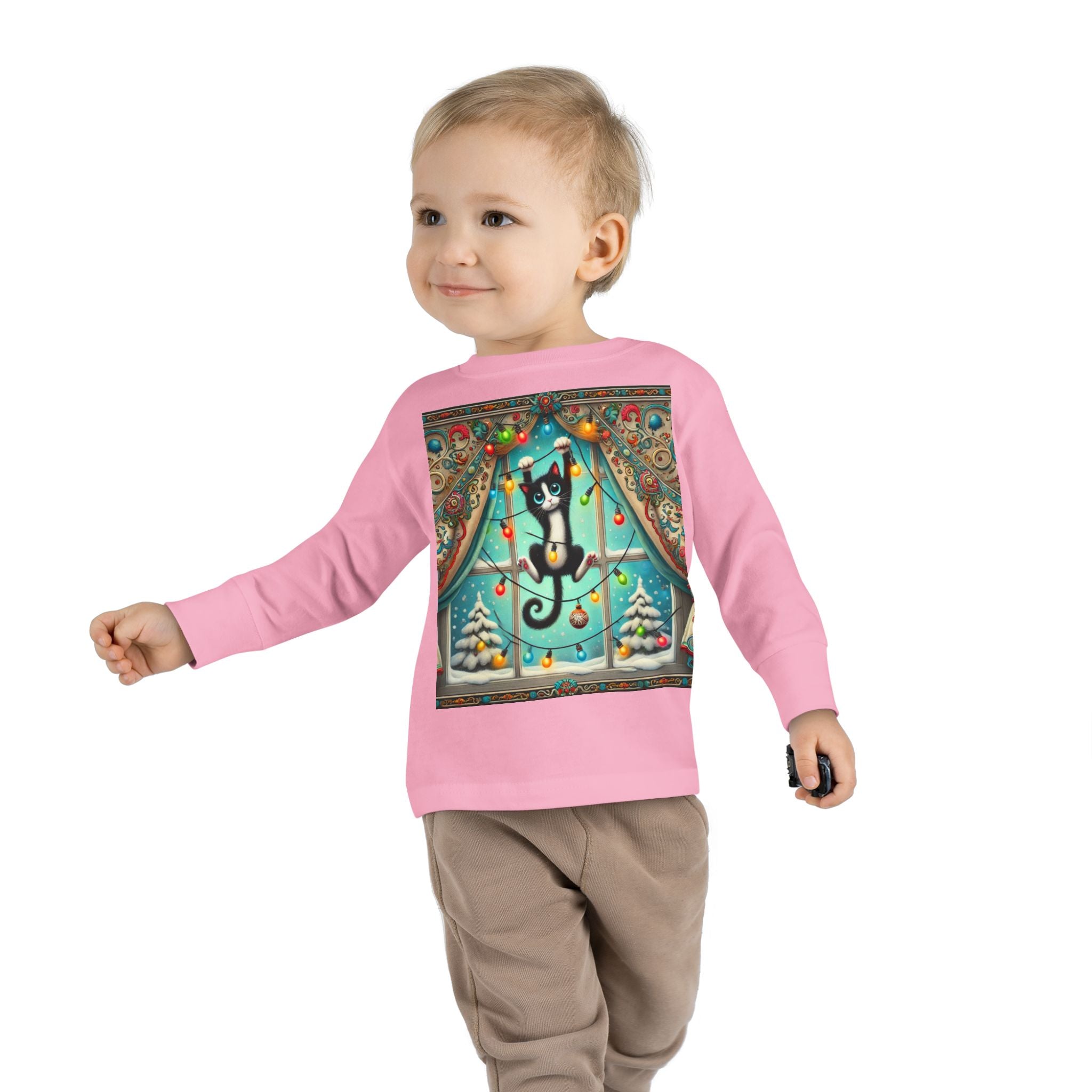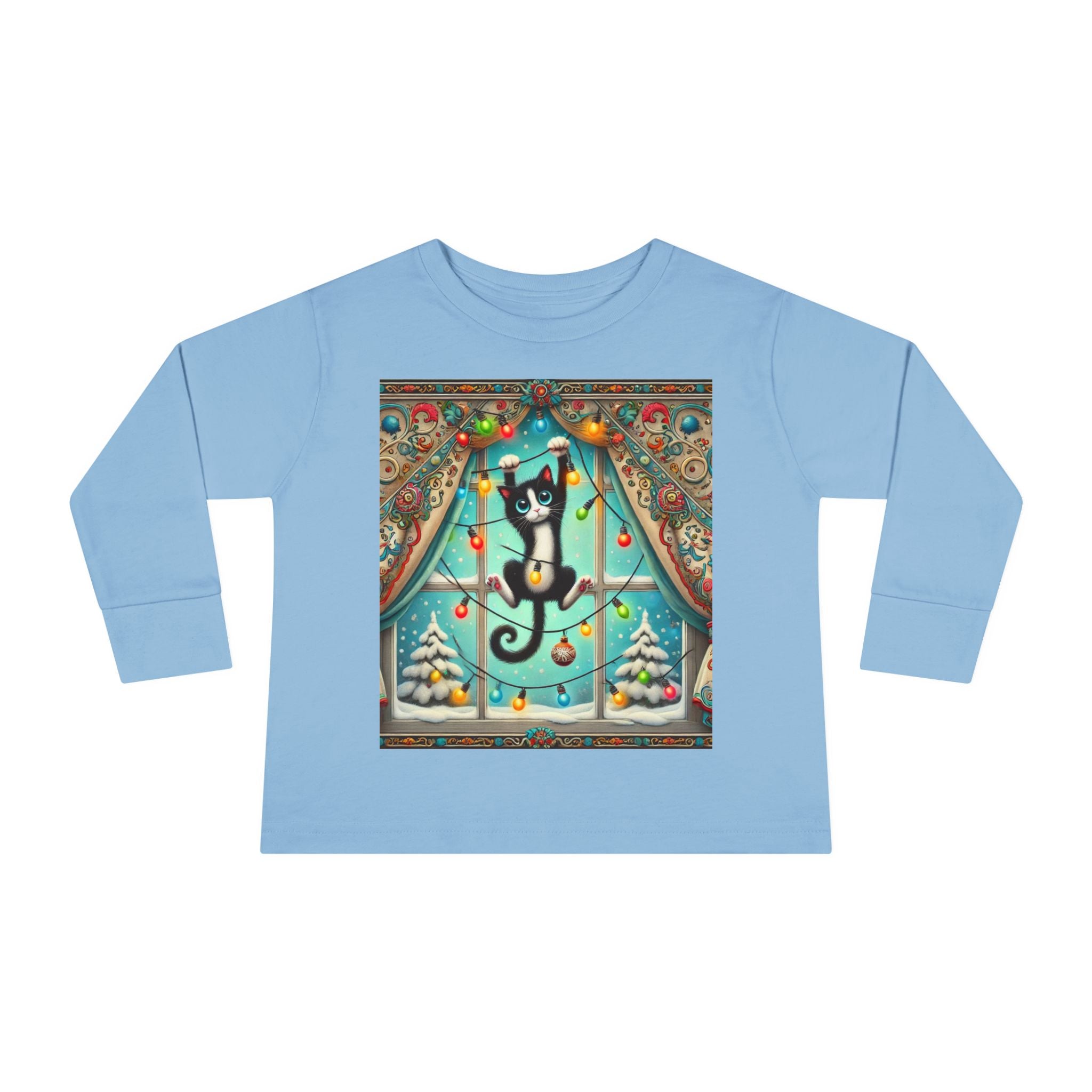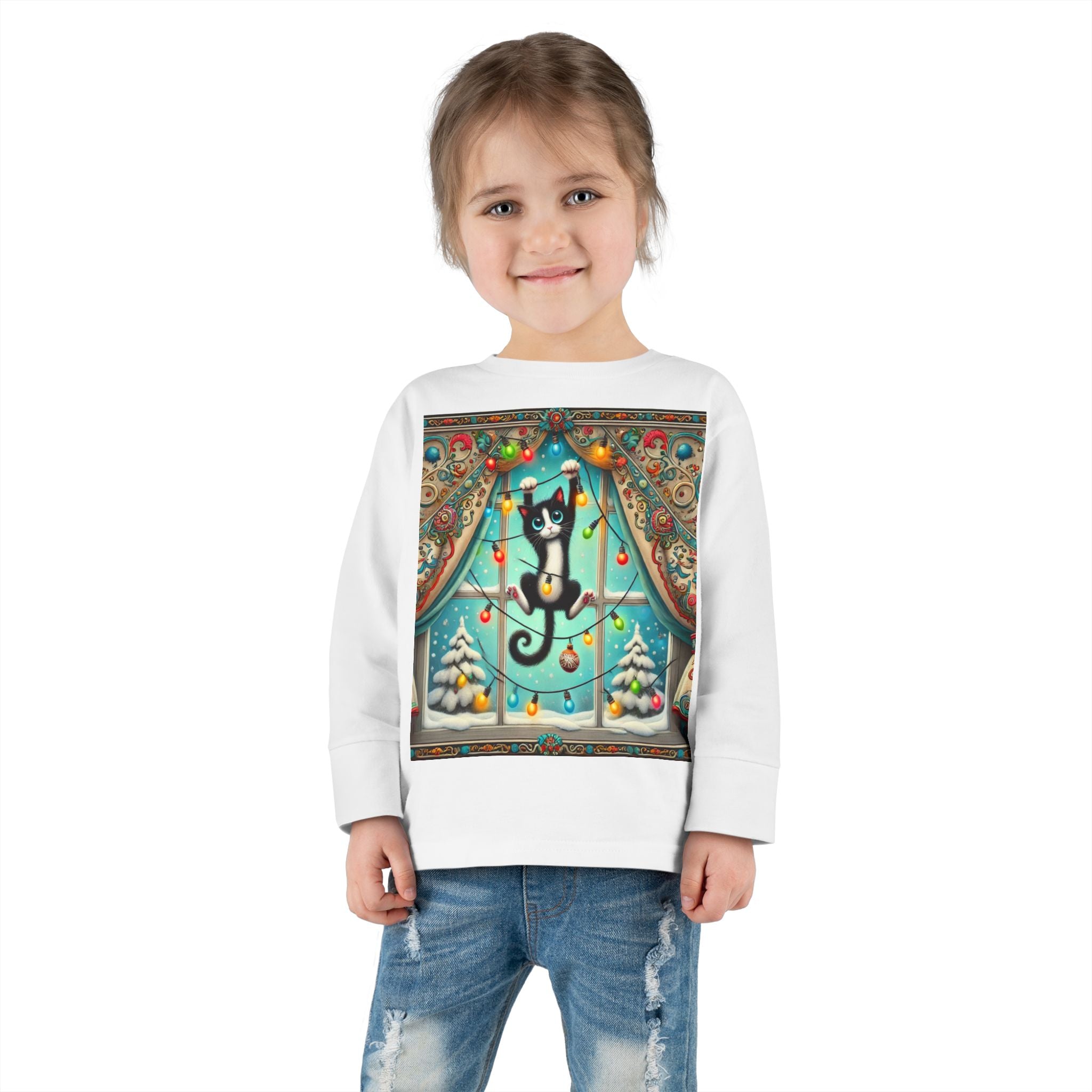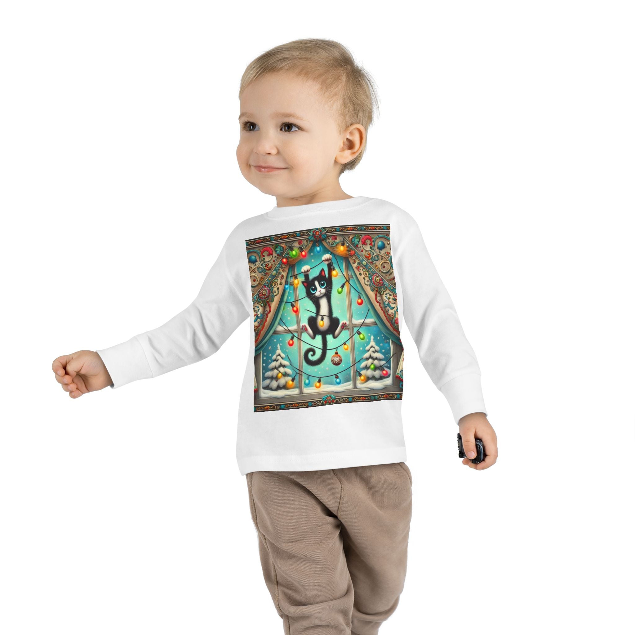 Let your little one celebrate the season in comfort and charm with the Mischief in Tinselland Toddler Long Sleeve Tee. This delightful Christmas artwork features a playful black-and-white kitten tangled in glowing holiday lights, peeking out from behind a frosted window framed by swirling, festive curtains. Outside, snow-covered trees glisten under a turquoise winter sky — a whimsical, heartwarming scene that captures the joyful mischief of the holidays. 🎄🐾✨